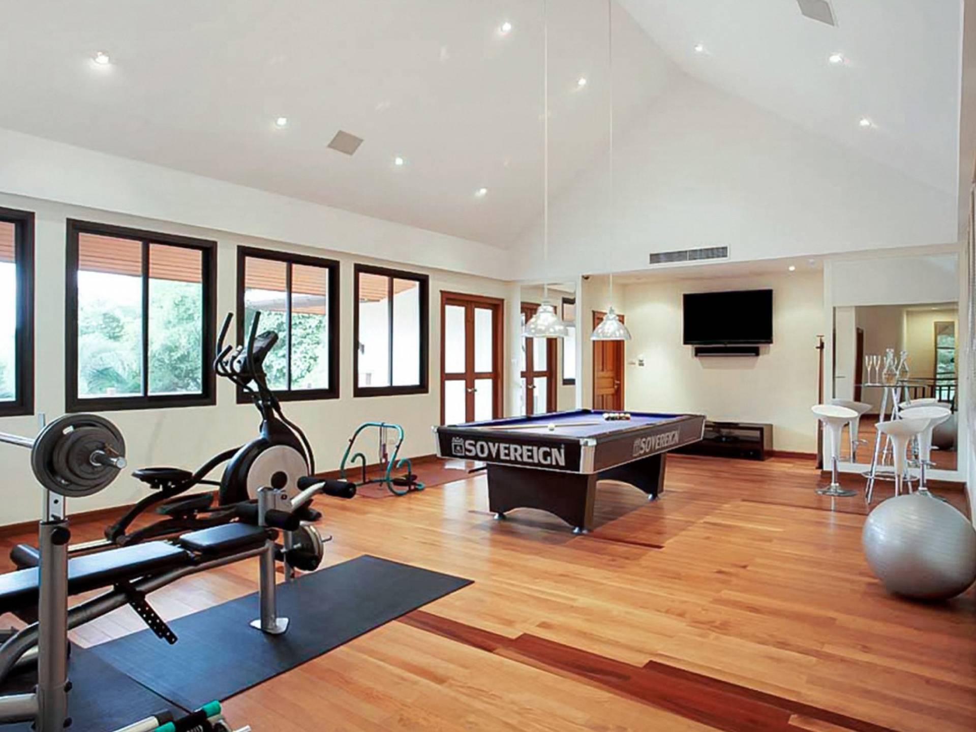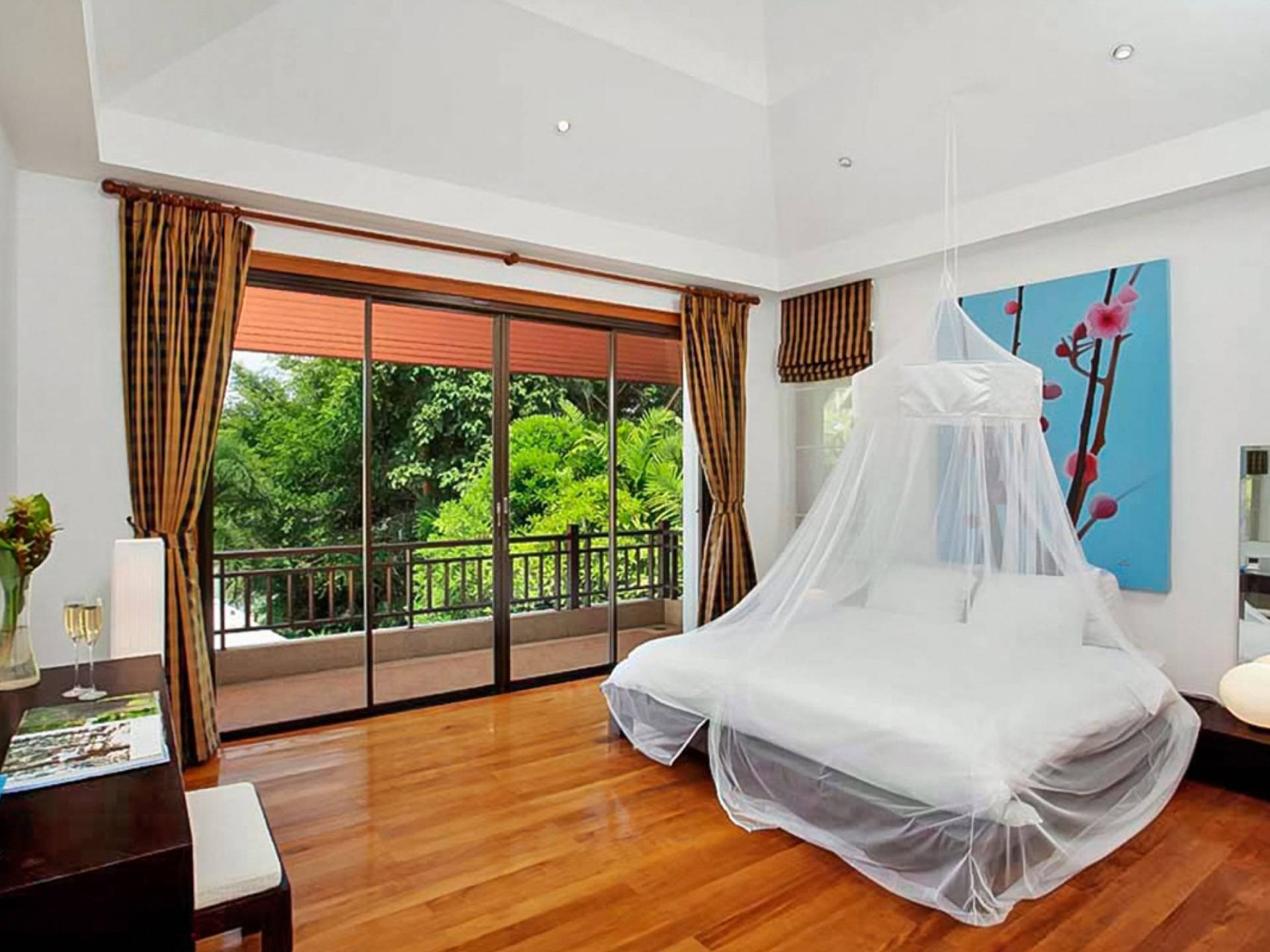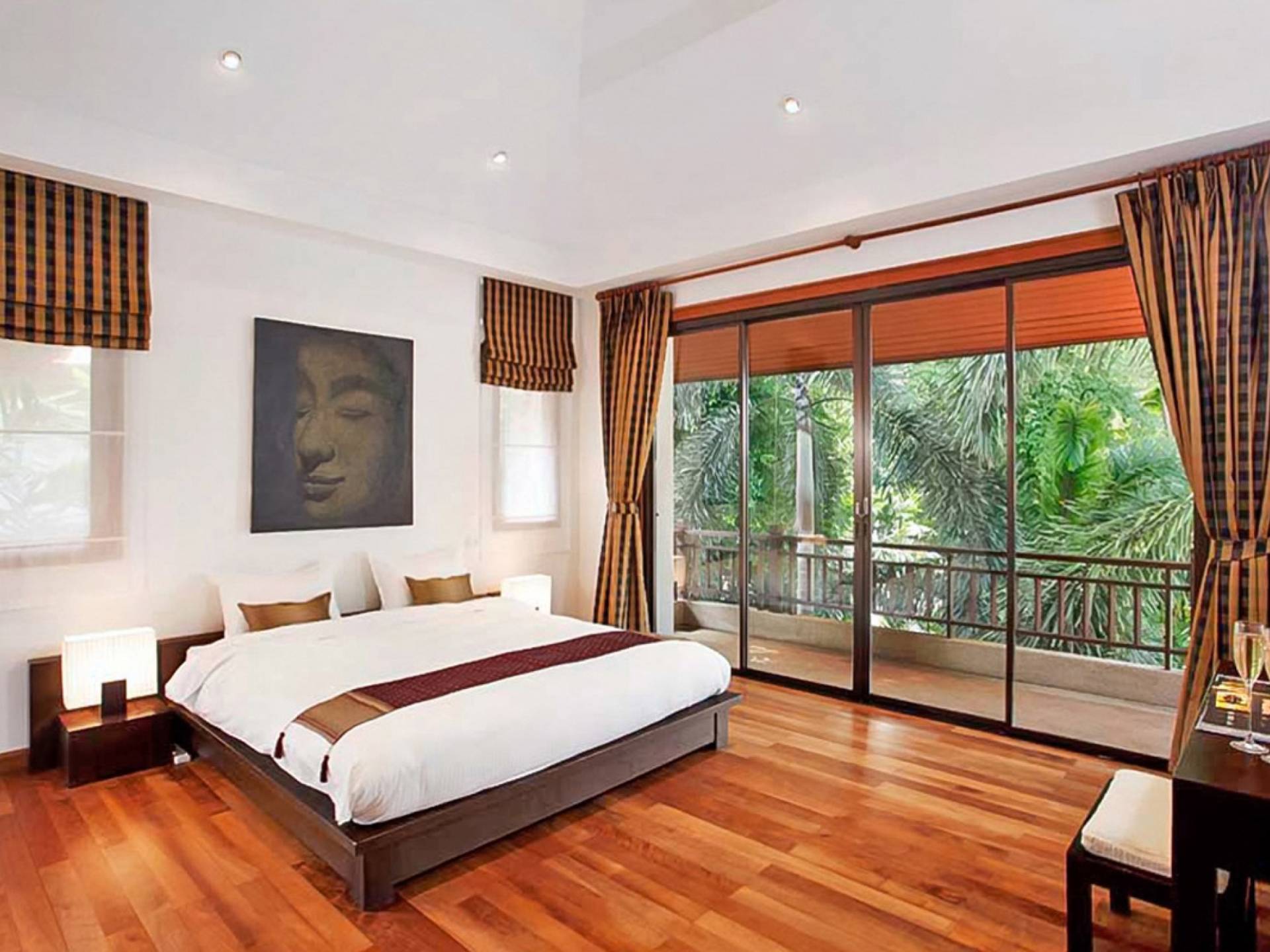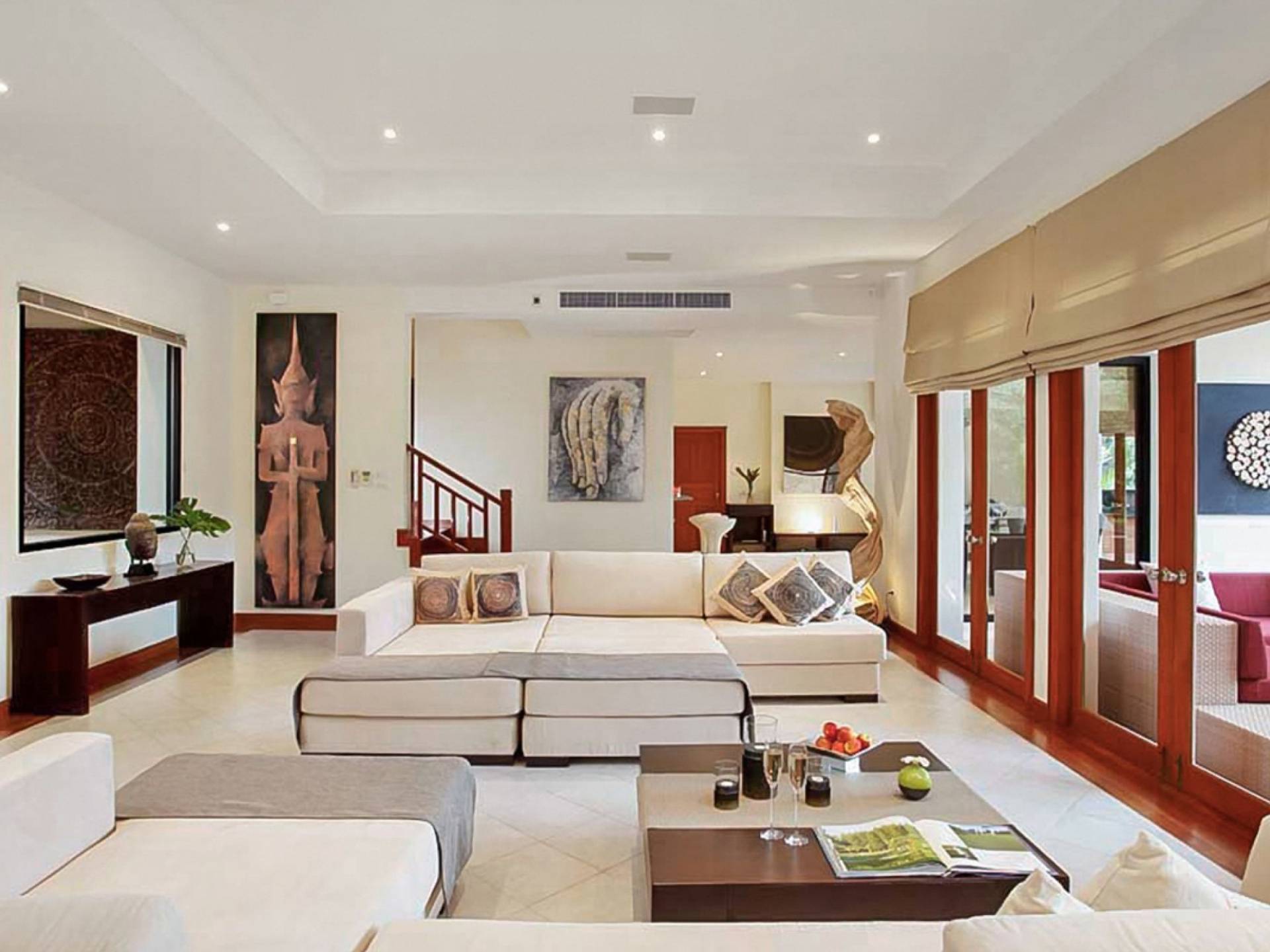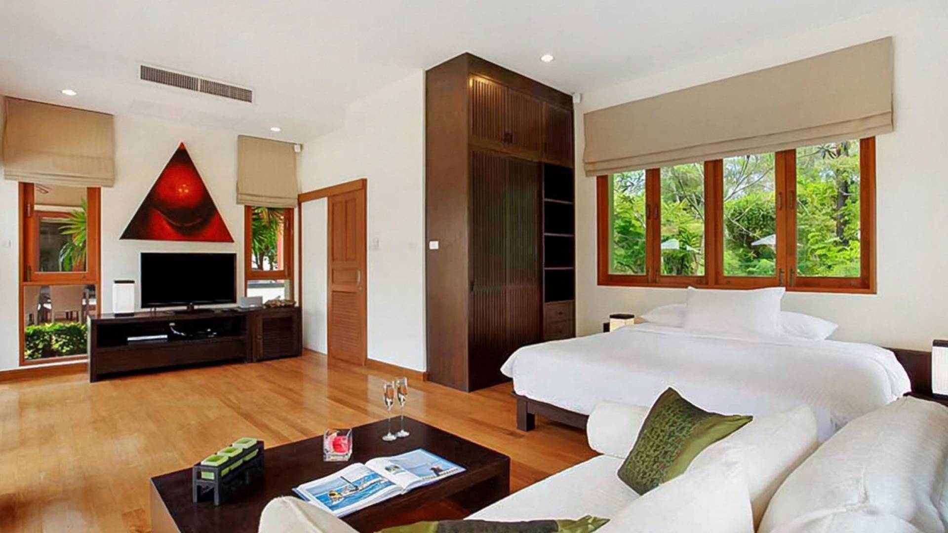 Die Doppelzimmer im Hauptgebäude verfügen alle über Kingsize-Betten, komfortable Möbel und eigene Badezimmer. Das Gästezimmer im Untergeschoss öffnet sich auf die Terrasse am Pool, während die großzügige Master-Suite im Obergeschoss über einen eigenen privaten Balkon verfügt, der mit Sonnenliegen ausgestattet ist und einen entspannenden Blick auf den See bietet. Ein eigenständiger Gästezimmer-Pavillon befindet sich am Pool, ebenfalls mit eigenem Bad und Türen, die sich auf die Sonnenterrasse öffnen. Der geräumige Innenraum verfügt über ein Sofa und einen Couchtisch zur Entspannung tagsüber. Die Hinzufügung von Flachbildfernsehern, einer Badewanne im Hauptbadezimmer und beruhigenden asiatischen Kunstwerken an den Wänden in den Schlafzimmern sorgen für ein ansprechendes Gefühl von privatem Luxus. Aktivere oder gemeinschaftliche Aktivitäten sind dank des zusätzlichen Spielzimmers und Fitnessraums im Obergeschoss mit Billardtisch, Gewichten und Fitnessgeräten gleichermaßen gut möglich.