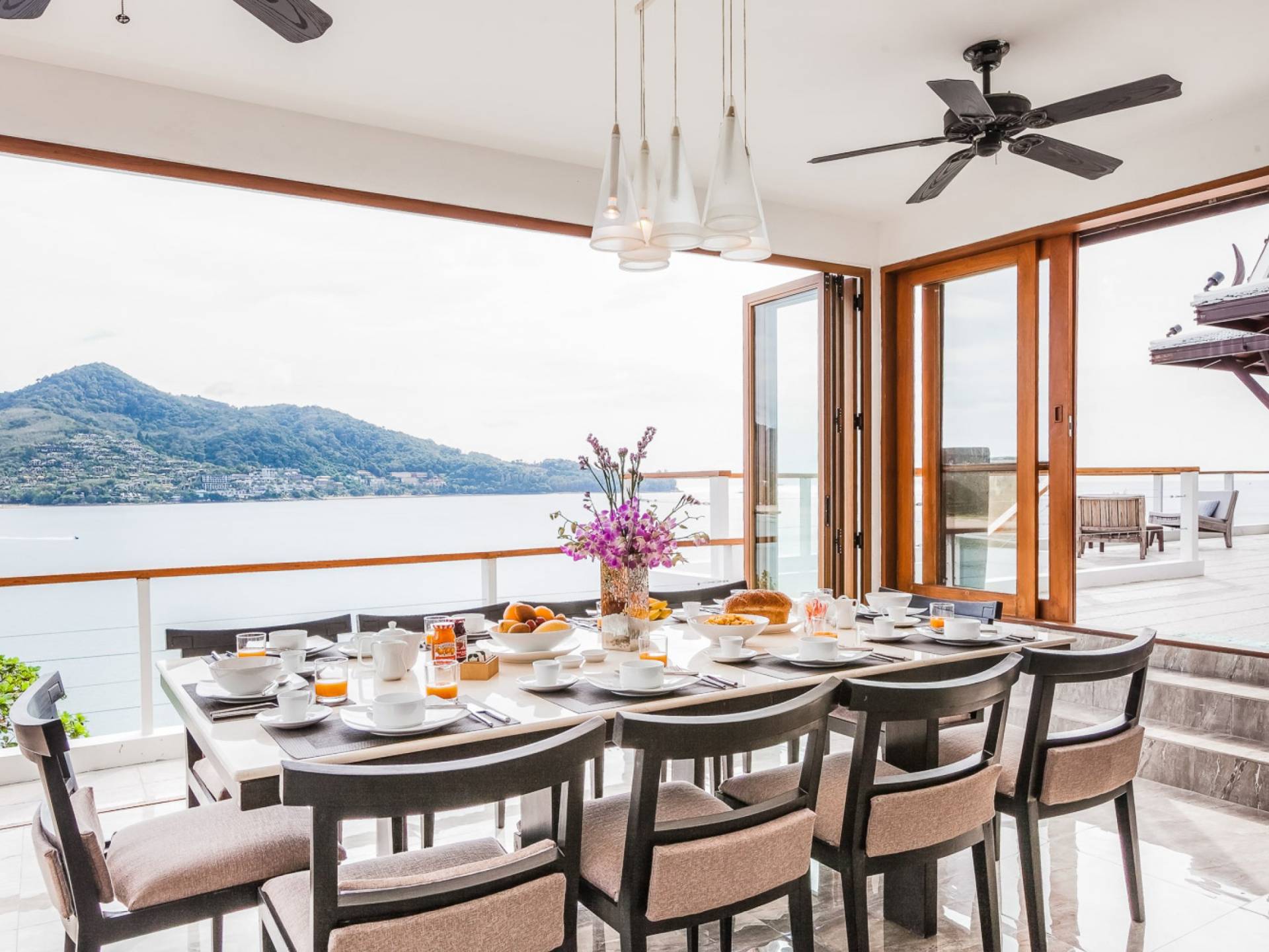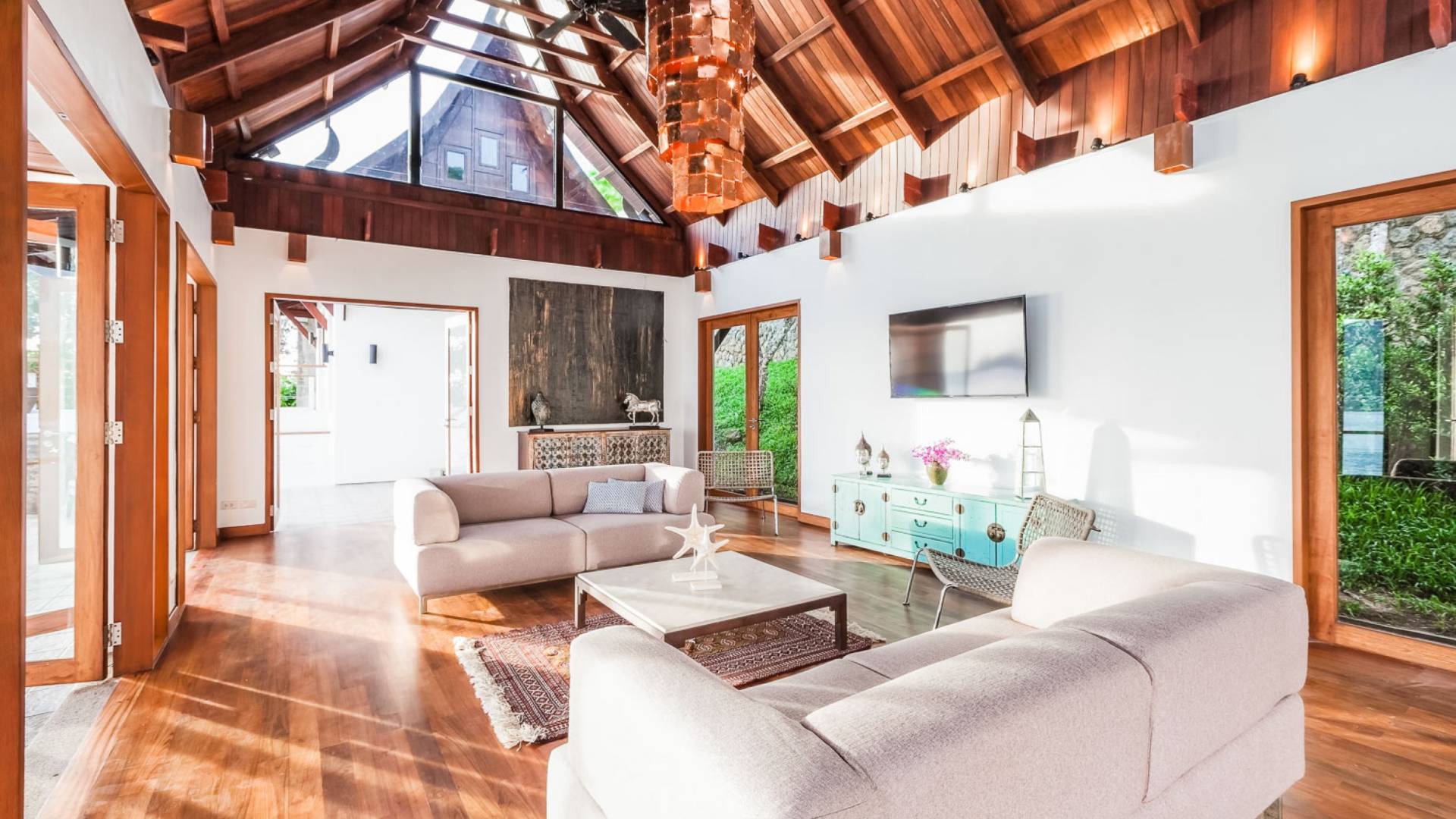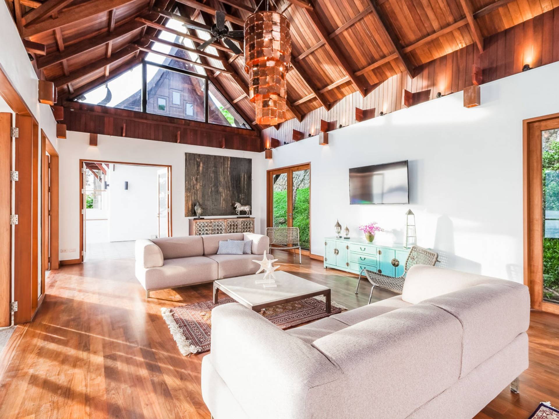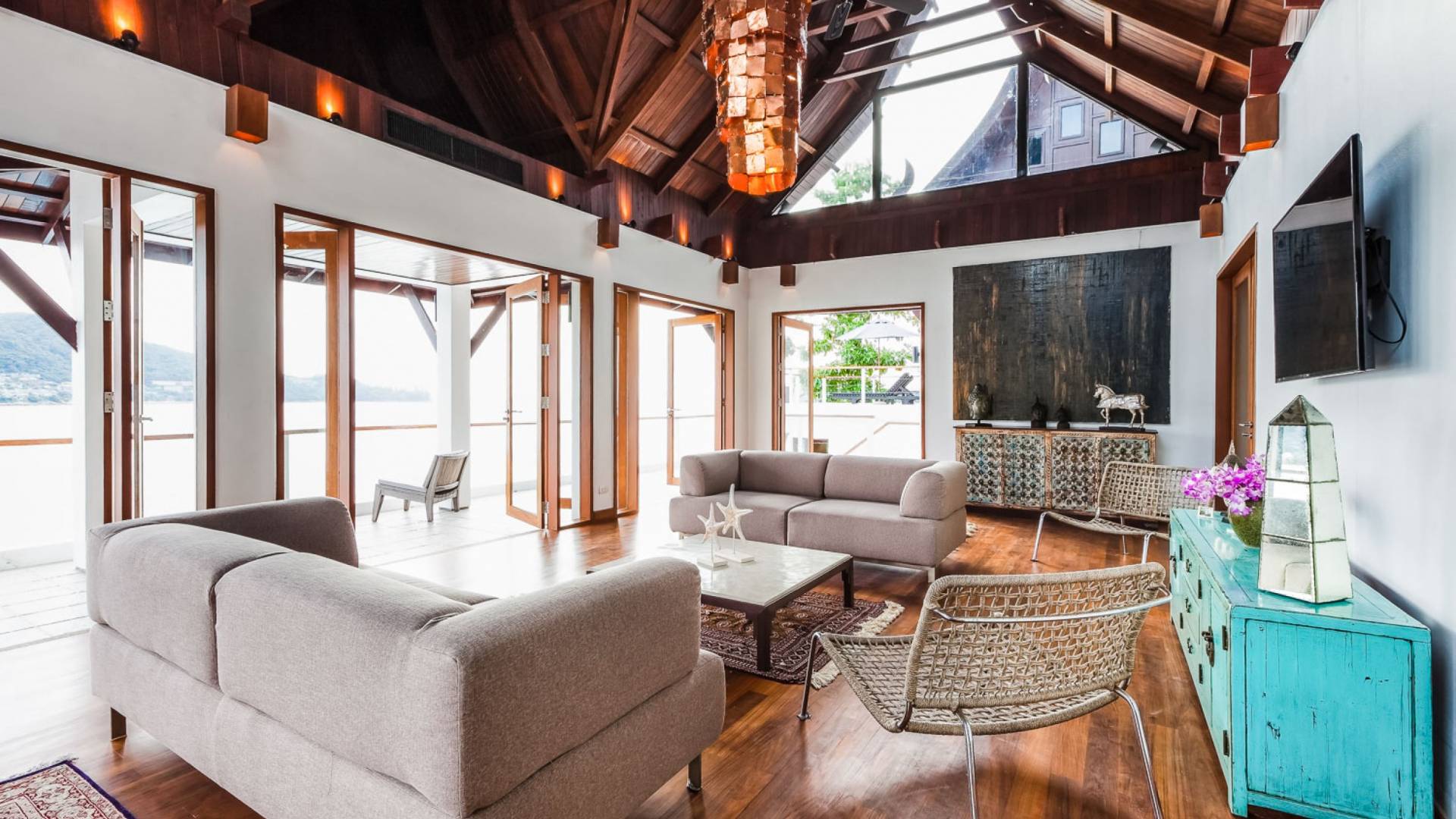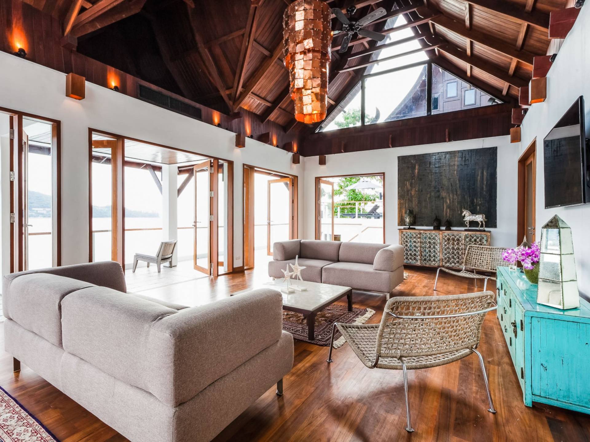 In der obersten Etage befindet sich das Wohnzimmer, das in einem der traditionellen Pavillons untergebracht ist. Die hohe Dachneigung dieses Architekturstils erhöht auf natürliche Weise die Luftzirkulation und das Licht in den Raum. Fast vollständig von raumhohen Glasfenstern und -türen umgeben, nutzt dieser Raum die Meeresbrise, die ständig durchtanzt, voll aus. Die Mischung aus modernen Möbeln und traditioneller Architektur ist dezent und geschmackvoll und gipfelt in einem attraktiven und harmonischen Interieur. Kunstvolle asiatische Artefakte aus der persönlichen Sammlung des Besitzers befinden sich zwischen modernen Stücken, darunter ein einzigartiger maßgefertigter Couchtisch und ein meisterhafter Kronleuchter.