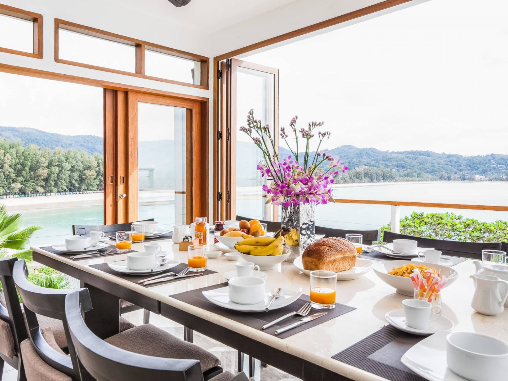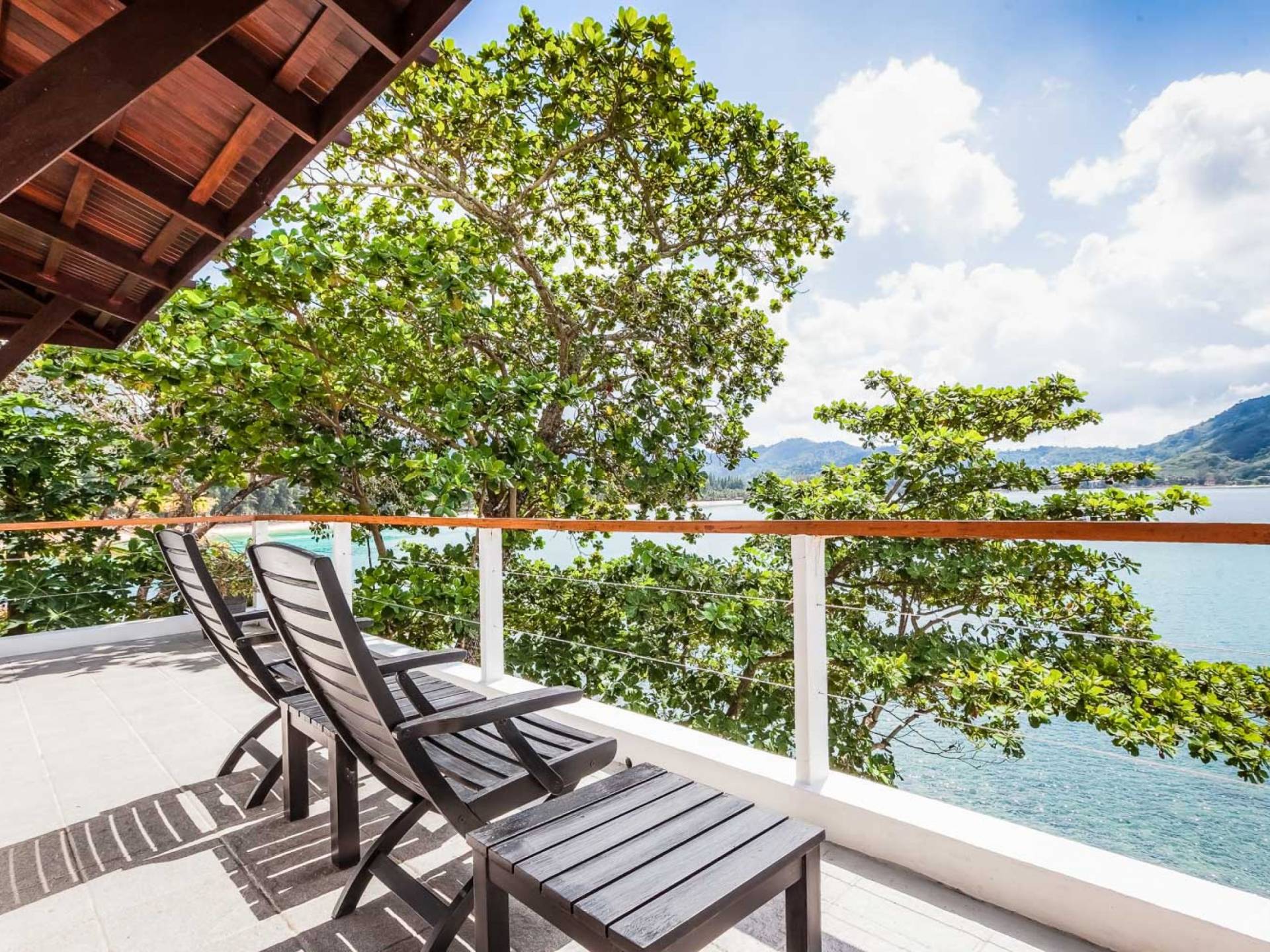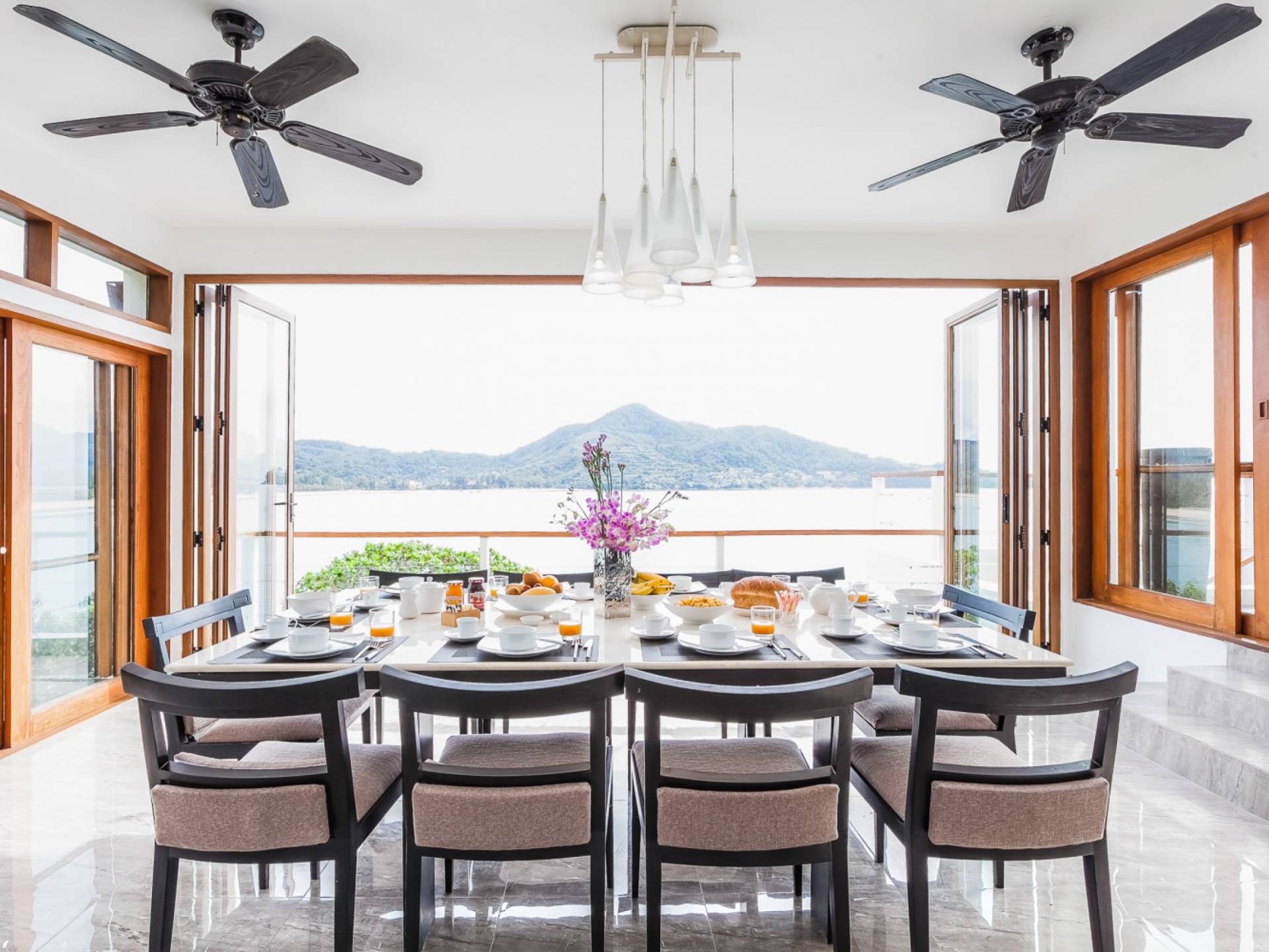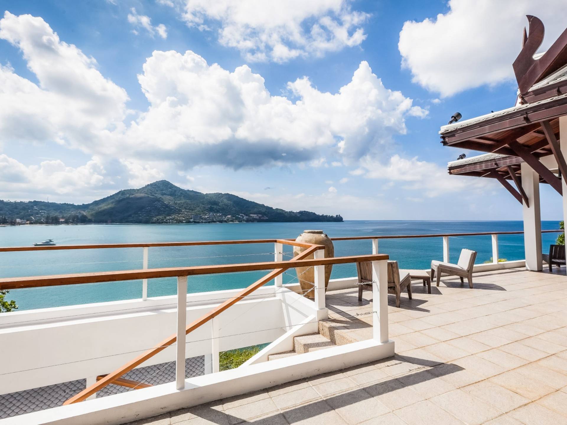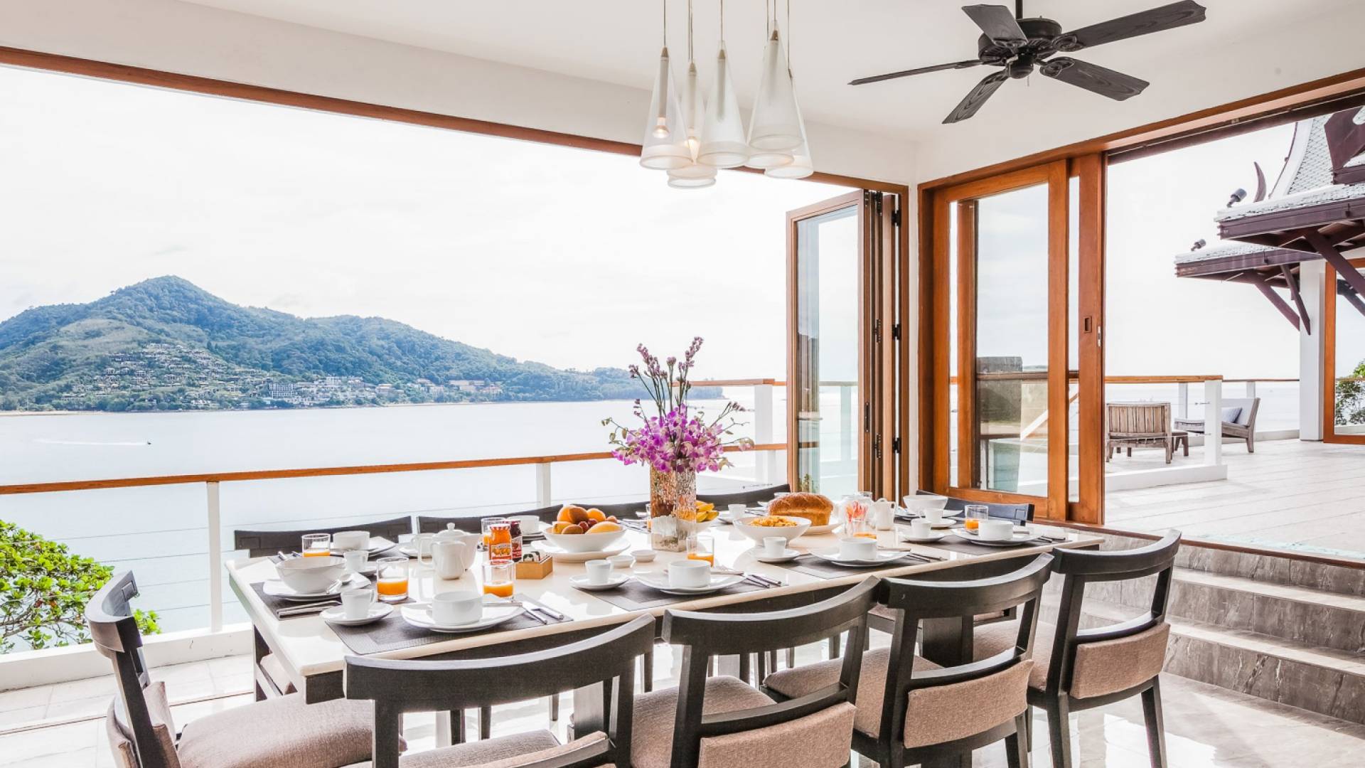 In der obersten Etage befindet sich das Wohnzimmer, das in einem der traditionellen Pavillons untergebracht ist. Die hohe Dachneigung dieses Architekturstils erhöht auf natürliche Weise die Luftzirkulation und das Licht in den Raum. Fast vollständig von raumhohen Glasfenstern und -türen umgeben, nutzt dieser Raum die Meeresbrise, die ständig durchtanzt, voll aus. Die Mischung aus modernen Möbeln und traditioneller Architektur ist dezent und geschmackvoll und gipfelt in einem attraktiven und harmonischen Interieur. Kunstvolle asiatische Artefakte aus der persönlichen Sammlung des Besitzers befinden sich zwischen modernen Stücken, darunter ein einzigartiger maßgefertigter Couchtisch und ein meisterhafter Kronleuchter.