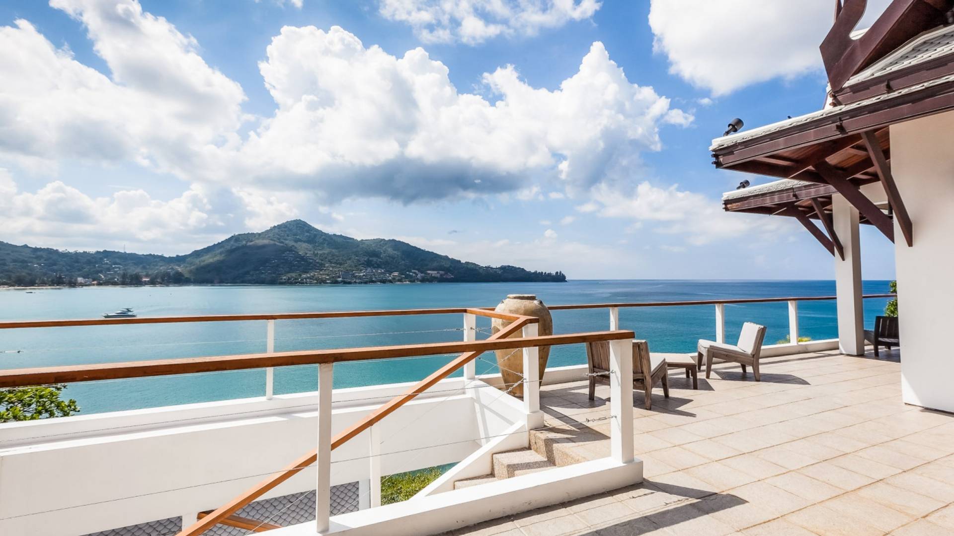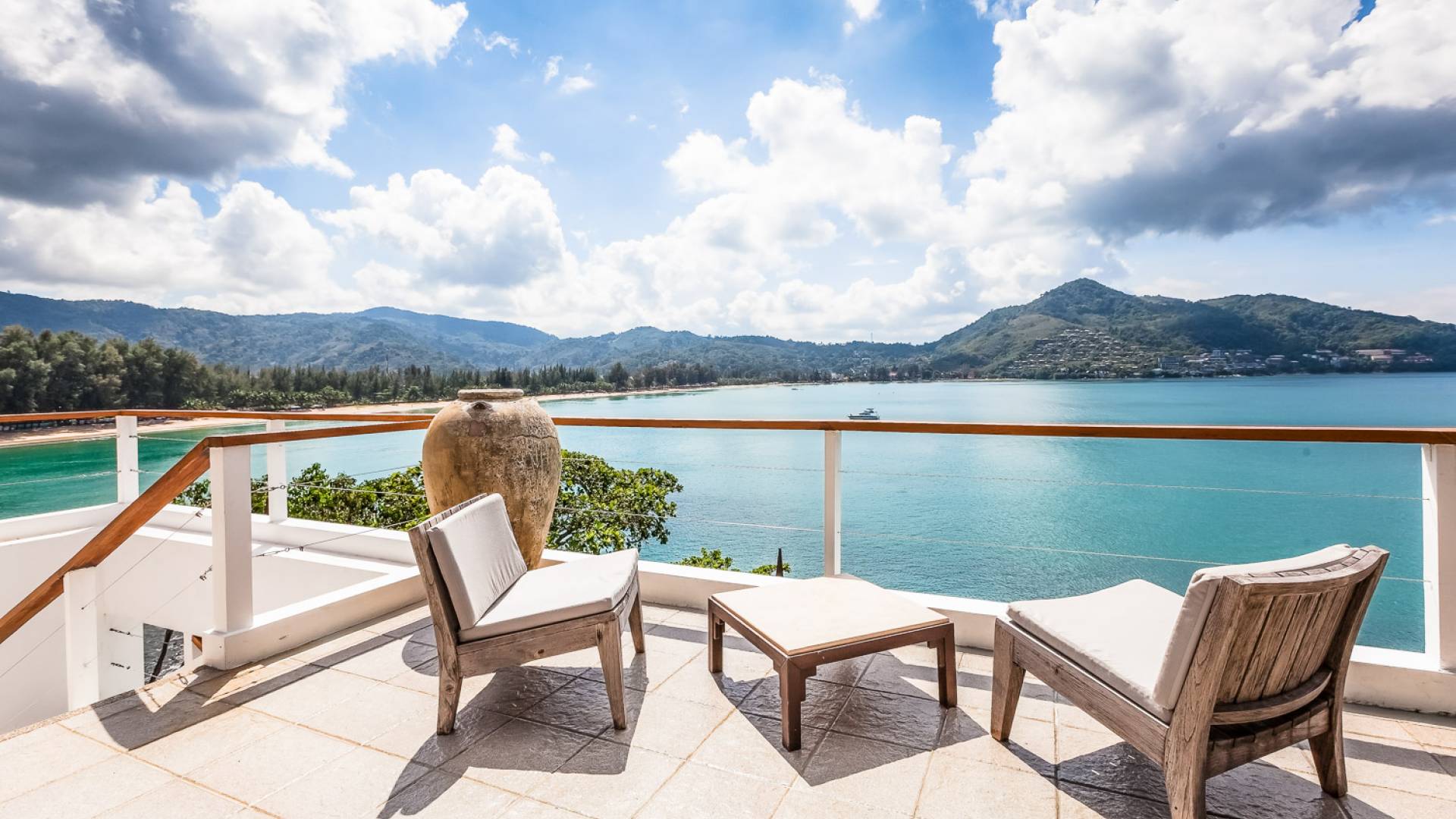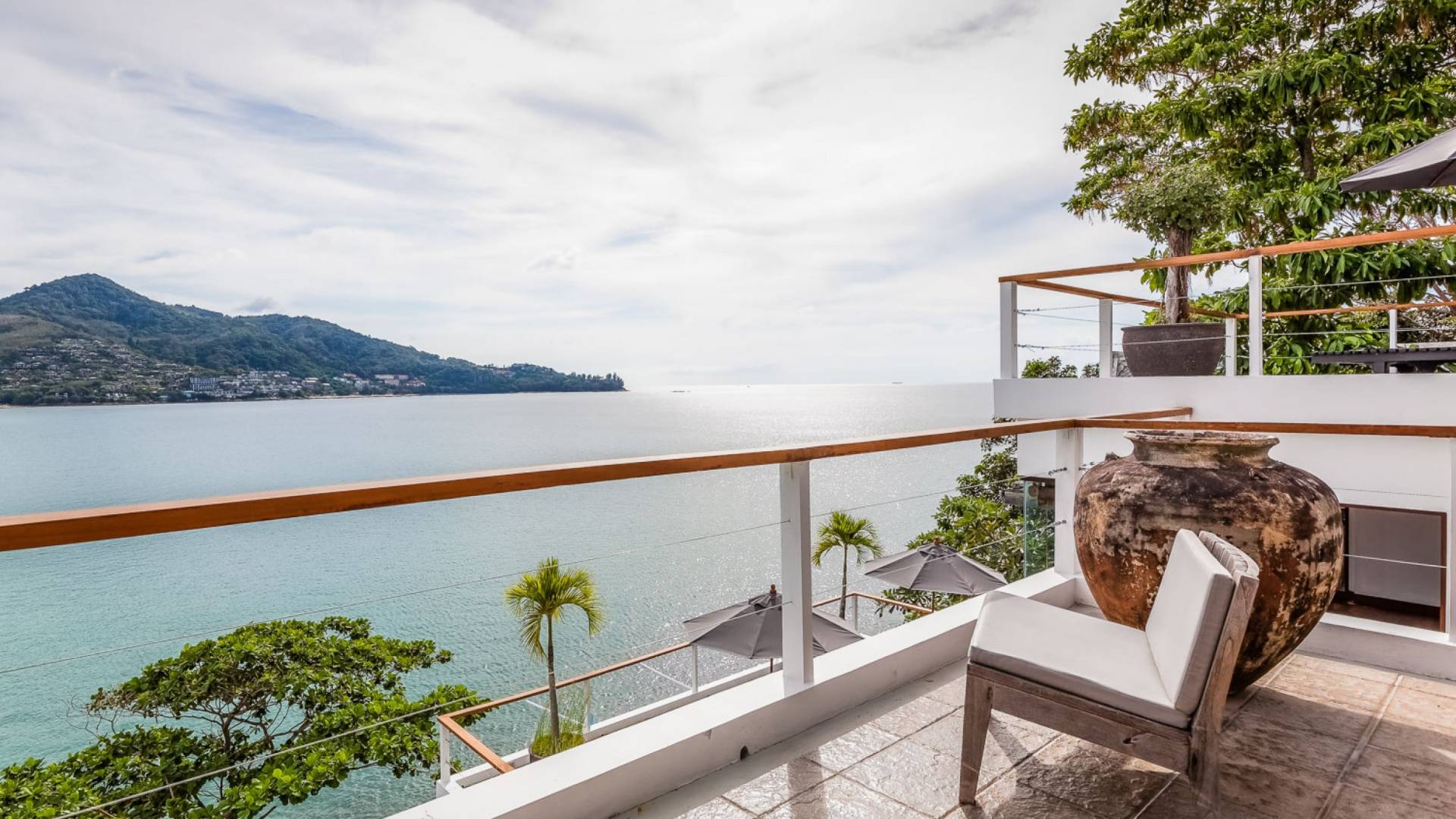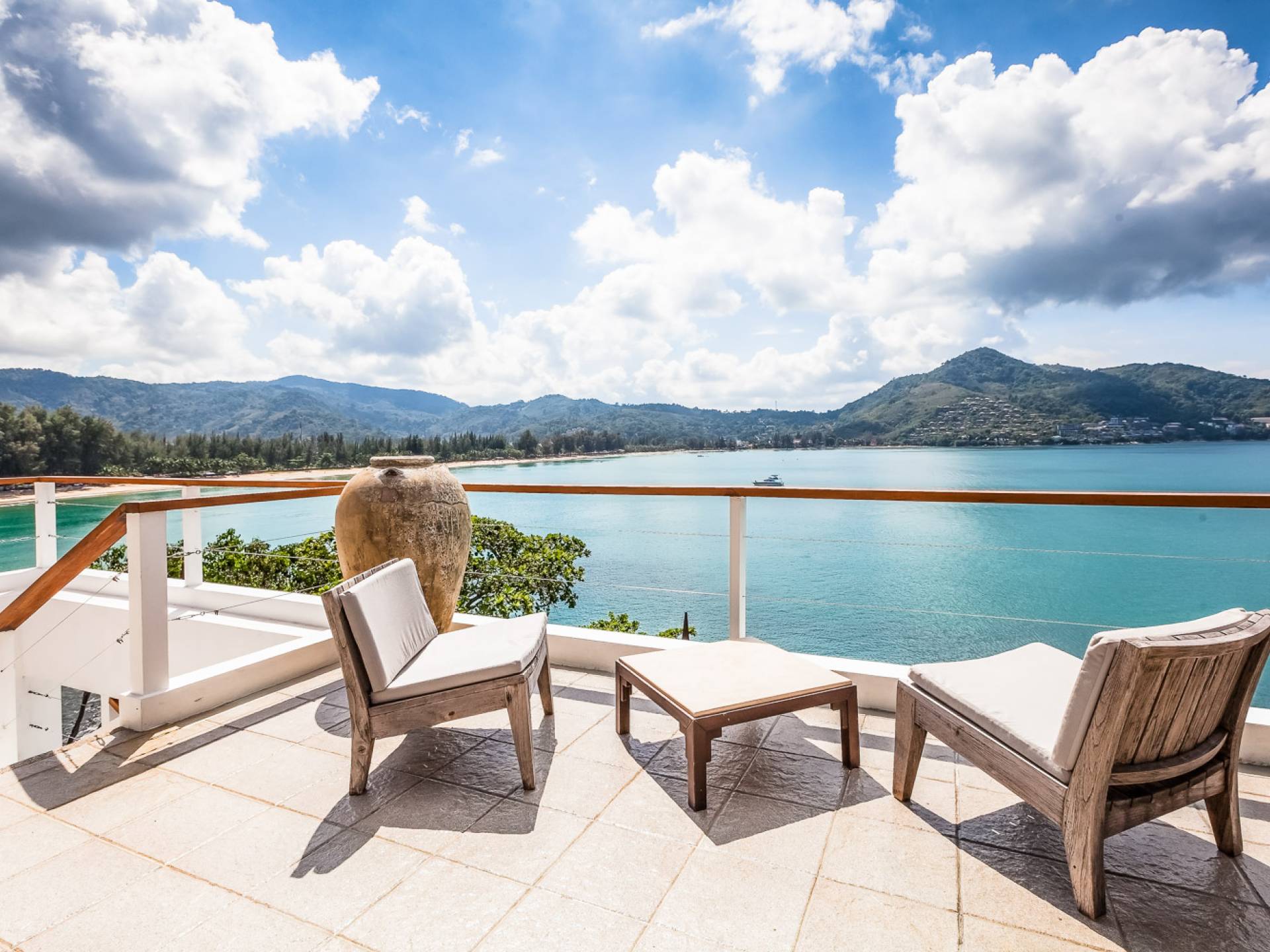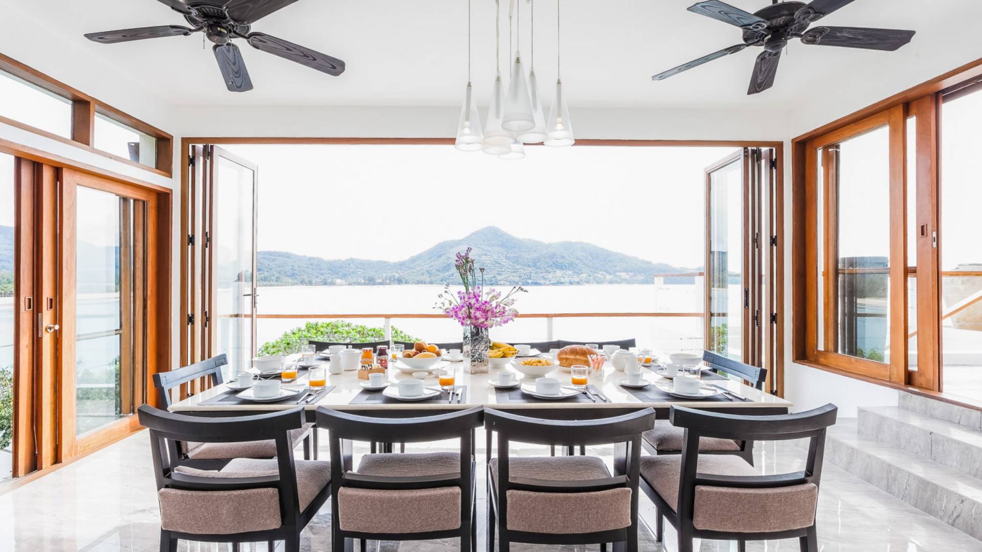 In der obersten Etage befindet sich das Wohnzimmer, das in einem der traditionellen Pavillons untergebracht ist. Die hohe Dachneigung dieses Architekturstils erhöht auf natürliche Weise die Luftzirkulation und das Licht in den Raum. Fast vollständig von raumhohen Glasfenstern und -türen umgeben, nutzt dieser Raum die Meeresbrise, die ständig durchtanzt, voll aus. Die Mischung aus modernen Möbeln und traditioneller Architektur ist dezent und geschmackvoll und gipfelt in einem attraktiven und harmonischen Interieur. Kunstvolle asiatische Artefakte aus der persönlichen Sammlung des Besitzers befinden sich zwischen modernen Stücken, darunter ein einzigartiger maßgefertigter Couchtisch und ein meisterhafter Kronleuchter.
