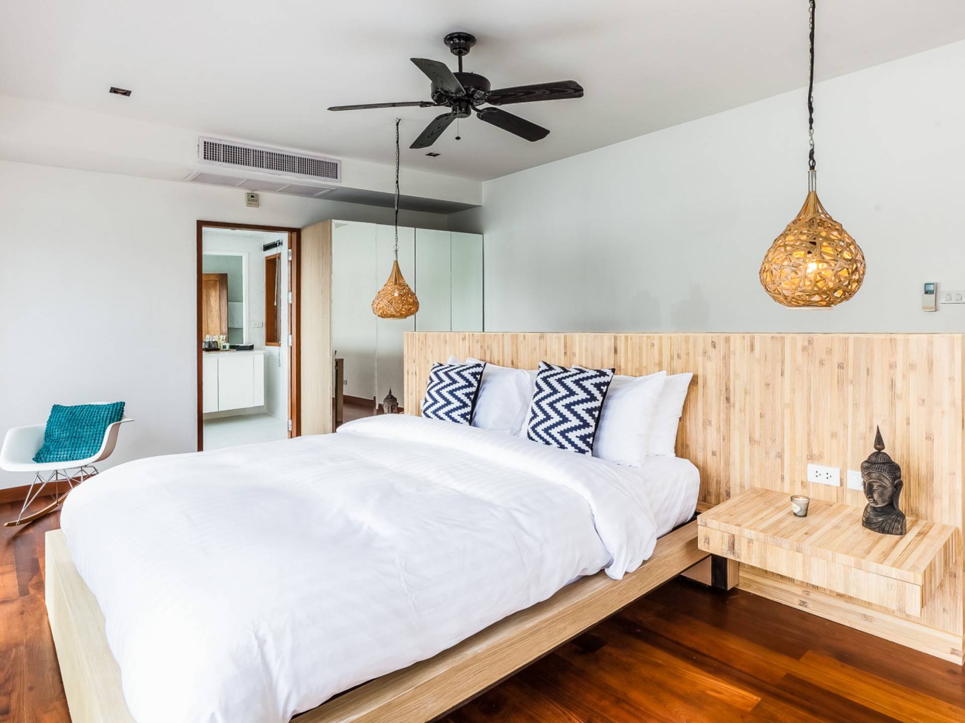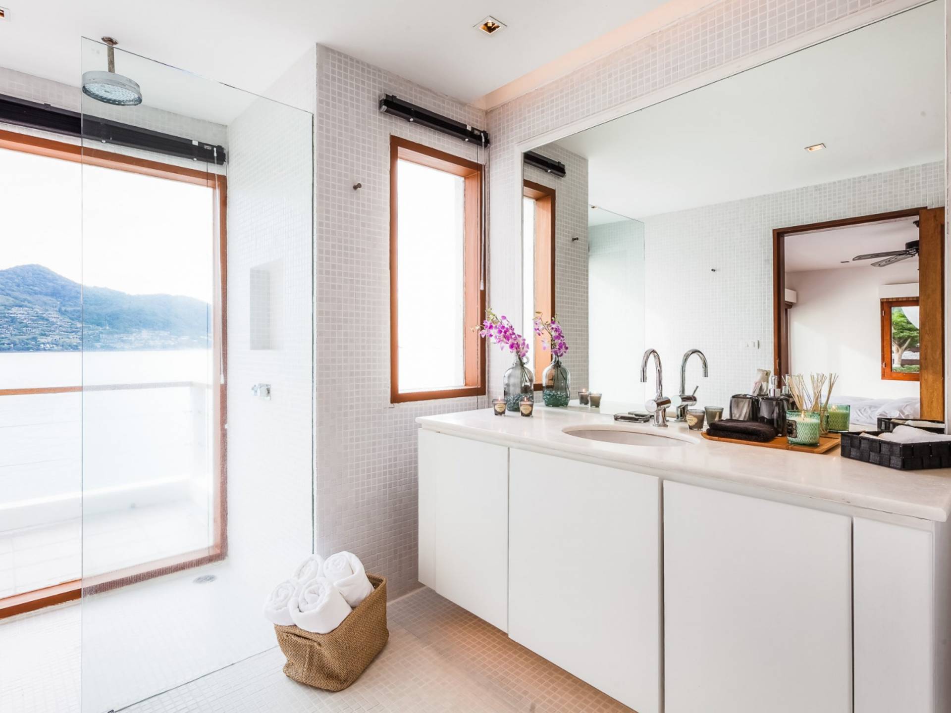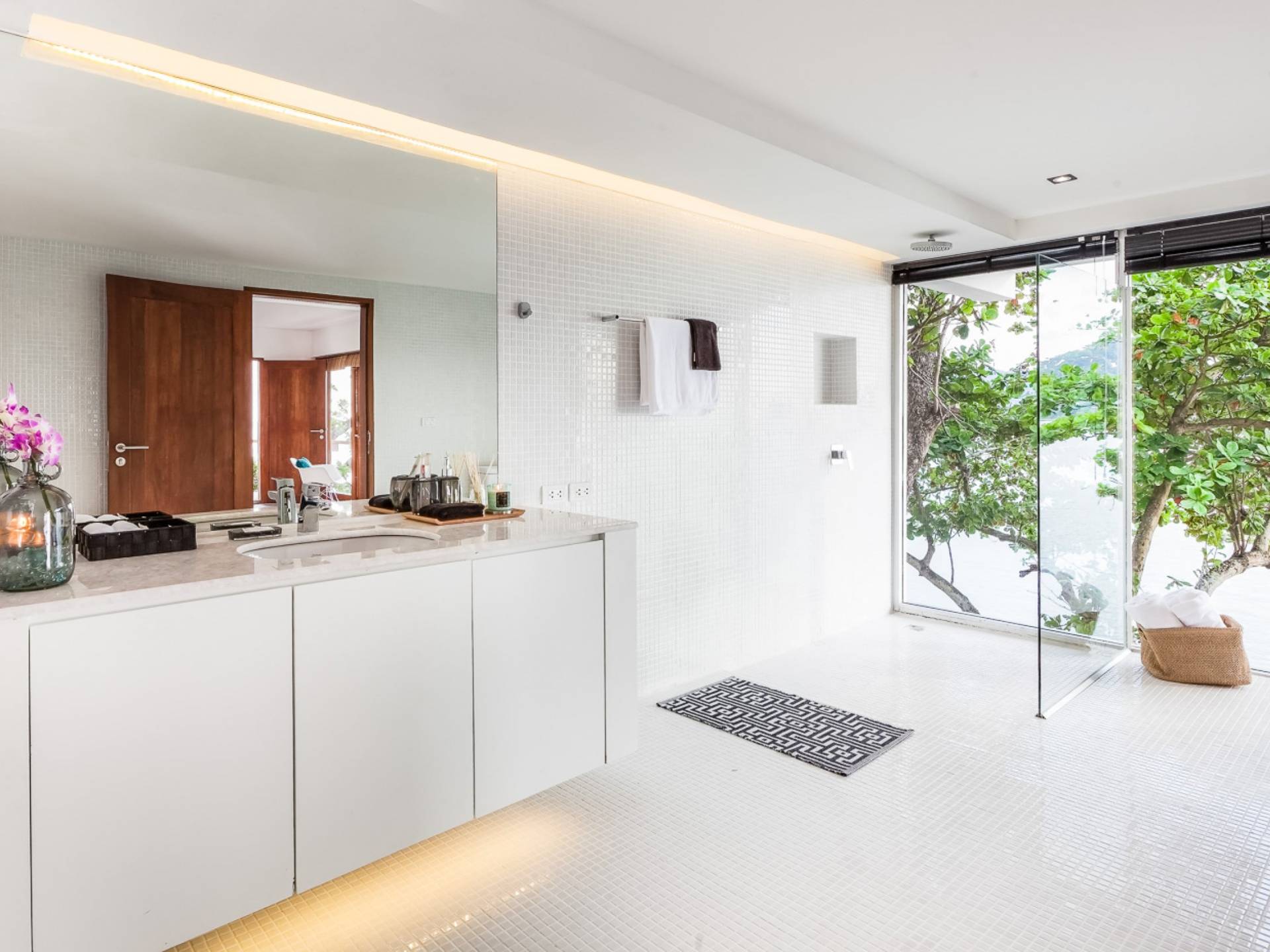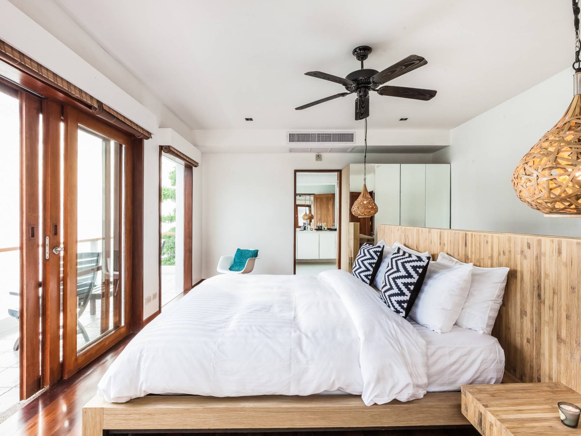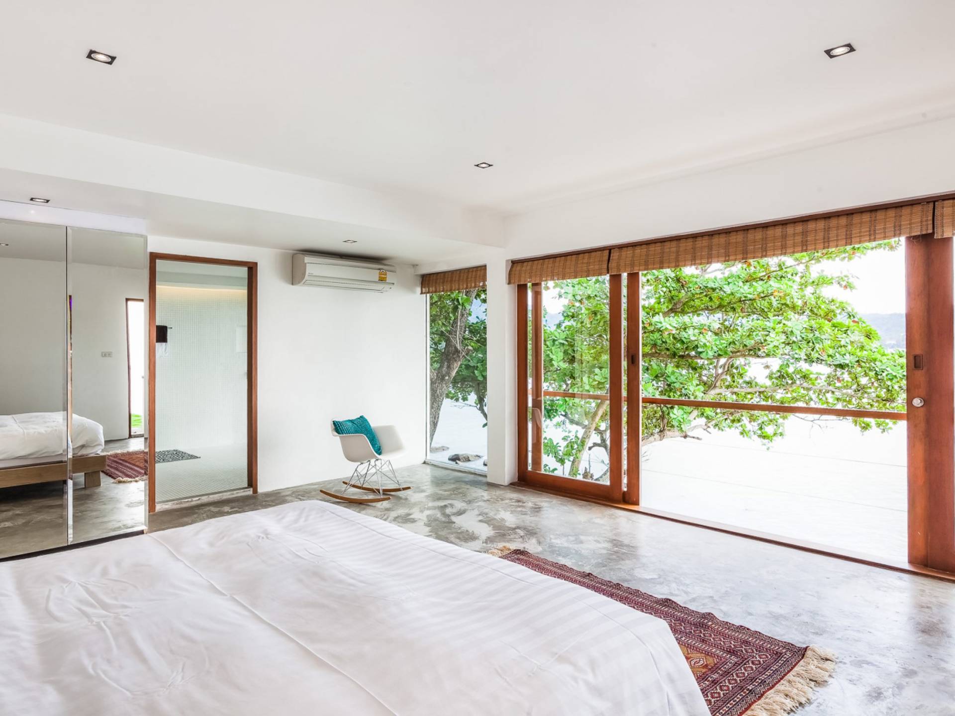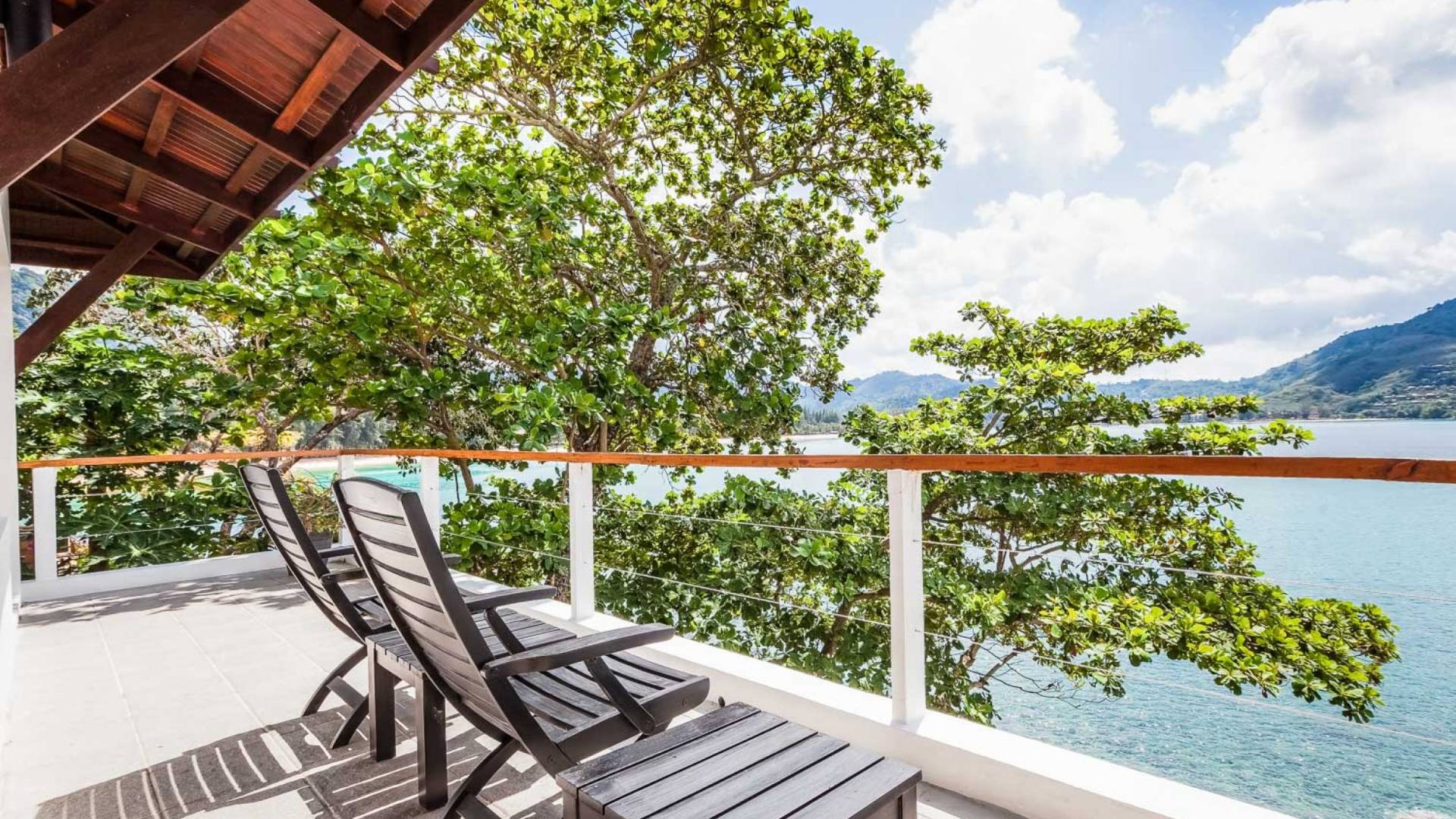 In der obersten Etage befindet sich das Wohnzimmer, das in einem der traditionellen Pavillons untergebracht ist. Die hohe Dachneigung dieses Architekturstils erhöht auf natürliche Weise die Luftzirkulation und das Licht in den Raum. Fast vollständig von raumhohen Glasfenstern und -türen umgeben, nutzt dieser Raum die Meeresbrise, die ständig durchtanzt, voll aus. Die Mischung aus modernen Möbeln und traditioneller Architektur ist dezent und geschmackvoll und gipfelt in einem attraktiven und harmonischen Interieur. Kunstvolle asiatische Artefakte aus der persönlichen Sammlung des Besitzers befinden sich zwischen modernen Stücken, darunter ein einzigartiger maßgefertigter Couchtisch und ein meisterhafter Kronleuchter.
