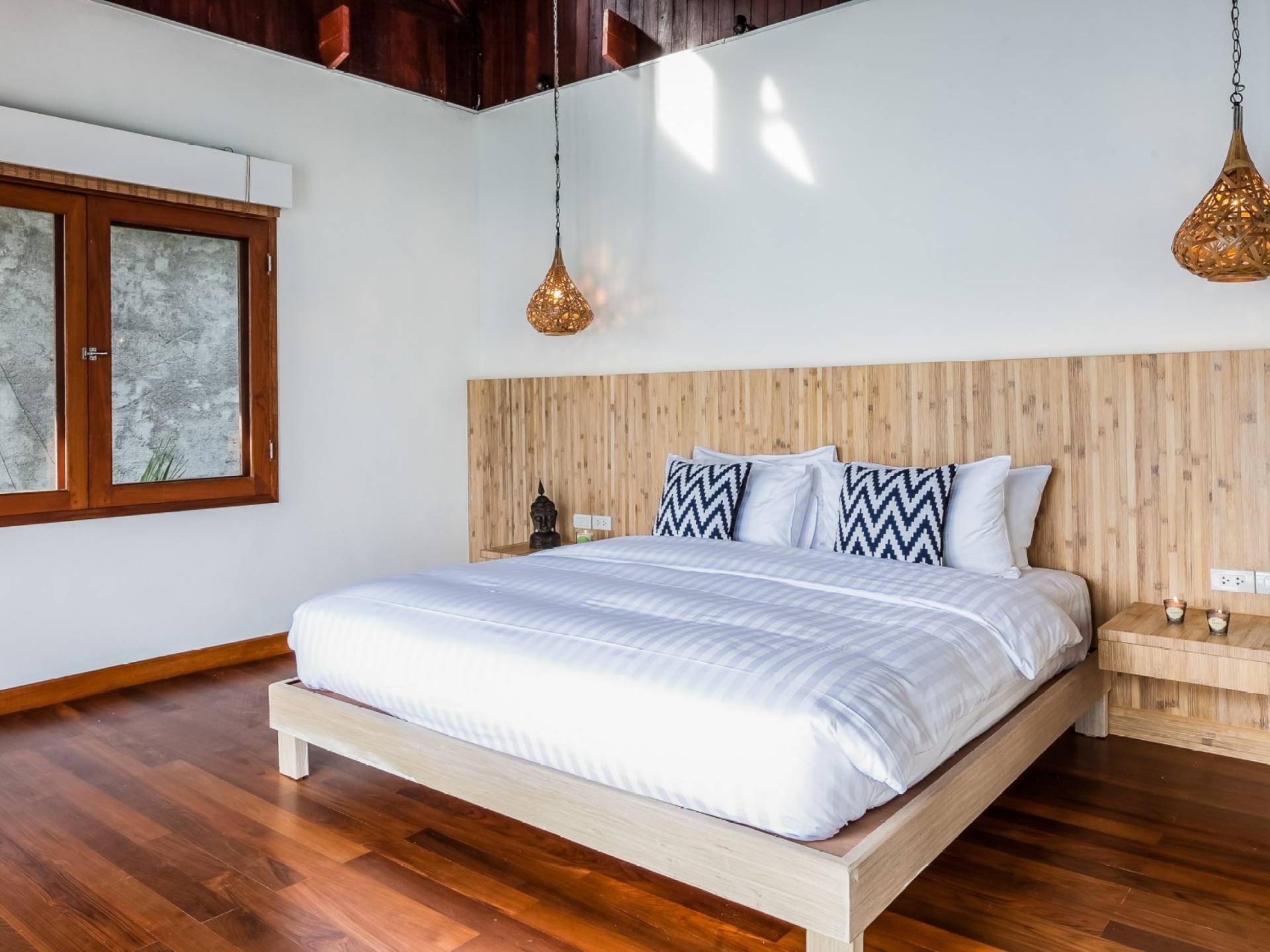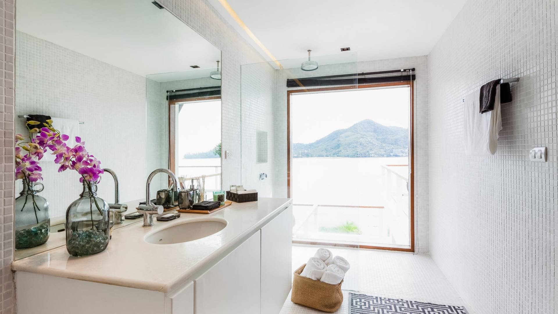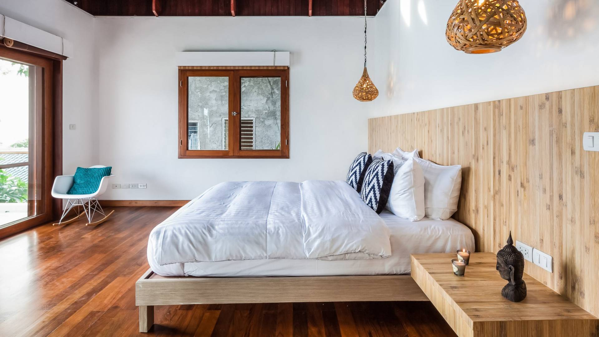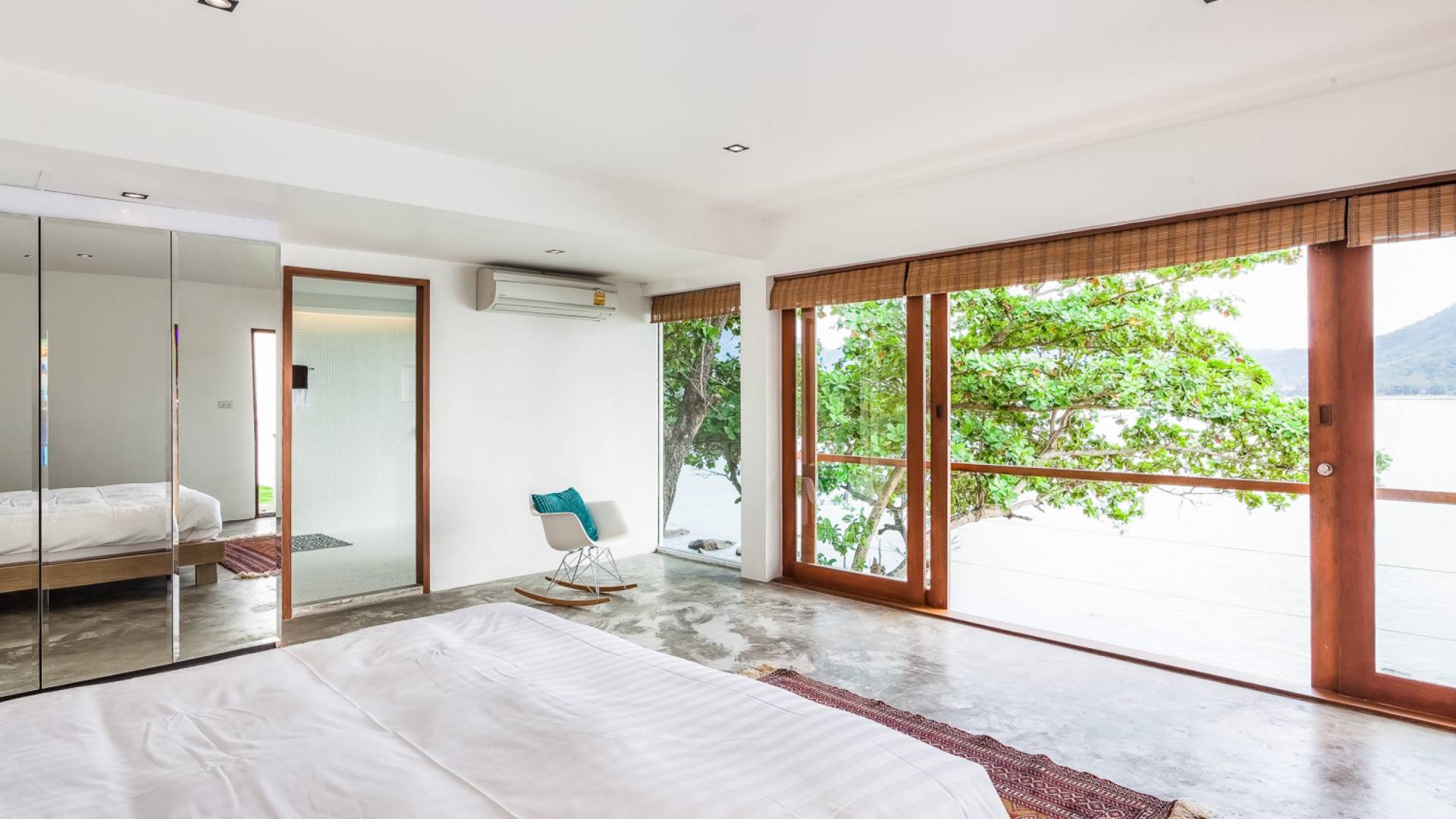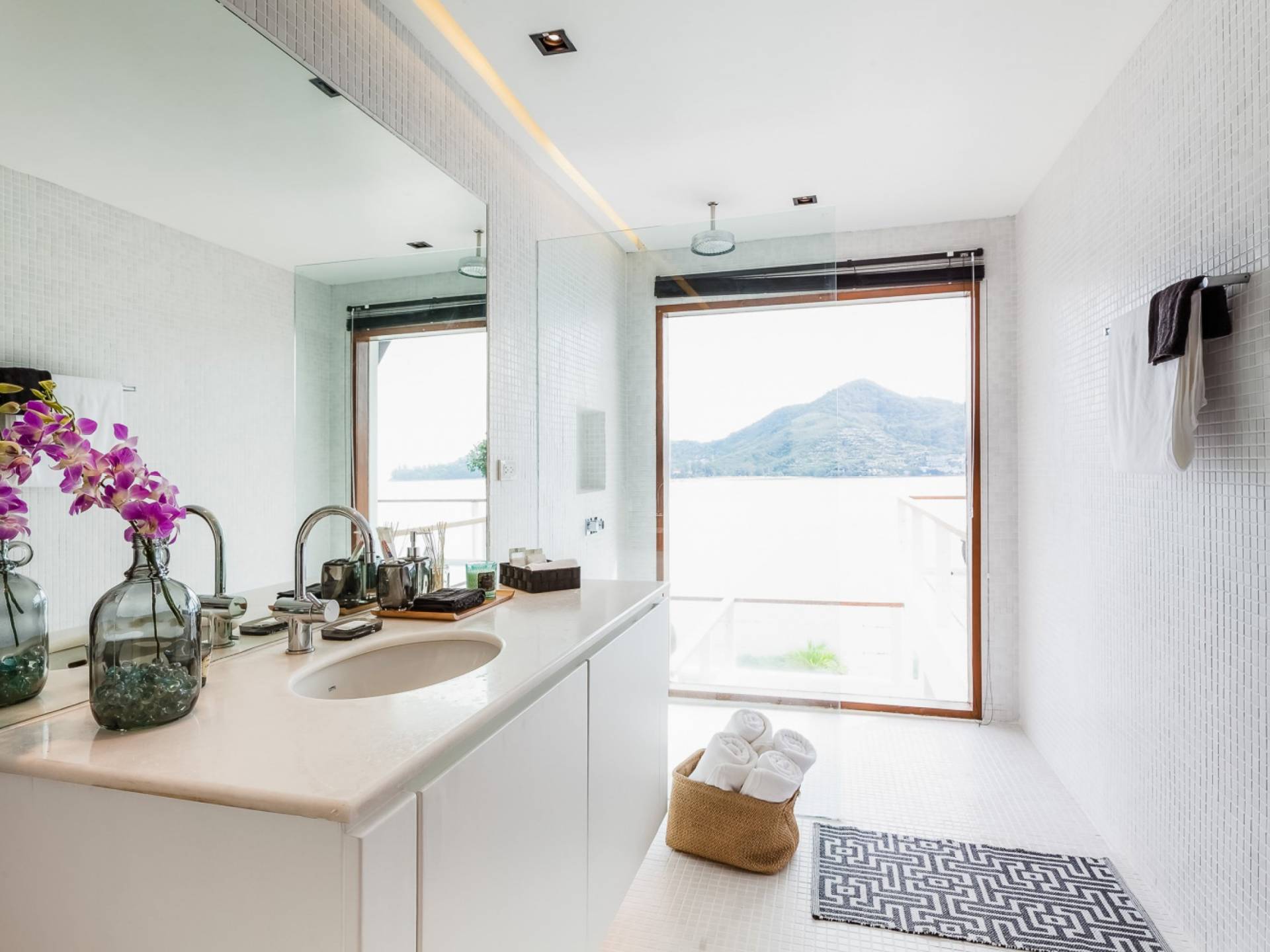 In der obersten Etage befindet sich das Wohnzimmer, das in einem der traditionellen Pavillons untergebracht ist. Die hohe Dachneigung dieses Architekturstils erhöht auf natürliche Weise die Luftzirkulation und das Licht in den Raum. Fast vollständig von raumhohen Glasfenstern und -türen umgeben, nutzt dieser Raum die Meeresbrise, die ständig durchtanzt, voll aus. Die Mischung aus modernen Möbeln und traditioneller Architektur ist dezent und geschmackvoll und gipfelt in einem attraktiven und harmonischen Interieur. Kunstvolle asiatische Artefakte aus der persönlichen Sammlung des Besitzers befinden sich zwischen modernen Stücken, darunter ein einzigartiger maßgefertigter Couchtisch und ein meisterhafter Kronleuchter.