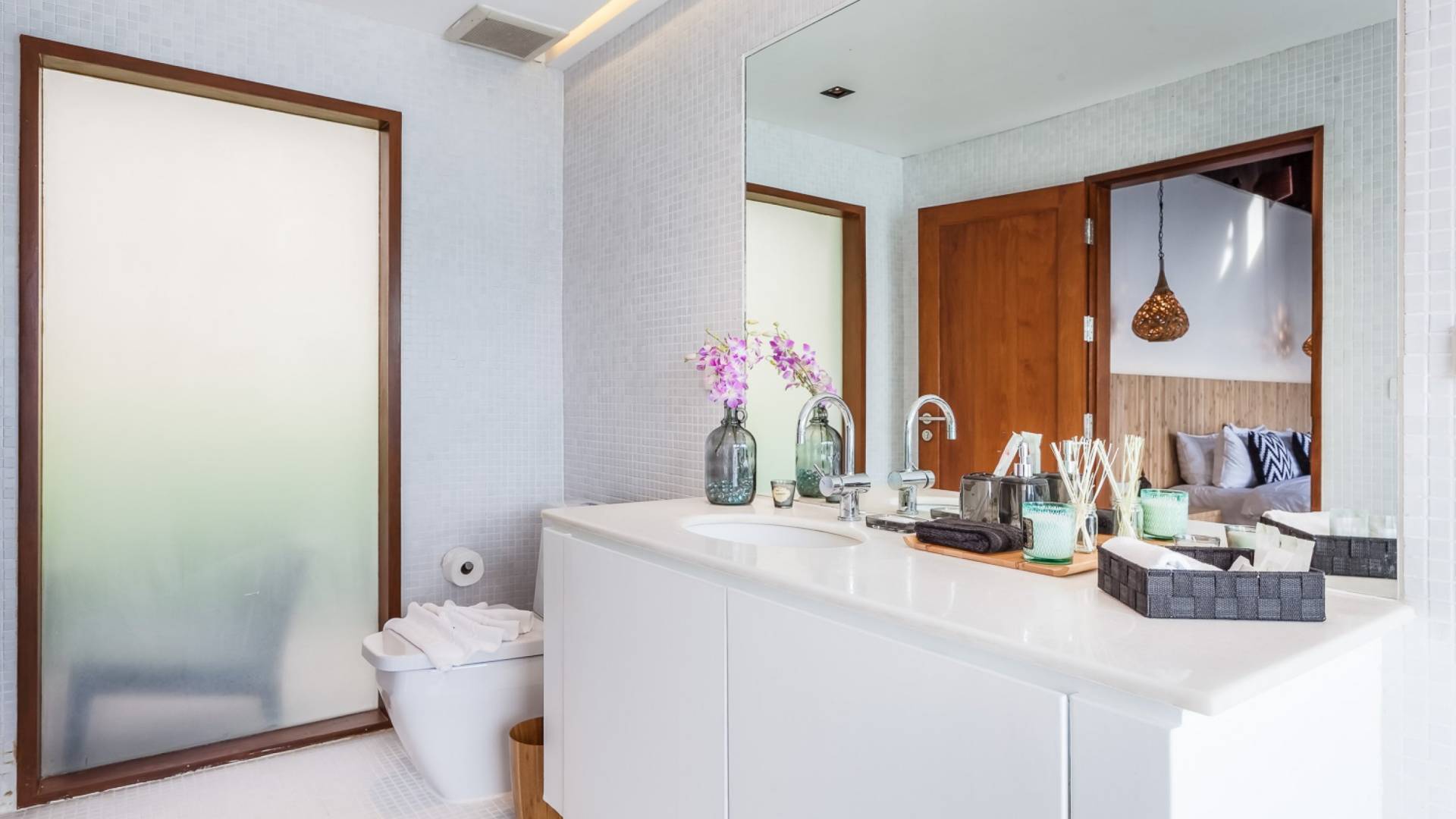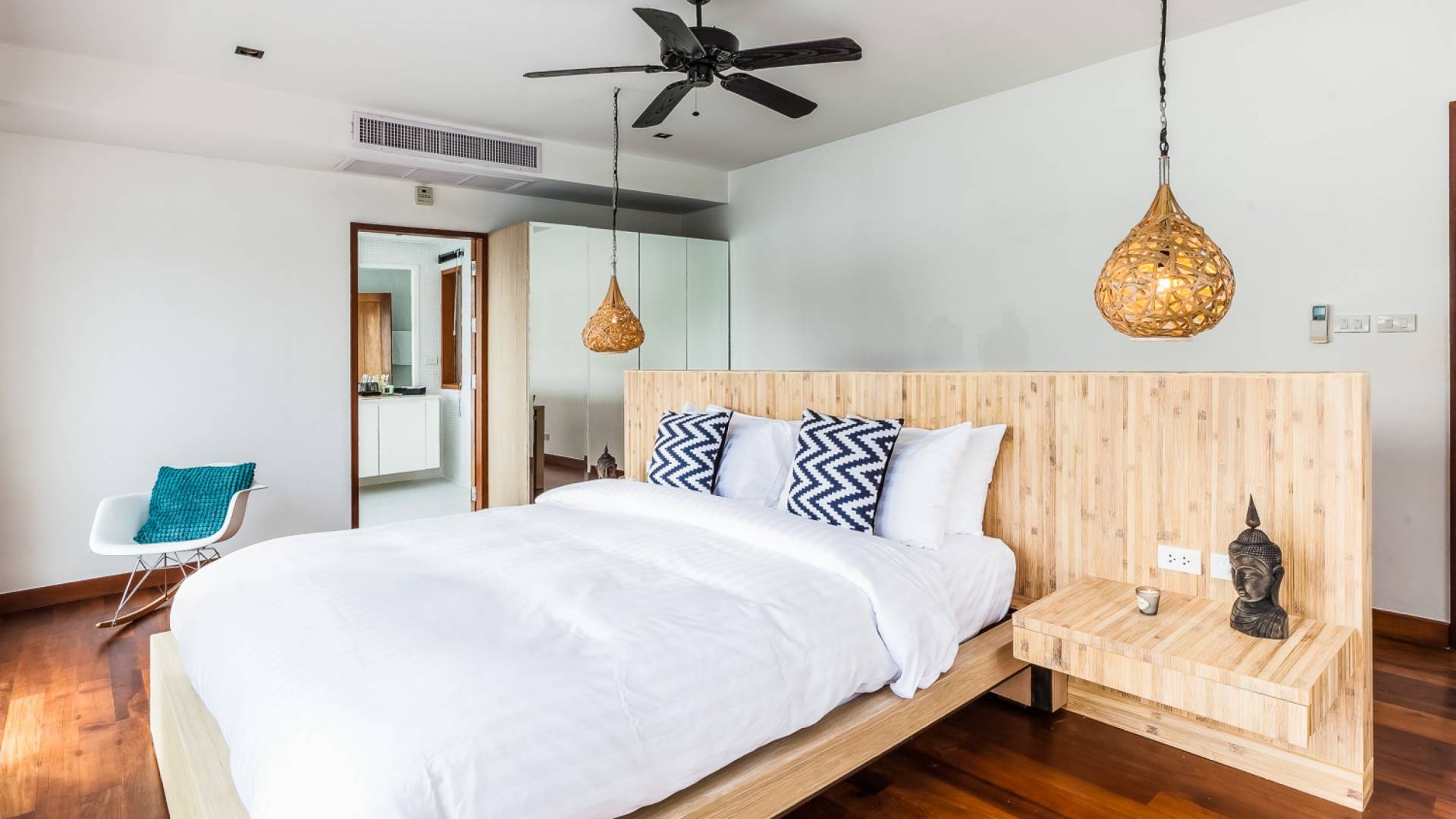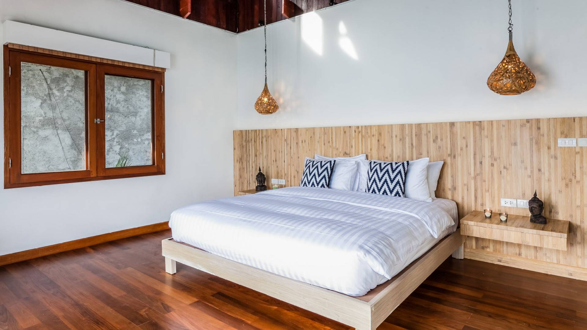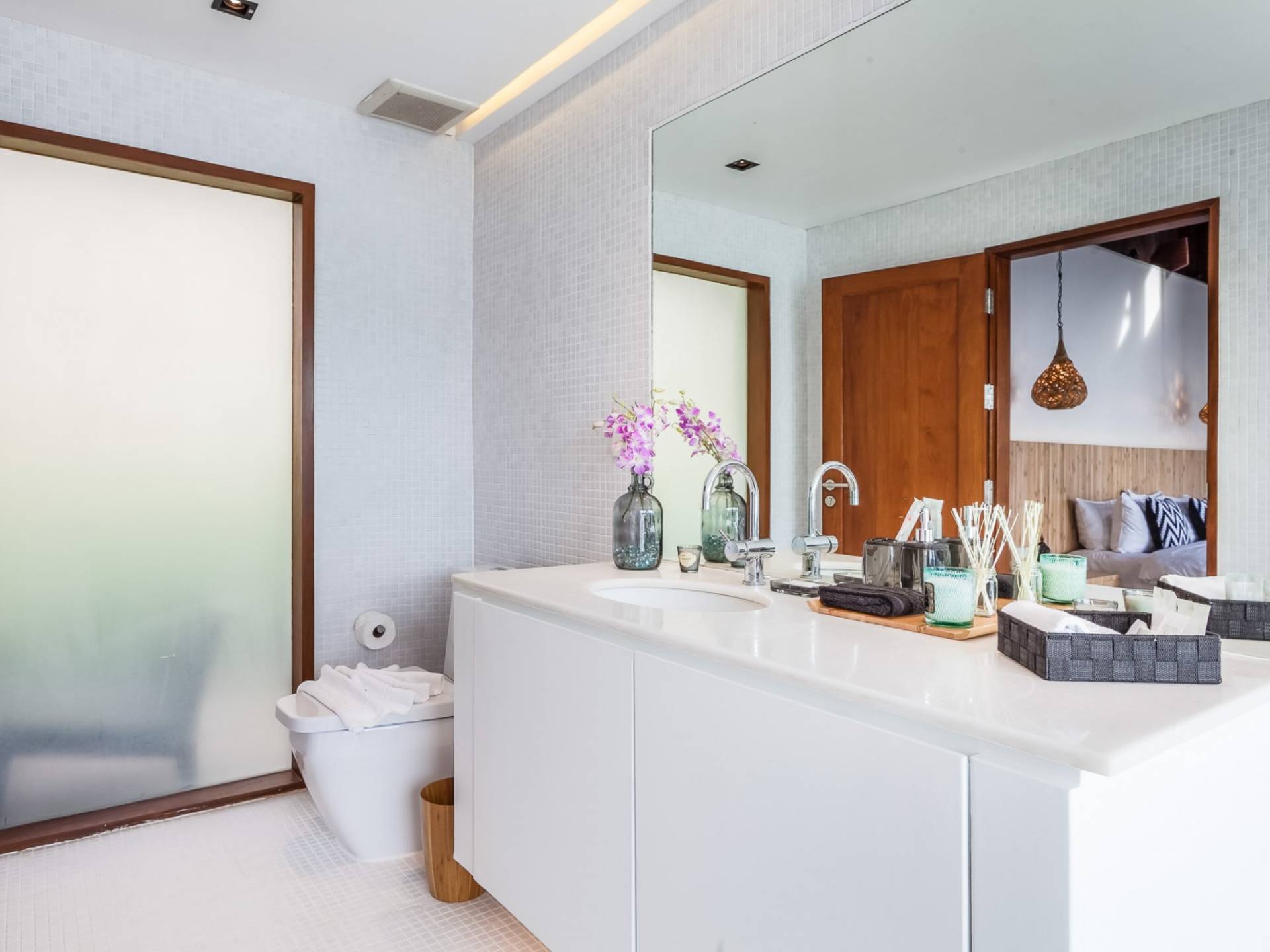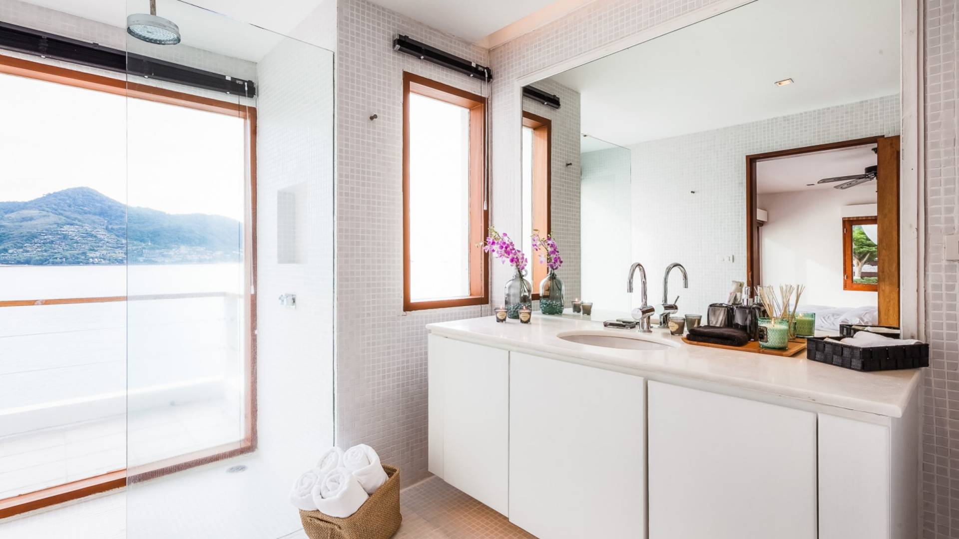 In der obersten Etage befindet sich das Wohnzimmer, das in einem der traditionellen Pavillons untergebracht ist. Die hohe Dachneigung dieses Architekturstils erhöht auf natürliche Weise die Luftzirkulation und das Licht in den Raum. Fast vollständig von raumhohen Glasfenstern und -türen umgeben, nutzt dieser Raum die Meeresbrise, die ständig durchtanzt, voll aus. Die Mischung aus modernen Möbeln und traditioneller Architektur ist dezent und geschmackvoll und gipfelt in einem attraktiven und harmonischen Interieur. Kunstvolle asiatische Artefakte aus der persönlichen Sammlung des Besitzers befinden sich zwischen modernen Stücken, darunter ein einzigartiger maßgefertigter Couchtisch und ein meisterhafter Kronleuchter.