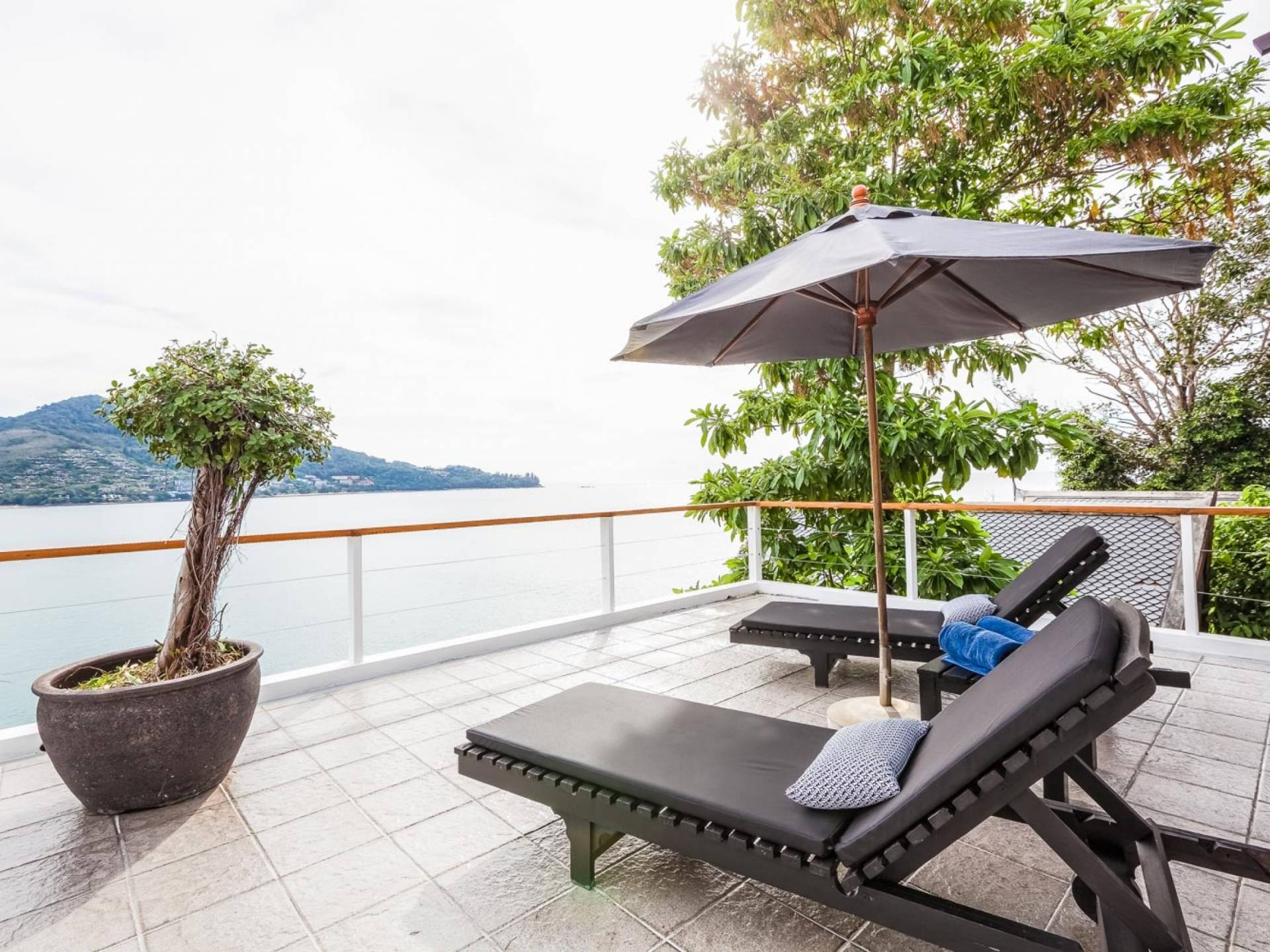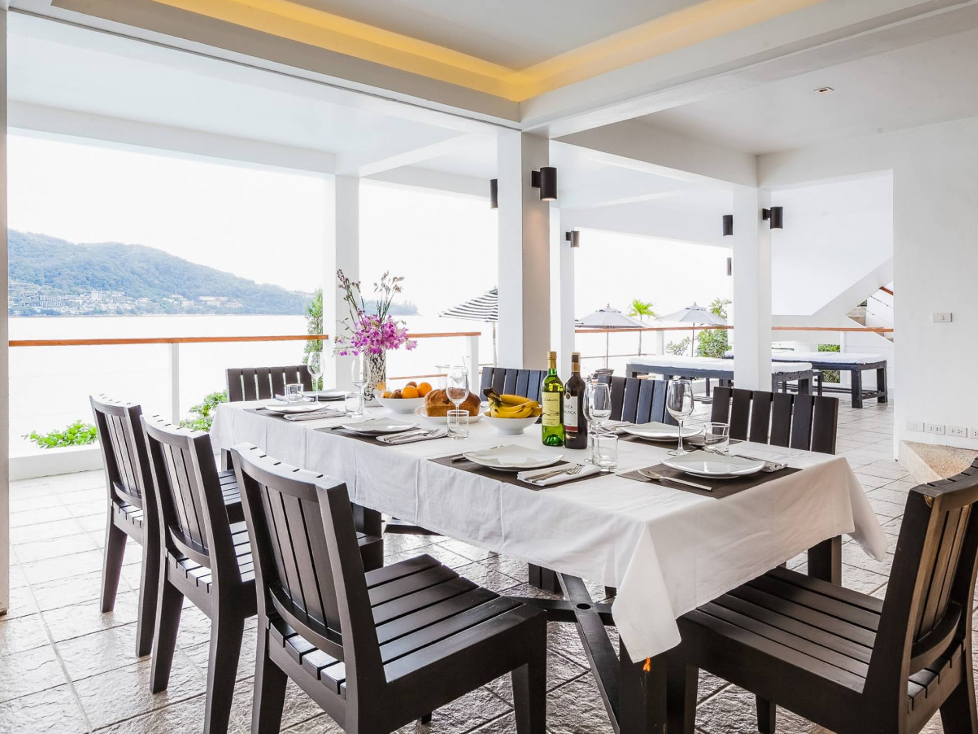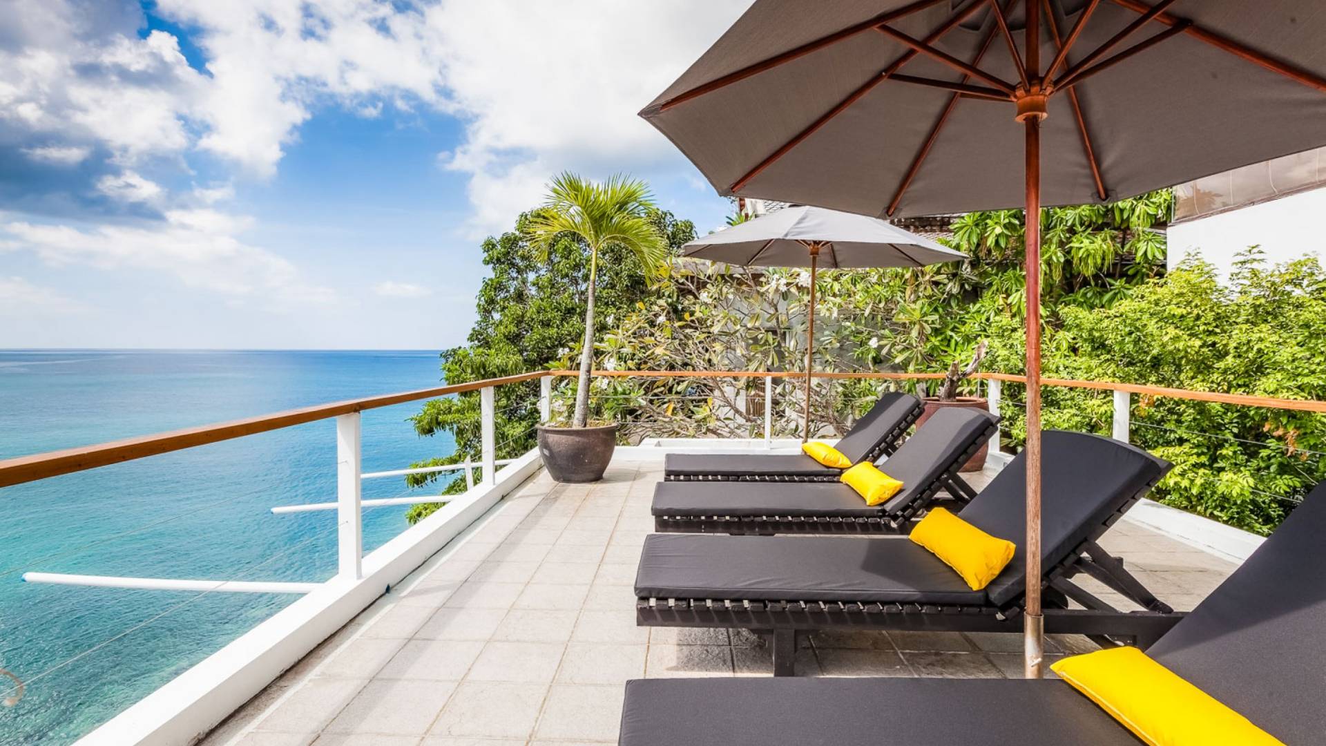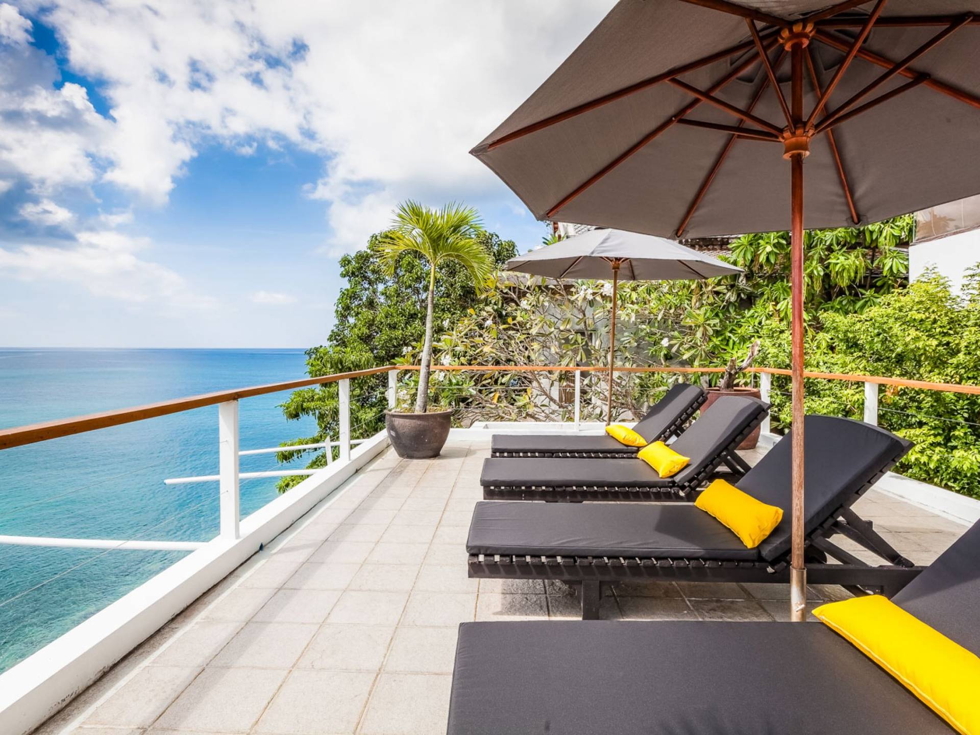 Angrenzend an den Pool und durch einen schmalen Holzsteg verbunden befindet sich eine große Terrasse, die fast direkt über dem Meer thront. Mit Liegen und Sonnenschirmen ist dies ein idyllischer Ort zum Sonnenbaden.