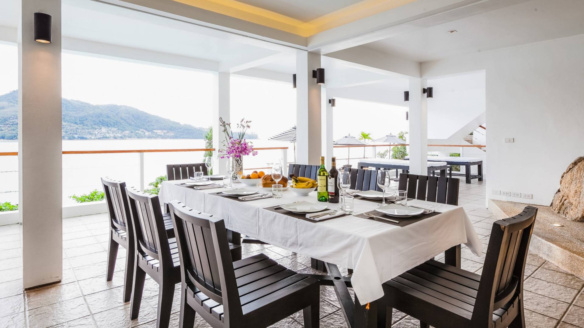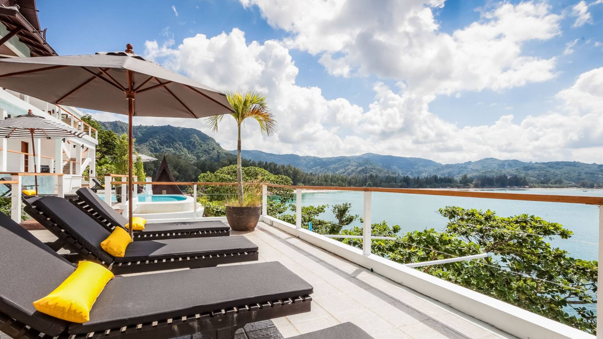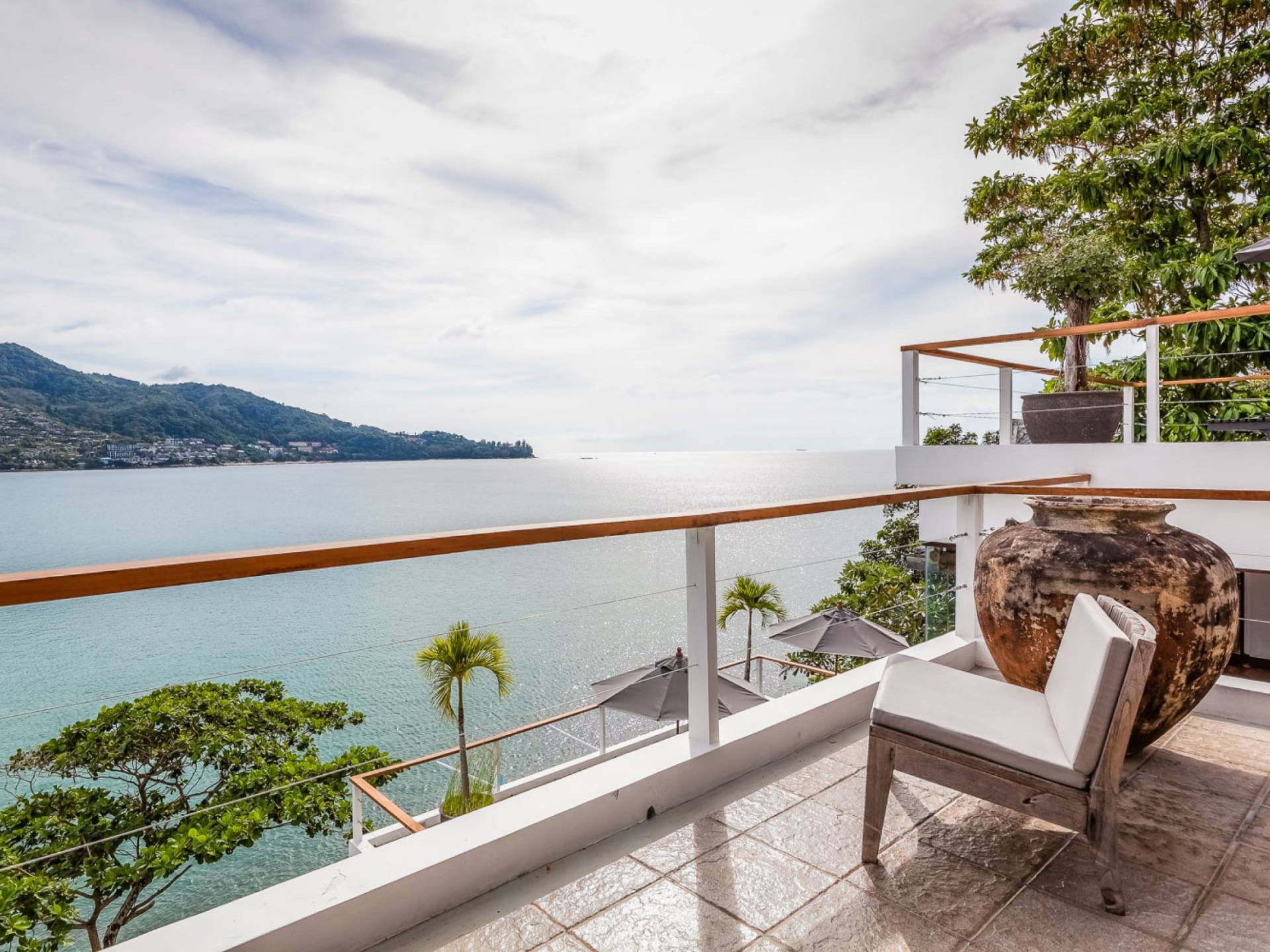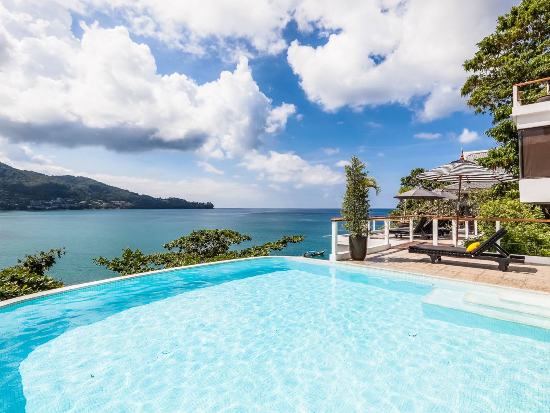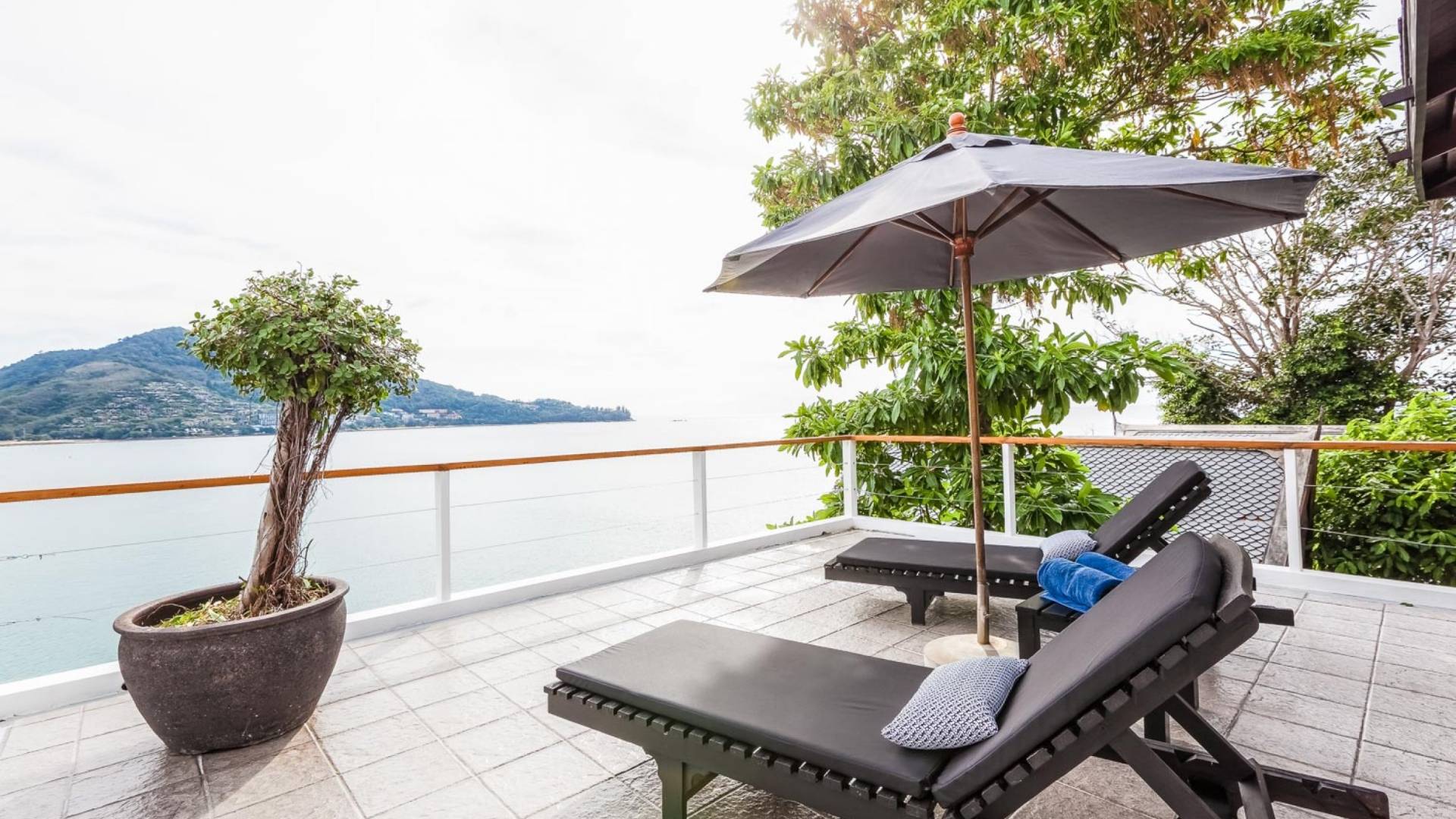 Angrenzend an den Pool und durch einen schmalen Holzsteg verbunden befindet sich eine große Terrasse, die fast direkt über dem Meer thront. Mit Liegen und Sonnenschirmen ist dies ein idyllischer Ort zum Sonnenbaden.