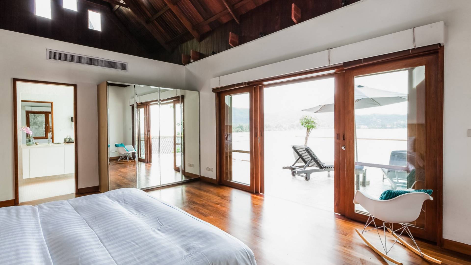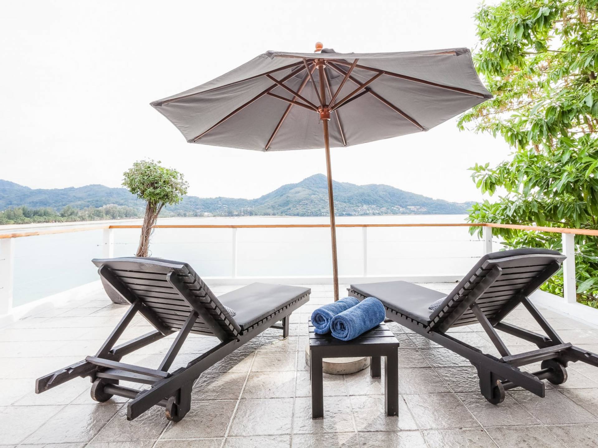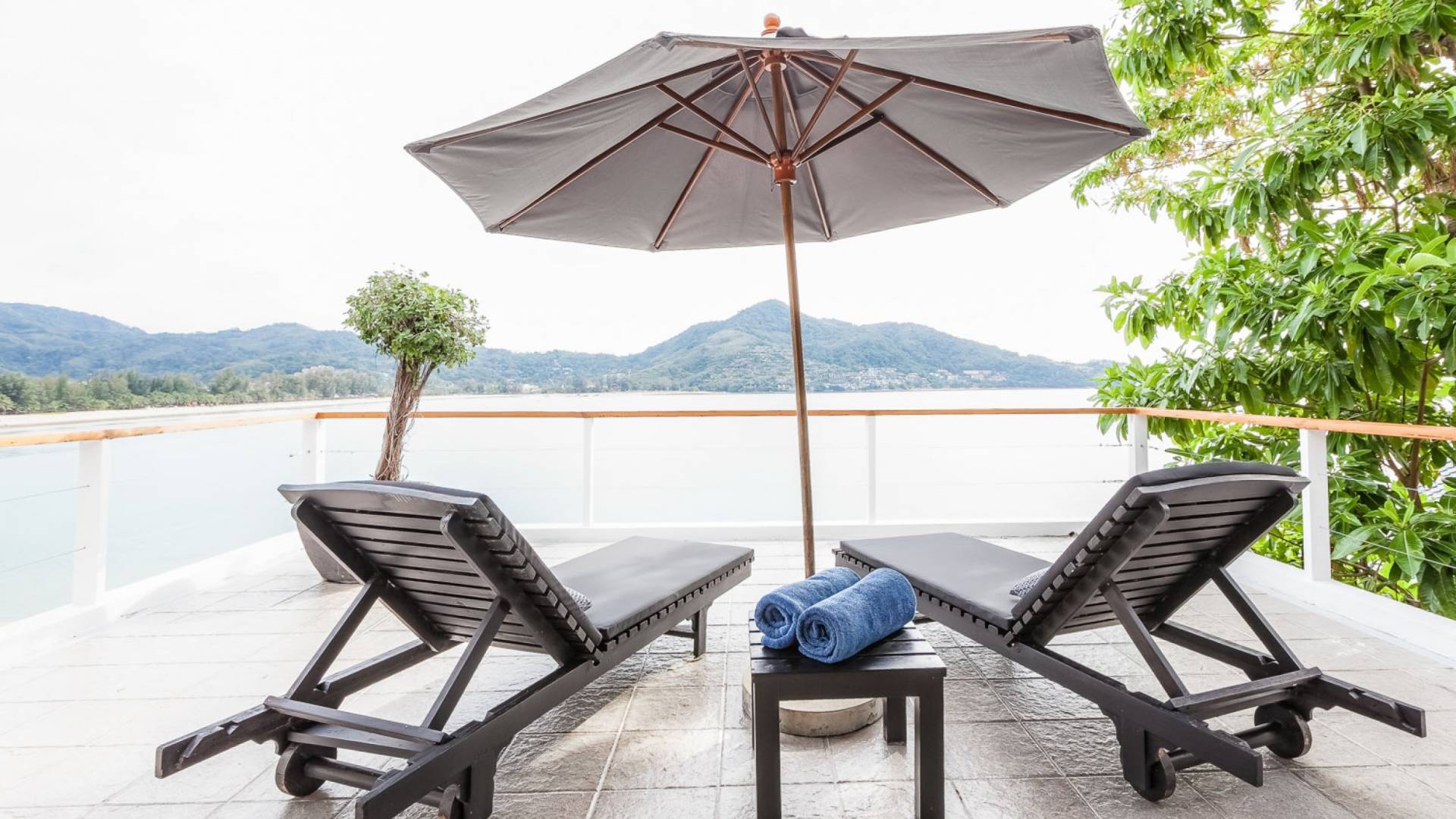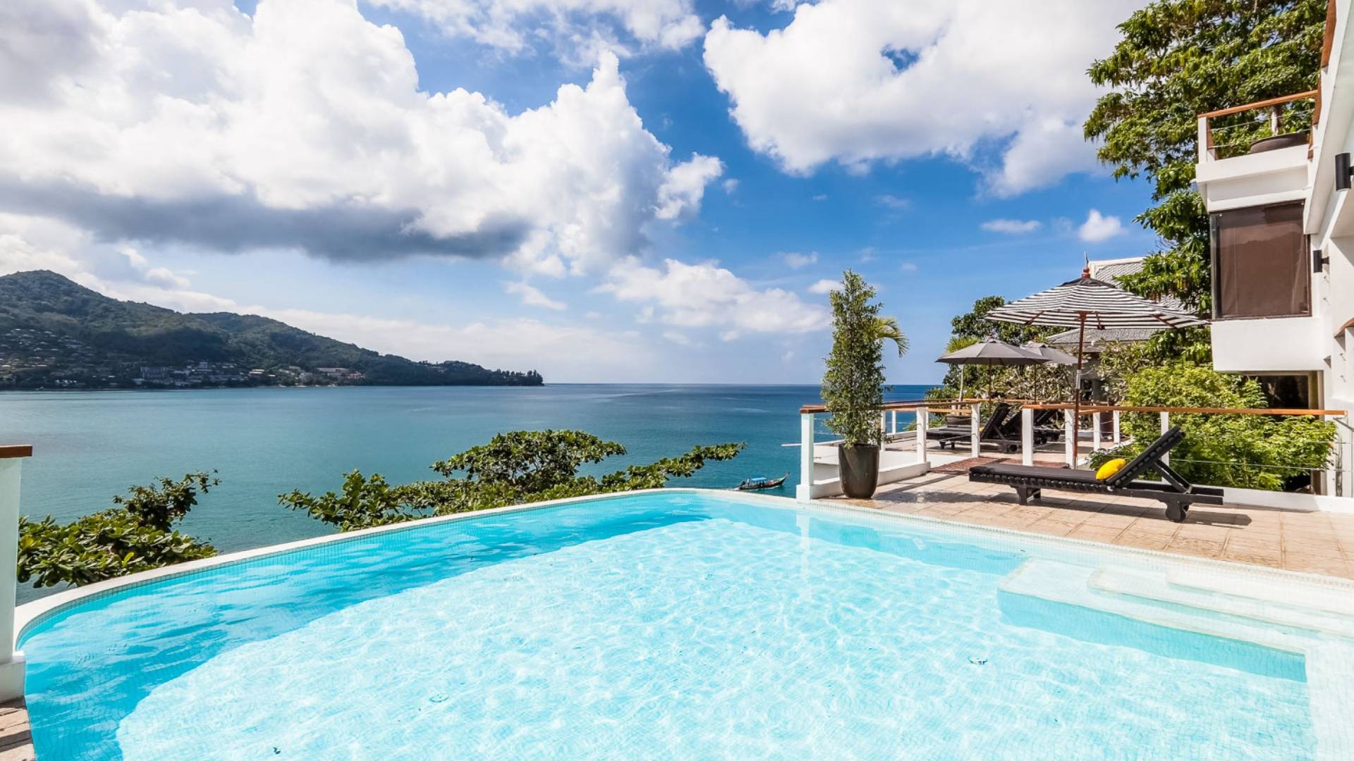 Angrenzend an den Pool und durch einen schmalen Holzsteg verbunden befindet sich eine große Terrasse, die fast direkt über dem Meer thront. Mit Liegen und Sonnenschirmen ist dies ein idyllischer Ort zum Sonnenbaden.