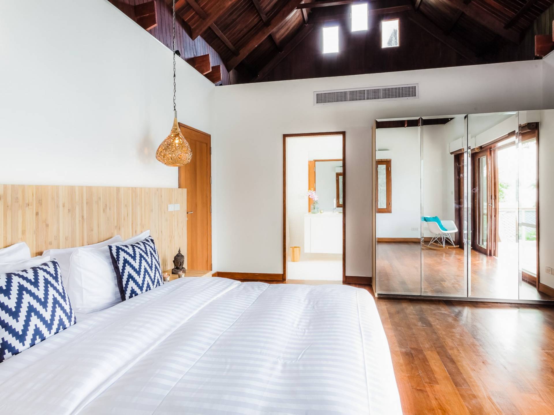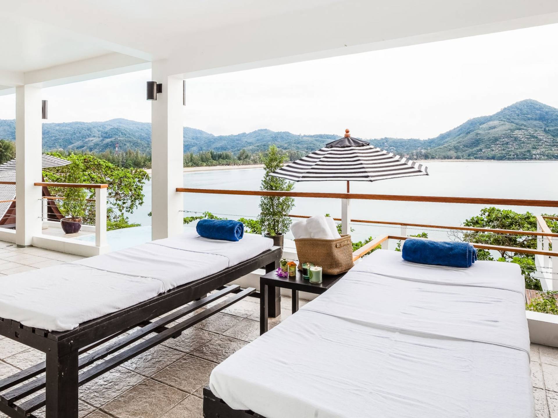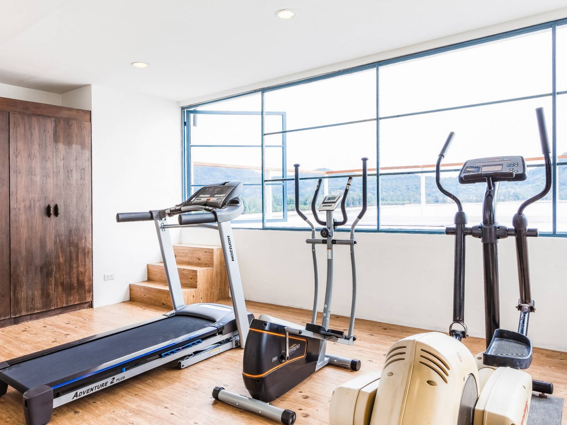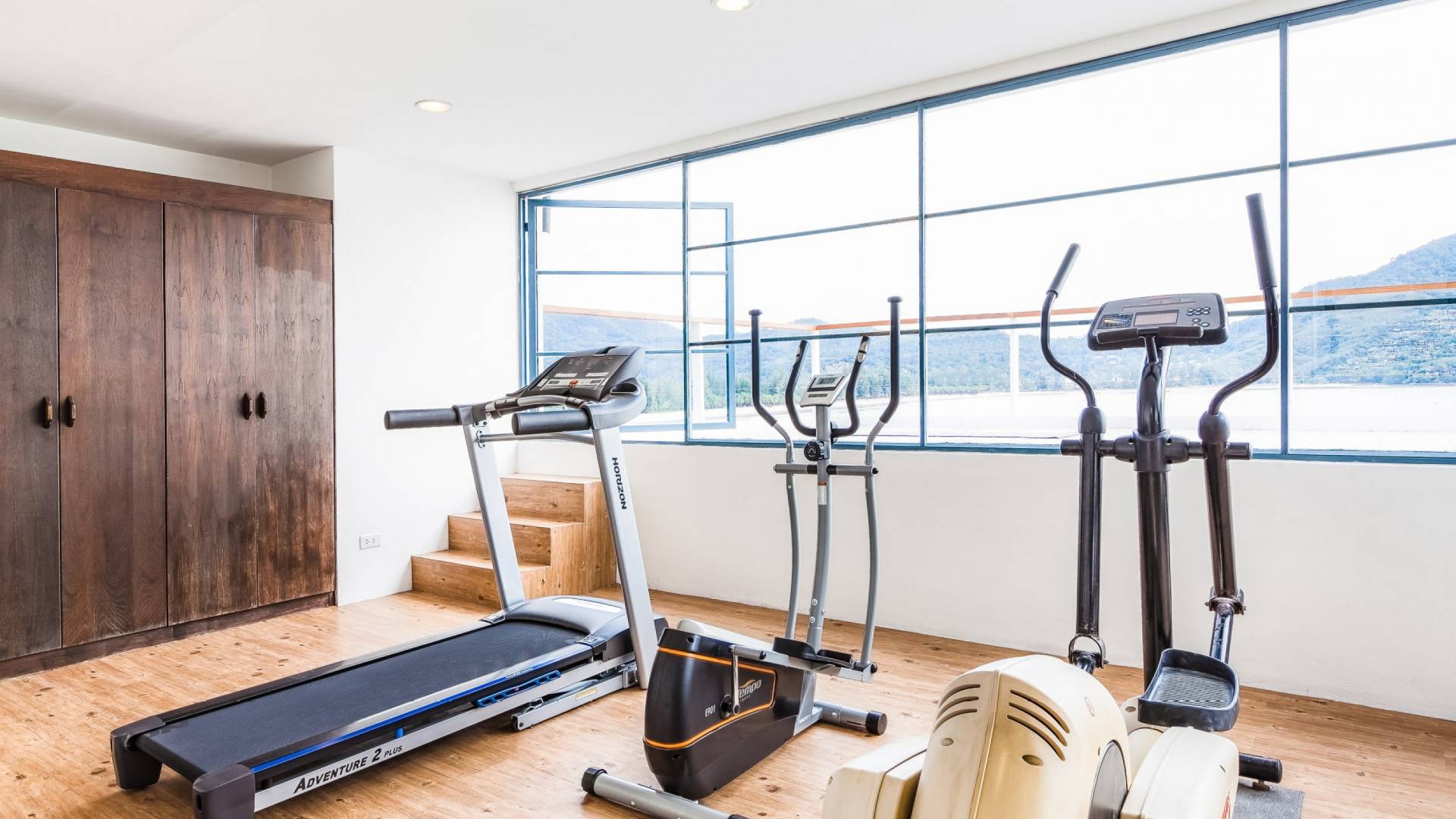Die Villa Nevaeh Phuket ist in den steilen Hang eingeschnitten und besteht aus einer Reihe von Pavillons im thailändischen Stil, die durch Gehwege und ein Labyrinth von Treppen verbunden sind, die sich um das Grundstück winden. Der Eintritt erfolgt neben dem klimatisierten Gym auf der obersten Ebene. Der Raum ist von raumhohen Glasfenstern eingerahmt und verfügt über ein Laufband, einen Ellipsentrainer, eine Sit-Up-Bank, Yogamatten, Pilate-Ball und Gewichte. Die Gym-Terrasse mit Blick auf das Meer ist perfekt für Yoga-Sitzungen im Freien. Für alle, die gerne im Urlaub trainieren, wird es mit der Aussicht zum Genusserlebnis.