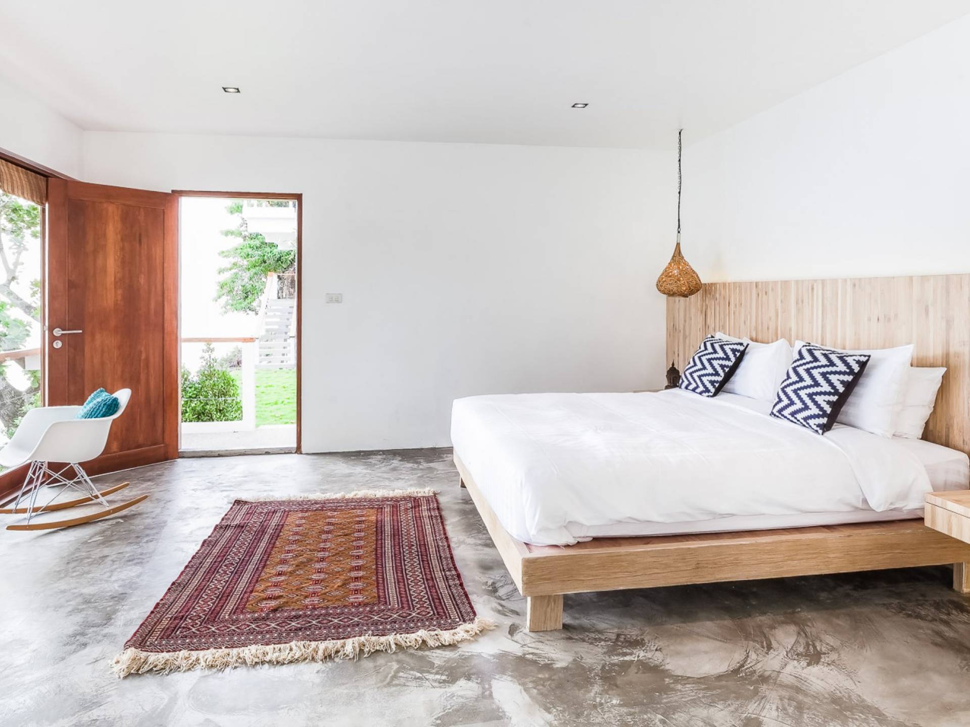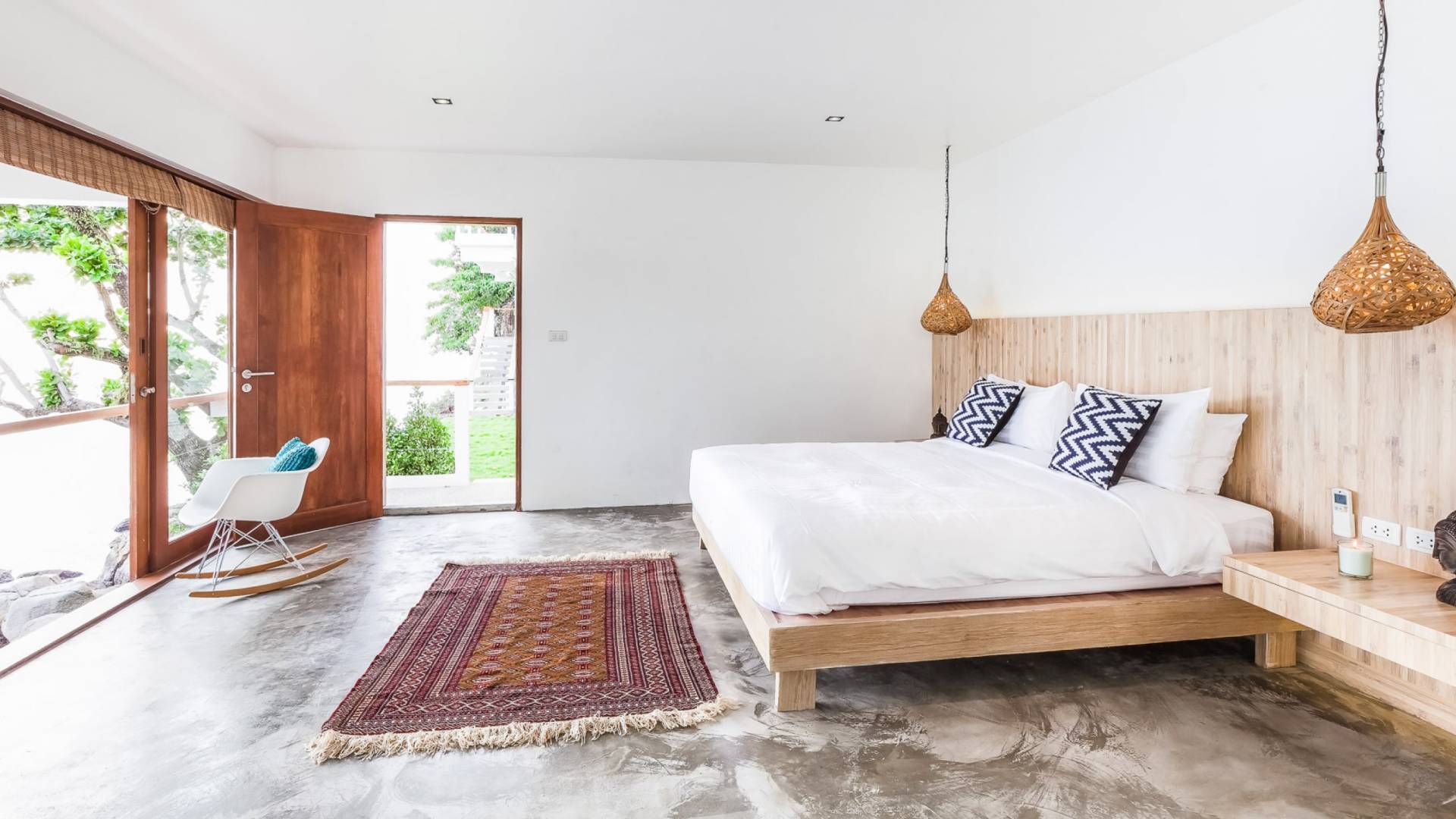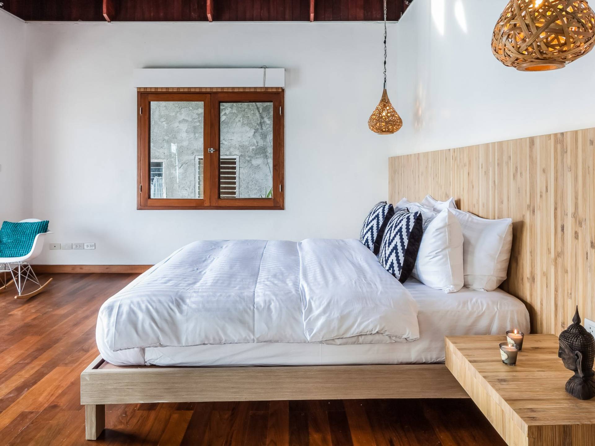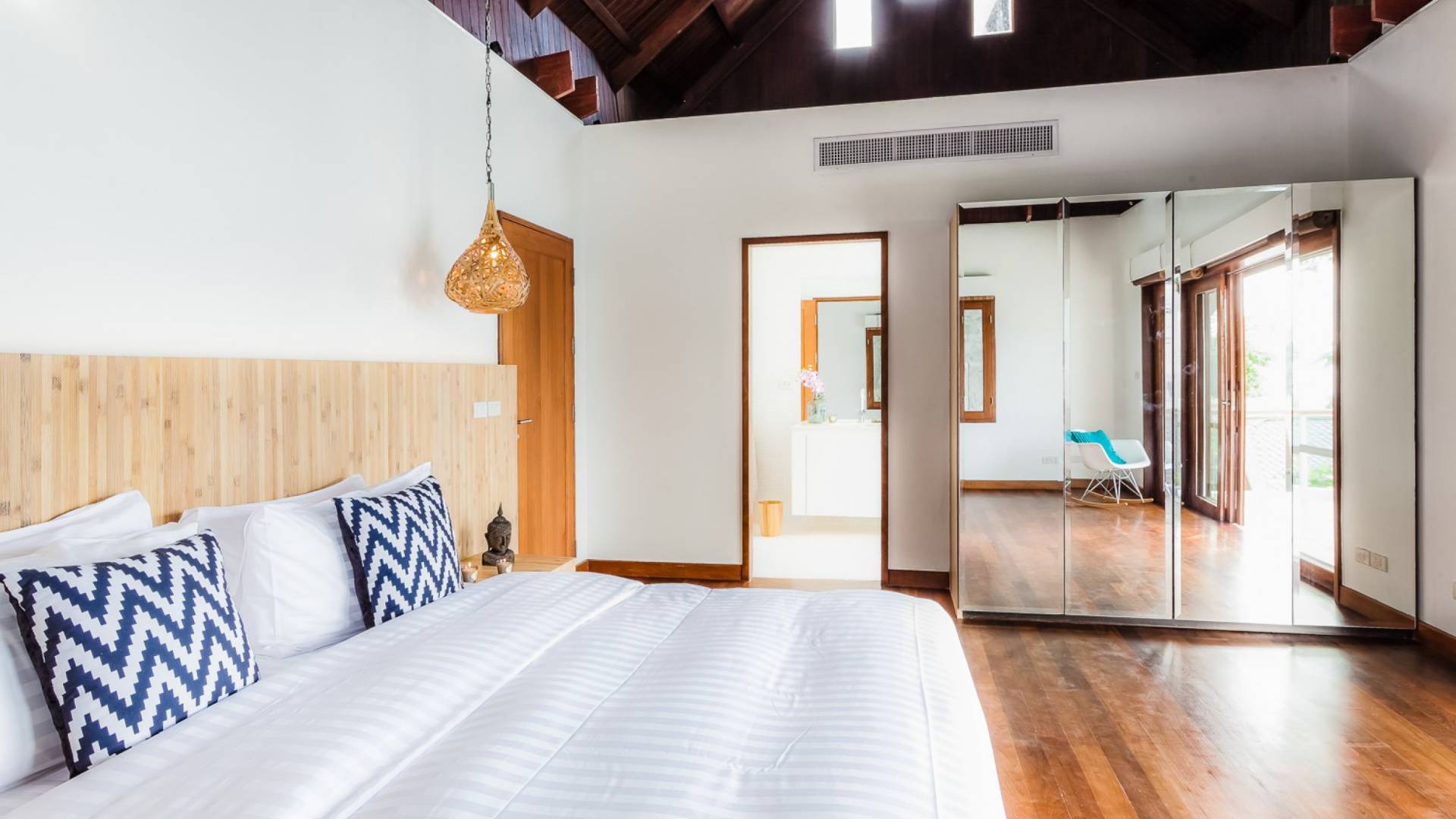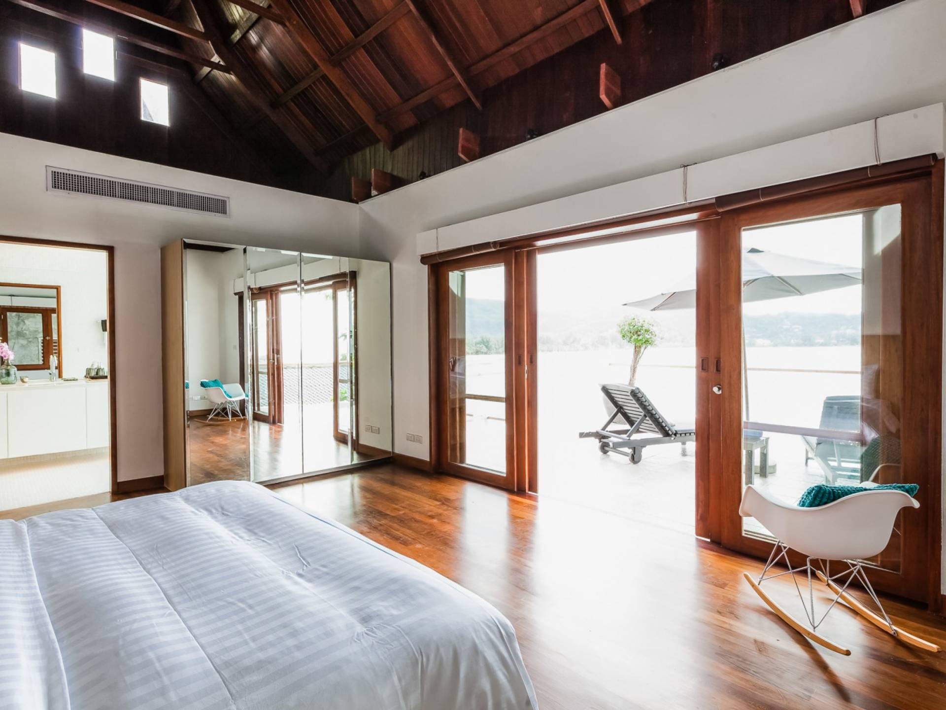 Die Villa Nevaeh Phuket ist in den steilen Hang eingeschnitten und besteht aus einer Reihe von Pavillons im thailändischen Stil, die durch Gehwege und ein Labyrinth von Treppen verbunden sind, die sich um das Grundstück winden. Der Eintritt erfolgt neben dem klimatisierten Gym auf der obersten Ebene. Der Raum ist von raumhohen Glasfenstern eingerahmt und verfügt über ein Laufband, einen Ellipsentrainer, eine Sit-Up-Bank, Yogamatten, Pilate-Ball und Gewichte. Die Gym-Terrasse mit Blick auf das Meer ist perfekt für Yoga-Sitzungen im Freien. Für alle, die gerne im Urlaub trainieren, wird es mit der Aussicht zum Genusserlebnis.