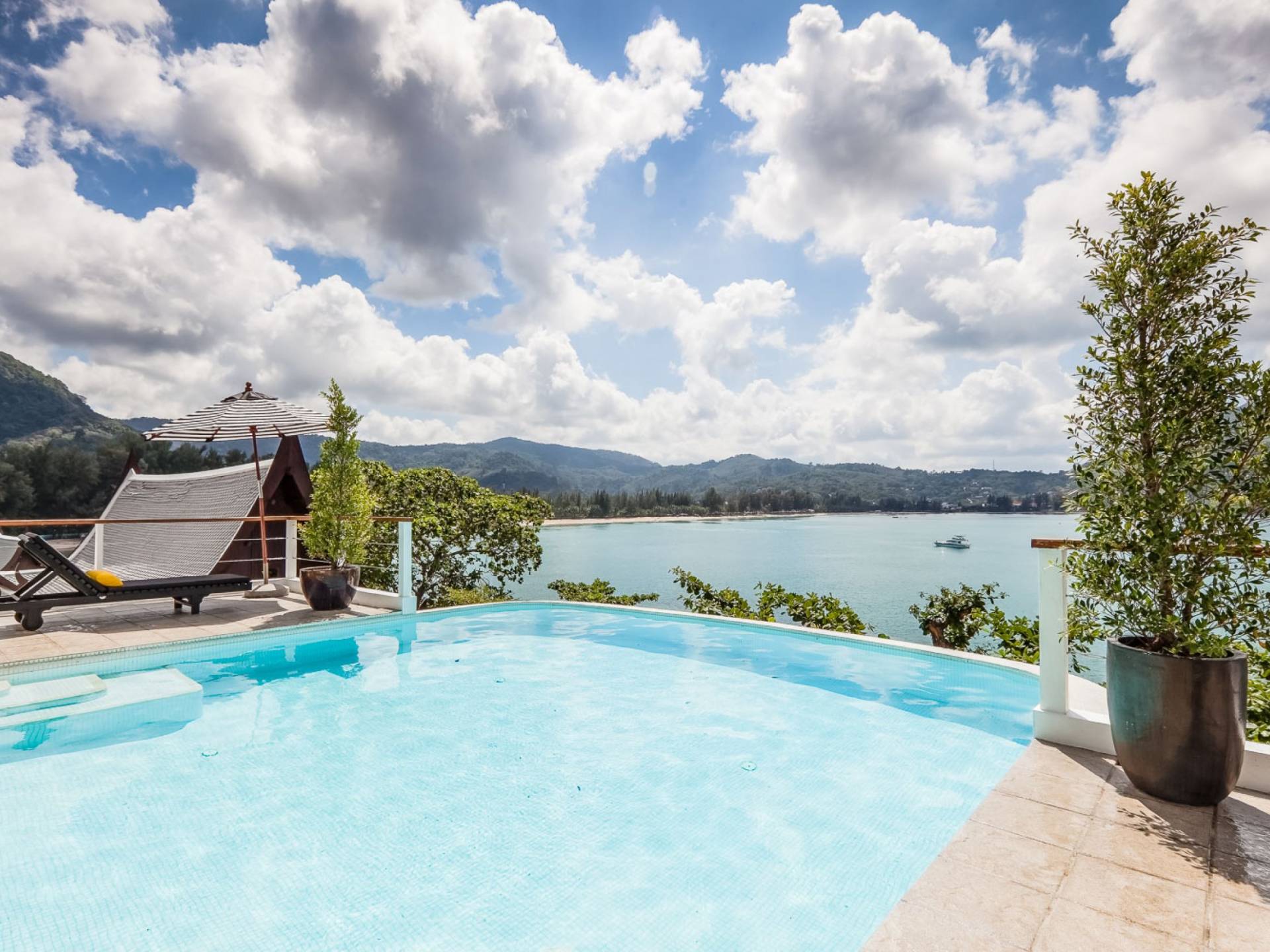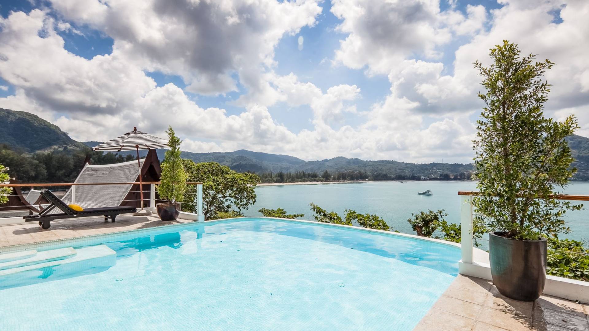 Eine Ebene tiefer befindet sich der Infinity-Edge-Pool. Der Pool liegt zentral in der Villa Nevaeh Phuket und wird von einem großen Bar-/Essbereich mit offenem Schnitt flankiert. Direkt neben dem Pool gelegen, ist dieser Bereich luftig und beruhigend. An eine Wand aus natürlichen Felsen gelehnt, ist der Bar-/Essbereich der beste Ort, um den Meerblick zu genießen, während Sie Cocktails trinken und die Sehenswürdigkeiten genießen.