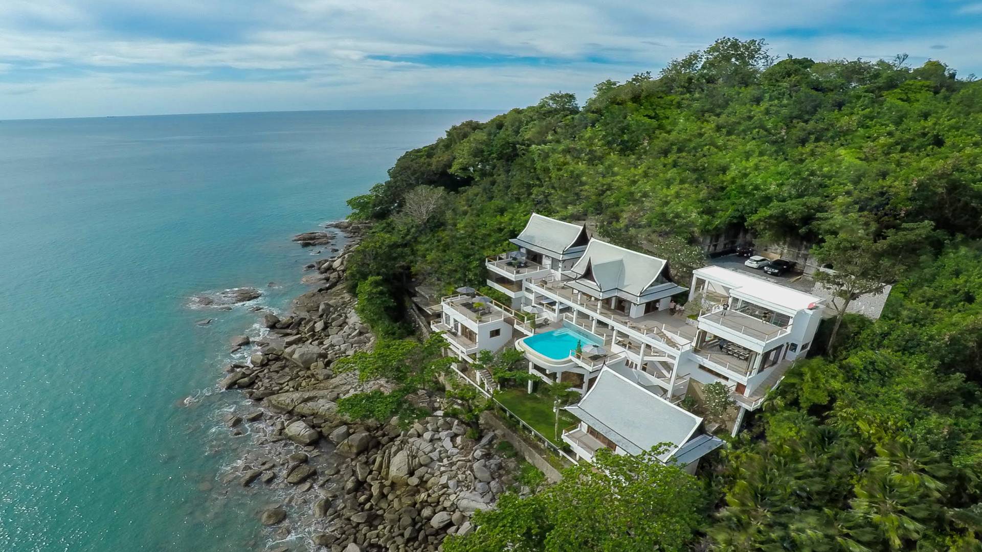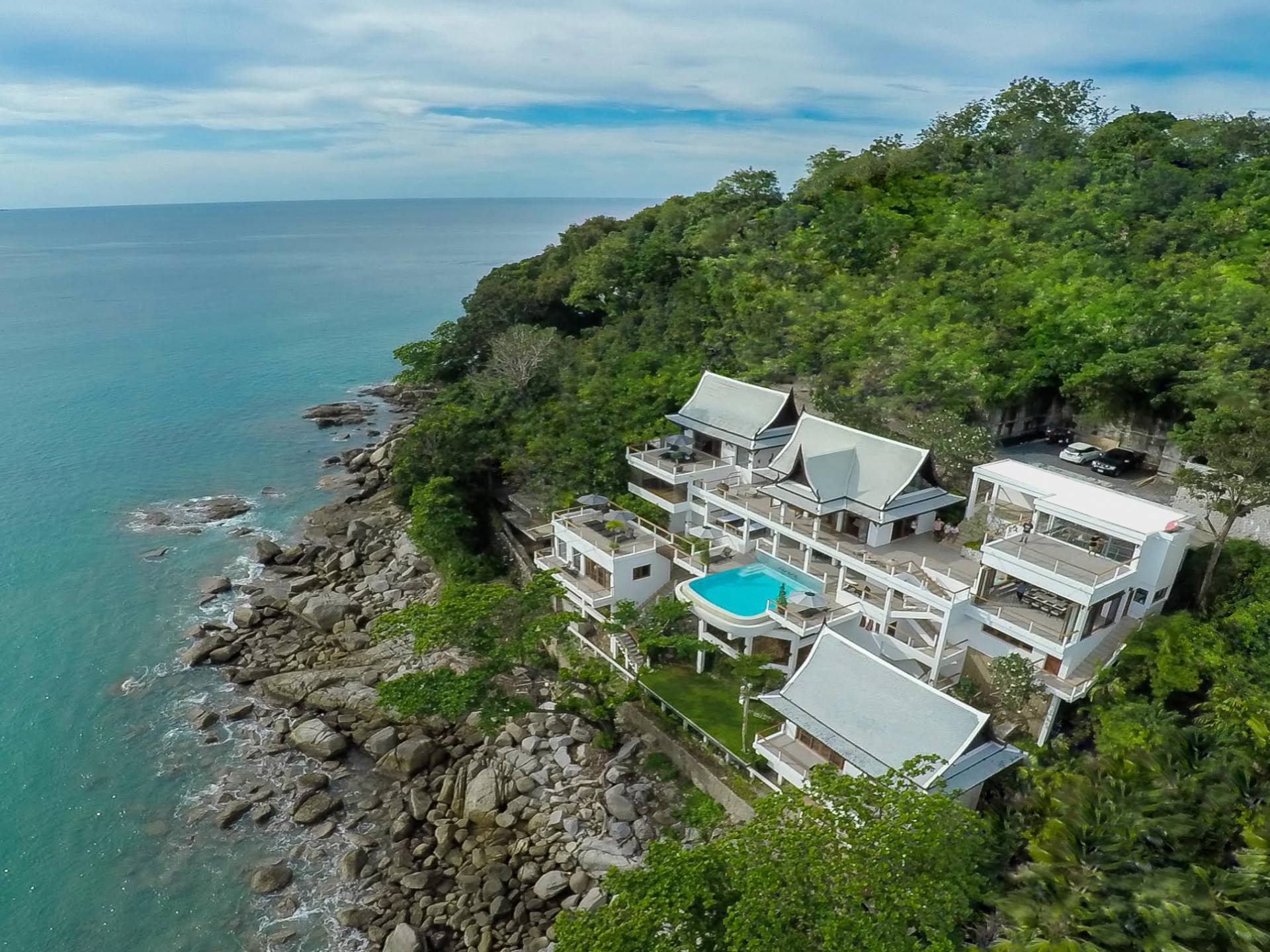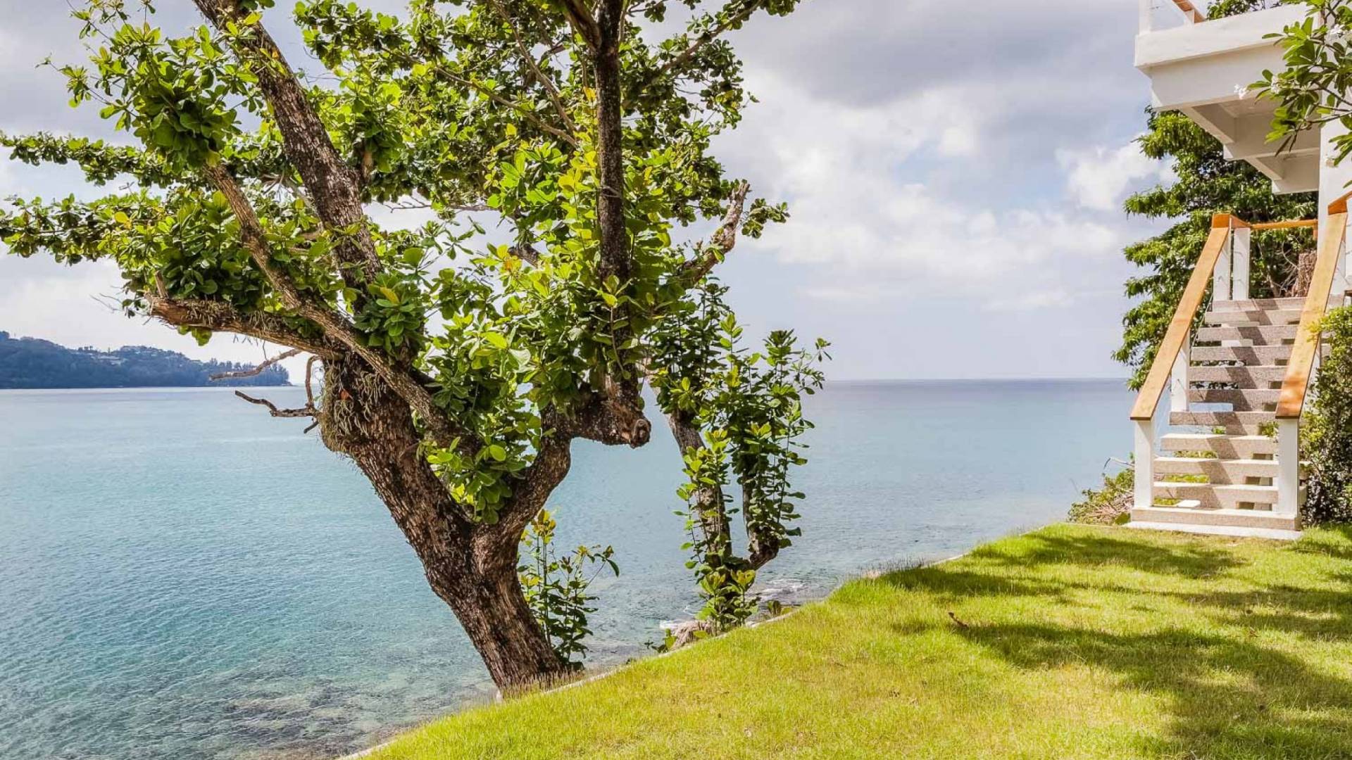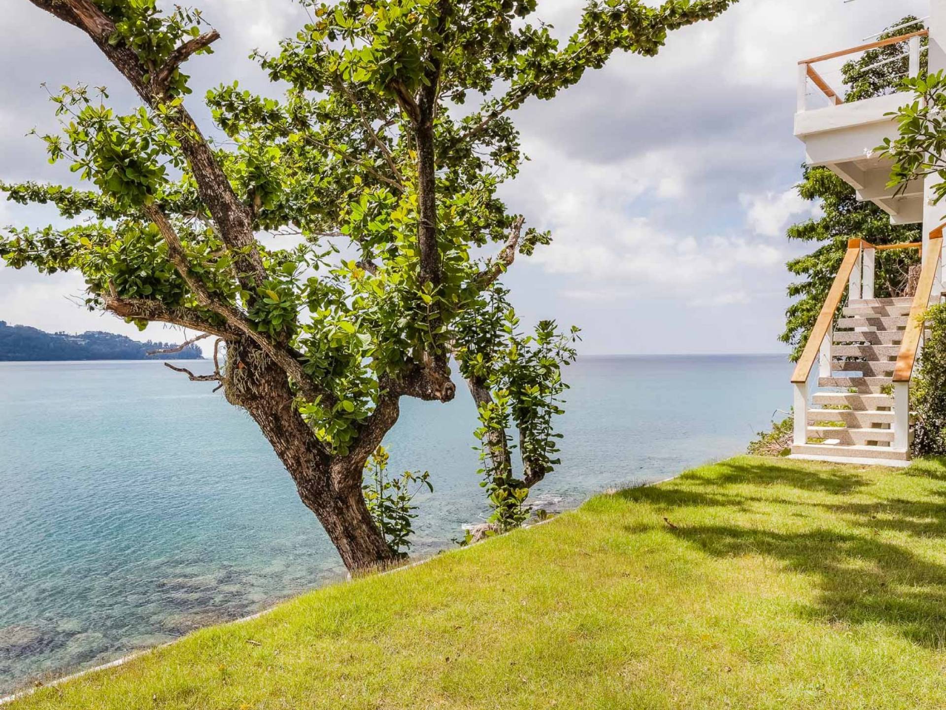 Auf dem Weg nach unten liegt die Rasenterrasse auf Meereshöhe vor einer felsigen Bucht. Ob Sie in Ruhe ein Buch lesen, dem Rauschen der Wellen lauschen, ein romantisches Abendessen am Wasser genießen oder sogar eine intime Zeremonie organisieren möchten, die Rasenterrasse am Meer der Villa Nevaeh Phuket bietet einen einzigartigen Ort der Entspannung.