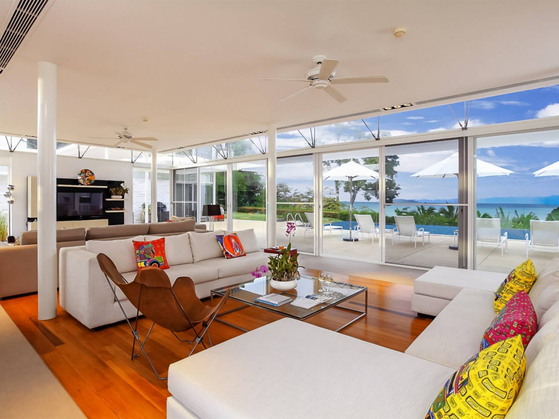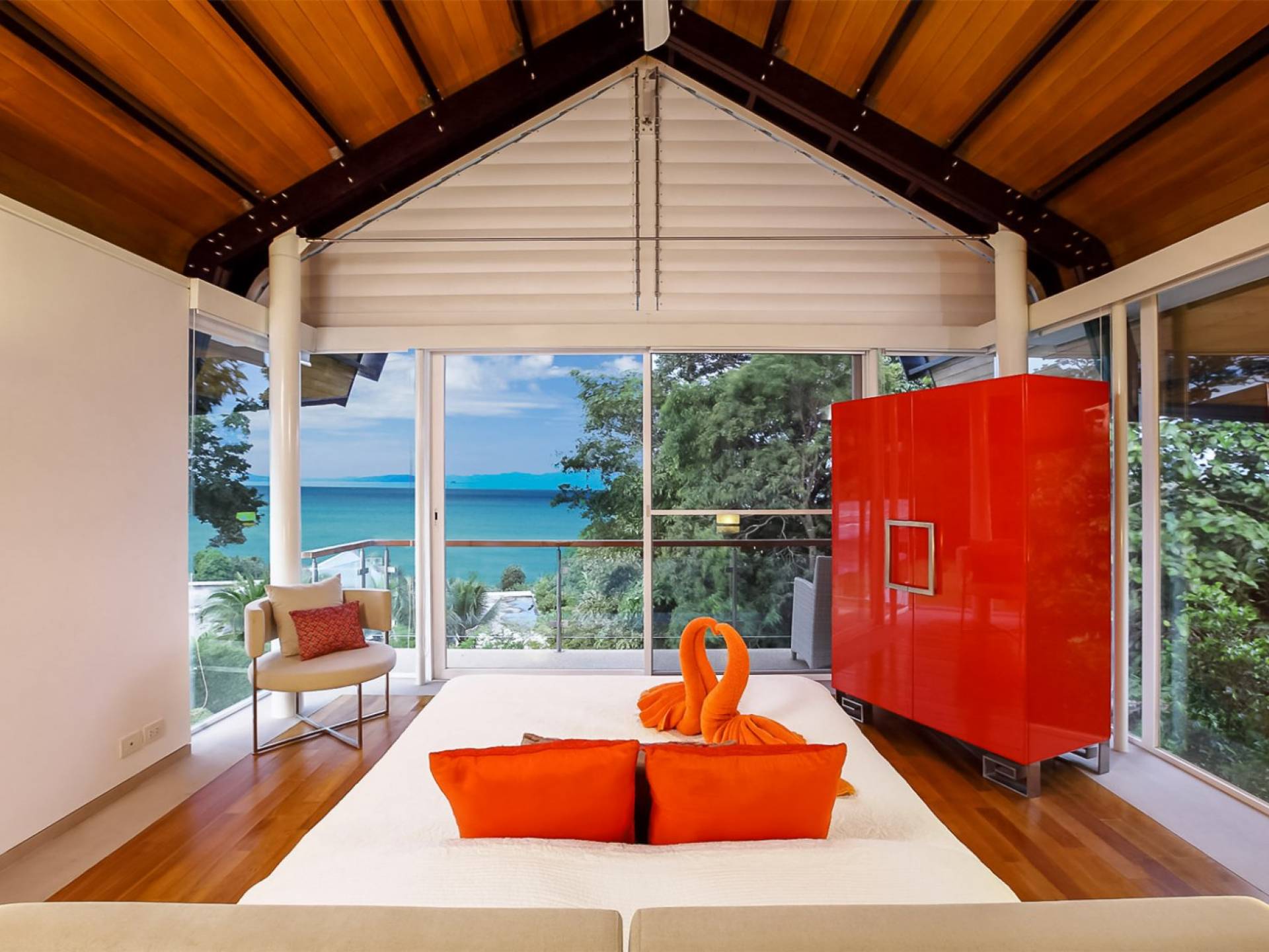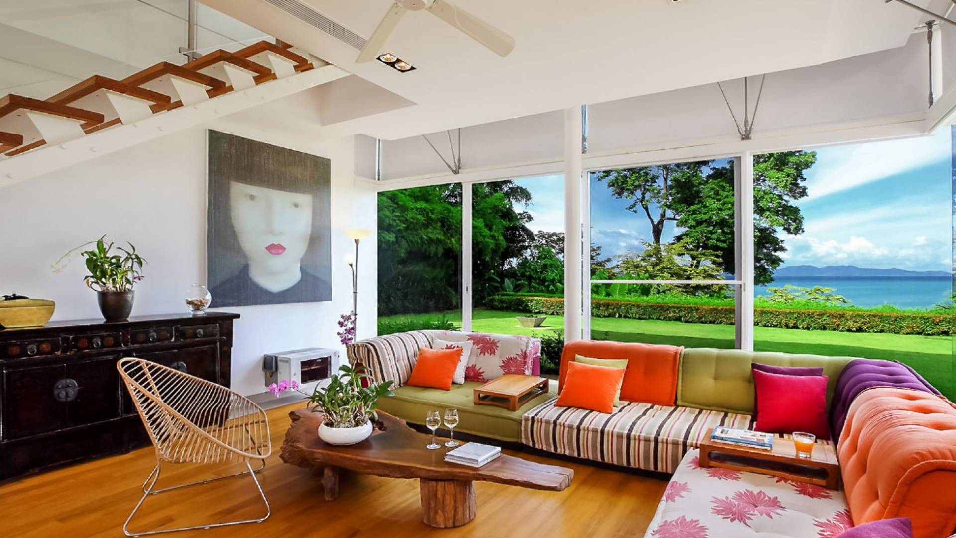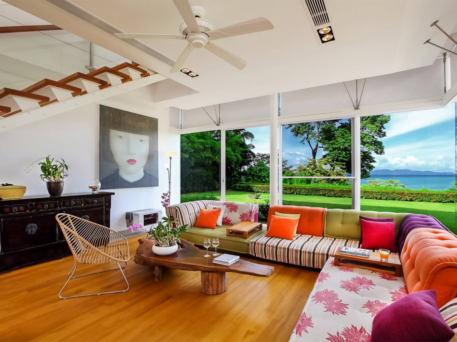 Eine Palette leuchtender Farben auf den Stoffen und den Kunstwerken an den Wänden verleiht der Atmosphäre ein behagliches, erhebendes Gefühl und harmoniert perfekt mit den Holzoberflächen. Die Glaswände bieten einen unbegrenzten atemberaubenden Blick auf die tropische Natur der Gegend, das faszinierende saphirblaue Meerwasser, den beeindruckenden Infinity-Pool und die idyllischen Sonnenuntergänge.
