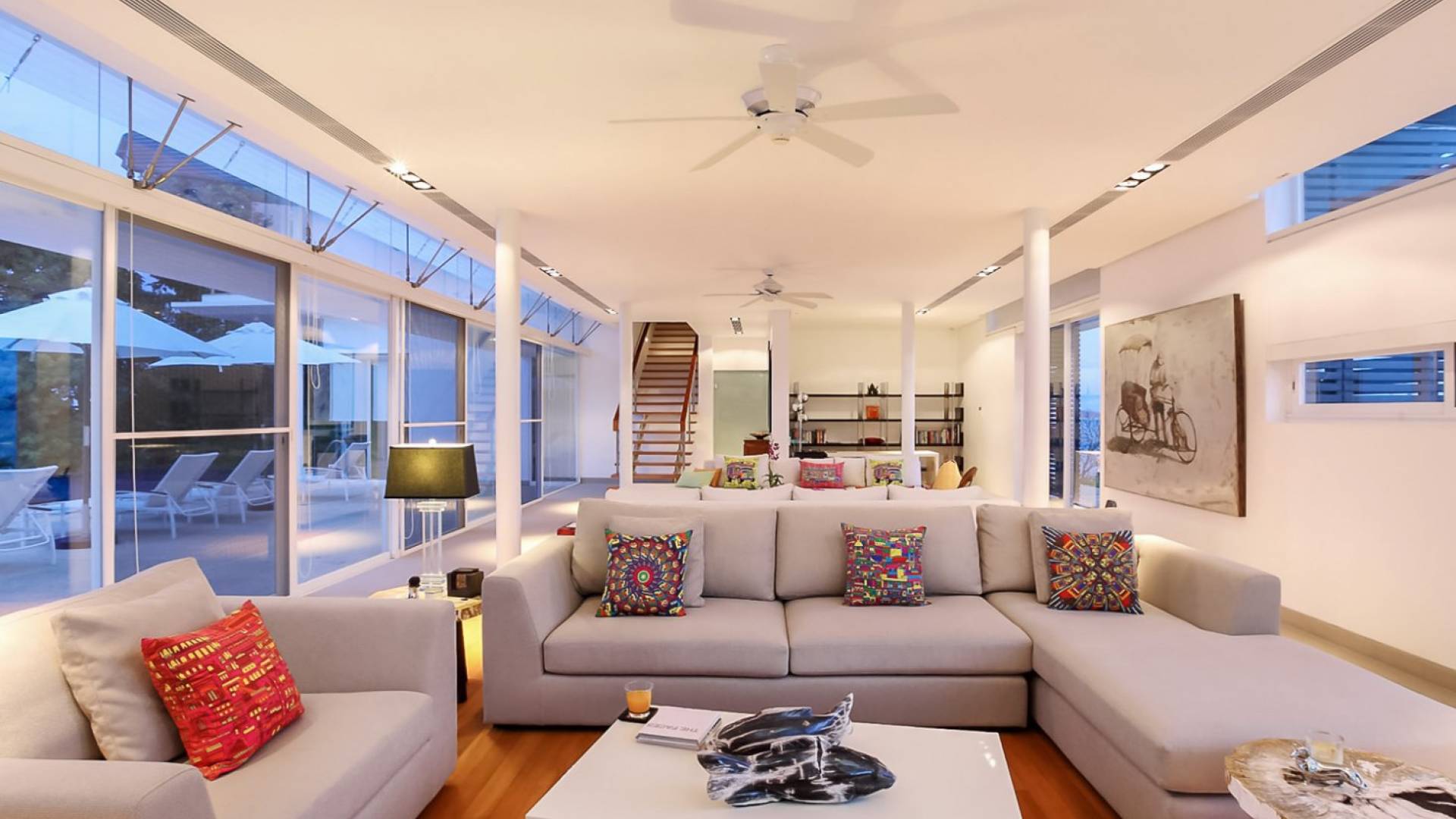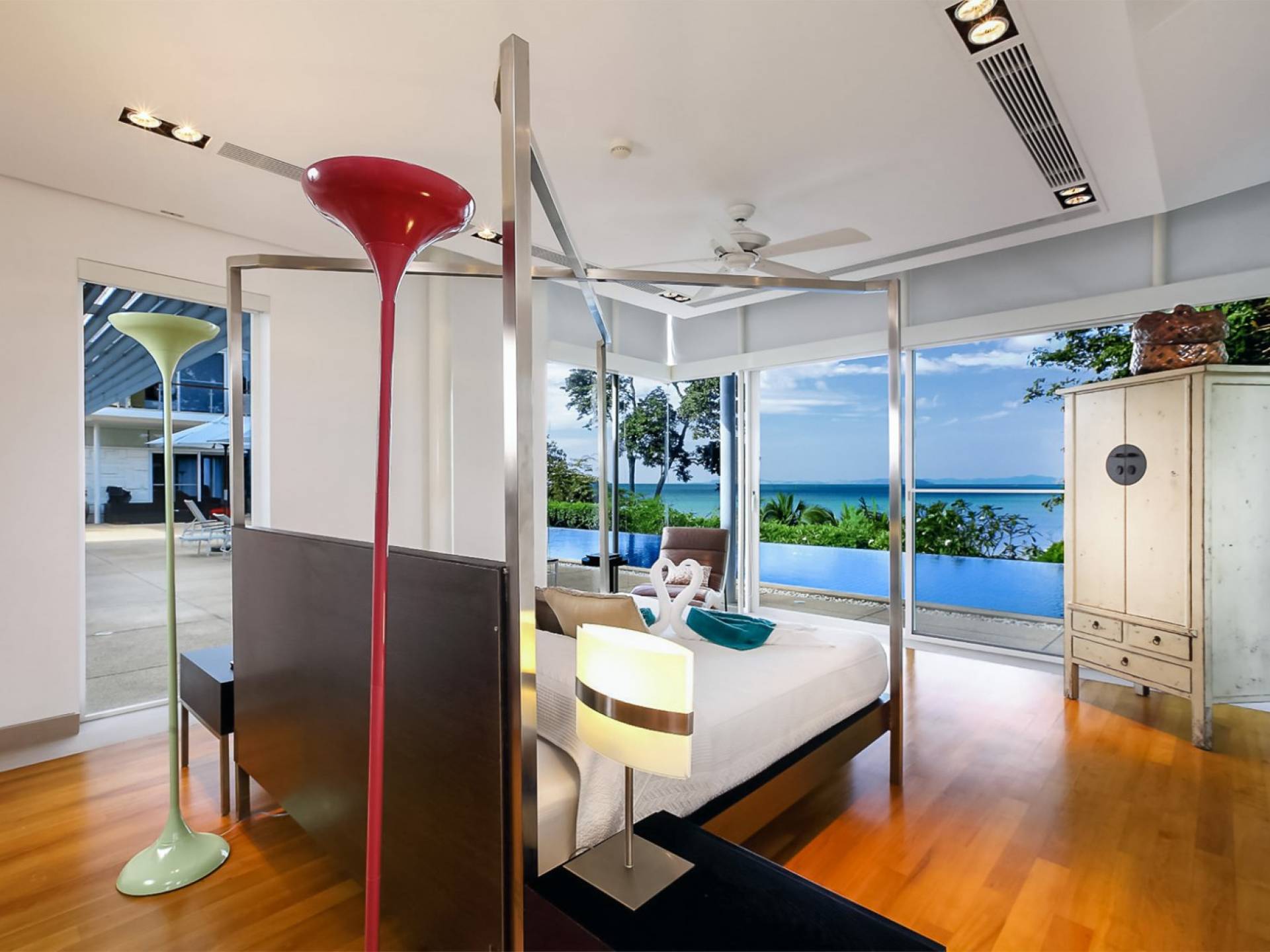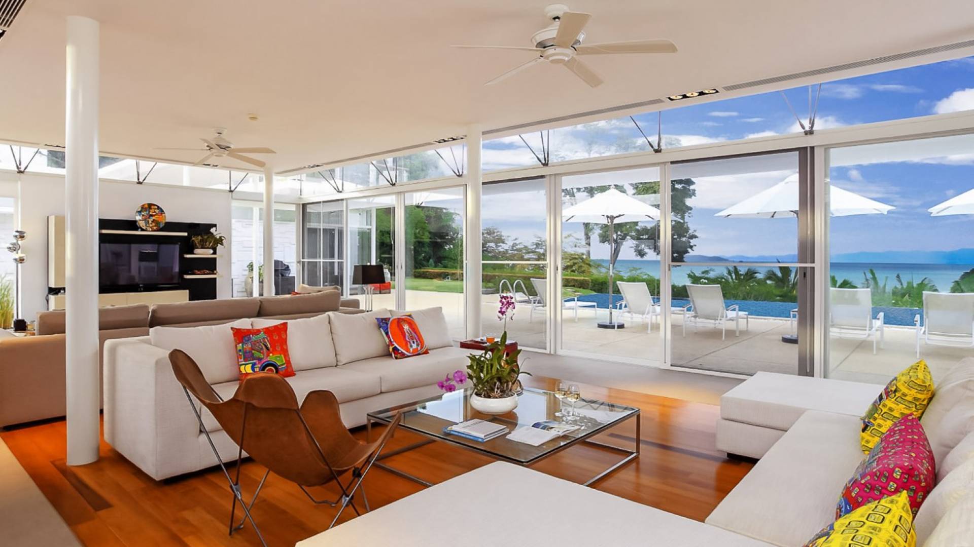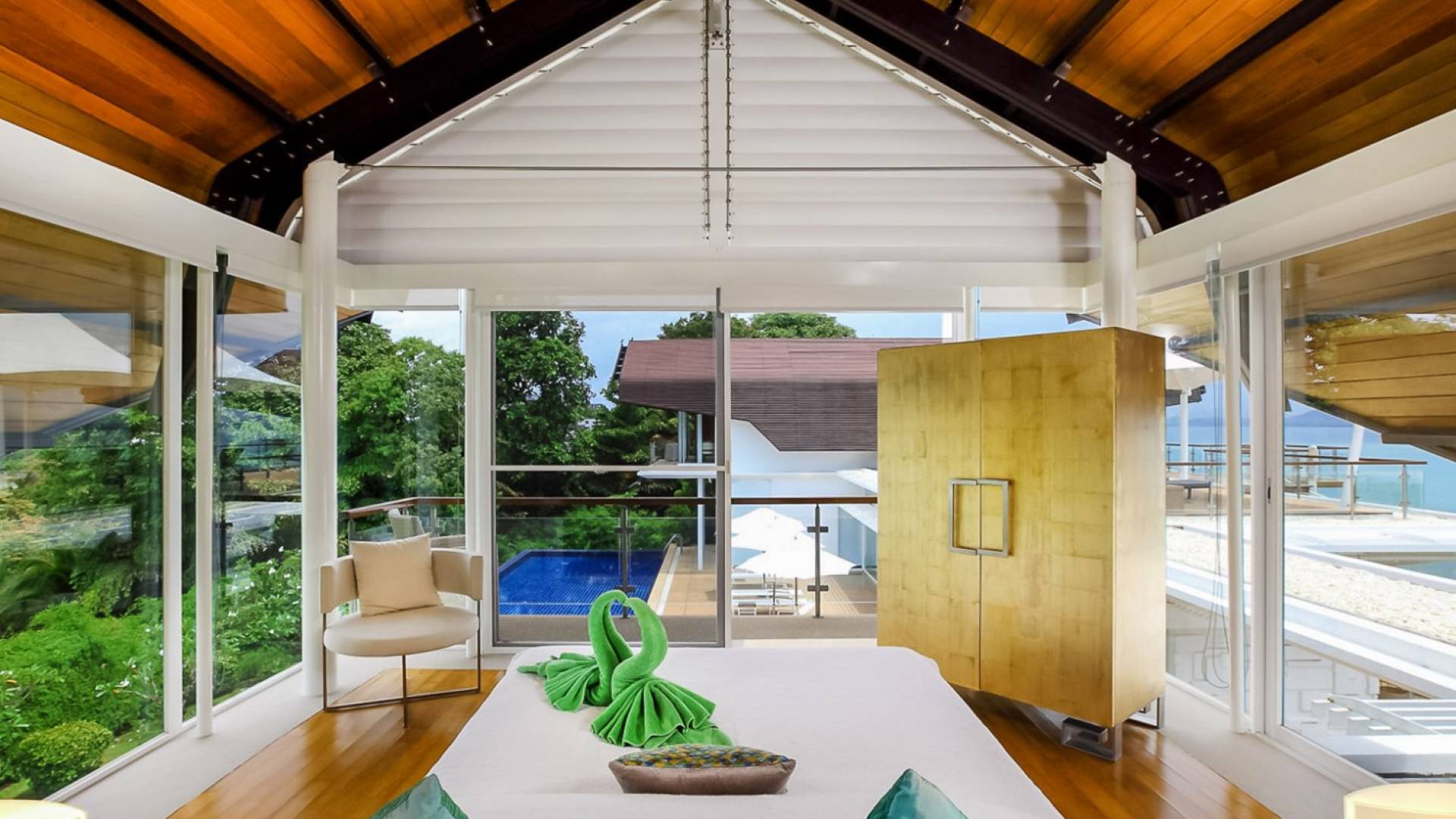Eine Palette leuchtender Farben auf den Stoffen und den Kunstwerken an den Wänden verleiht der Atmosphäre ein behagliches, erhebendes Gefühl und harmoniert perfekt mit den Holzoberflächen. Die Glaswände bieten einen unbegrenzten atemberaubenden Blick auf die tropische Natur der Gegend, das faszinierende saphirblaue Meerwasser, den beeindruckenden Infinity-Pool und die idyllischen Sonnenuntergänge.