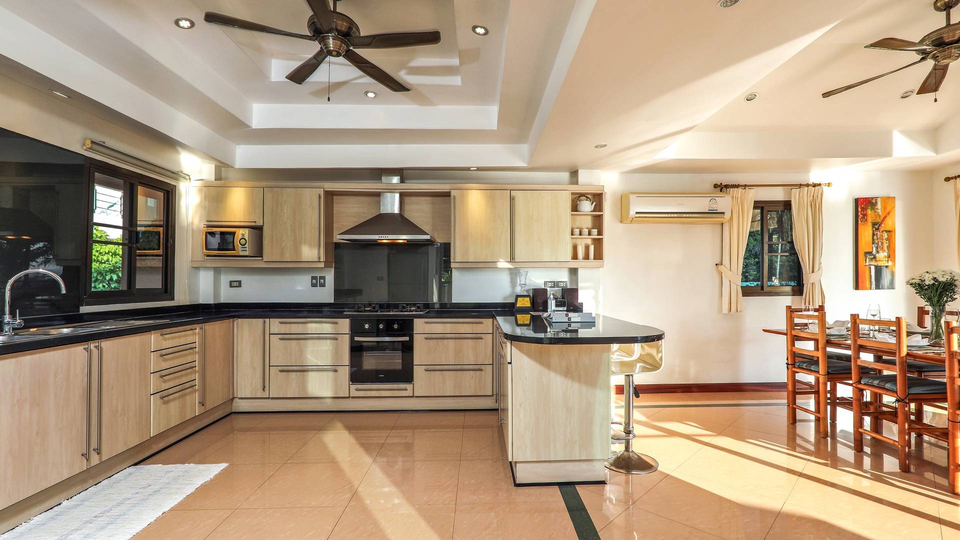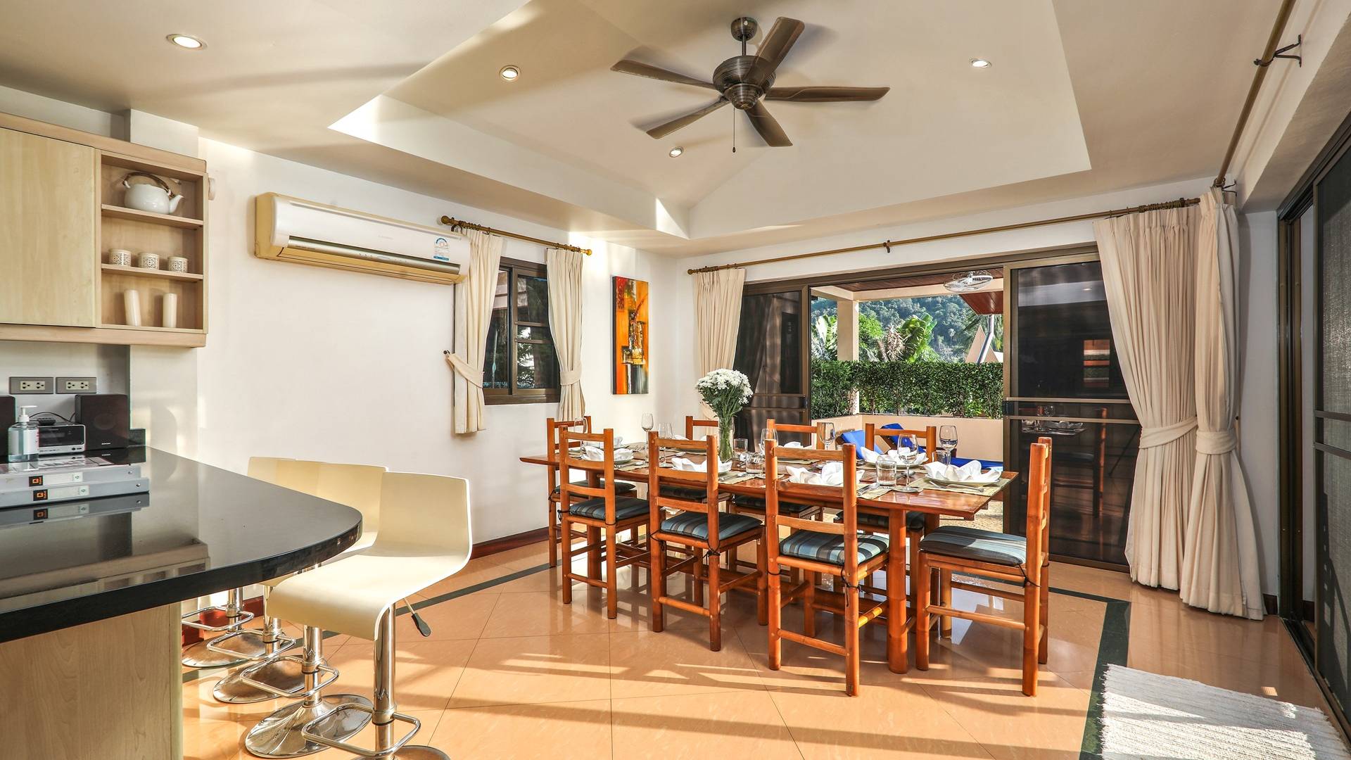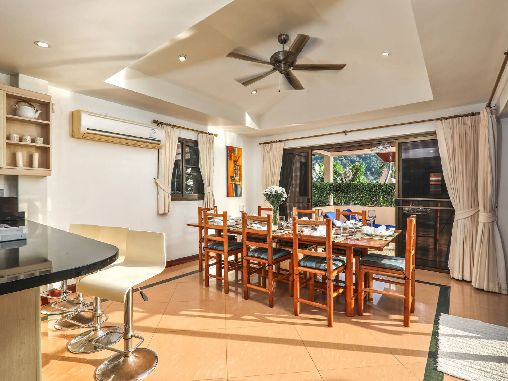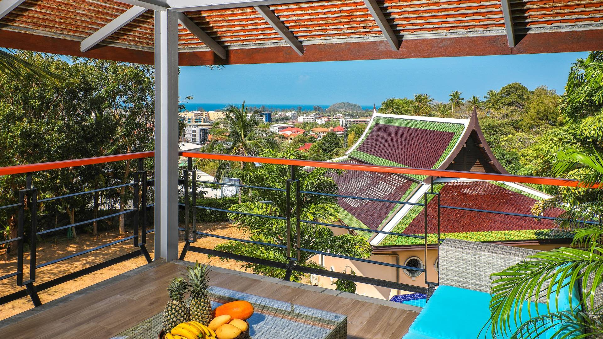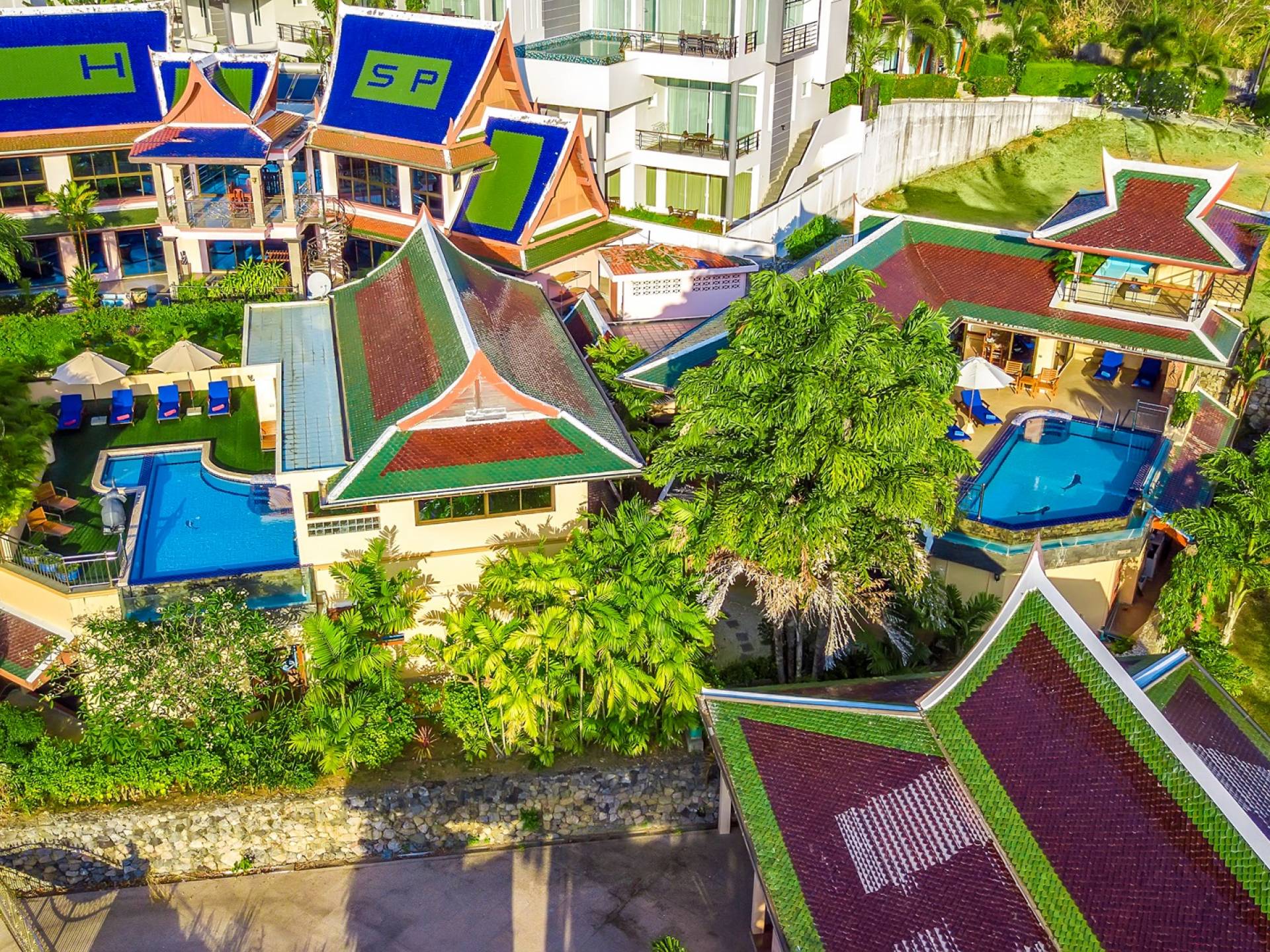 Das Hauptschlafzimmer besteht aus einem riesigen Himmelbett und einer Whirlpool-Badewanne für zwei Personen. Die Villa befindet sich hinter hohen Mauern aus geschnittenem Naturkalkstein sowie privaten, ferngesteuerten Toren in voller Größe. Die obere Etage ist strategisch mit einem privaten Swimmingpool und privaten Bereichen zum Sonnenbaden ausgestattet, um die kühle Meeresbrise, die atemberaubende Aussicht auf Kata Beach und die herrlichen Sonnenuntergänge zu maximieren. Die erhöhte Lage zieht sowohl einen spektakulären Meerblick als auch eine kühle Meeresbrise an. Im Obergeschoss befinden sich Wohn-, Ess- und Zimmer sowie eine riesige voll ausgestattete Küche. Die obere Etage verfügt über Schiebetüren in voller Größe, die sich zum Pool und zu den Sonnenbereichen öffnen.