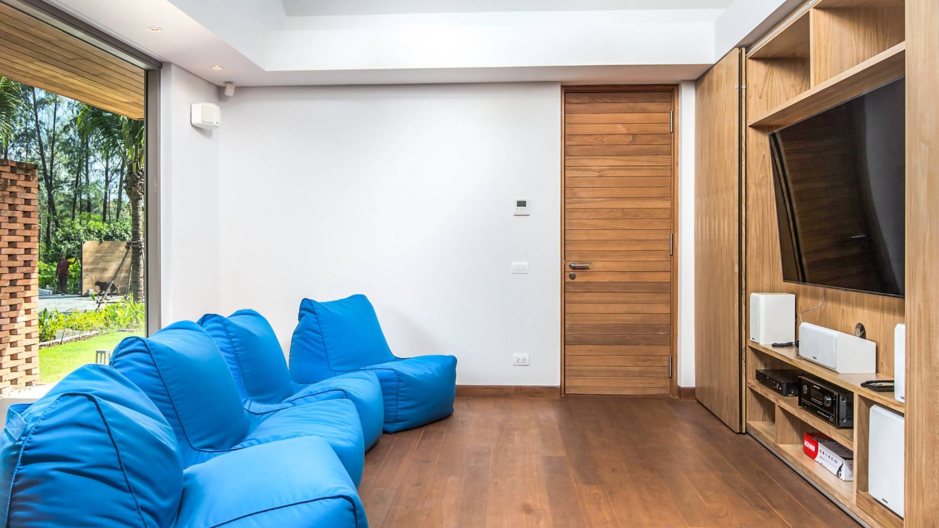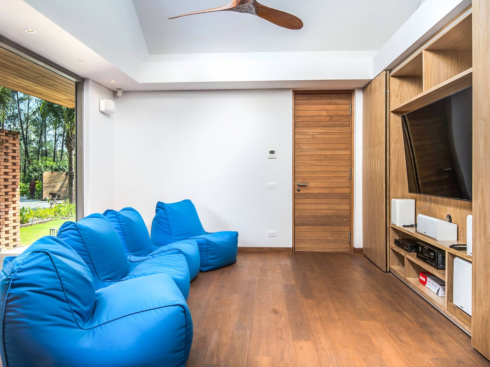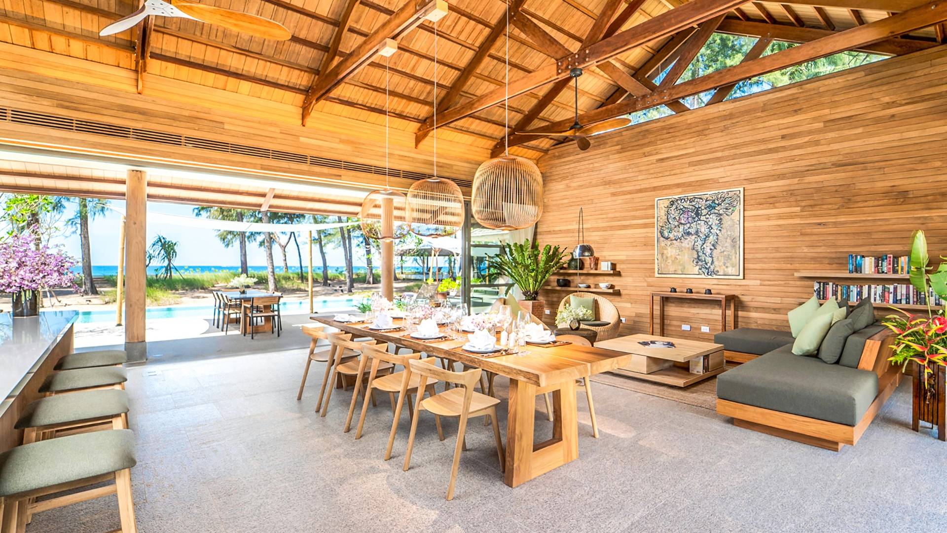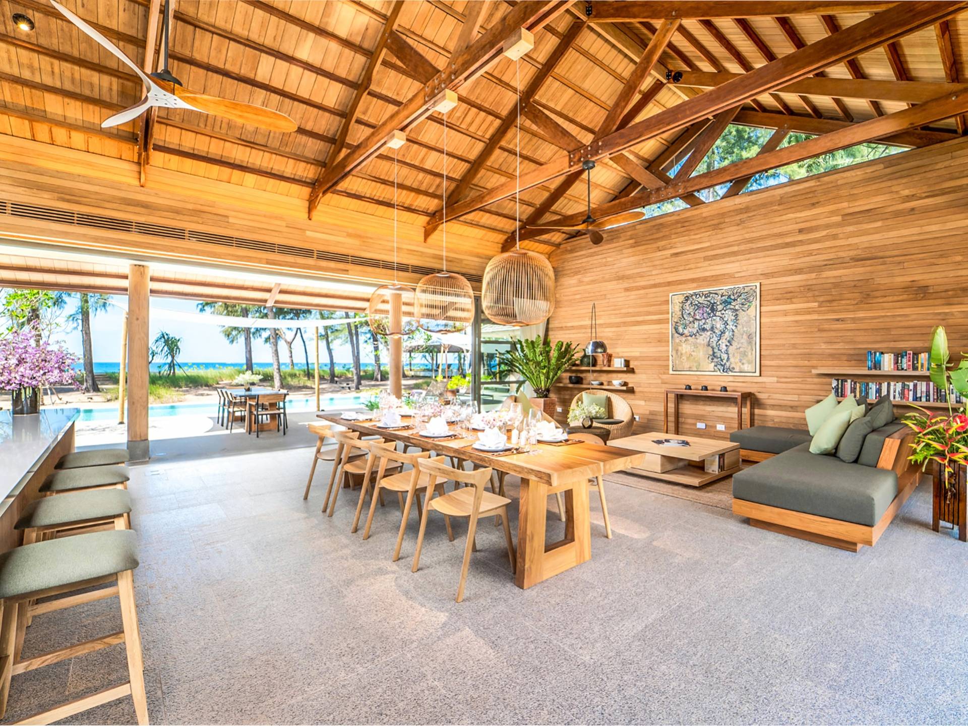 Der Hauptwohnbereich verdient es, in Designmagazinen erwähnt zu werden, mit hohen Holzdecken, einer langen Frühstückstheke an einer Seite und einem Esstisch im Mittelpunkt. Die Vorderwand besteht vollständig aus Glasschiebetüren, die zum Pooldeck führen und an luftigen Nachmittagen zurückgezogen oder für klimatisierten Komfort geschlossen werden können. Der Wohnraum auf der rechten Seite verfügt über elegante Sitzgelegenheiten und Design-Akzente wie eine kunstvoll geschwungene Stehlampe.
