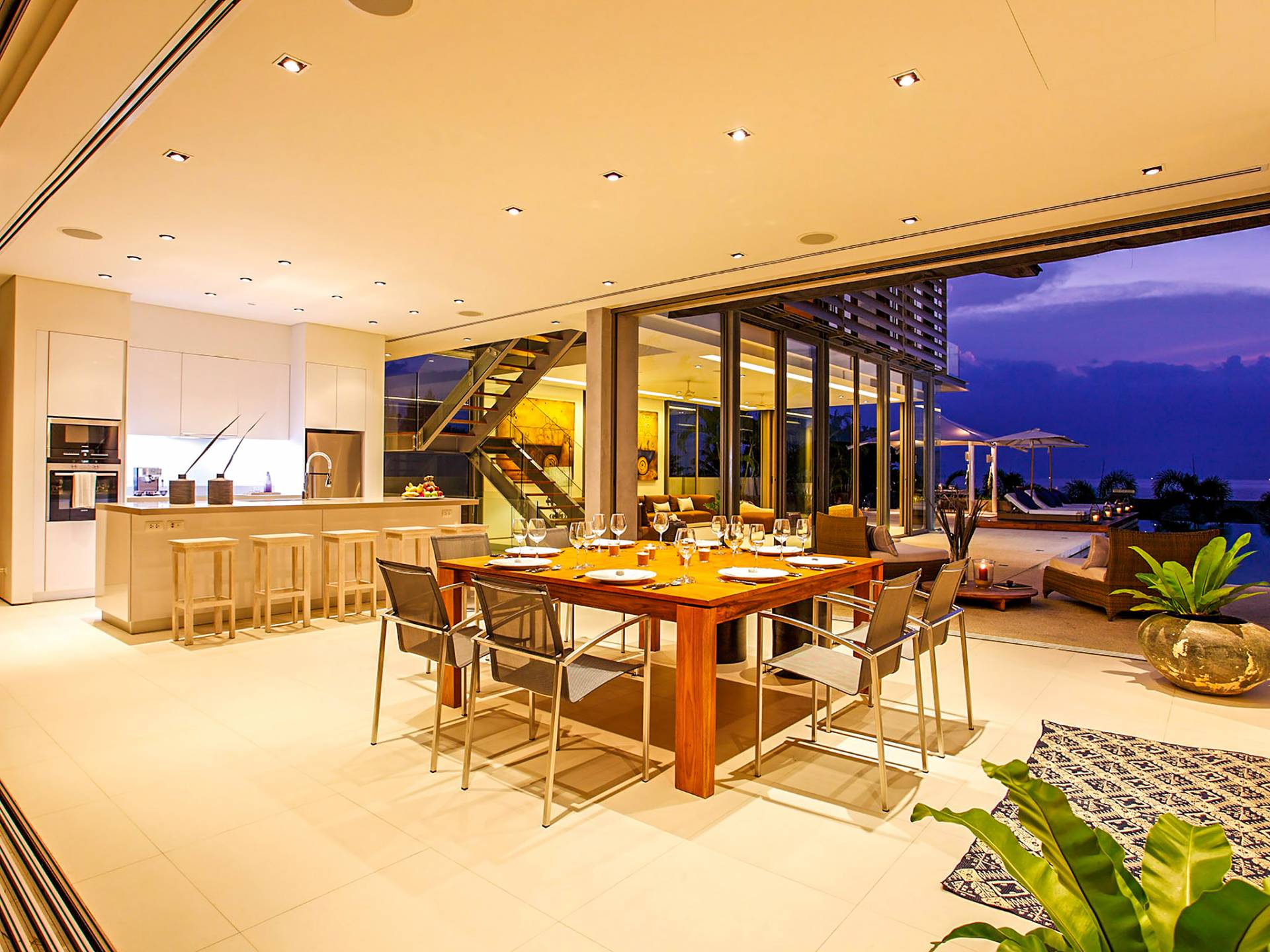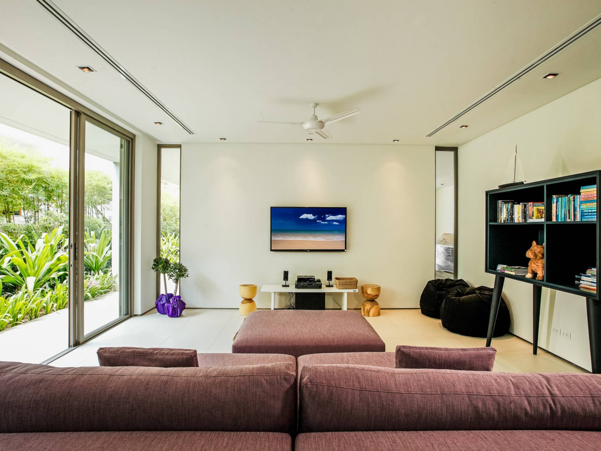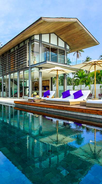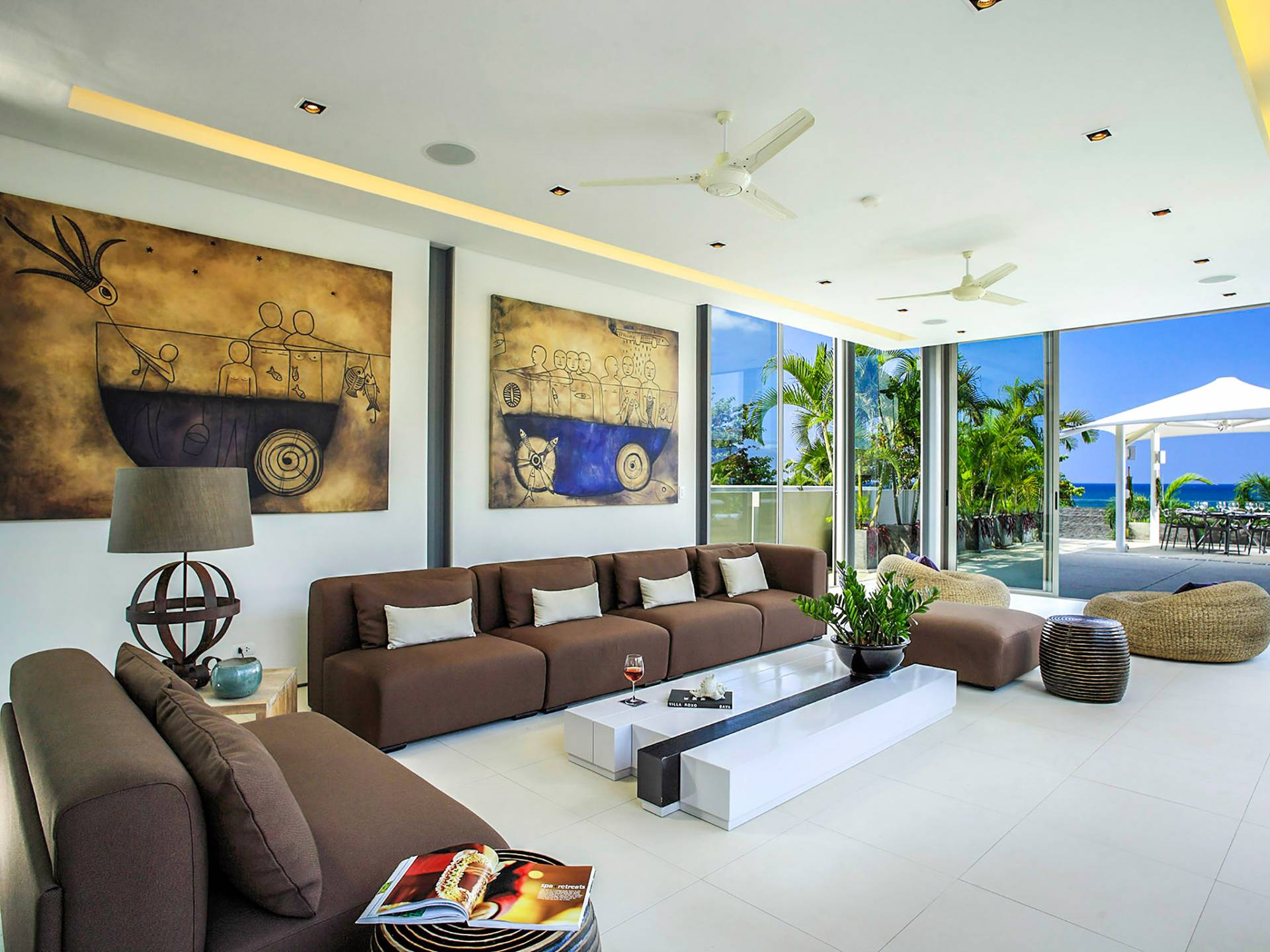 Meeresliebhaber werden in diese stilvolle exotische Luxusmiete verfallen, die auf drei Ebenen perfekt gestaltet ist. Die oberen beiden Etagen der Villa Roxo bieten einen verführerischen Blick auf das Meer und den Sonnenuntergang. Ein herrlicher Strand umgibt den gepflegten Garten der Villa mit puderweichem Sand und smaragdgrünem Wasser. Im Erdgeschoss befindet sich ein gemütlich eingerichteter TV-Raum mit einer Auswahl an Spielen und Spielzeug, darunter ein Kickertisch. Eine Treppe führt in den ersten Stock, wo eine offene, voll ausgestattete moderne Küche, ein geräumiges Wohnzimmer und ein Esszimmer eine L-Form um die Terrasse und den funkelnden 18 Meter langen privaten Infinity-Pool bilden.