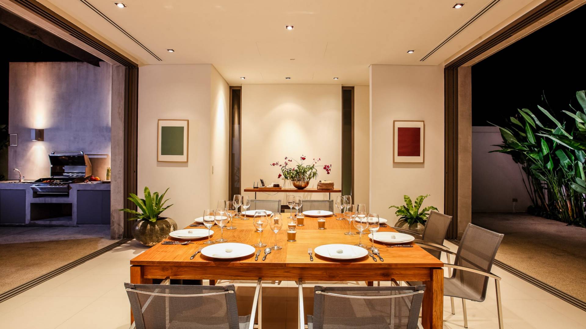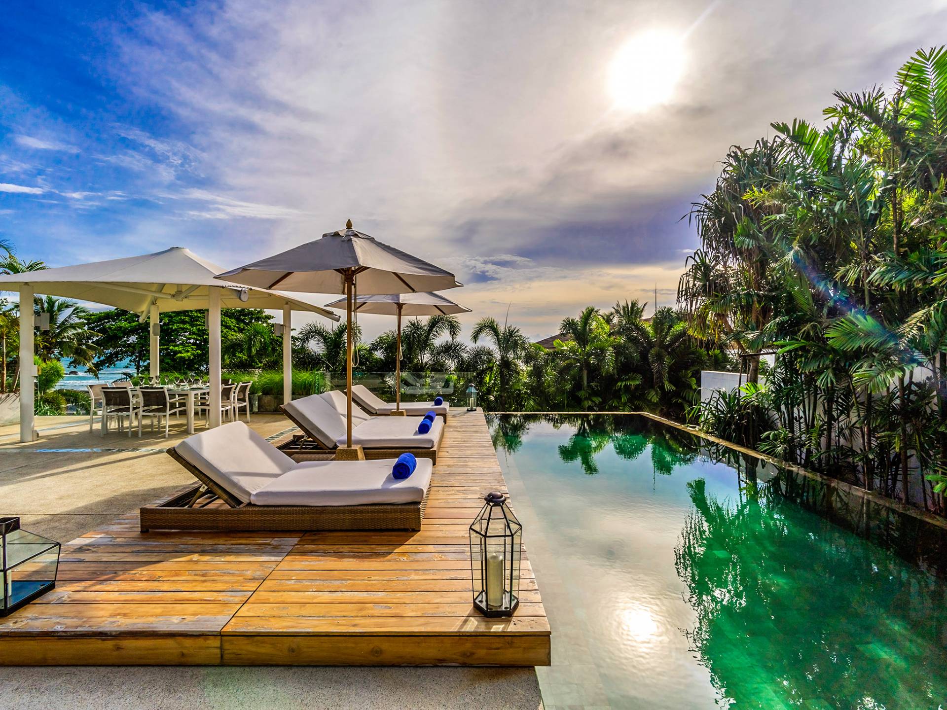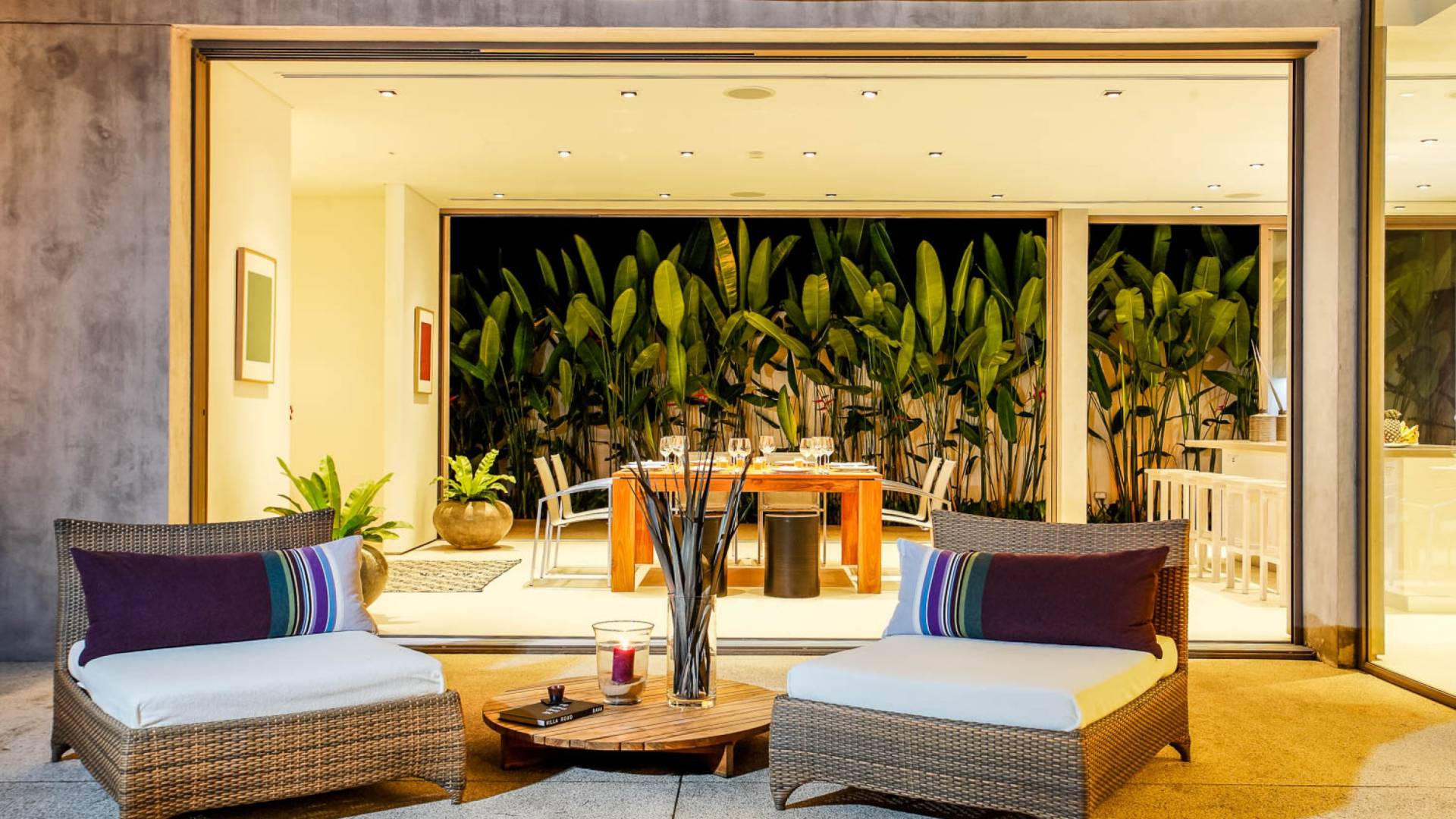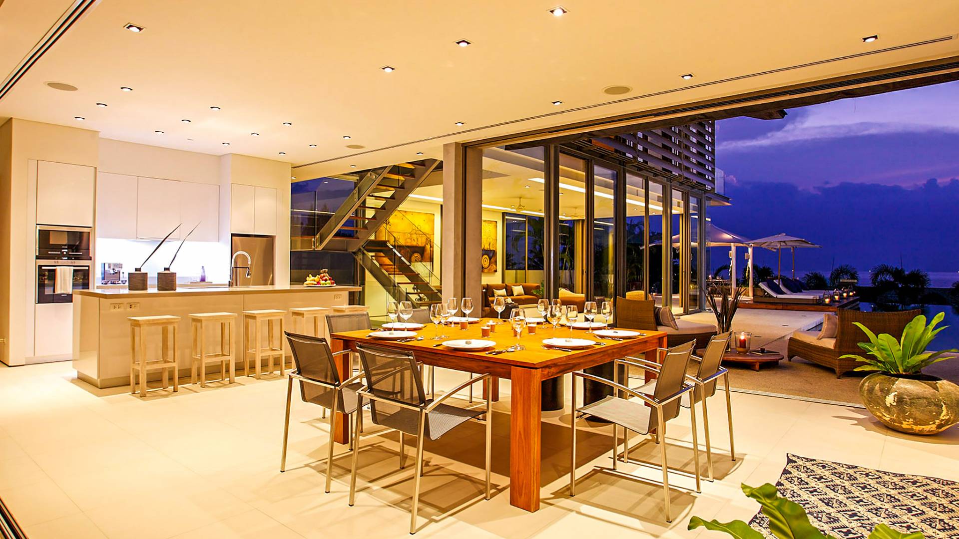 Meeresliebhaber werden in diese stilvolle exotische Luxusmiete verfallen, die auf drei Ebenen perfekt gestaltet ist. Die oberen beiden Etagen der Villa Roxo bieten einen verführerischen Blick auf das Meer und den Sonnenuntergang. Ein herrlicher Strand umgibt den gepflegten Garten der Villa mit puderweichem Sand und smaragdgrünem Wasser. Im Erdgeschoss befindet sich ein gemütlich eingerichteter TV-Raum mit einer Auswahl an Spielen und Spielzeug, darunter ein Kickertisch. Eine Treppe führt in den ersten Stock, wo eine offene, voll ausgestattete moderne Küche, ein geräumiges Wohnzimmer und ein Esszimmer eine L-Form um die Terrasse und den funkelnden 18 Meter langen privaten Infinity-Pool bilden.