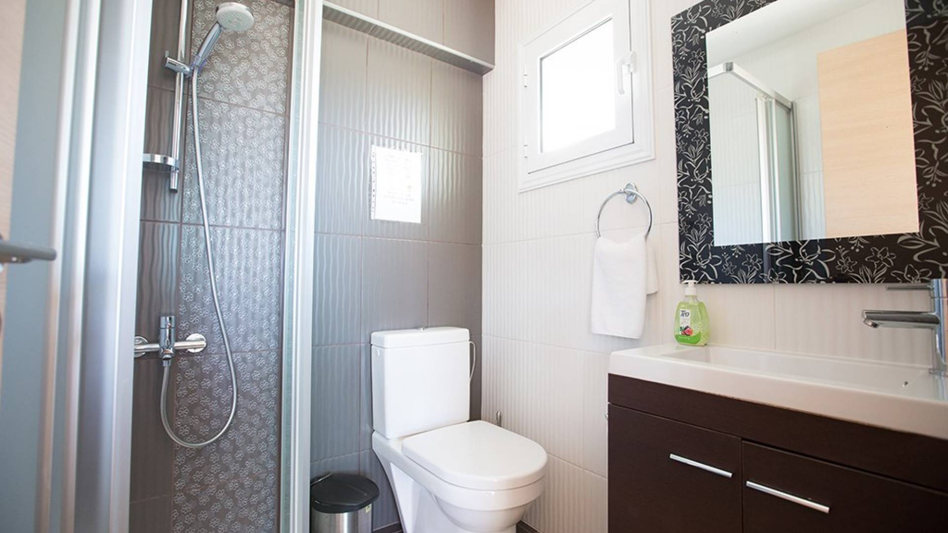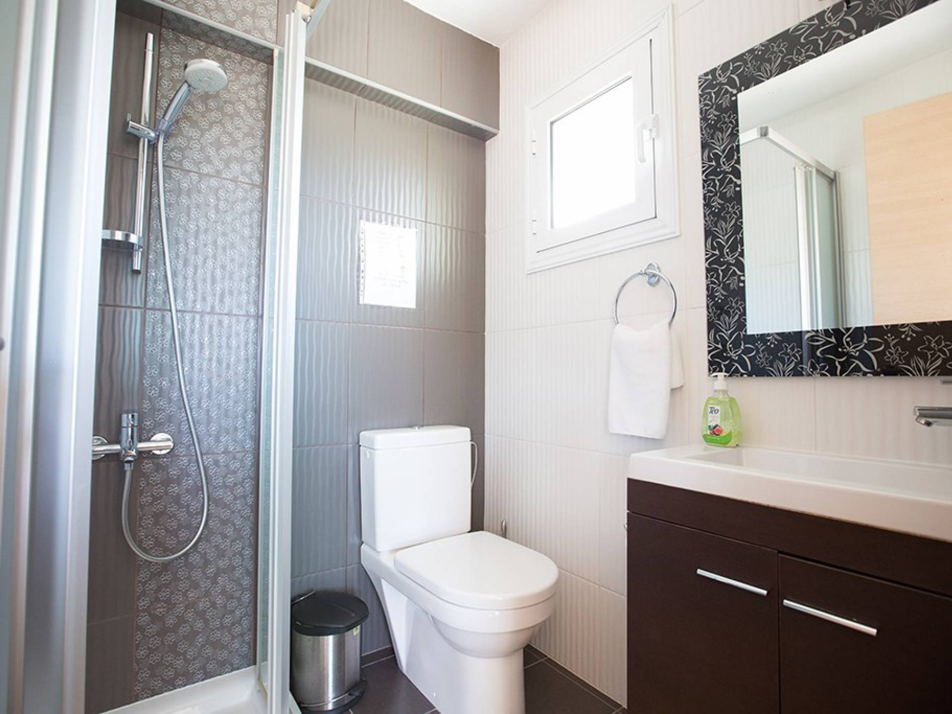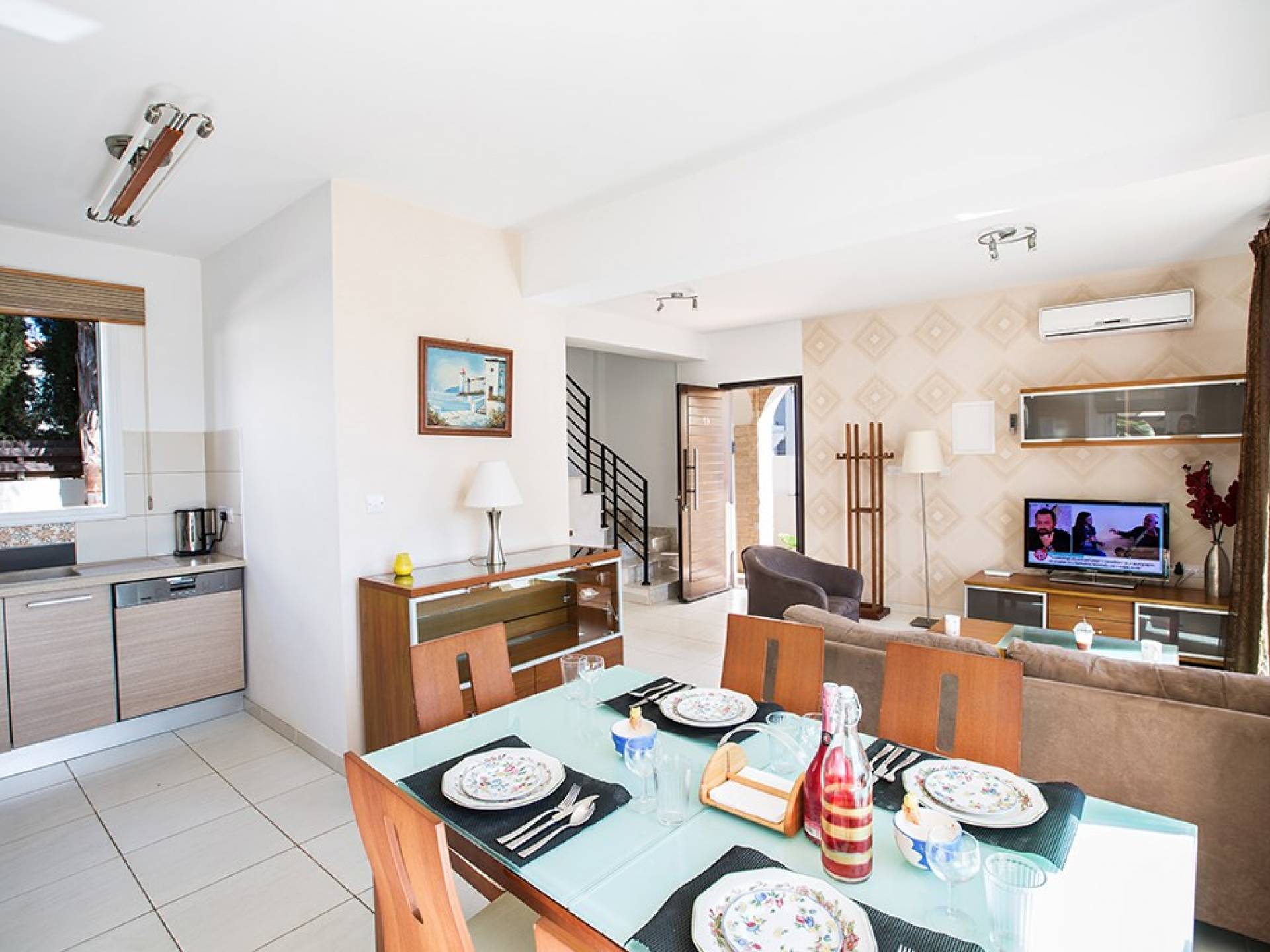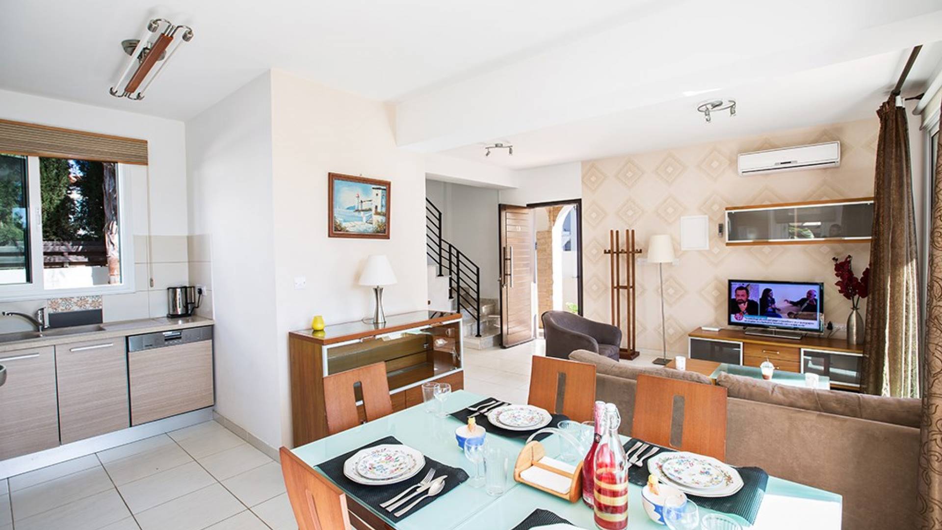 Wenn Sie die Villa betreten, finden Sie das moderne und gepflegte offene Wohnzimmer, den Essbereich und die Küche. Das Wohnzimmer verfügt über einen komfortablen Sitzbereich mit Breitbild- und Satellitenfernsehen (IPTV mit kostenlosem Video on Demand). Der Essbereich verfügt über einen Tisch und Stühle für 6 Personen und die Küche ist mit allen Geräten ausgestattet, die Sie für Ihren Selbstversorgerurlaub benötigen. Auf dieser Etage befindet sich auch ein WC.