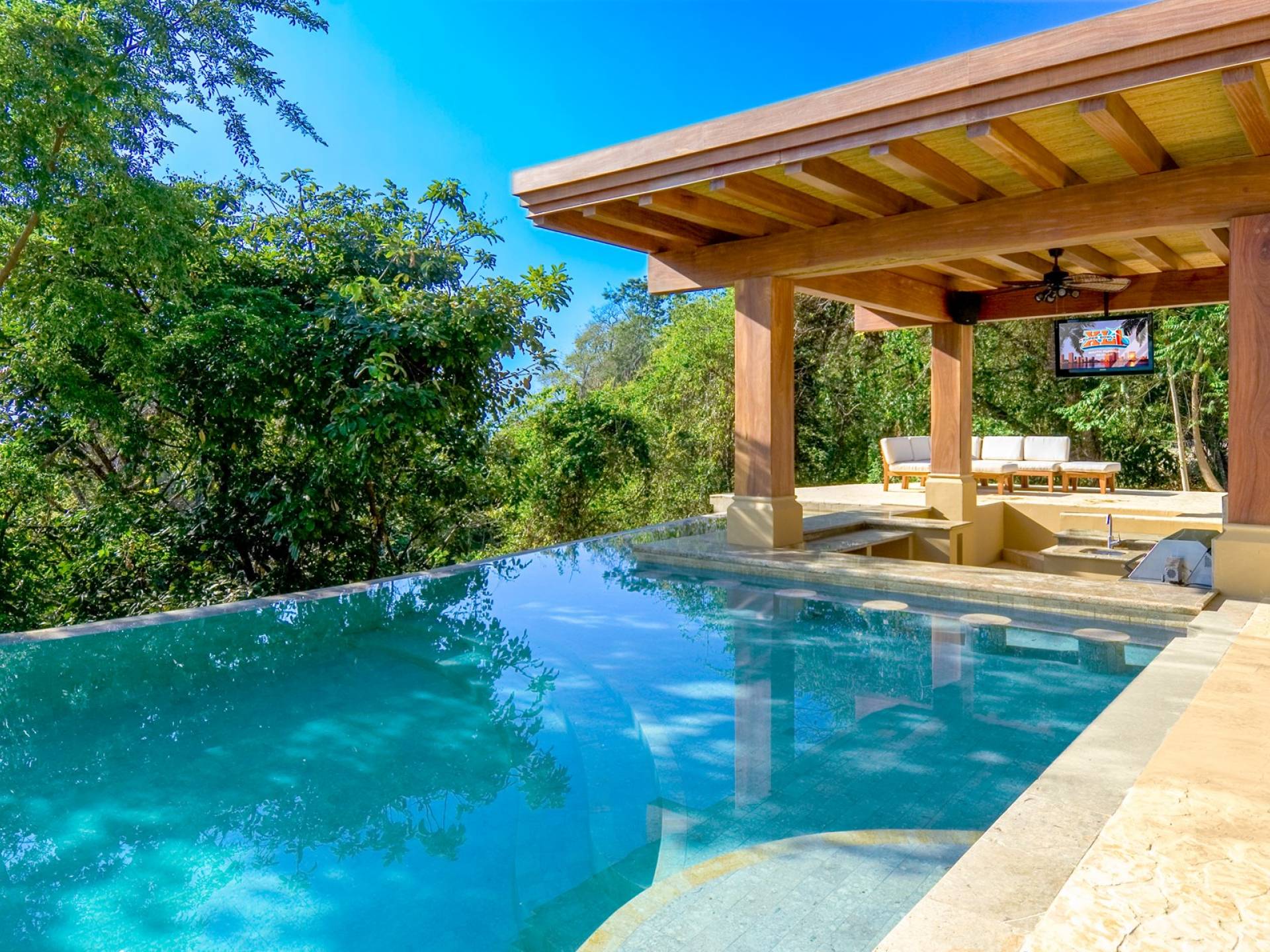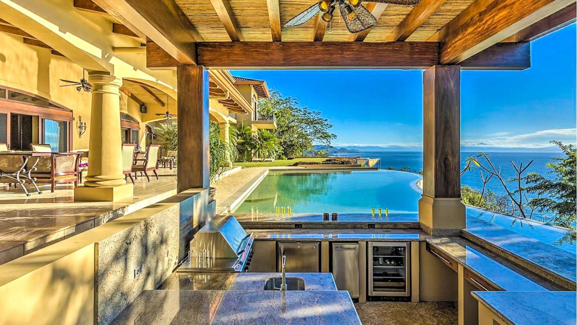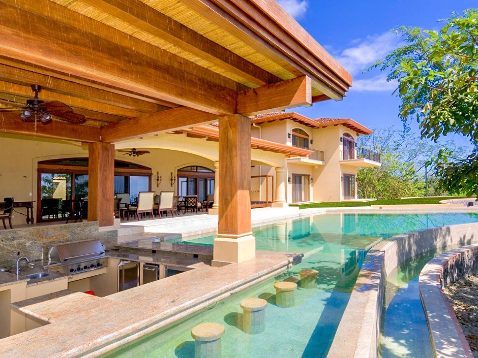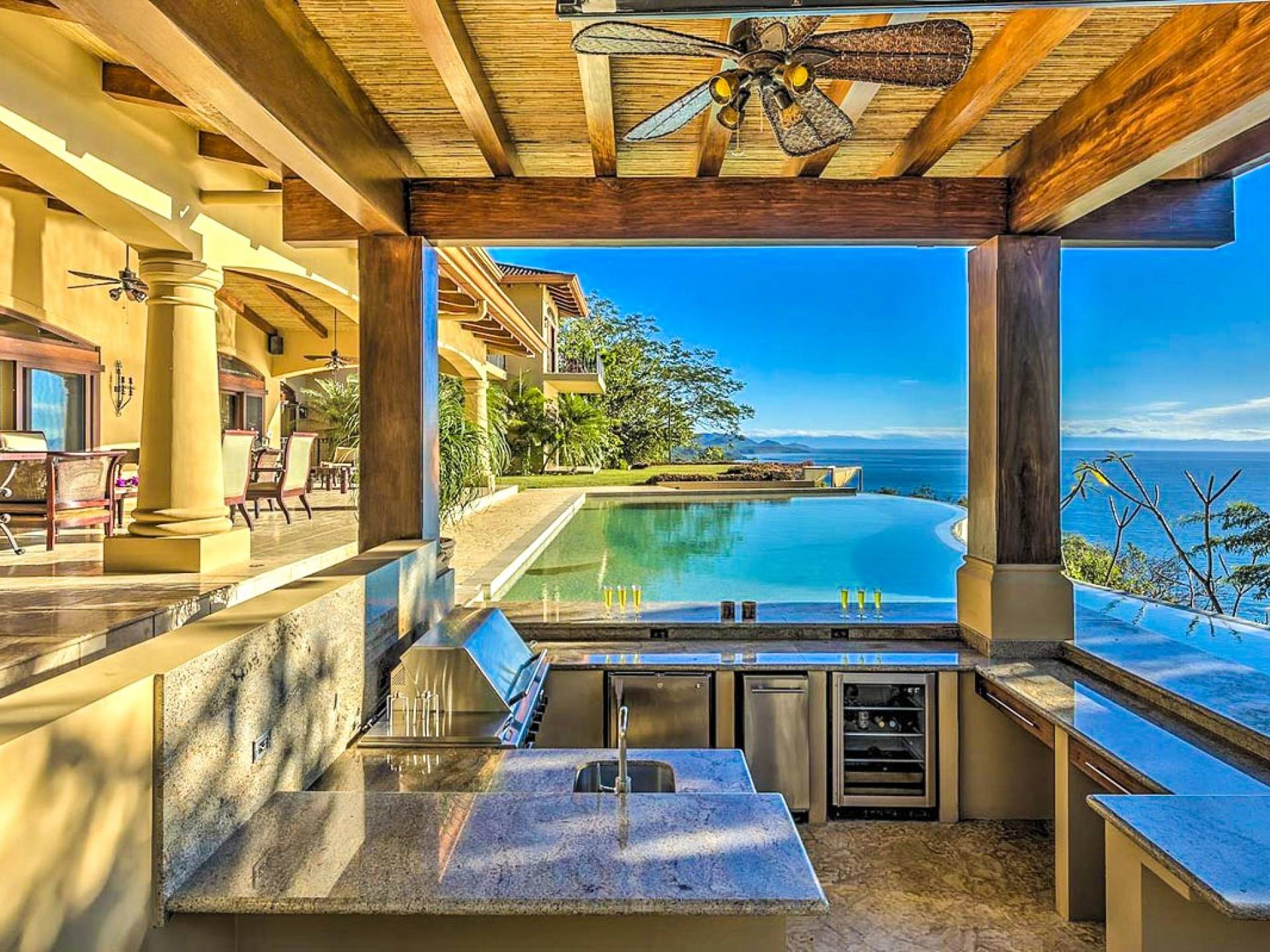 Σε αυτόν τον υπαίθριο χώρο αναψυχής, η πισίνα υπερχείλισης με το swim-up bar την οδηγεί στο επόμενο επίπεδο. Με μπάρμπεκιου και τηλεόραση που βρίσκεται μέσα στο wet bar/εξωτερική κουζίνα, μπορείτε να απολαύσετε μπίρα και μπιφτέκια ενώ βυθίζεστε στην πισίνα. Θα βρείτε επίσης έναν ξυλόφουρνο που είναι τέλειος για την ώρα της πίτσας. Απολαύστε μια προπόνηση, γιόγκα ή μασάζ στο γυμναστήριο που βρίσκεται στρατηγικά τοποθετημένο στην κορυφή ενός δραματικού βράχου 100 μέτρων για ανεμπόδιστη θέα στον Ειρηνικό Ωκεανό 180 μοιρών.