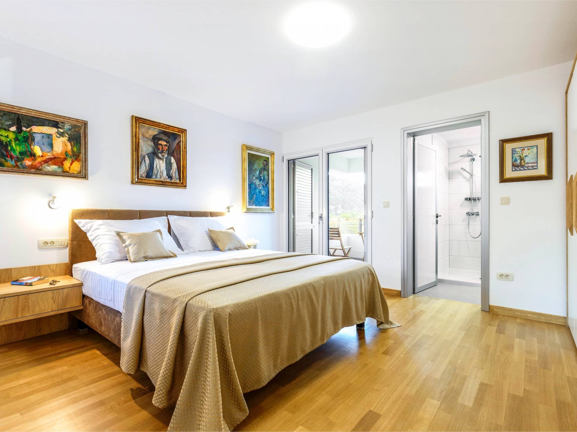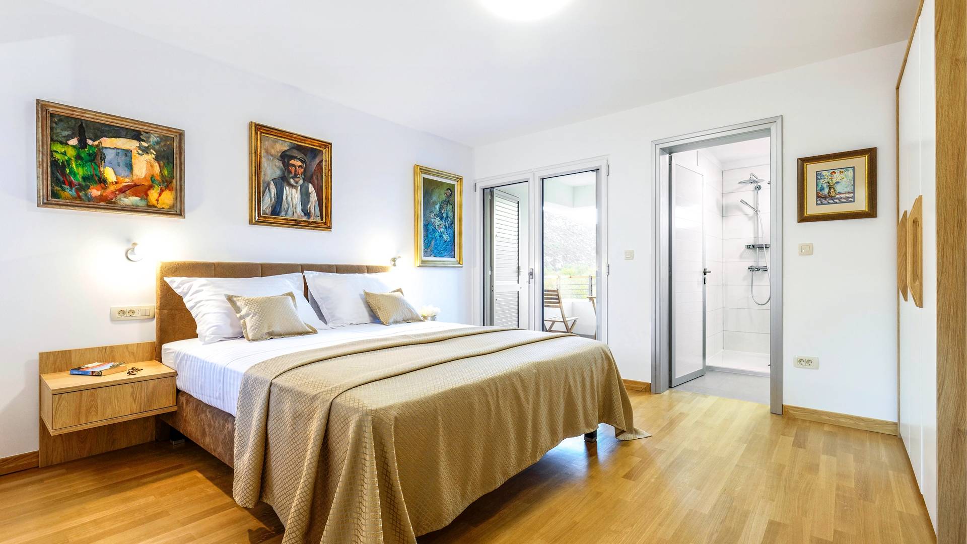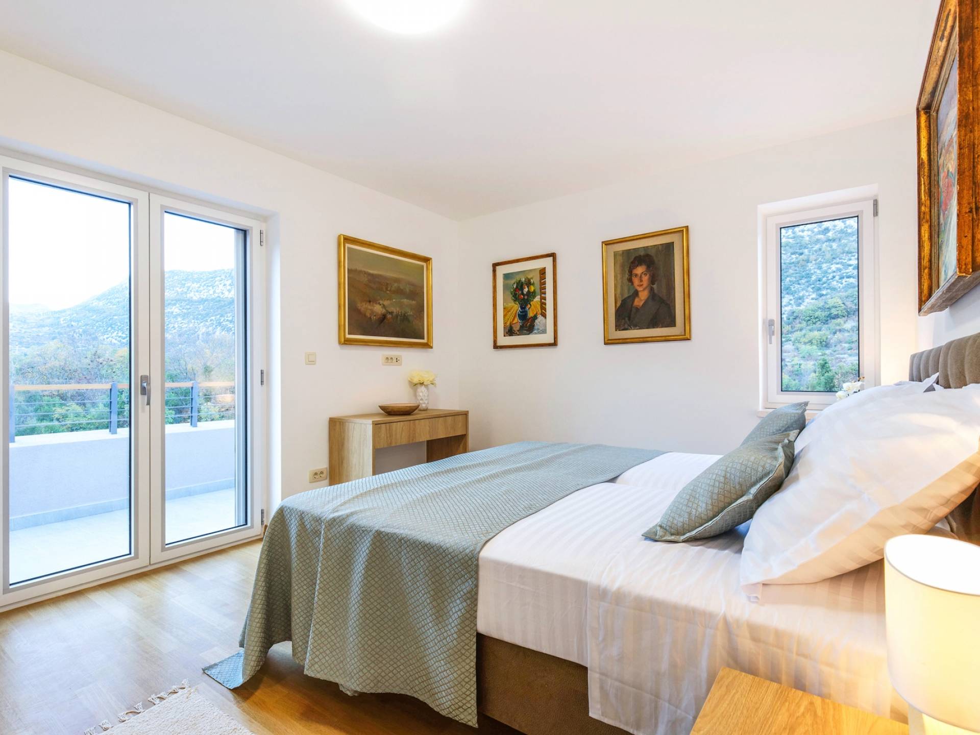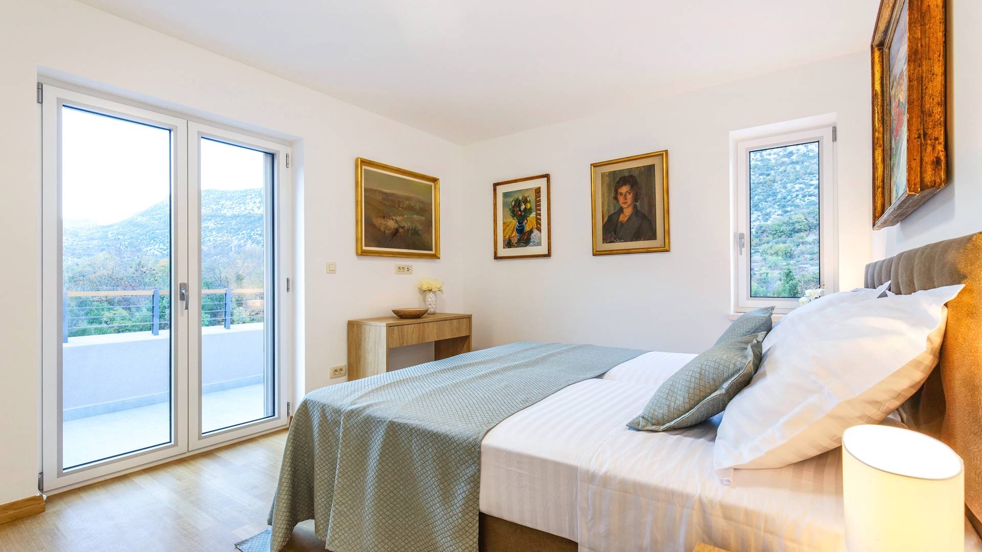 Οι εσωτερικές σκάλες σας οδηγούν στον πρώτο όροφο της βίλας με 3 όμορφα σχεδιασμένα υπνοδωμάτια με μπάνια και μπαλκόνια. Από τα παράθυρα κάθε δωματίου, υπάρχει θέα στην εκπληκτική φύση του βουνού Biokovo.