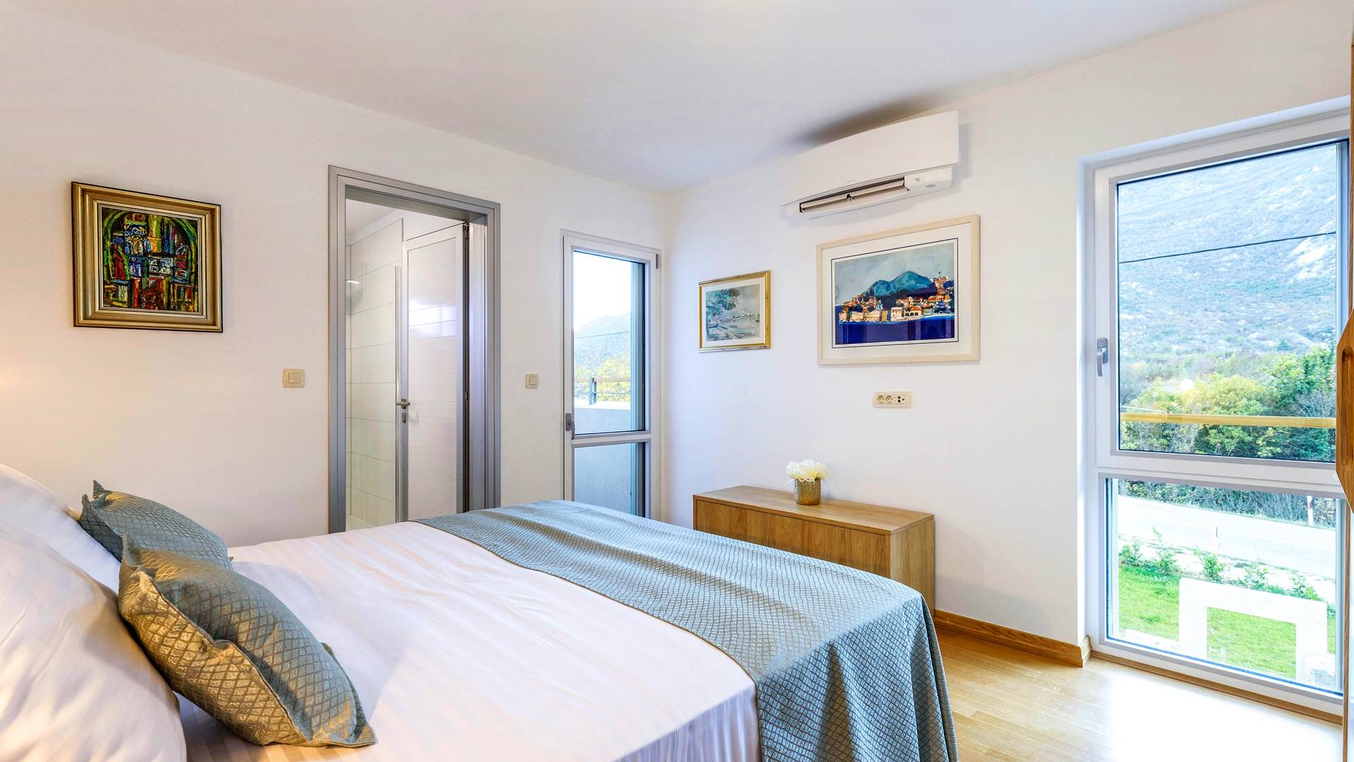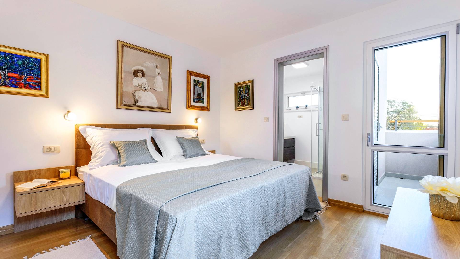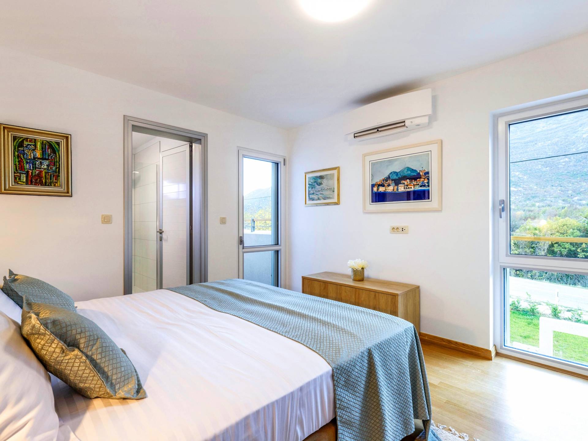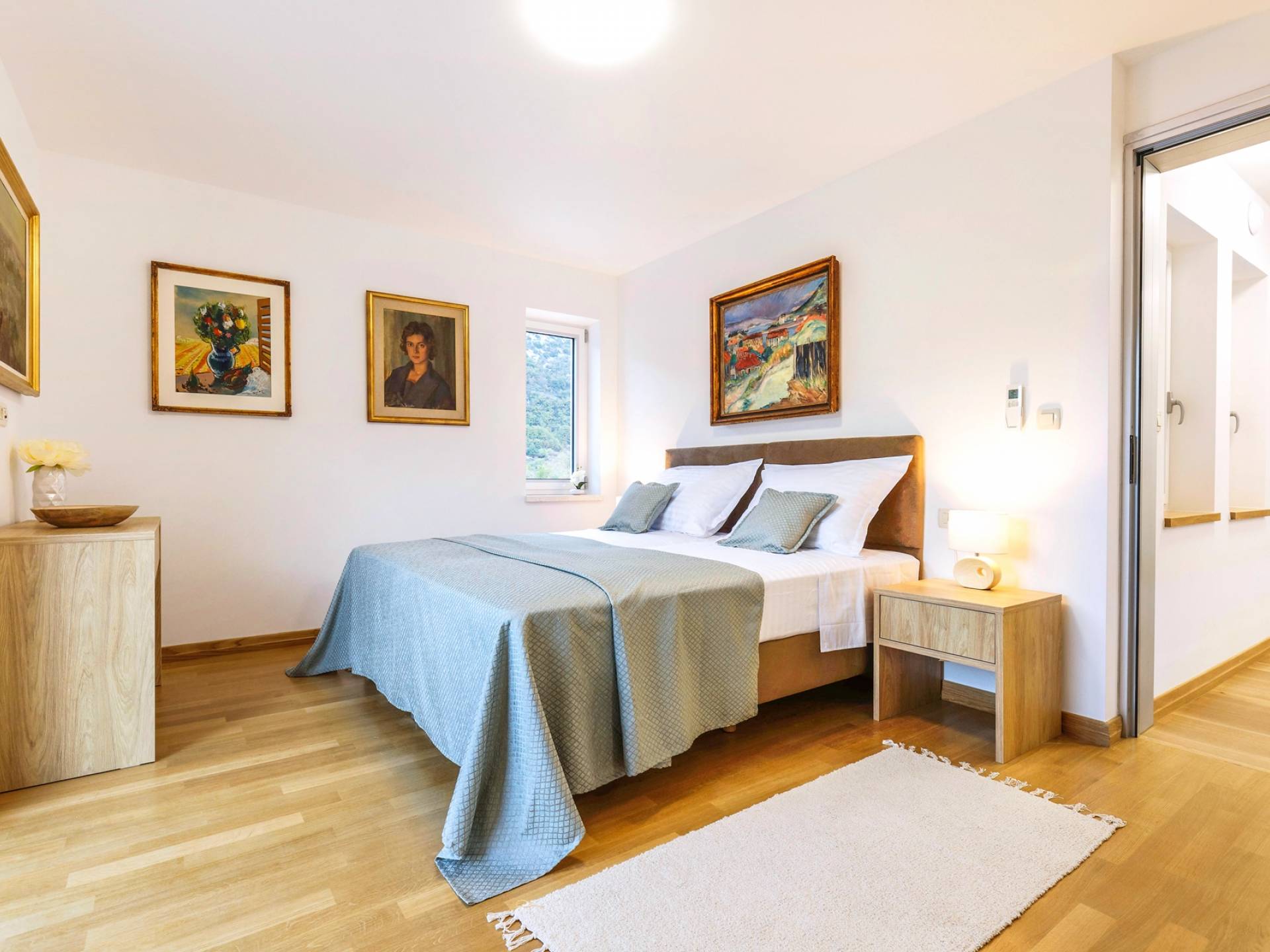 Οι εσωτερικές σκάλες σας οδηγούν στον πρώτο όροφο της βίλας με 3 όμορφα σχεδιασμένα υπνοδωμάτια με μπάνια και μπαλκόνια. Από τα παράθυρα κάθε δωματίου, υπάρχει θέα στην εκπληκτική φύση του βουνού Biokovo.