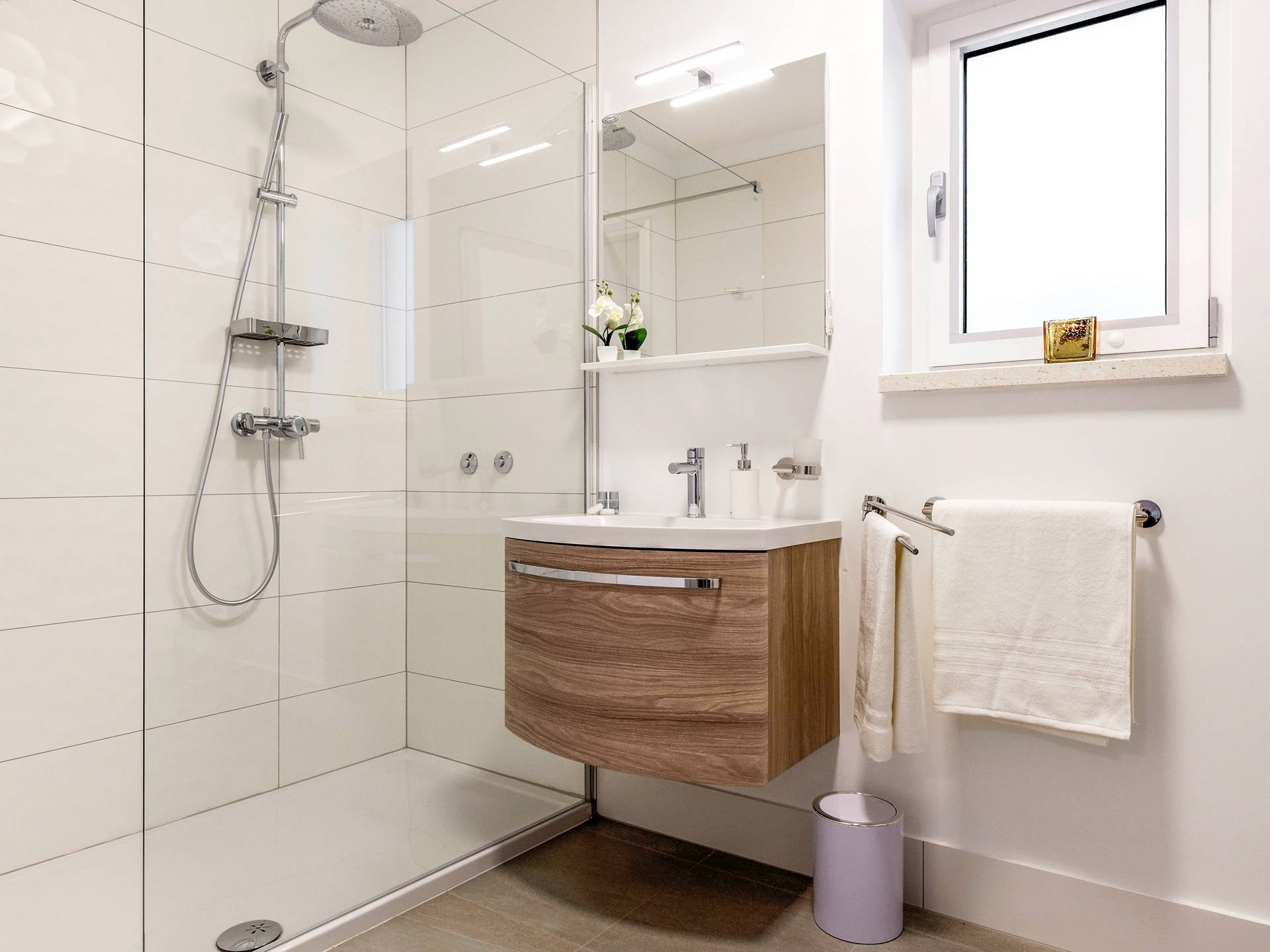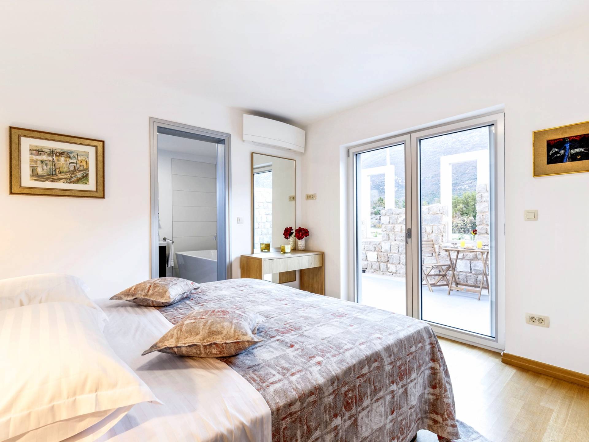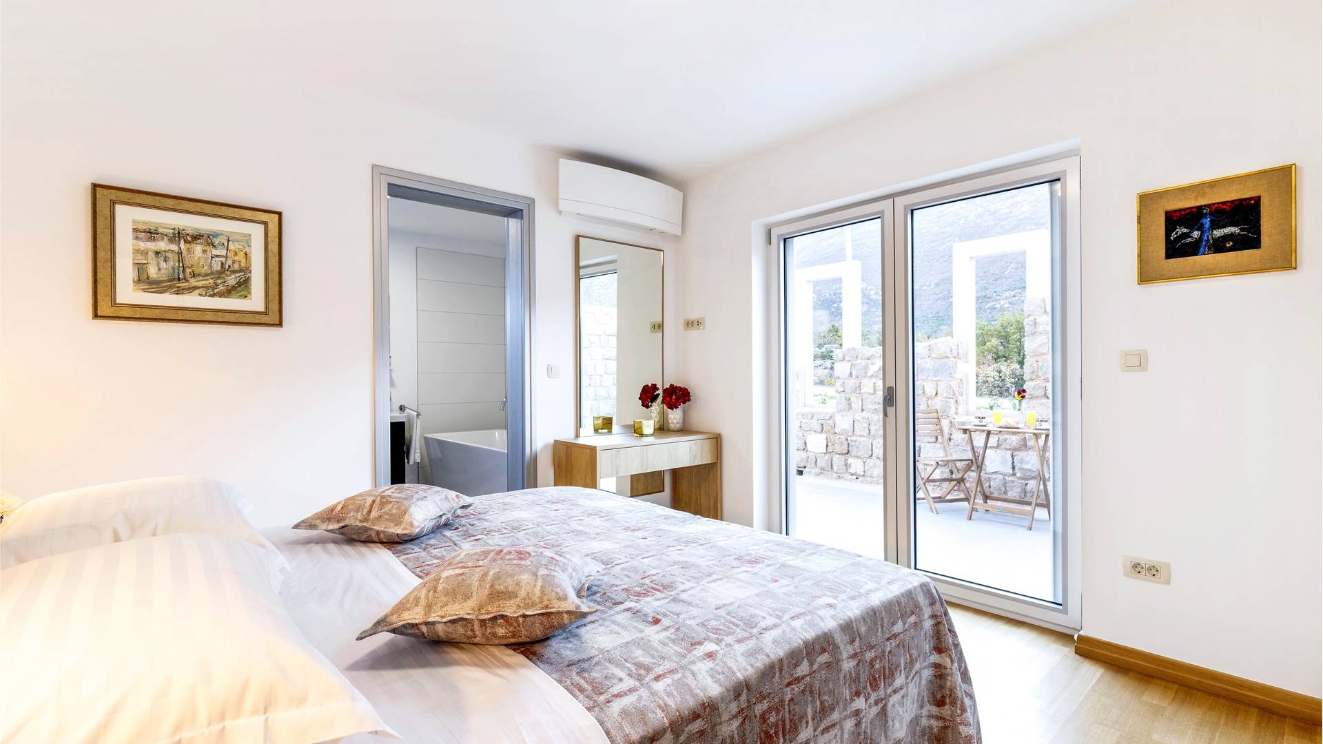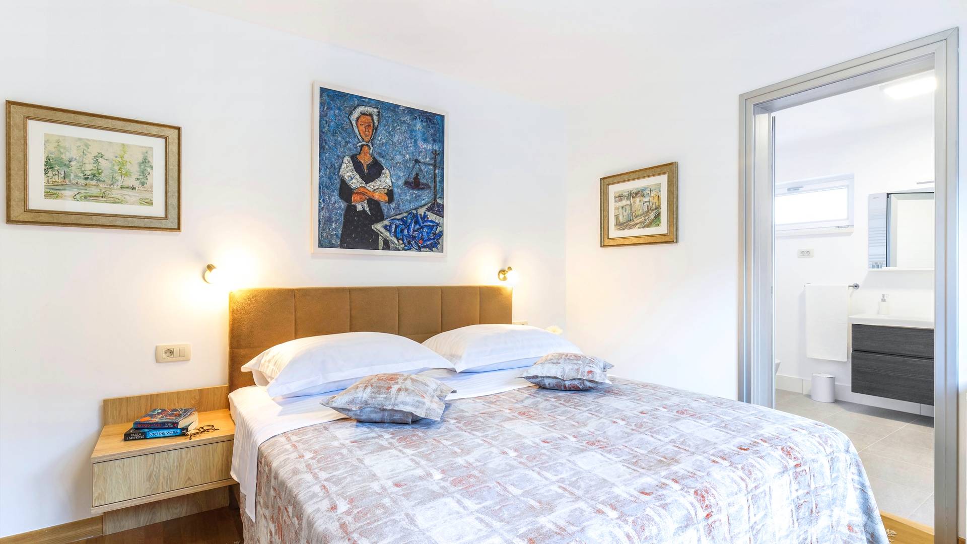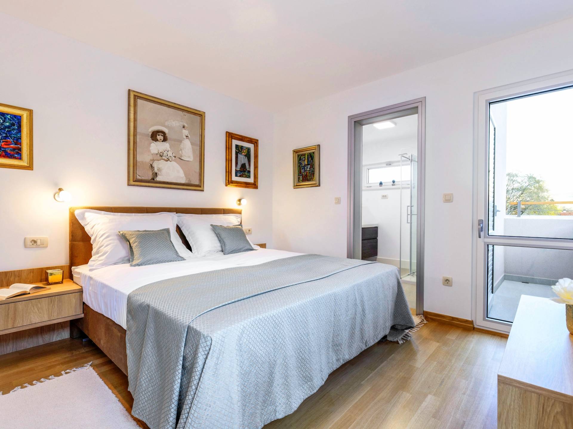 Οι εσωτερικές σκάλες σας οδηγούν στον πρώτο όροφο της βίλας με 3 όμορφα σχεδιασμένα υπνοδωμάτια με μπάνια και μπαλκόνια. Από τα παράθυρα κάθε δωματίου, υπάρχει θέα στην εκπληκτική φύση του βουνού Biokovo.