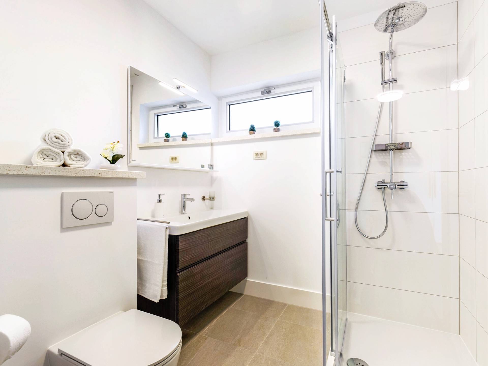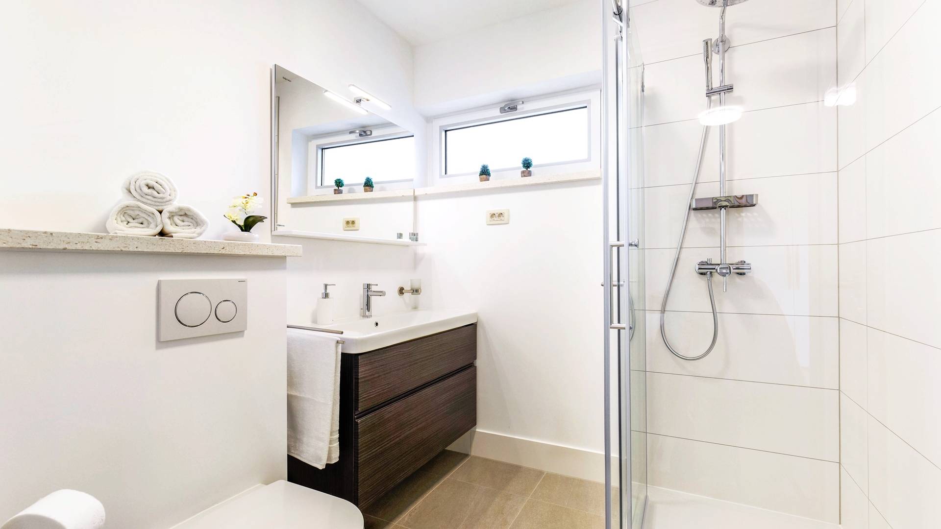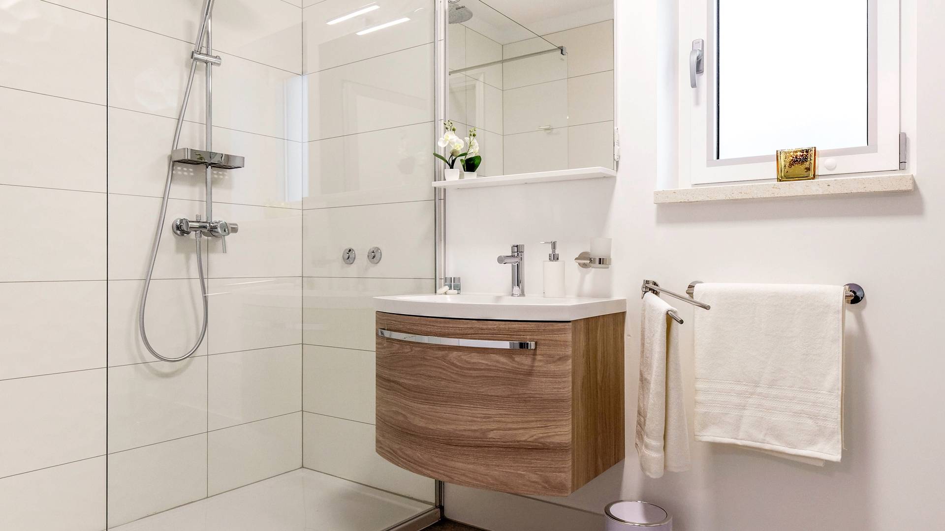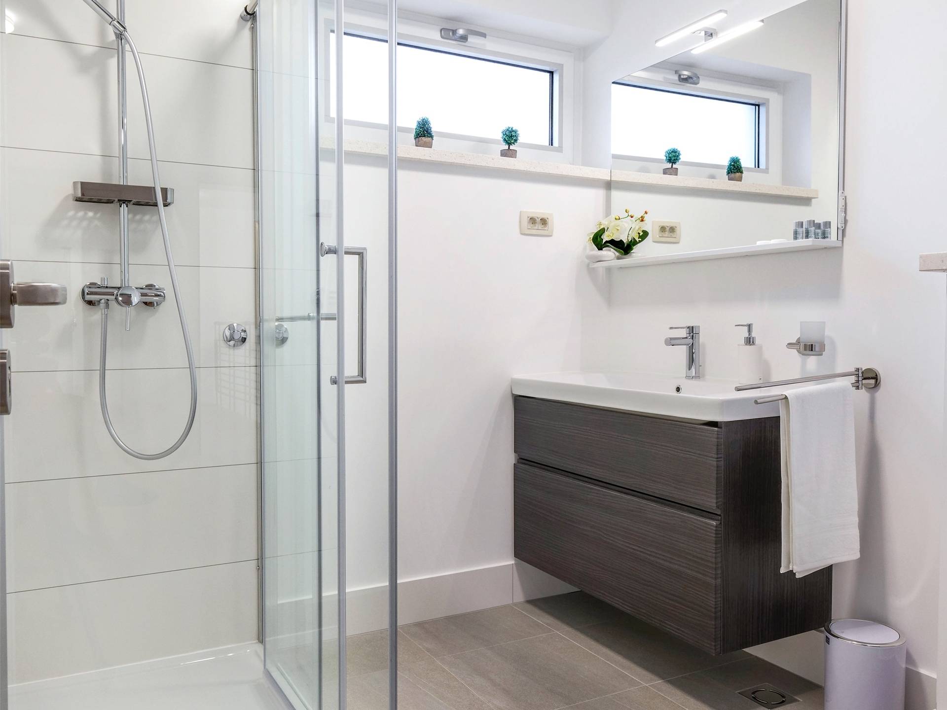 Οι εσωτερικές σκάλες σας οδηγούν στον πρώτο όροφο της βίλας με 3 όμορφα σχεδιασμένα υπνοδωμάτια με μπάνια και μπαλκόνια. Από τα παράθυρα κάθε δωματίου, υπάρχει θέα στην εκπληκτική φύση του βουνού Biokovo.