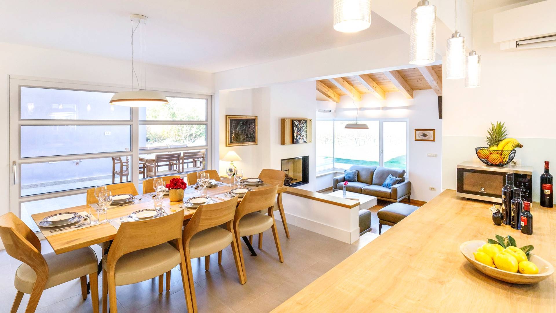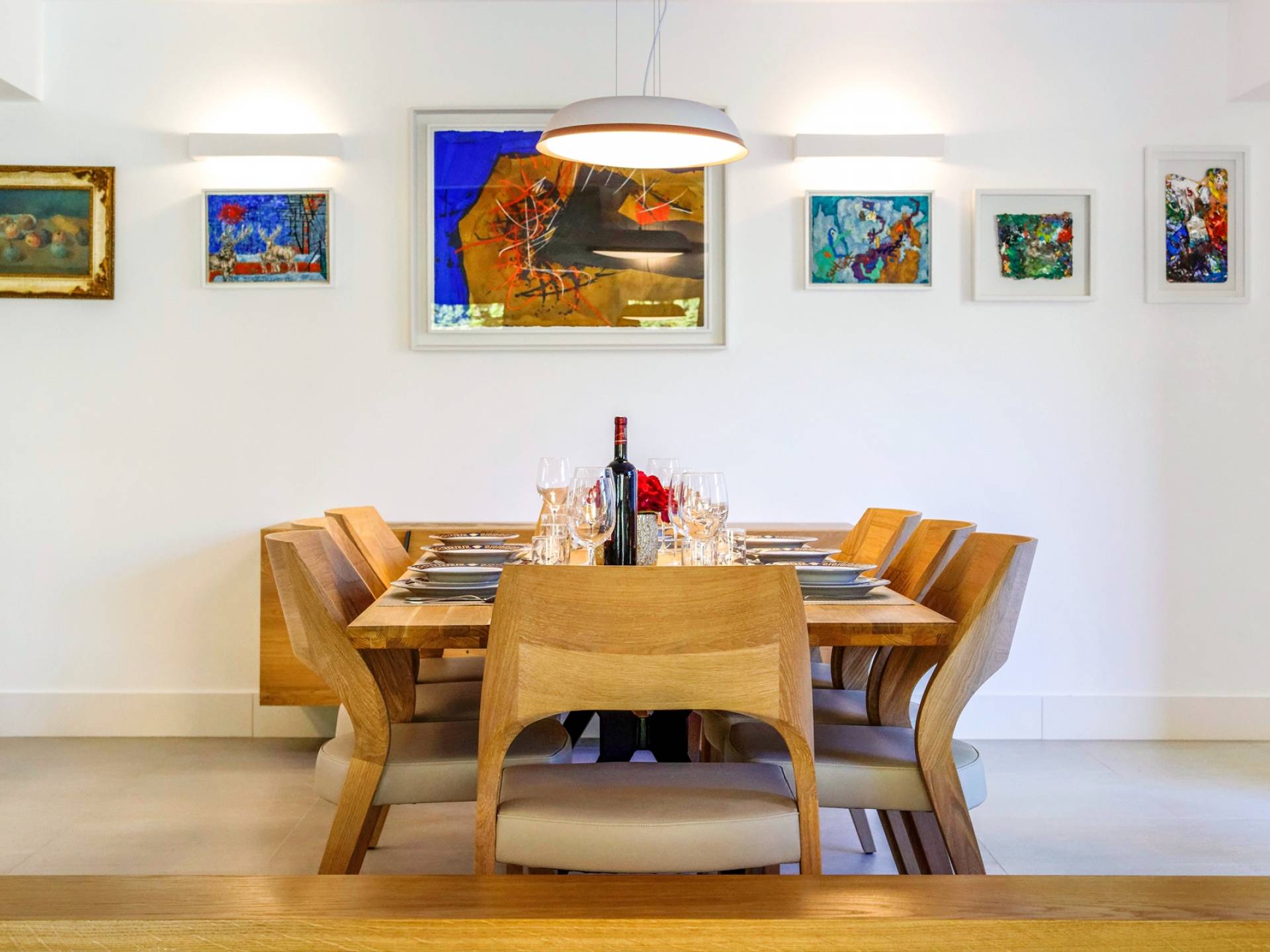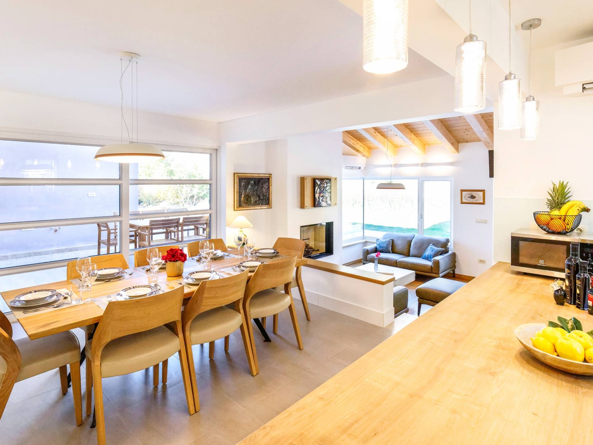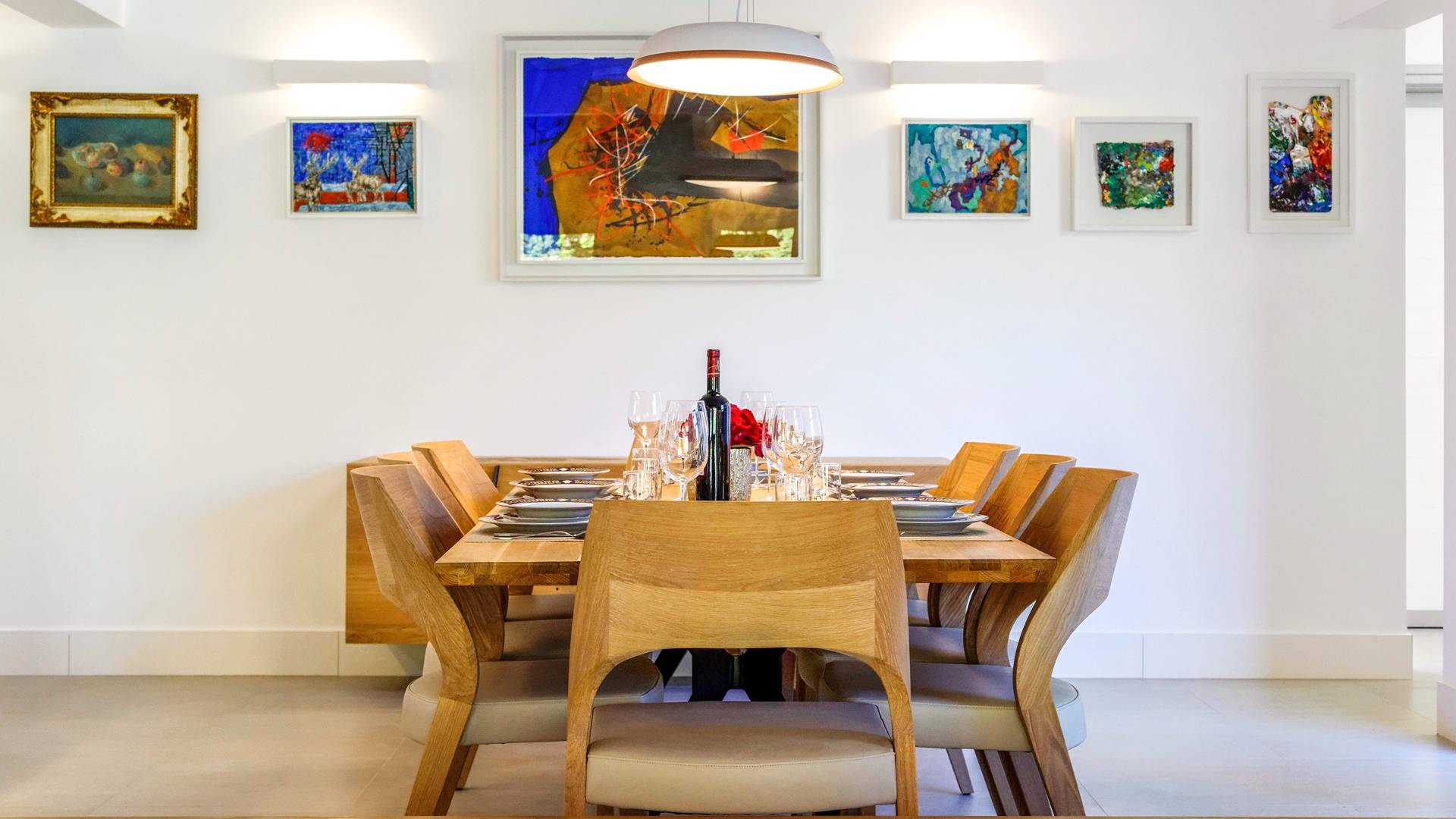 Το εσωτερικό της βίλας συνδυάζει μοντέρνες γραμμές με ζεστά χρώματα που προσφέρουν μια πραγματικά χαλαρωτική ατμόσφαιρα. Οι λάτρεις της τέχνης θα εκτιμήσουν την αξιόλογη συλλογή πινάκων που διακοσμούν τους τοίχους της βίλας. Η κομψότητα σε ισορροπία με την αρμονία εκτείνεται σε όλη τη βίλα. Το μινιμαλιστικά επιπλωμένο ισόγειο αποτελείται από ανοιχτή κουζίνα, τραπεζαρία και καθιστικό. Η κουζίνα και η τραπεζαρία είναι πλήρως εξοπλισμένα και επιπλωμένα με όλες τις απαραίτητες ηλεκτρικές συσκευές. Στον ίδιο όροφο, υπάρχει ένα υπνοδωμάτιο με ιδιωτικό μπάνιο και έξοδος στη βεράντα. Για μια απόλυτα άνετη διαμονή, υπάρχει επίσης ένα πλυσταριό, μια τουαλέτα, ένας αποθηκευτικός χώρος, μια σάουνα και ένα γυμναστήριο.