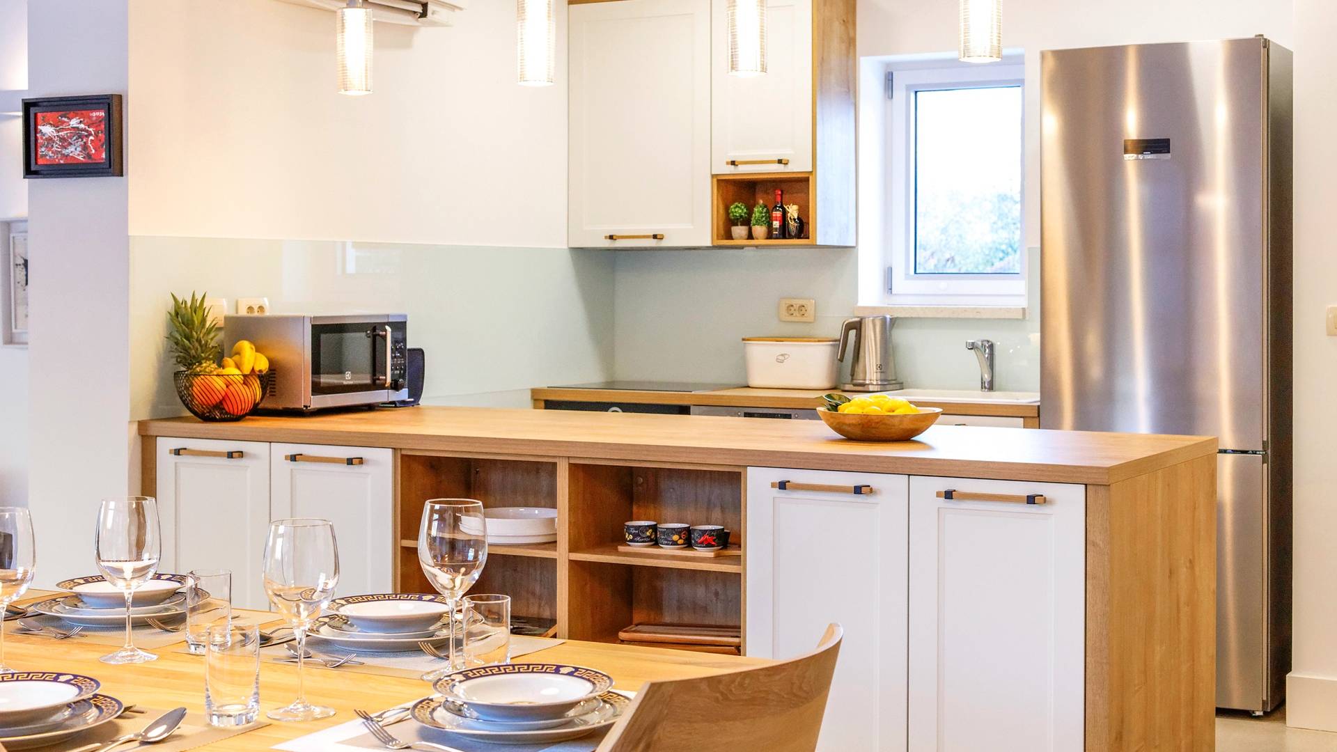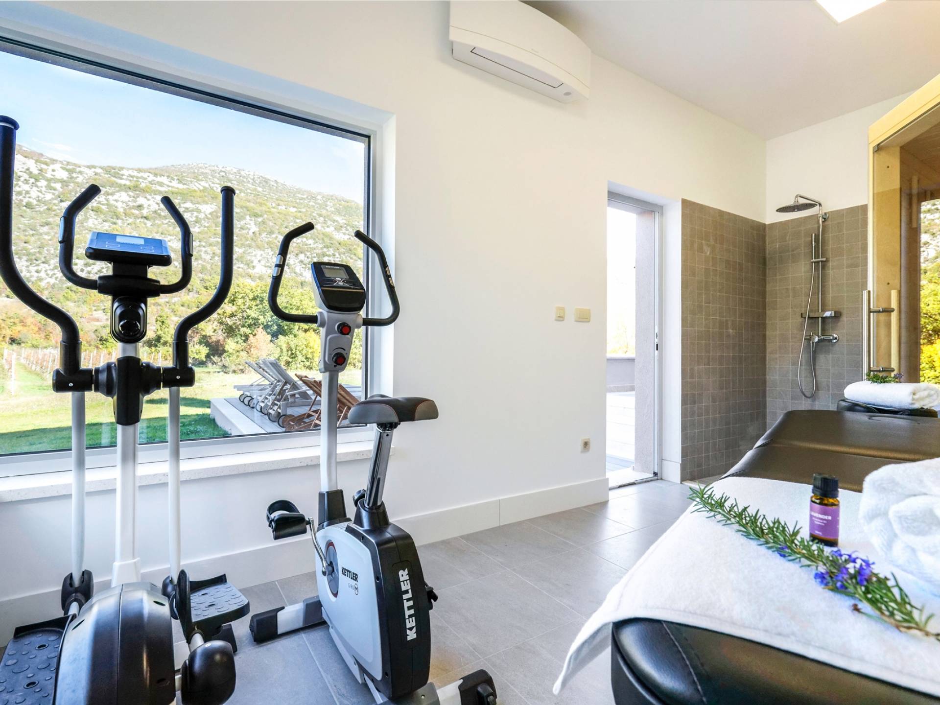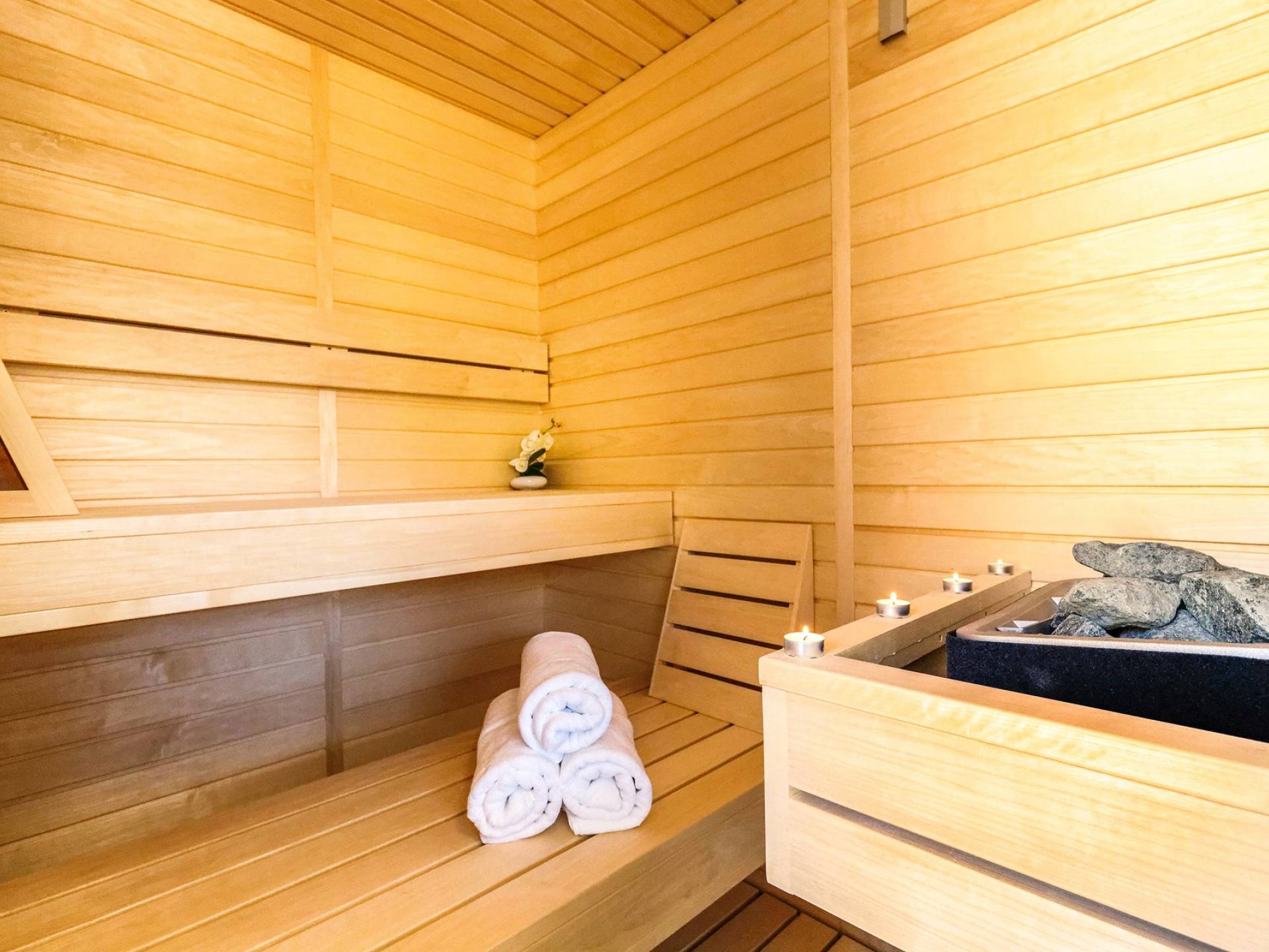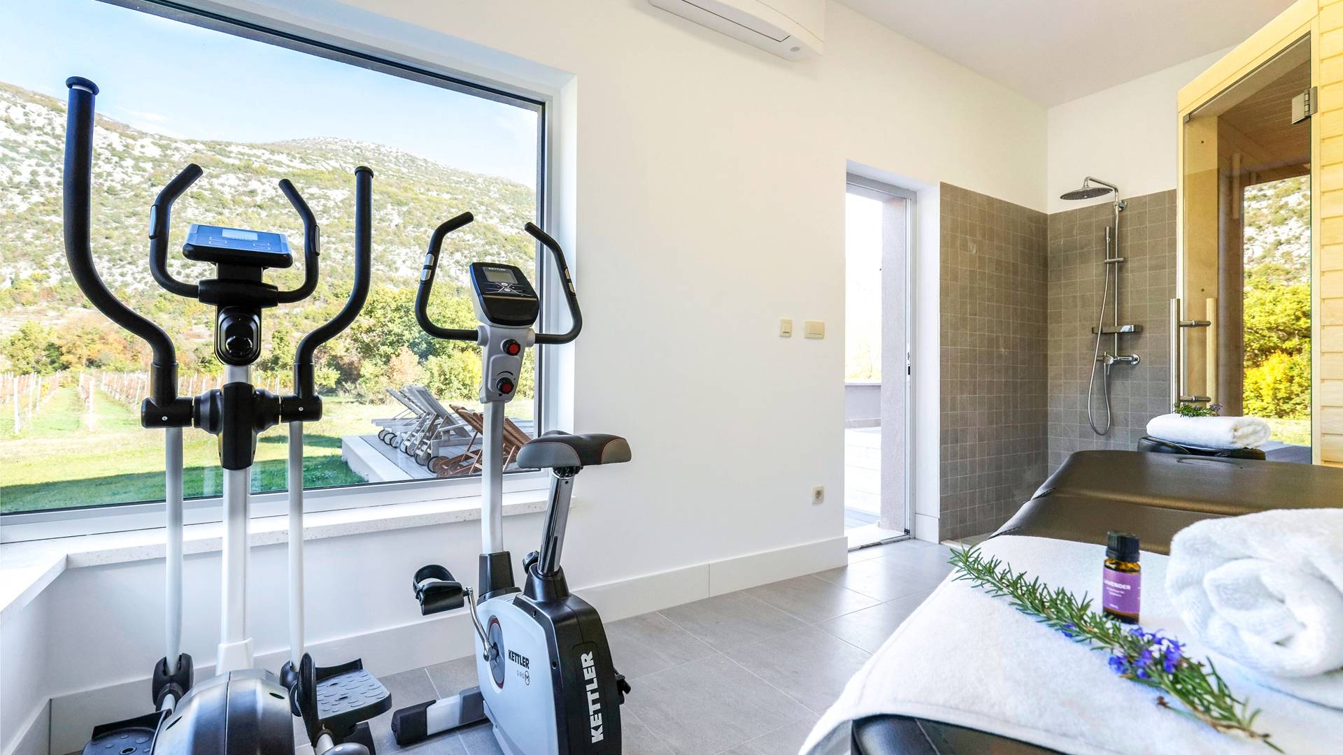 Το εσωτερικό της βίλας συνδυάζει μοντέρνες γραμμές με ζεστά χρώματα που προσφέρουν μια πραγματικά χαλαρωτική ατμόσφαιρα. Οι λάτρεις της τέχνης θα εκτιμήσουν την αξιόλογη συλλογή πινάκων που διακοσμούν τους τοίχους της βίλας. Η κομψότητα σε ισορροπία με την αρμονία εκτείνεται σε όλη τη βίλα. Το μινιμαλιστικά επιπλωμένο ισόγειο αποτελείται από ανοιχτή κουζίνα, τραπεζαρία και καθιστικό. Η κουζίνα και η τραπεζαρία είναι πλήρως εξοπλισμένα και επιπλωμένα με όλες τις απαραίτητες ηλεκτρικές συσκευές. Στον ίδιο όροφο, υπάρχει ένα υπνοδωμάτιο με ιδιωτικό μπάνιο και έξοδος στη βεράντα. Για μια απόλυτα άνετη διαμονή, υπάρχει επίσης ένα πλυσταριό, μια τουαλέτα, ένας αποθηκευτικός χώρος, μια σάουνα και ένα γυμναστήριο.
