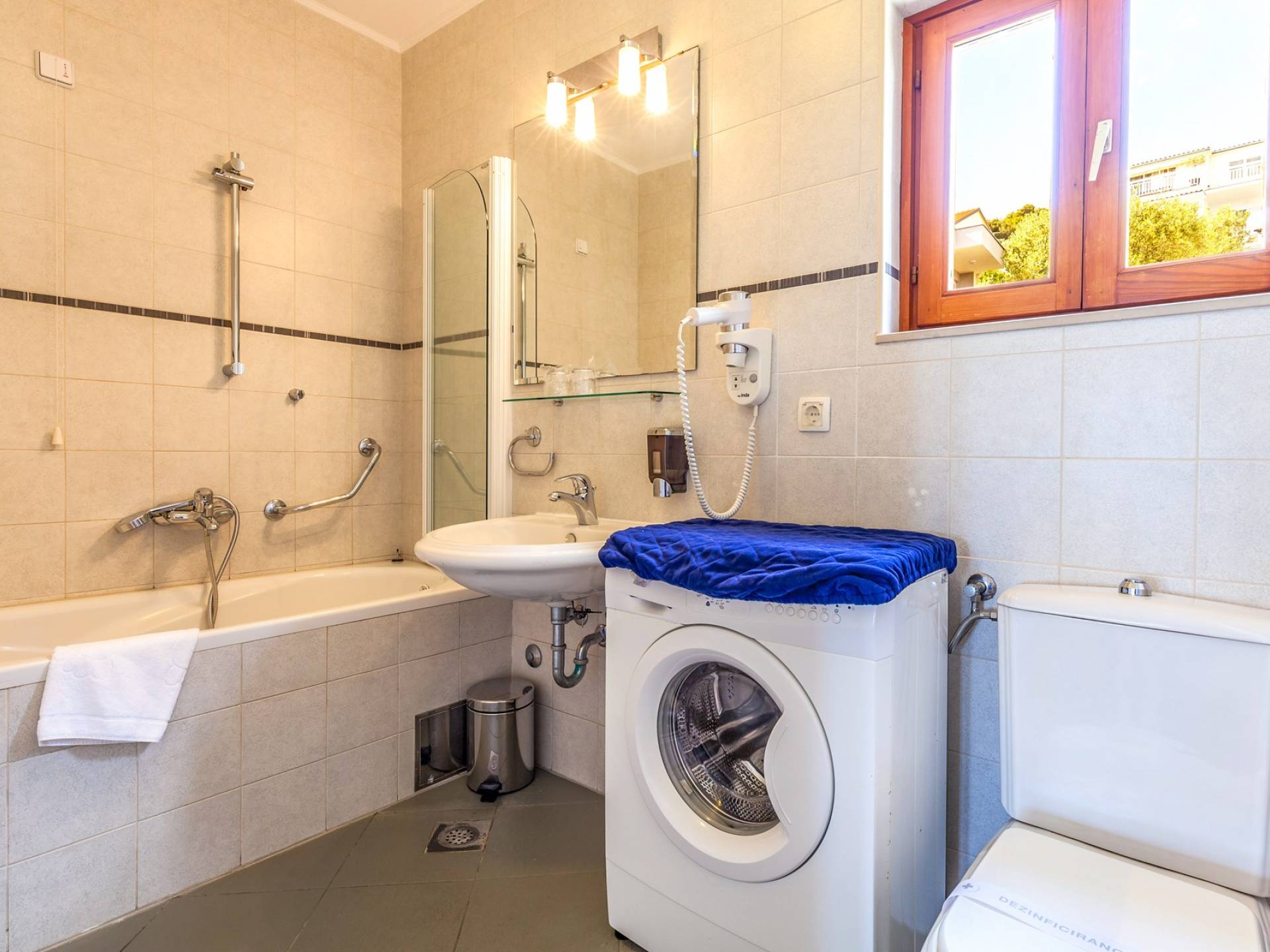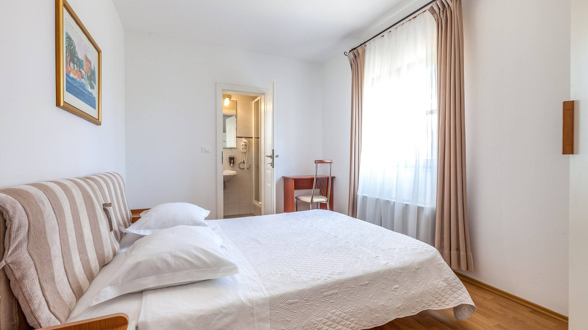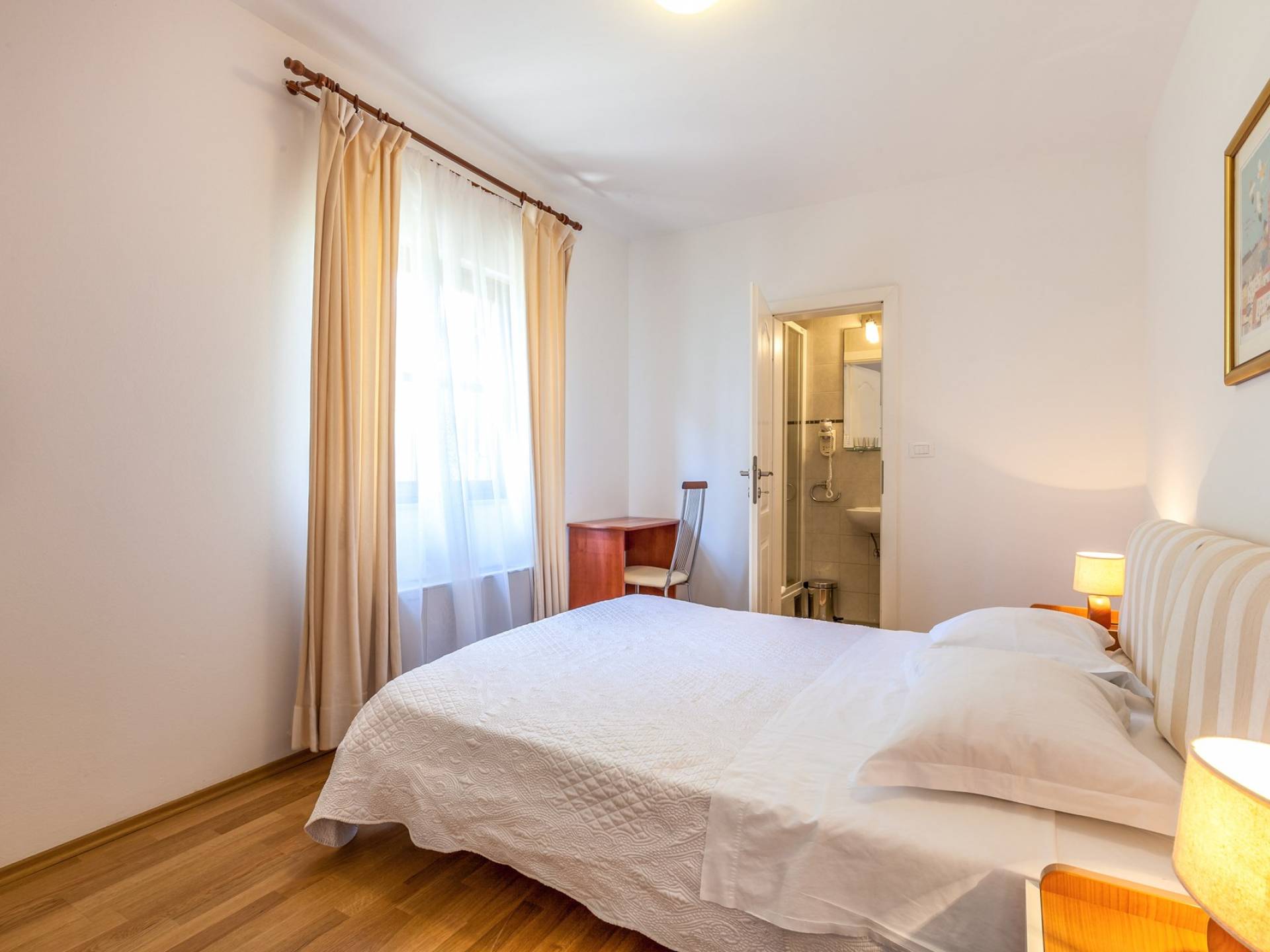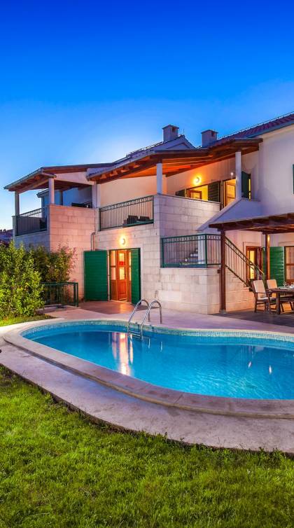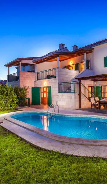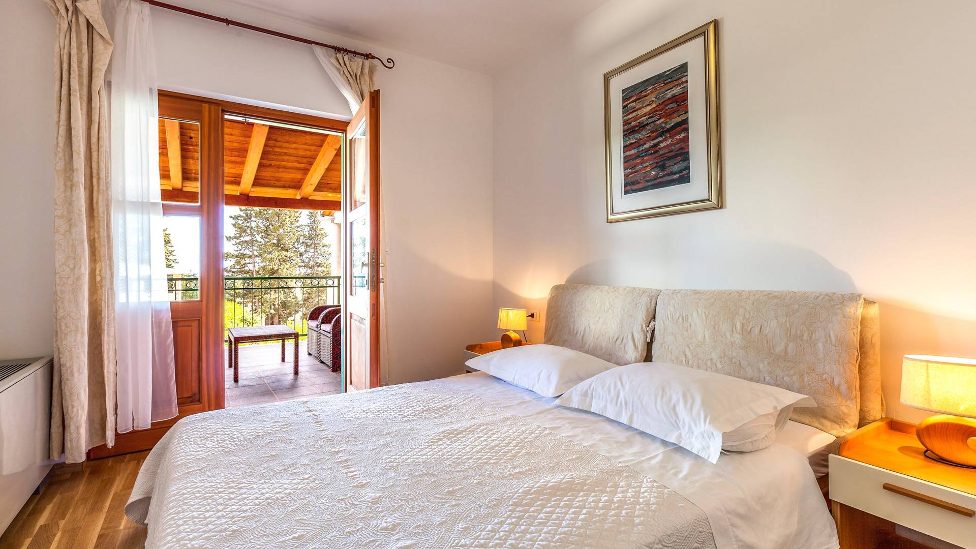 Η βεράντα του πρώτου ορόφου συνδέεται με ένα από τα τέσσερα δίκλινα υπνοδωμάτια της βίλας. Αυτή η βεράντα έχει περισσότερα έπιπλα εξωτερικού χώρου και προσφέρει όμορφη θέα στο κροατικό περιβάλλον. Τα τέσσερα δίκλινα υπνοδωμάτια είναι επιπλωμένα άνετα και παρέχουν άφθονο αποθηκευτικό χώρο. Υπάρχουν επίσης 4 μοντέρνα μπάνια στη βίλα με μπανιέρα και ντους, μερικά από τα οποία συνδέονται με τα υπνοδωμάτια. Υπάρχει επίσης ένα πλυντήριο ρούχων σε ένα από τα μπάνια για να γίνει αυτή η βίλα ένα πραγματικό σπίτι μακριά από το σπίτι. Για να κάνετε τη διαμονή σας όσο πιο ευχάριστη γίνεται, η βίλα είναι εξοπλισμένη με κλιματισμό, δορυφορική τηλεόραση, DVD player, Hi-Fi, απευθείας τηλεφωνική γραμμή και Internet.