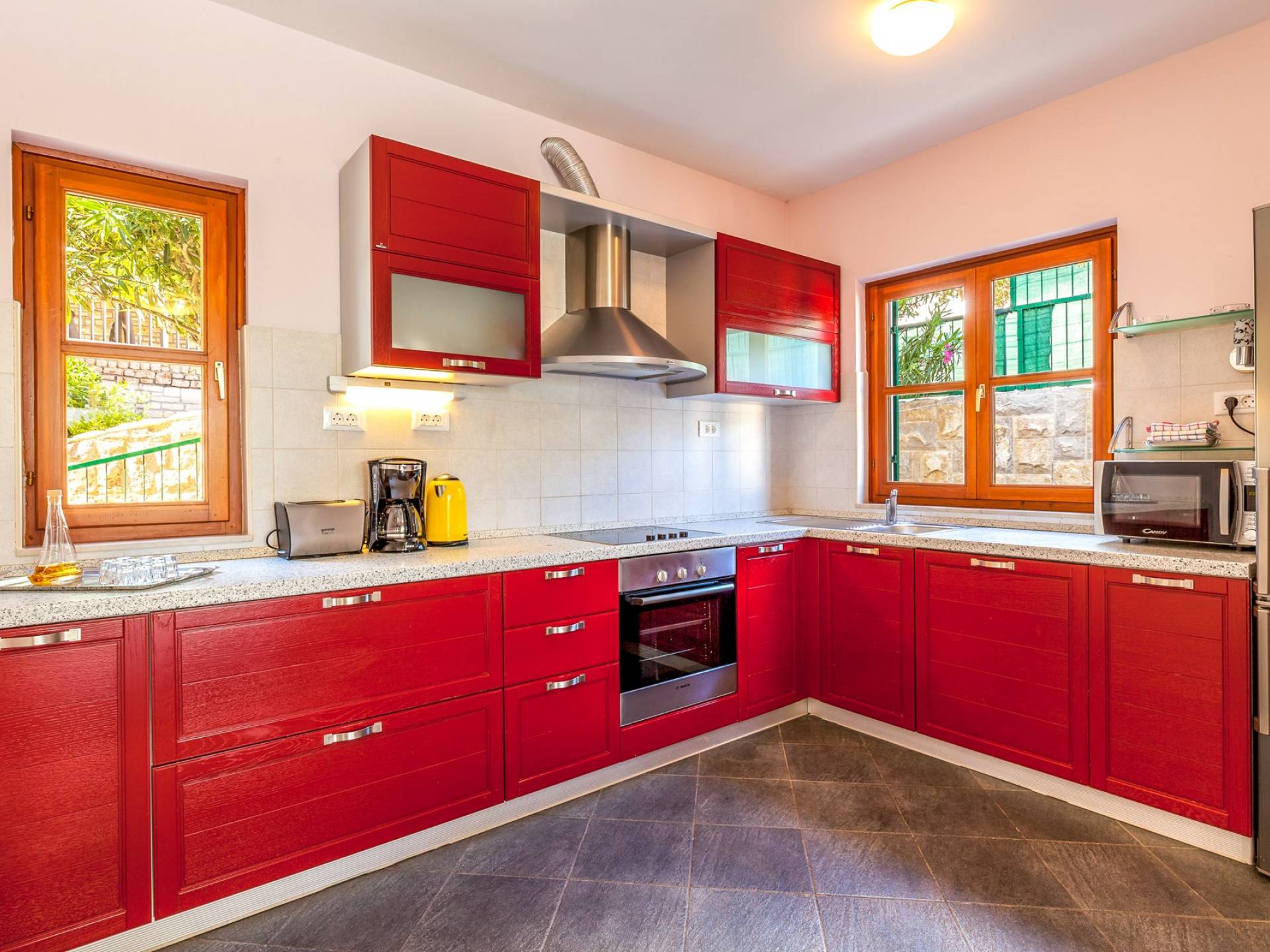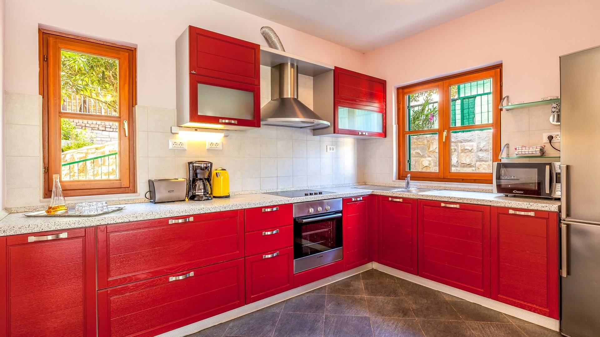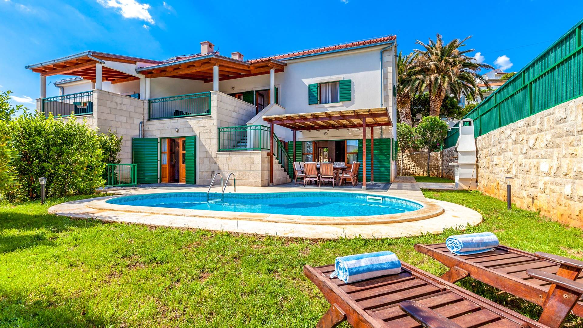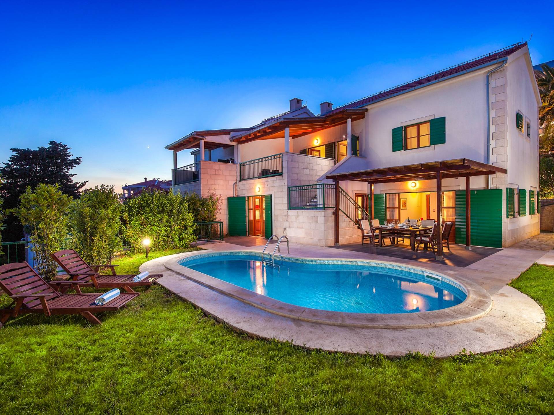 Η βεράντα του πρώτου ορόφου συνδέεται με ένα από τα τέσσερα δίκλινα υπνοδωμάτια της βίλας. Αυτή η βεράντα έχει περισσότερα έπιπλα εξωτερικού χώρου και προσφέρει όμορφη θέα στο κροατικό περιβάλλον. Τα τέσσερα δίκλινα υπνοδωμάτια είναι επιπλωμένα άνετα και παρέχουν άφθονο αποθηκευτικό χώρο. Υπάρχουν επίσης 4 μοντέρνα μπάνια στη βίλα με μπανιέρα και ντους, μερικά από τα οποία συνδέονται με τα υπνοδωμάτια. Υπάρχει επίσης ένα πλυντήριο ρούχων σε ένα από τα μπάνια για να γίνει αυτή η βίλα ένα πραγματικό σπίτι μακριά από το σπίτι. Για να κάνετε τη διαμονή σας όσο πιο ευχάριστη γίνεται, η βίλα είναι εξοπλισμένη με κλιματισμό, δορυφορική τηλεόραση, DVD player, Hi-Fi, απευθείας τηλεφωνική γραμμή και Internet.