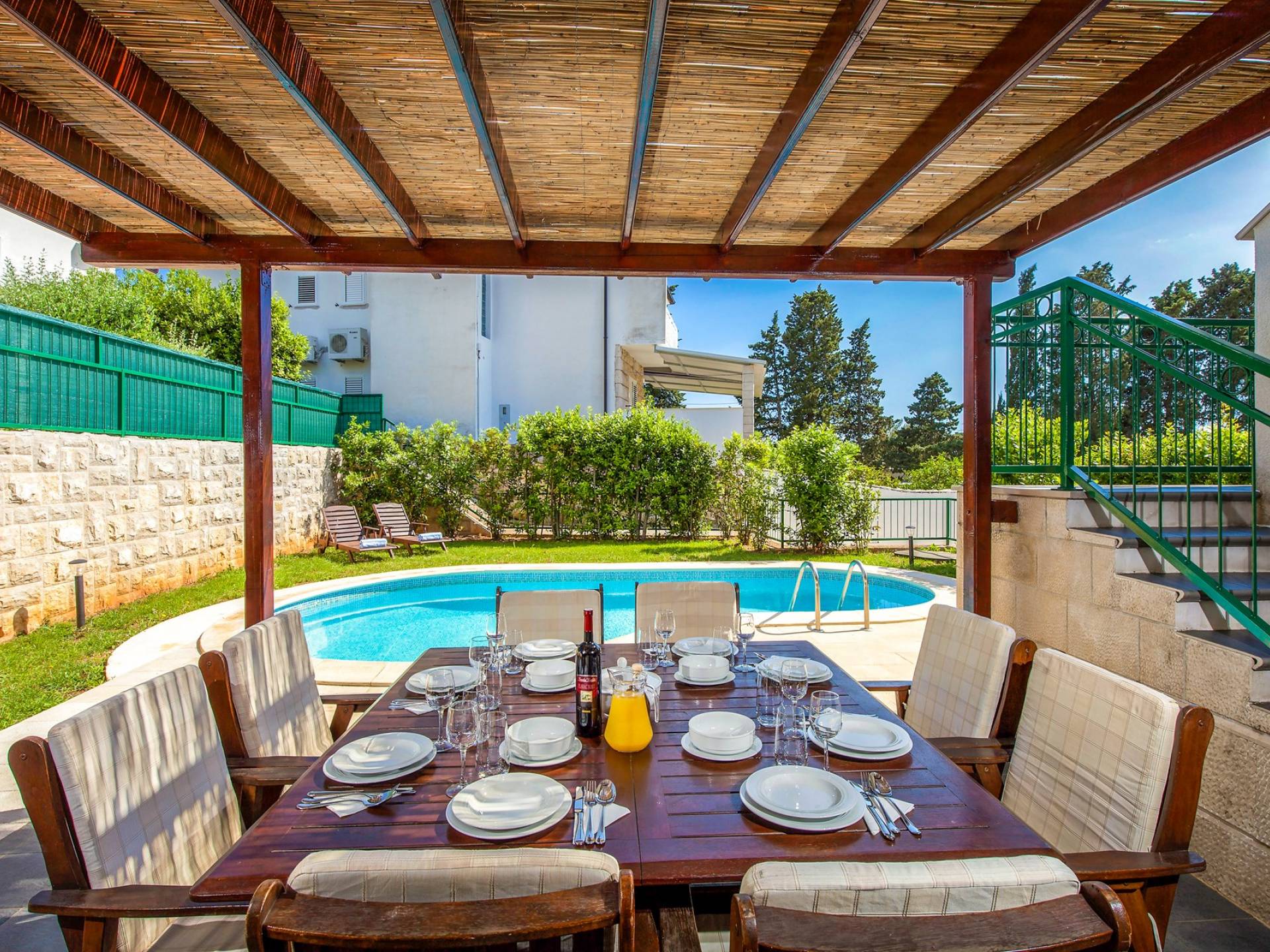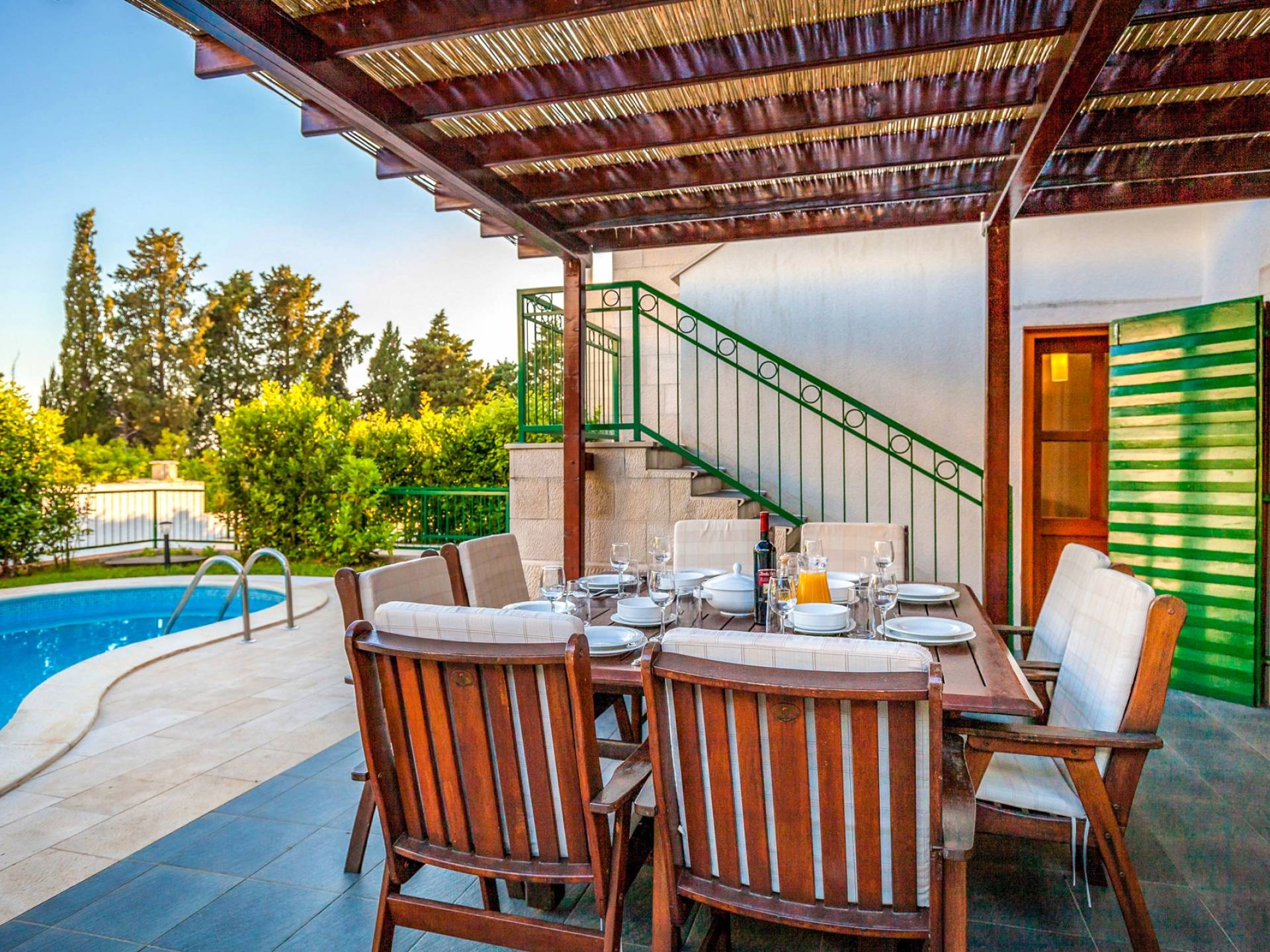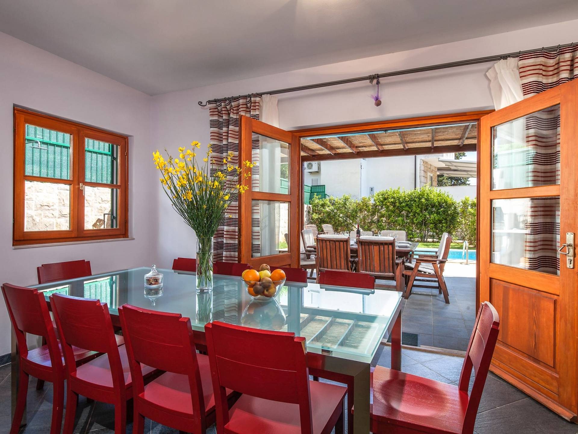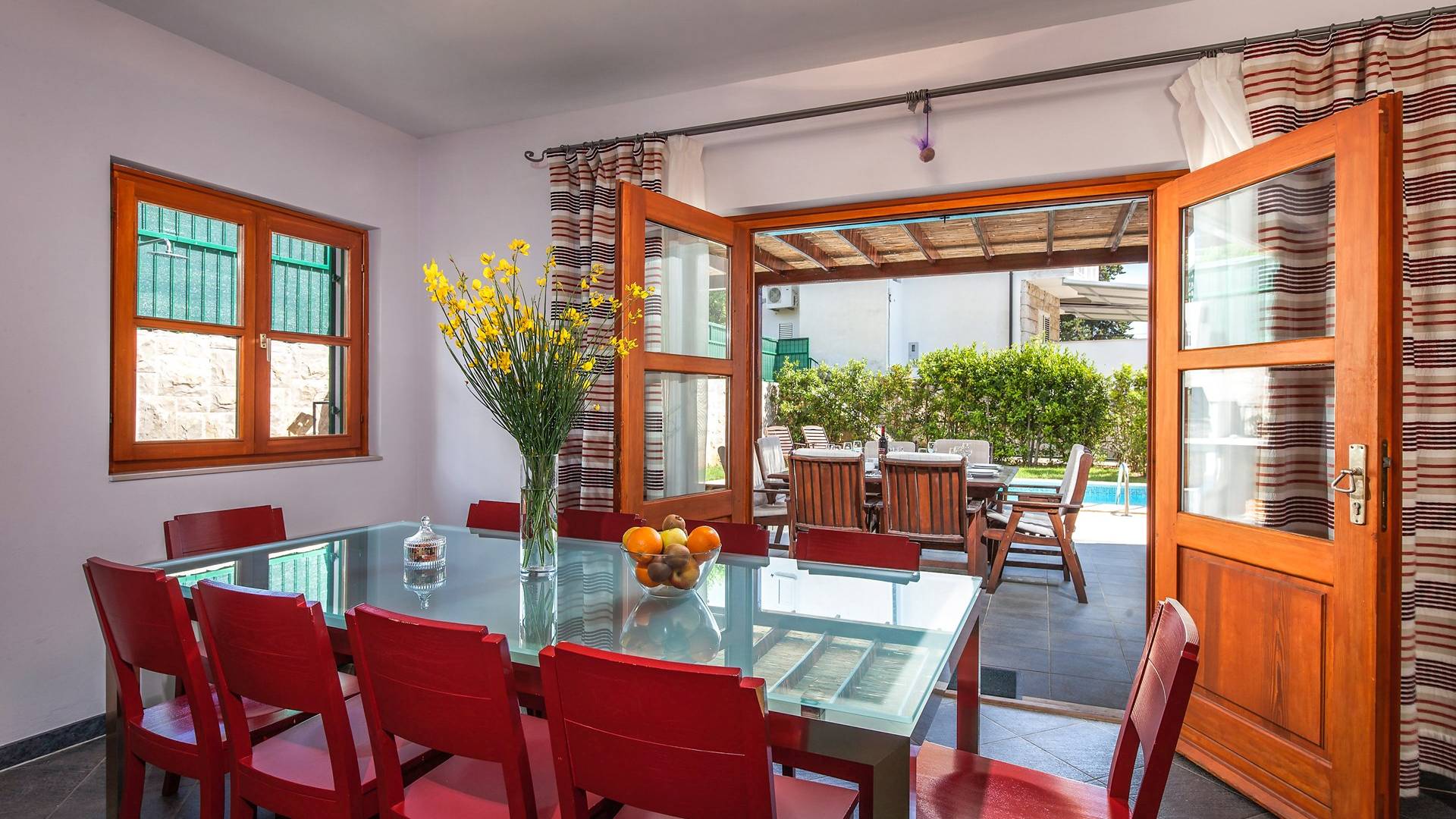 Στο ισόγειο υπάρχει κουζίνα και τραπεζαρία που οδηγεί στο σαλόνι. Η τραπεζαρία ανοίγει στην υπαίθρια τραπεζαρία και πλημμυρίζει το δωμάτιο με φως, ιδανικό για μια ήρεμη ατμόσφαιρα. Η κουζίνα διαθέτει όλες τις σύγχρονες συσκευές για να δημιουργήσετε σπιτικό φαγητό κατά τη διάρκεια της διαμονής σας. Η εξωτερική βεράντα είναι ιδανική για να περάσετε χρόνο με τα αγαπημένα σας πρόσωπα και να απολαύσετε τον καιρό της Μεσογείου. Υπάρχει χώρος για να χαλαρώσετε και να κάνετε ηλιοθεραπεία καθώς και να χαλαρώσετε στη μεγάλη ιδιωτική πισίνα. Εκτός από την πρόσβαση σε αυτόν τον χώρο μέσω των μπαλκονόπορτων του ισογείου, μπορείτε να αποκτήσετε πρόσβαση στην πισίνα από τη βεράντα του πρώτου ορόφου.