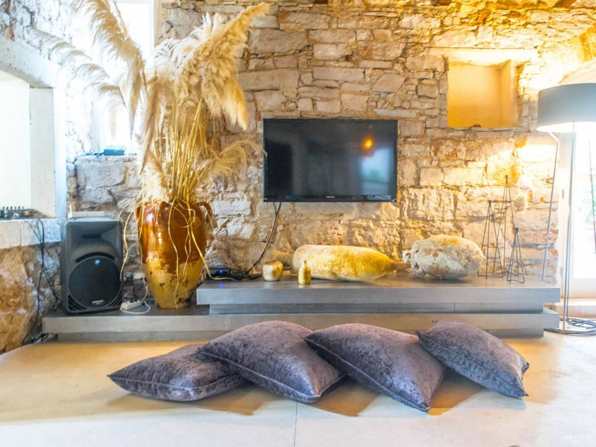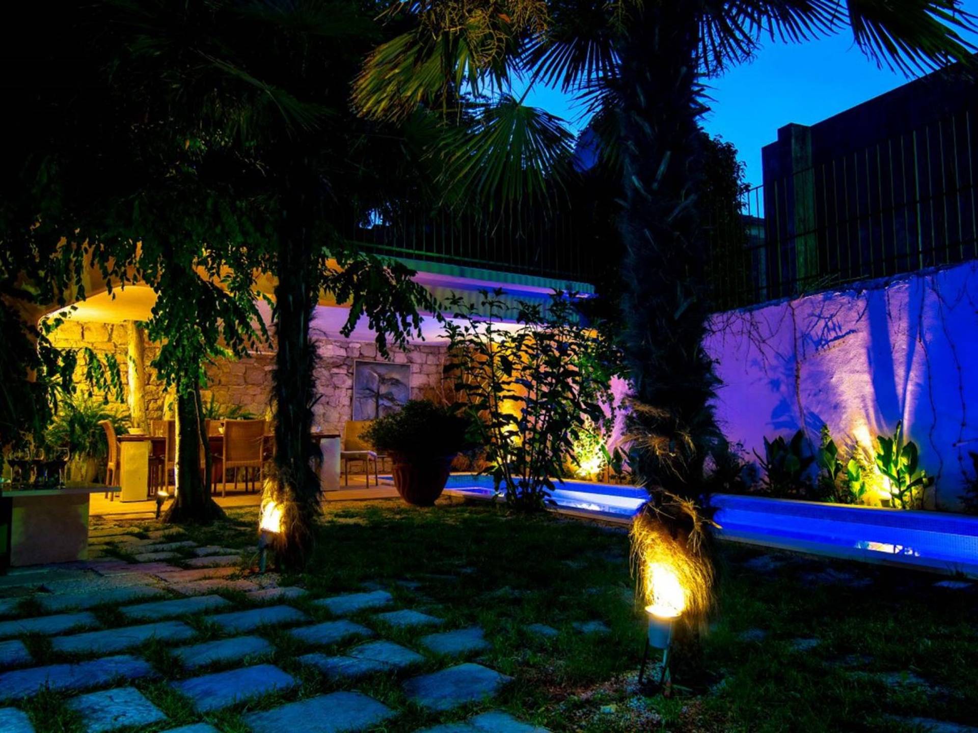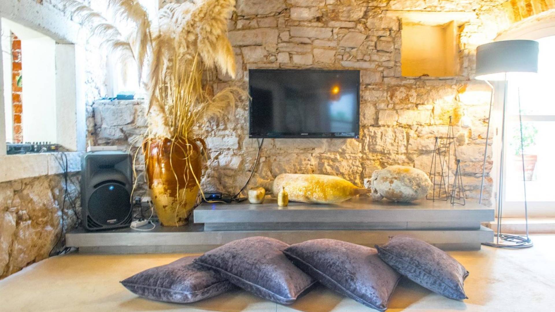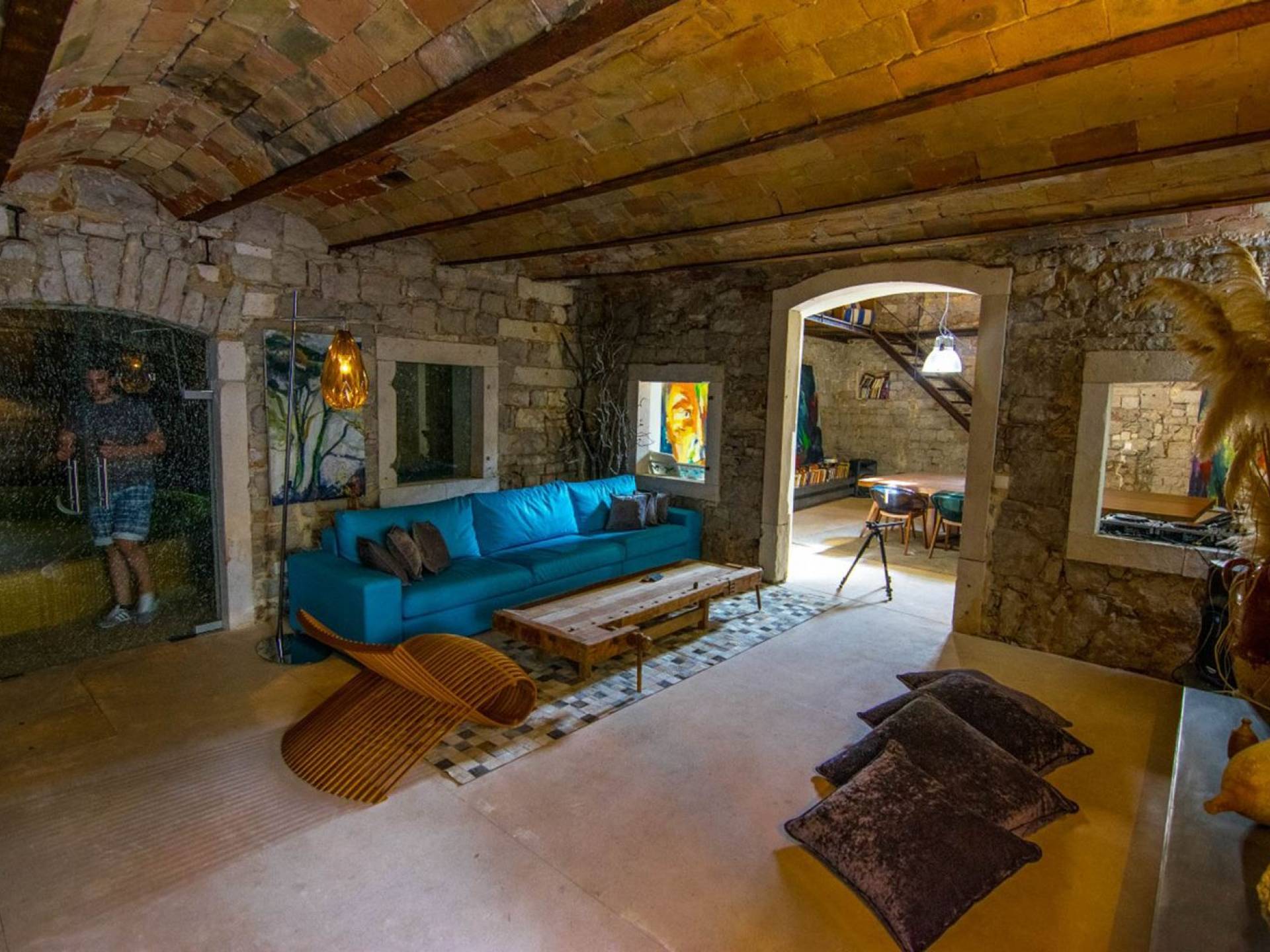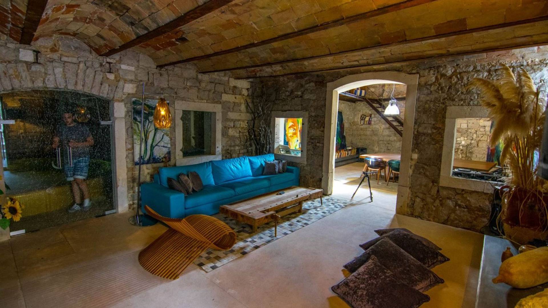 Μια εξωτερική βεράντα είναι επίσης εξοπλισμένη με μεγάλο τραπέζι και καρέκλες, μπάρμπεκιου αερίου, έπιπλα κήπου, ξαπλώστρες, ντους εξωτερικού χώρου. Στο ισόγειο έχει διαμορφωθεί ένα εξαιρετικό ηχοσύστημα, το οποίο είναι υπέροχο αν θέλετε να κάνετε ένα ιδιωτικό πάρτι. Το παλάτι περιβάλλεται από ψηλούς πέτρινους τοίχους, η απόλυτη ιδιωτικότητα είναι εγγυημένη.