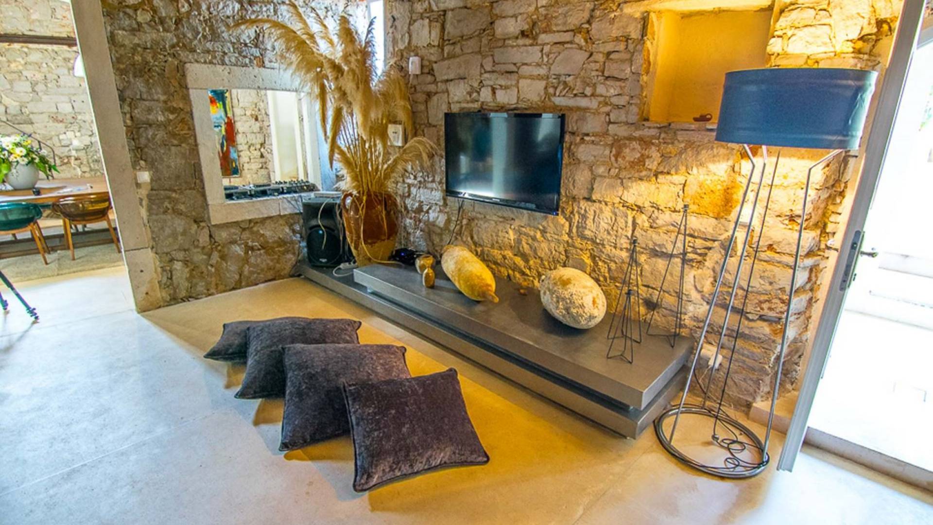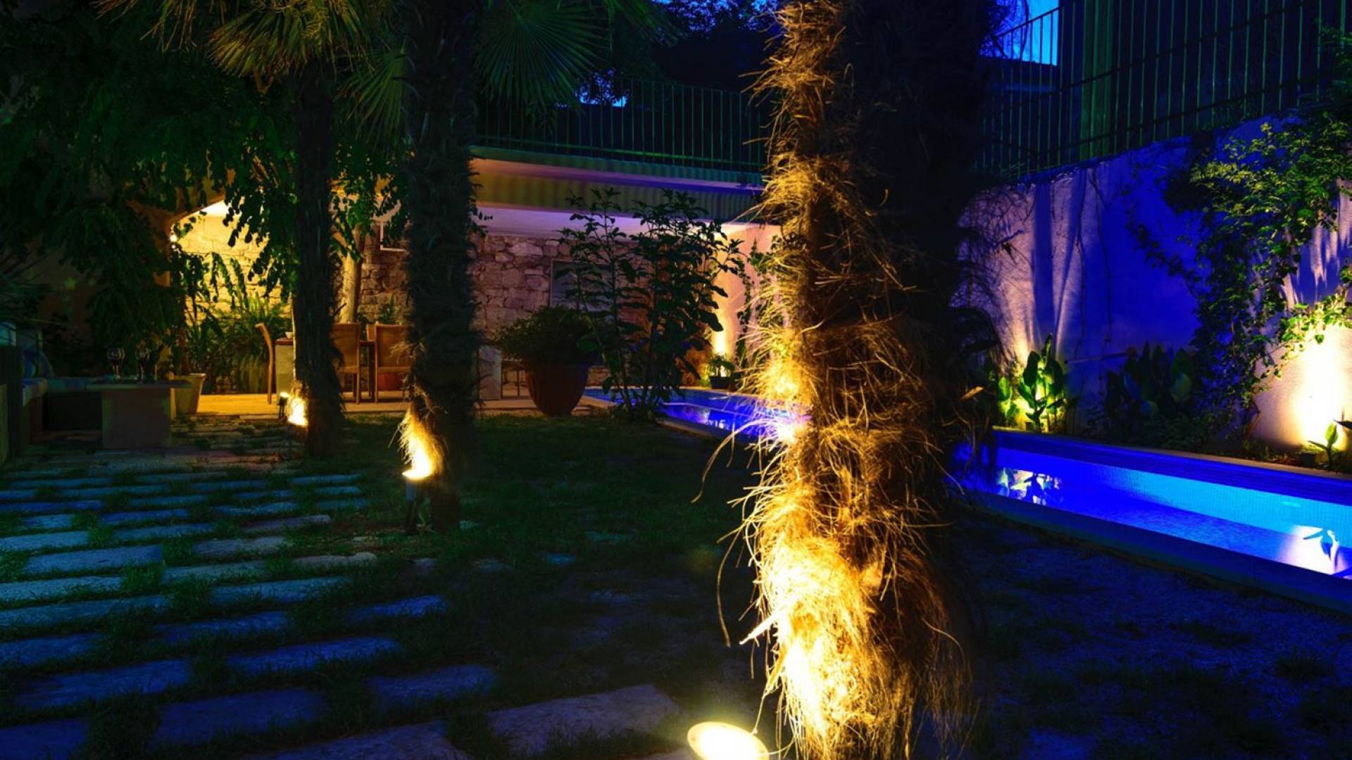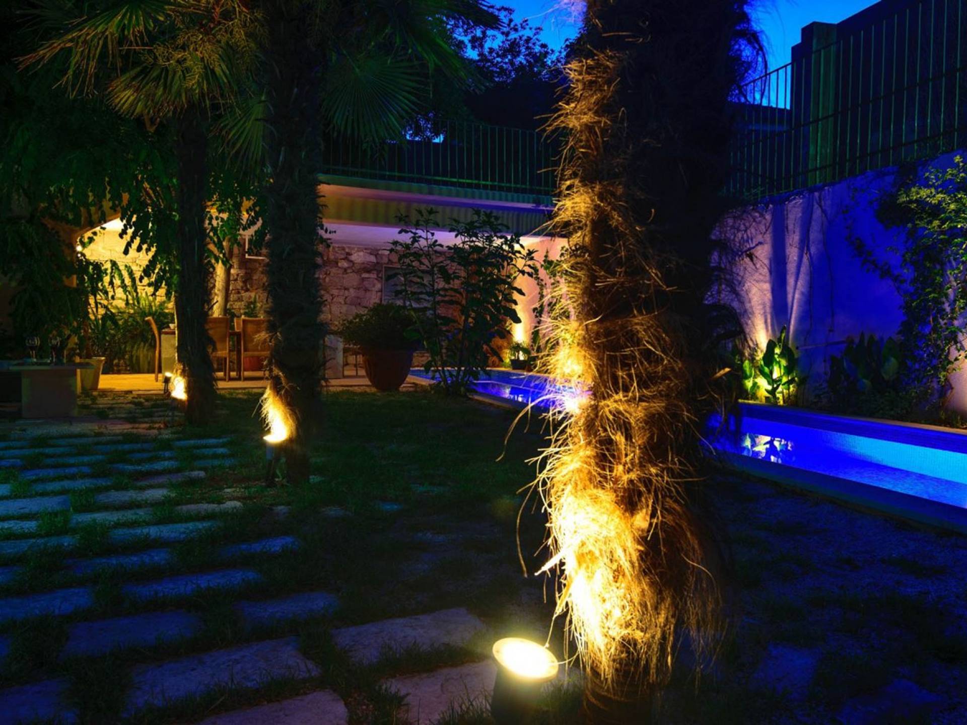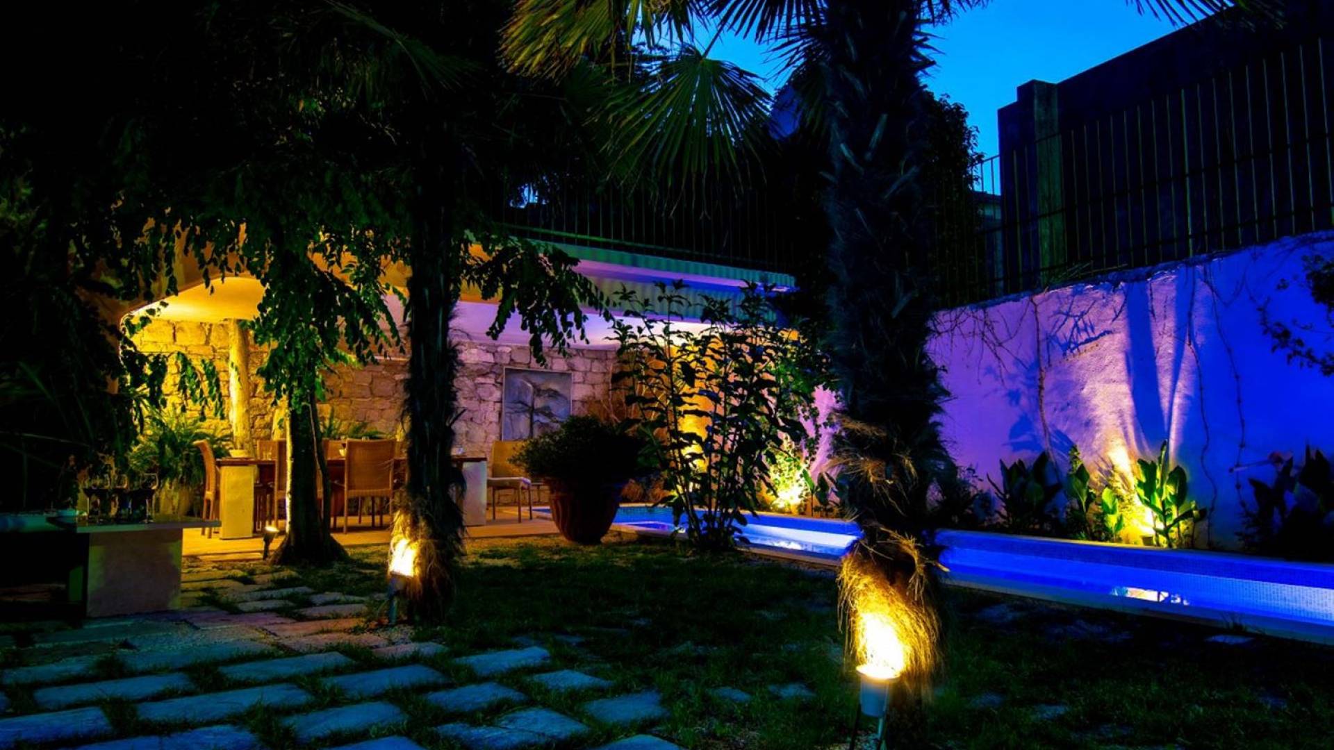 Μια εξωτερική βεράντα είναι επίσης εξοπλισμένη με μεγάλο τραπέζι και καρέκλες, μπάρμπεκιου αερίου, έπιπλα κήπου, ξαπλώστρες, ντους εξωτερικού χώρου. Στο ισόγειο έχει διαμορφωθεί ένα εξαιρετικό ηχοσύστημα, το οποίο είναι υπέροχο αν θέλετε να κάνετε ένα ιδιωτικό πάρτι. Το παλάτι περιβάλλεται από ψηλούς πέτρινους τοίχους, η απόλυτη ιδιωτικότητα είναι εγγυημένη.