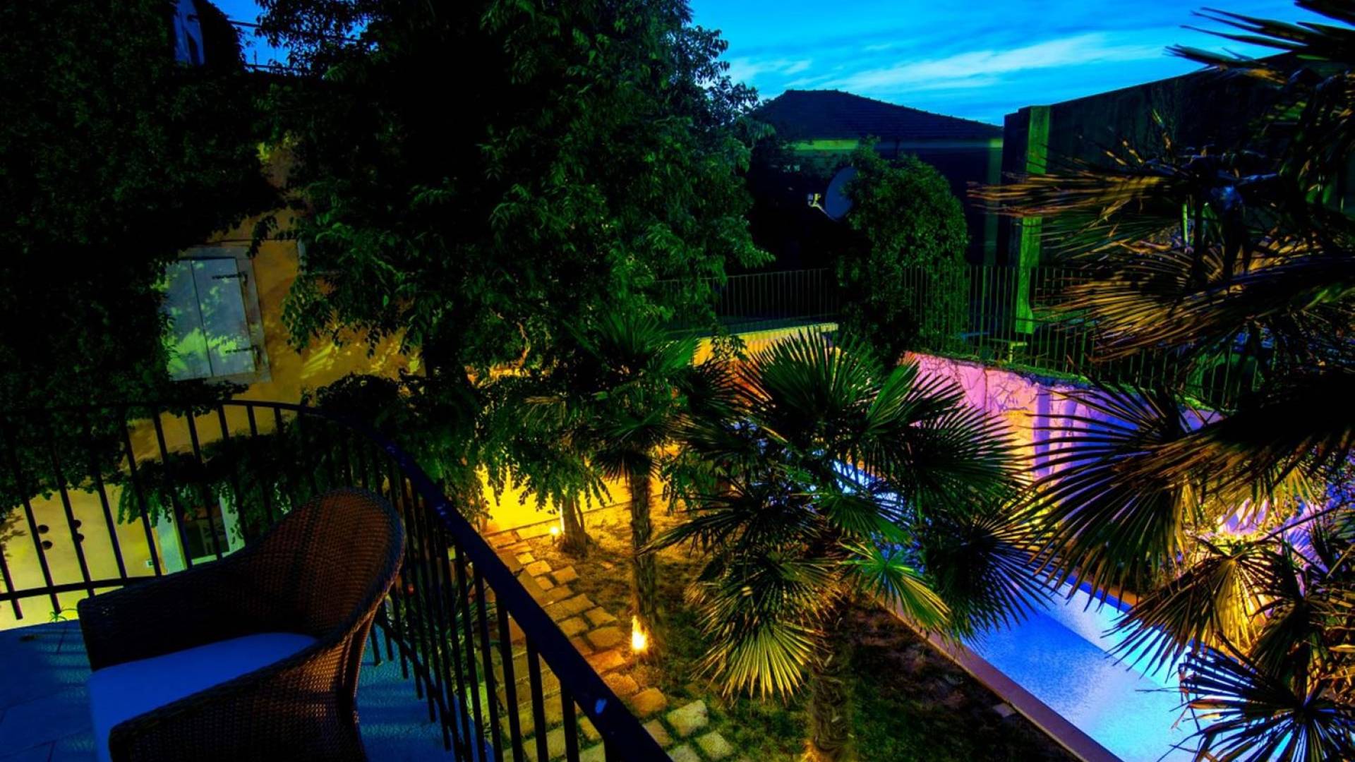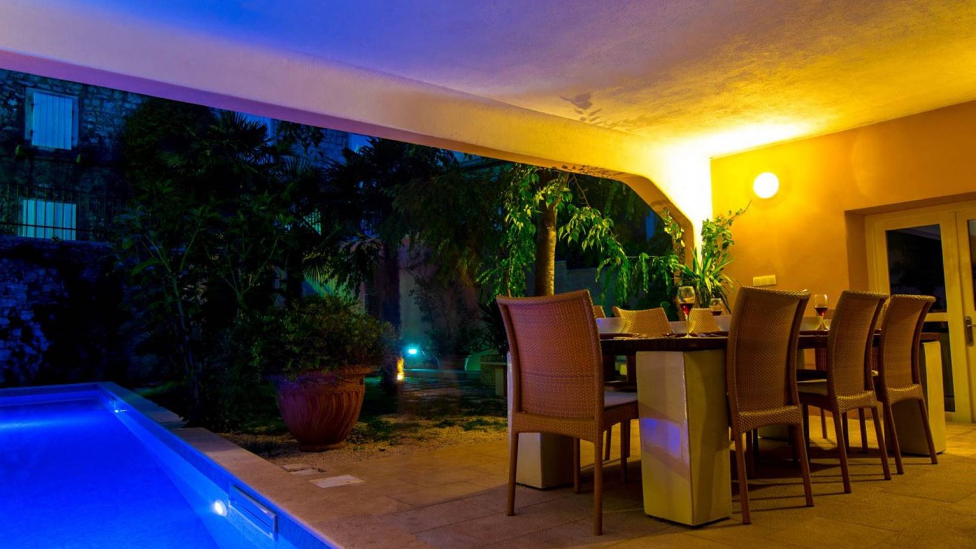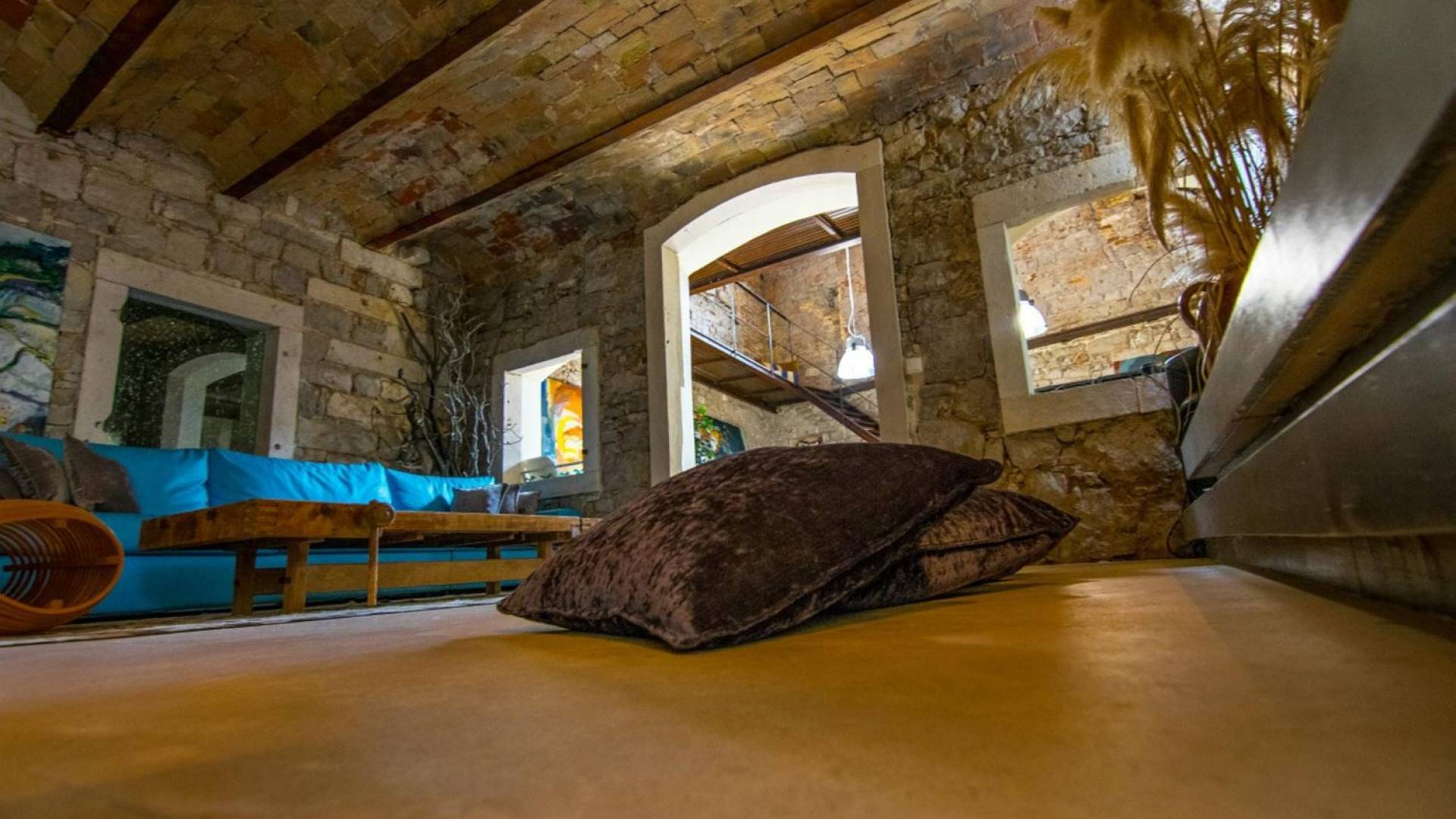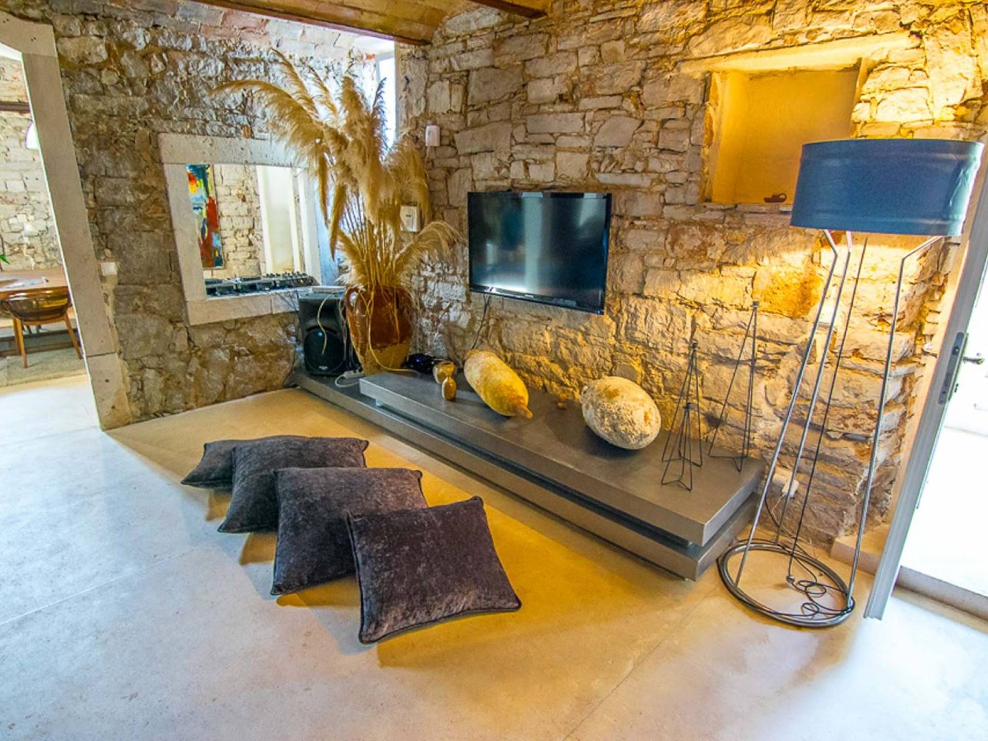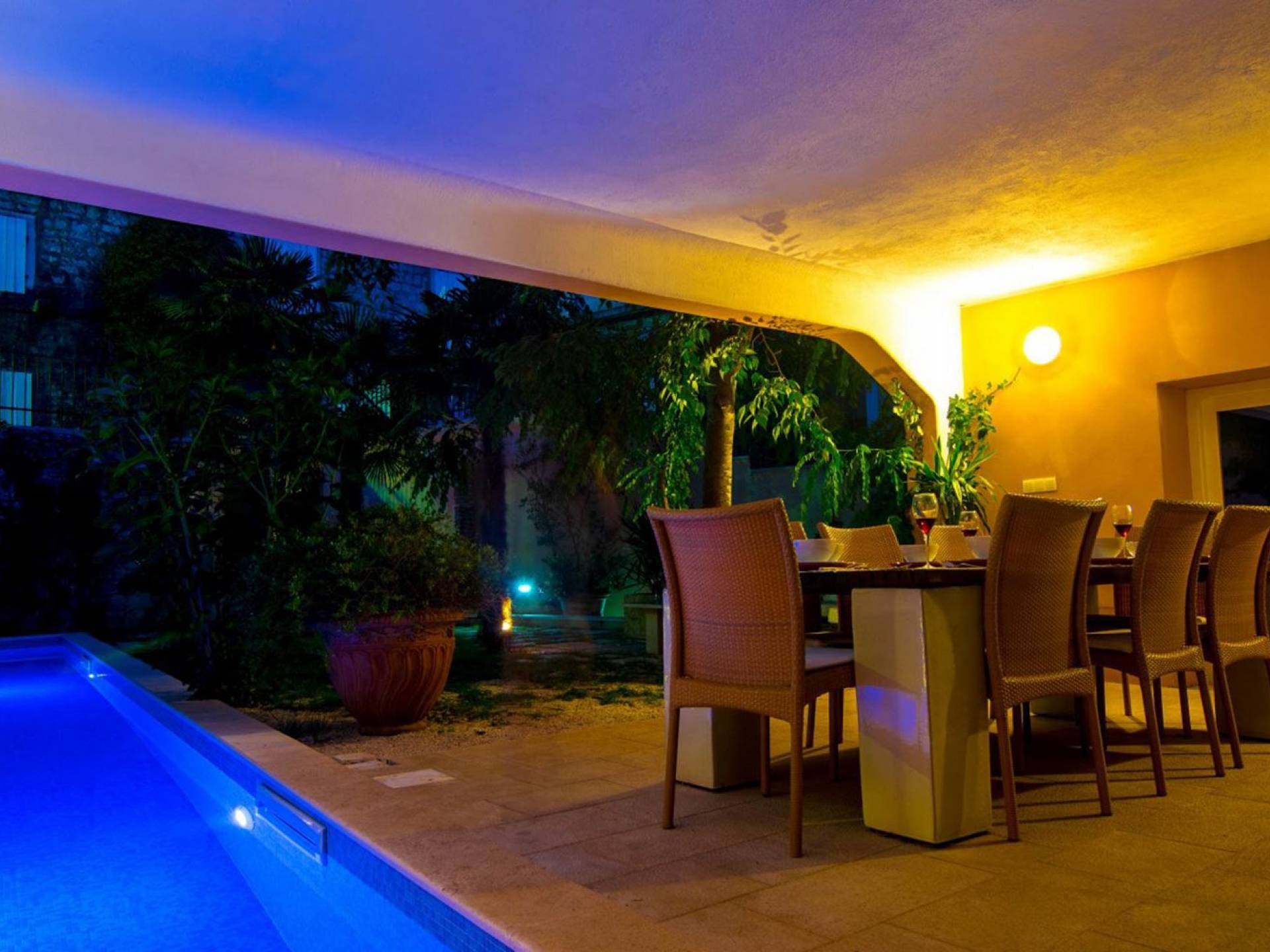 Μια εξωτερική βεράντα είναι επίσης εξοπλισμένη με μεγάλο τραπέζι και καρέκλες, μπάρμπεκιου αερίου, έπιπλα κήπου, ξαπλώστρες, ντους εξωτερικού χώρου. Στο ισόγειο έχει διαμορφωθεί ένα εξαιρετικό ηχοσύστημα, το οποίο είναι υπέροχο αν θέλετε να κάνετε ένα ιδιωτικό πάρτι. Το παλάτι περιβάλλεται από ψηλούς πέτρινους τοίχους, η απόλυτη ιδιωτικότητα είναι εγγυημένη.