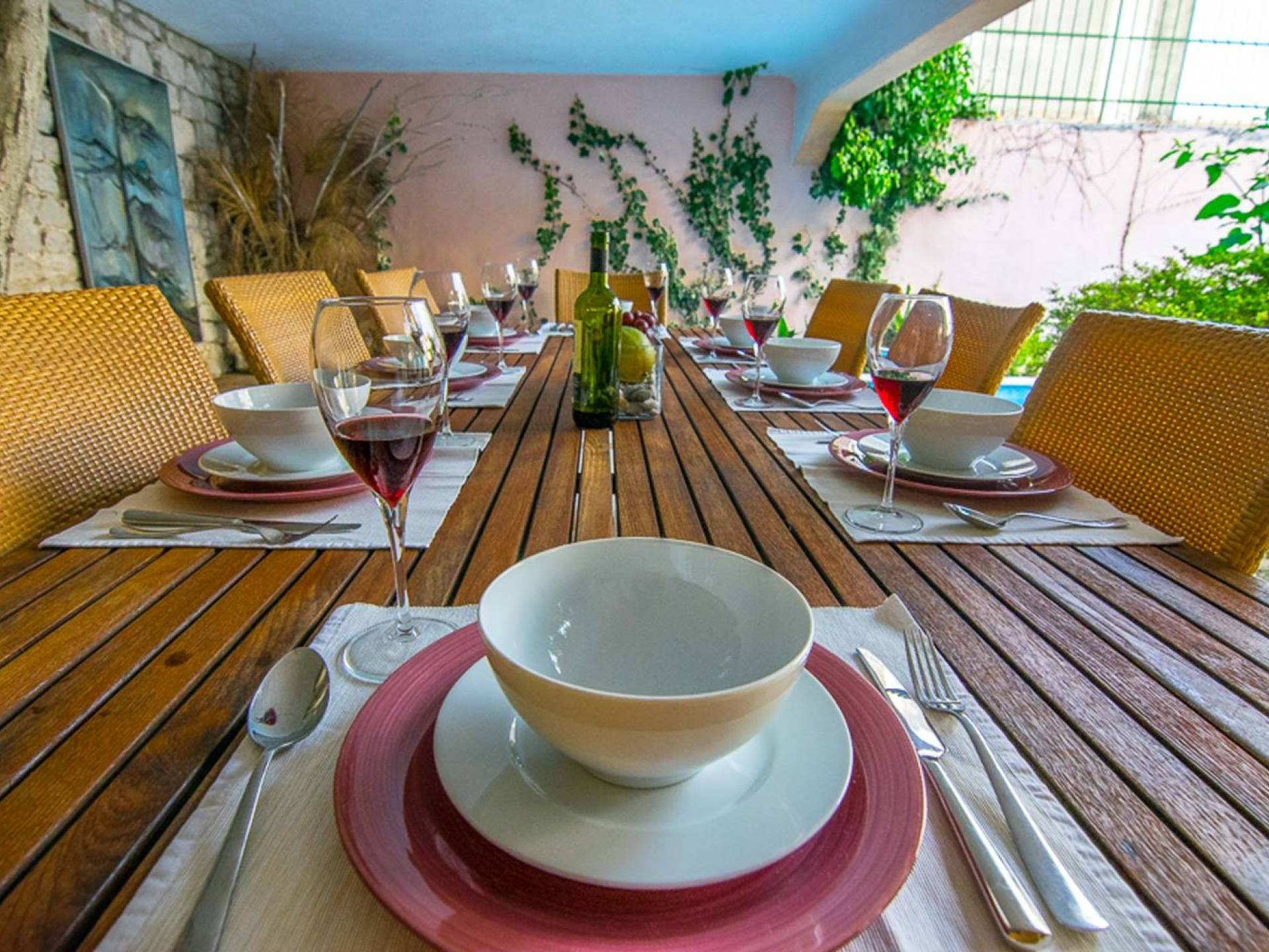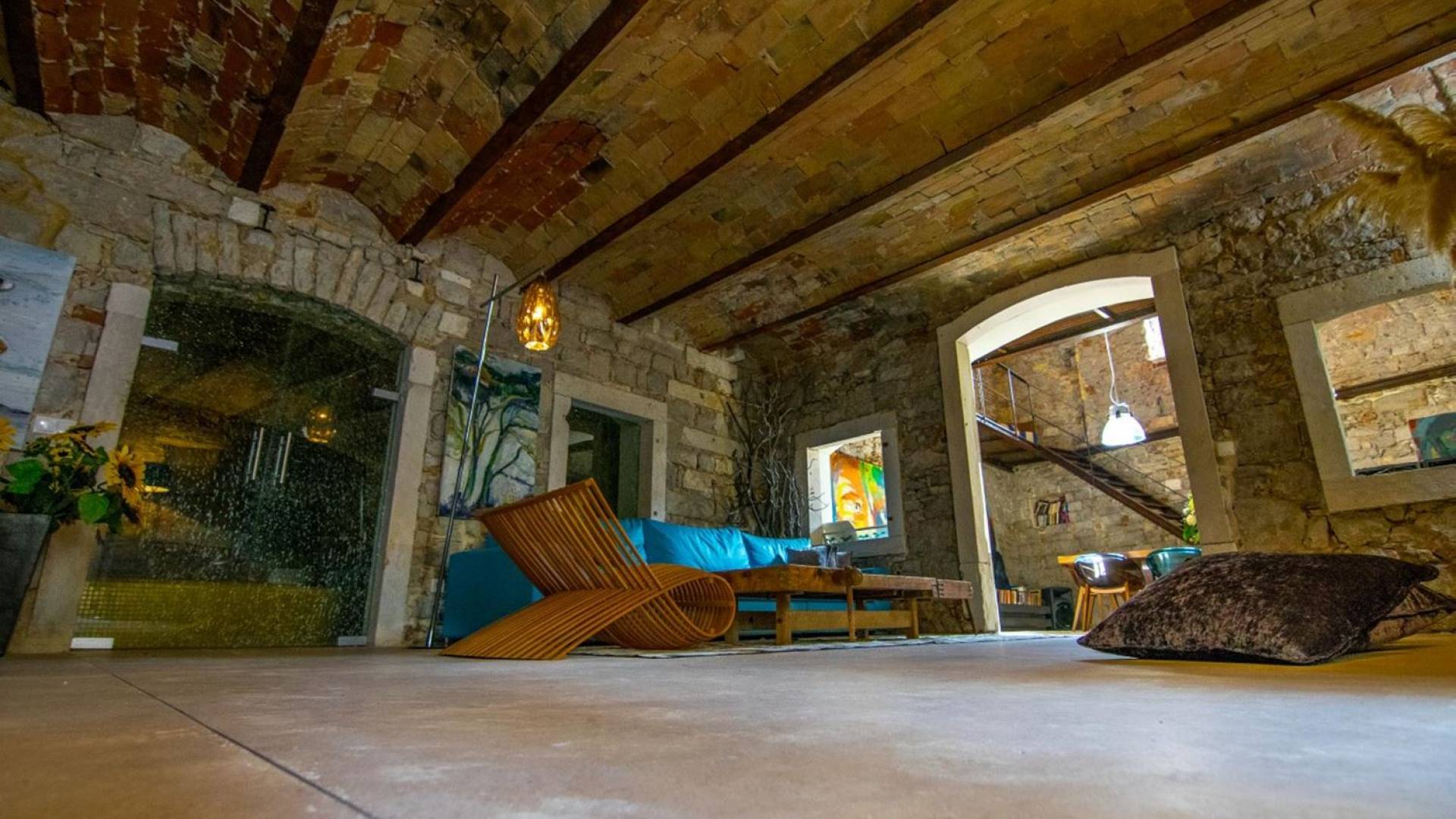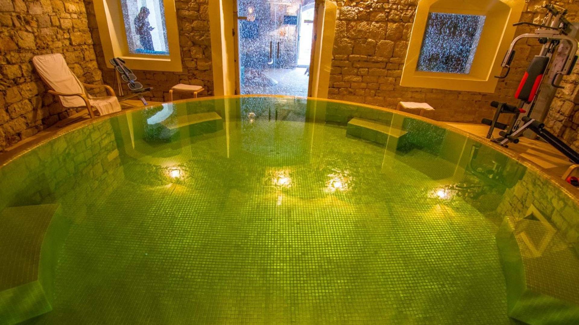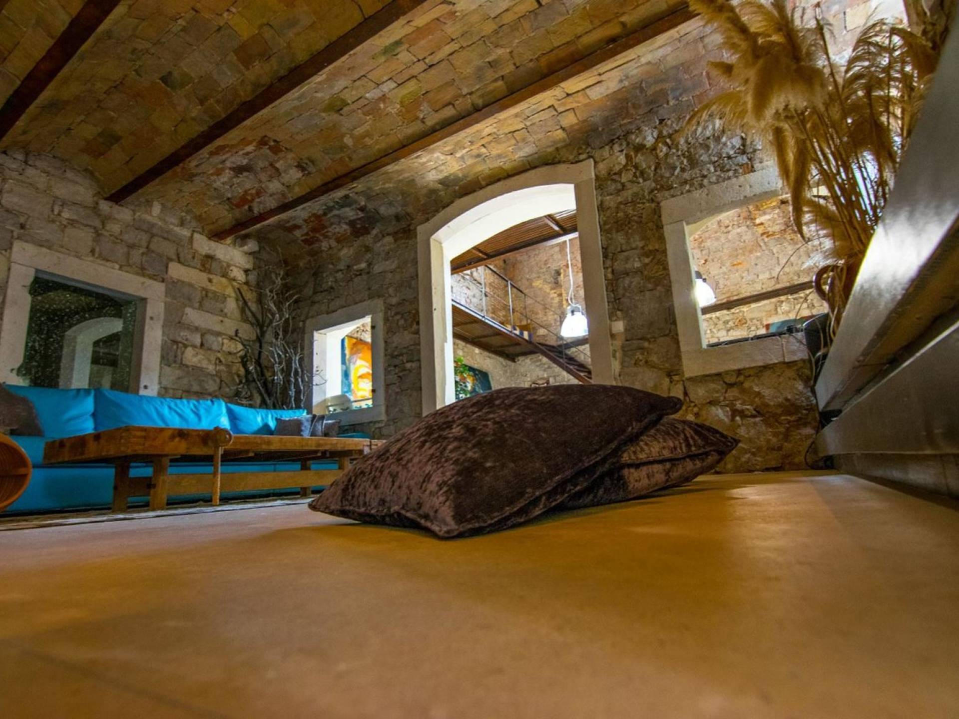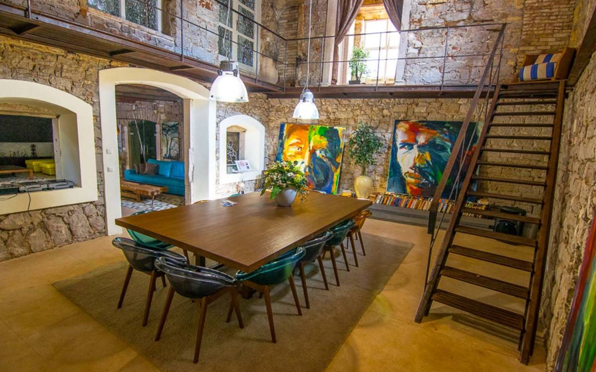 Μια εξωτερική βεράντα είναι επίσης εξοπλισμένη με μεγάλο τραπέζι και καρέκλες, μπάρμπεκιου αερίου, έπιπλα κήπου, ξαπλώστρες, ντους εξωτερικού χώρου. Στο ισόγειο έχει διαμορφωθεί ένα εξαιρετικό ηχοσύστημα, το οποίο είναι υπέροχο αν θέλετε να κάνετε ένα ιδιωτικό πάρτι. Το παλάτι περιβάλλεται από ψηλούς πέτρινους τοίχους, η απόλυτη ιδιωτικότητα είναι εγγυημένη.