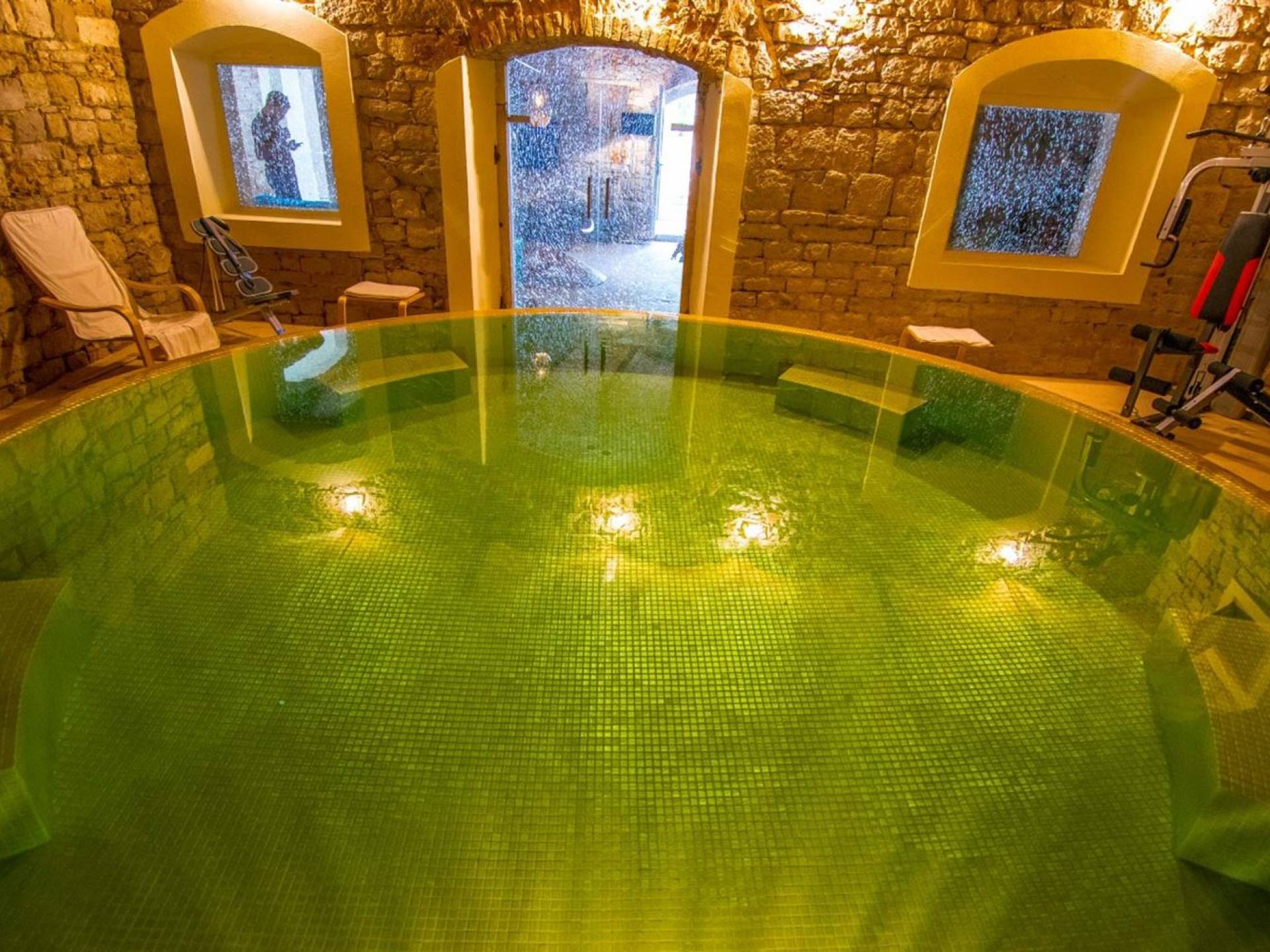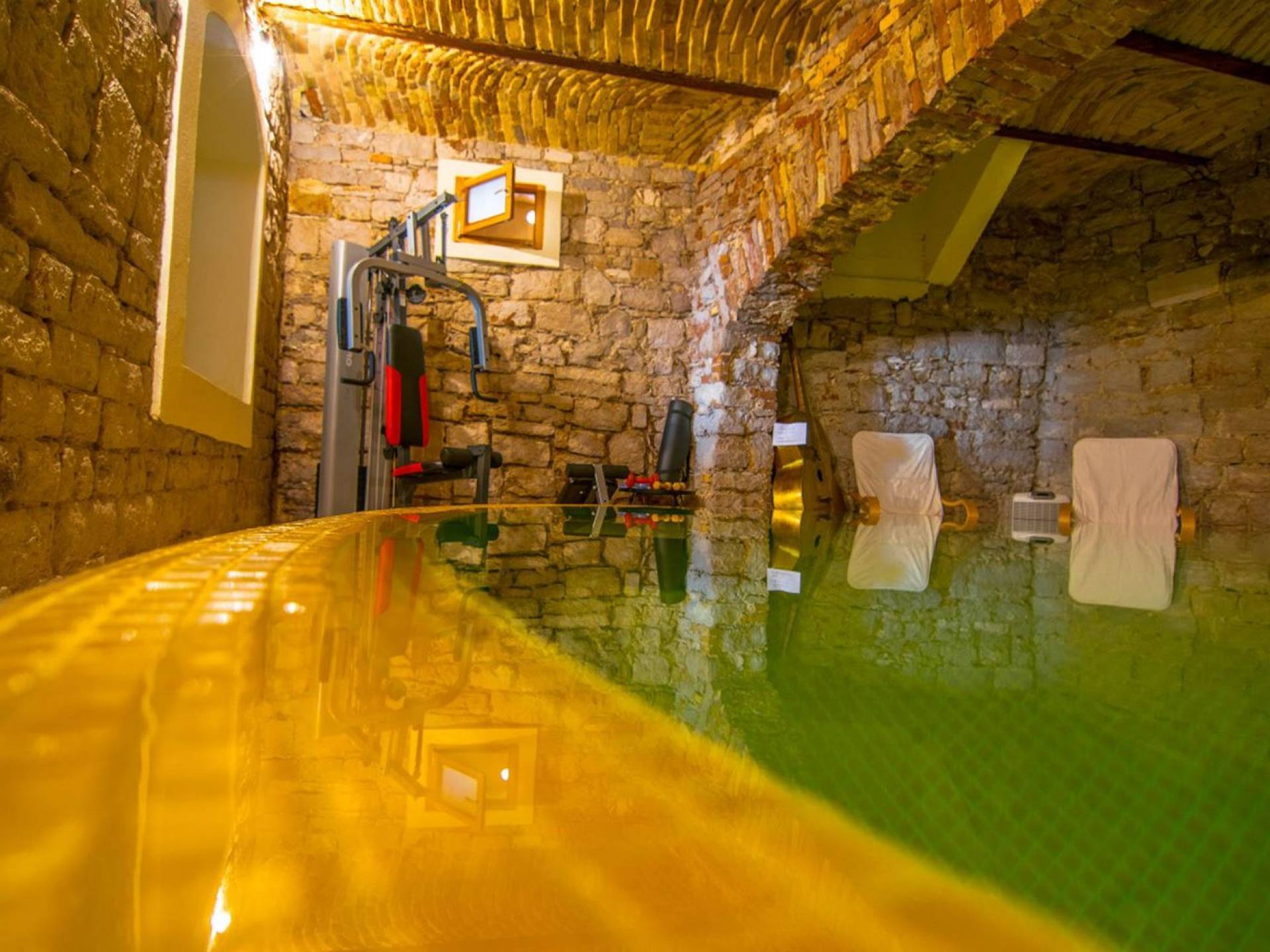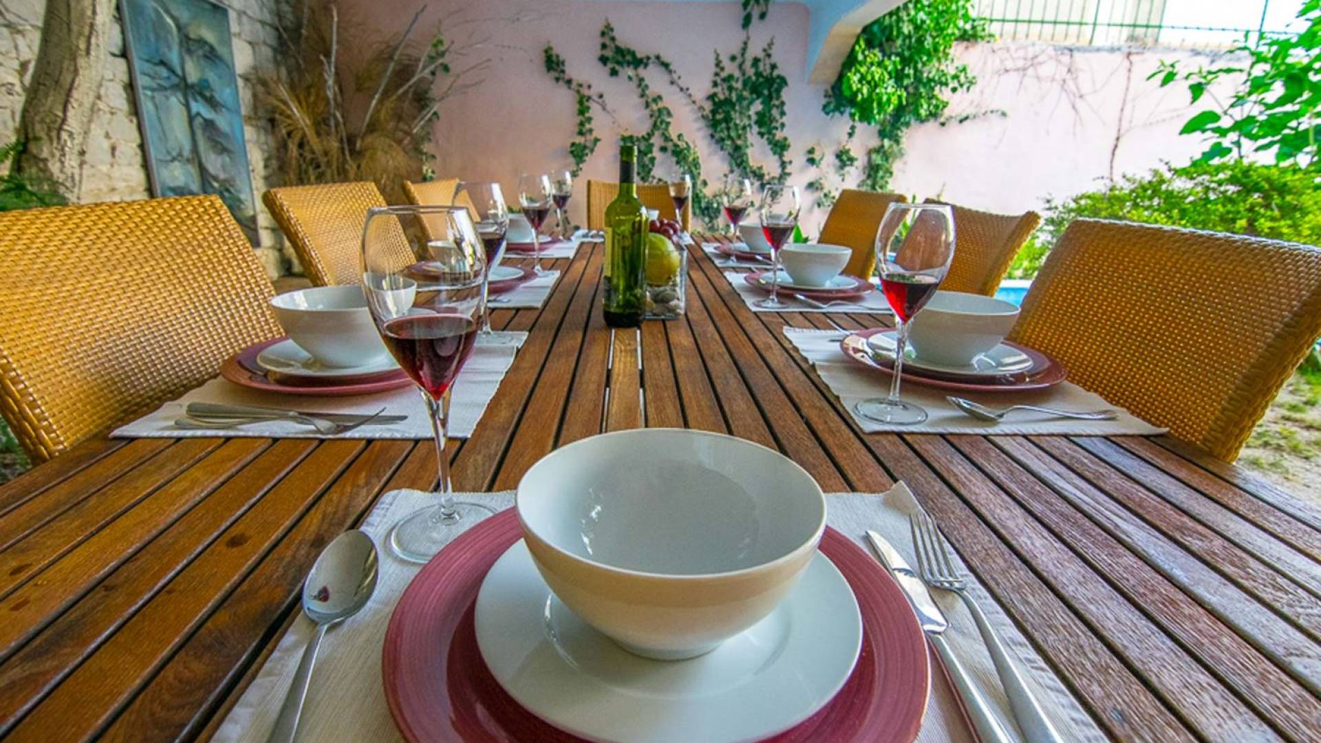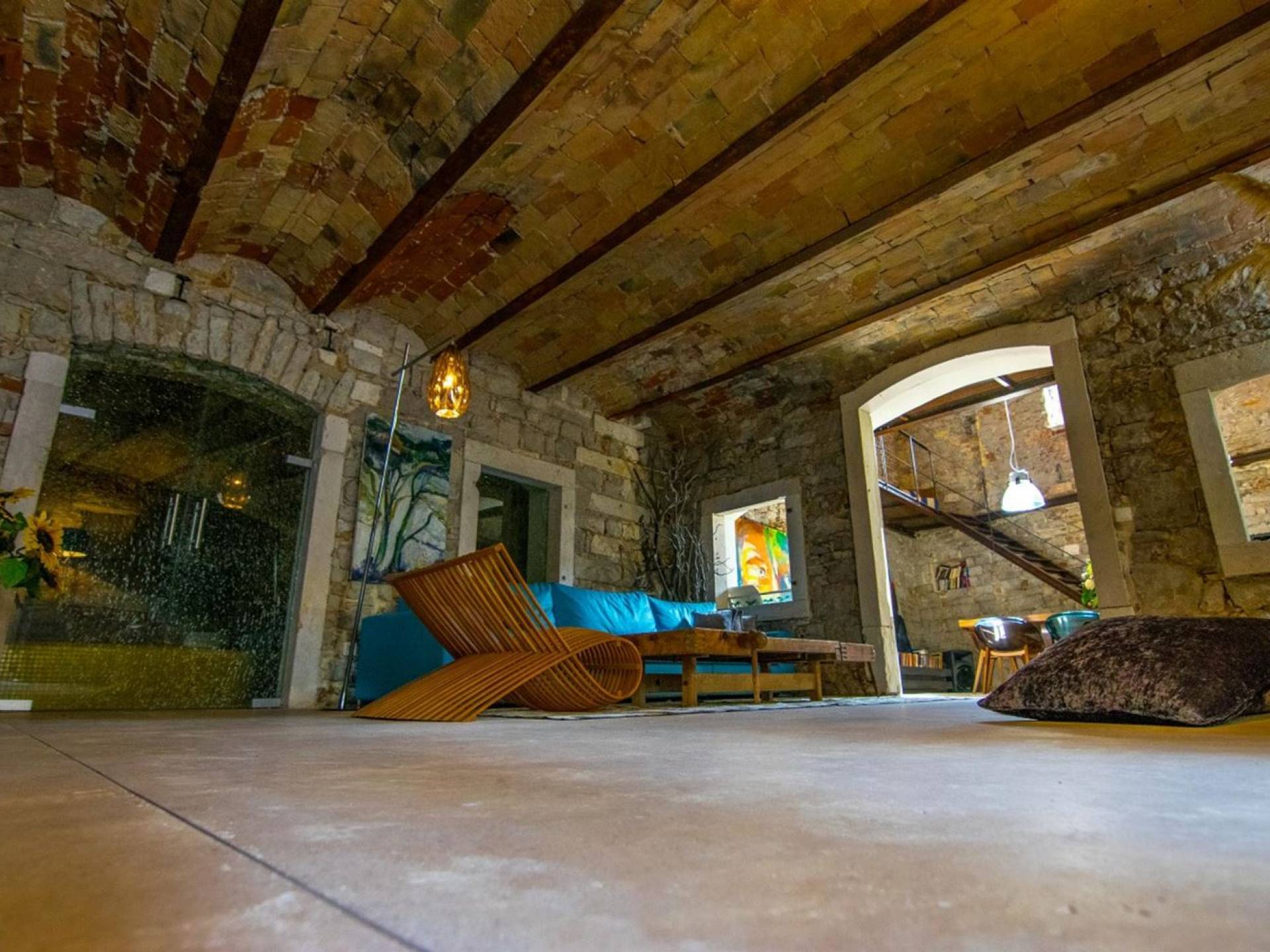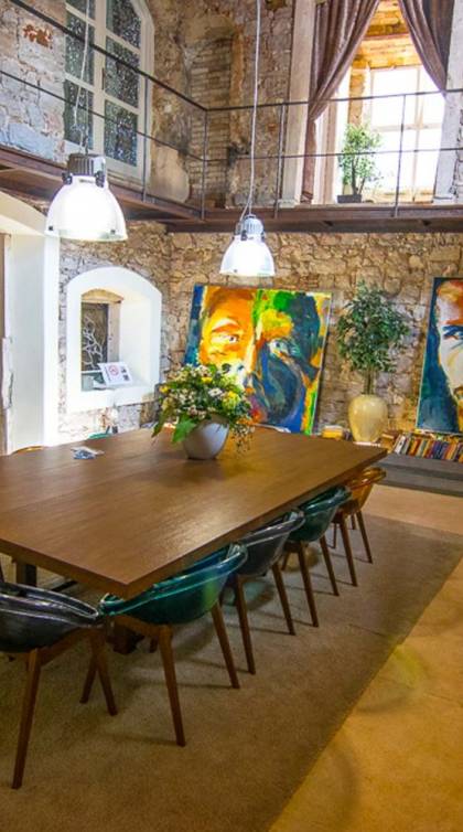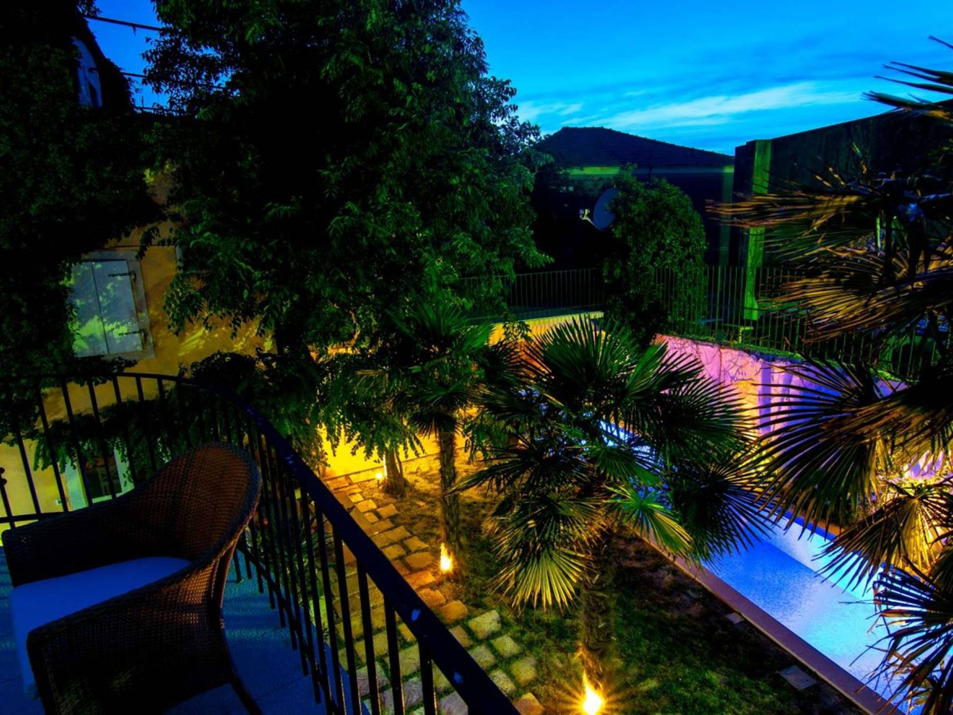 Μια εξωτερική βεράντα είναι επίσης εξοπλισμένη με μεγάλο τραπέζι και καρέκλες, μπάρμπεκιου αερίου, έπιπλα κήπου, ξαπλώστρες, ντους εξωτερικού χώρου. Στο ισόγειο έχει διαμορφωθεί ένα εξαιρετικό ηχοσύστημα, το οποίο είναι υπέροχο αν θέλετε να κάνετε ένα ιδιωτικό πάρτι. Το παλάτι περιβάλλεται από ψηλούς πέτρινους τοίχους, η απόλυτη ιδιωτικότητα είναι εγγυημένη.