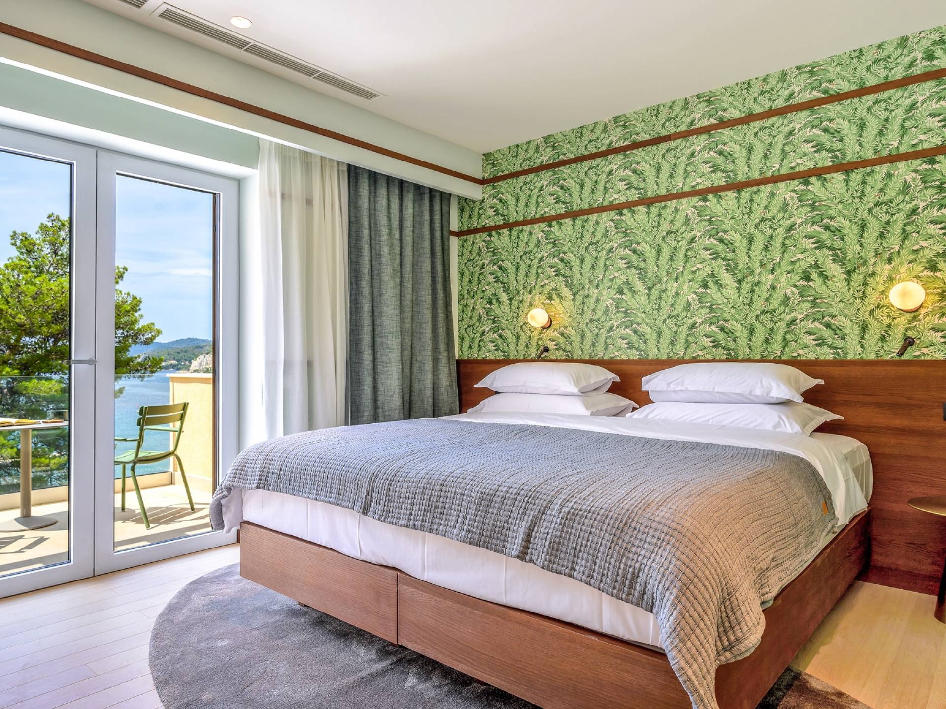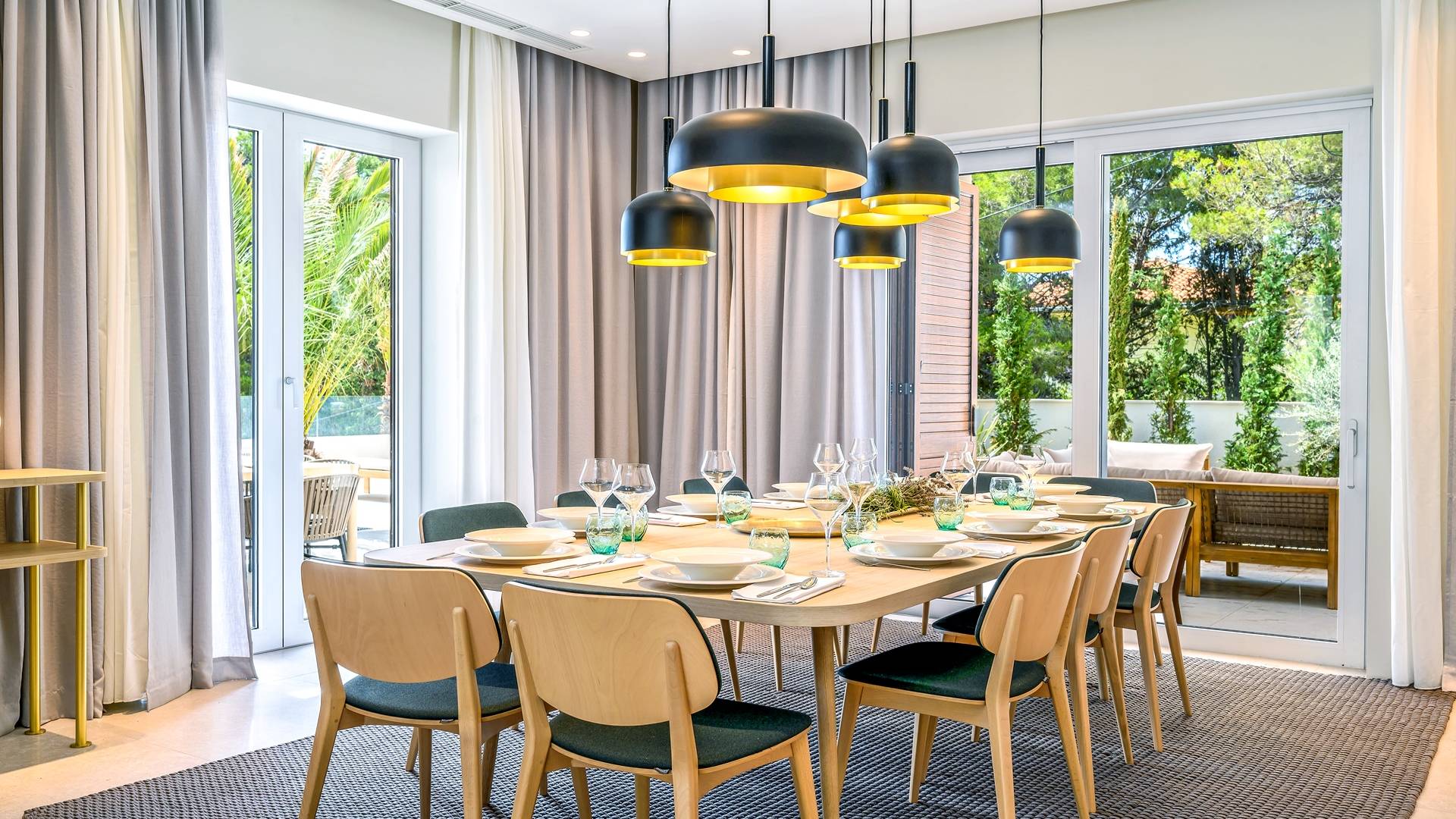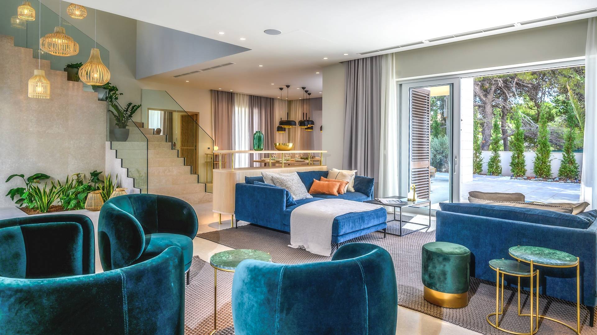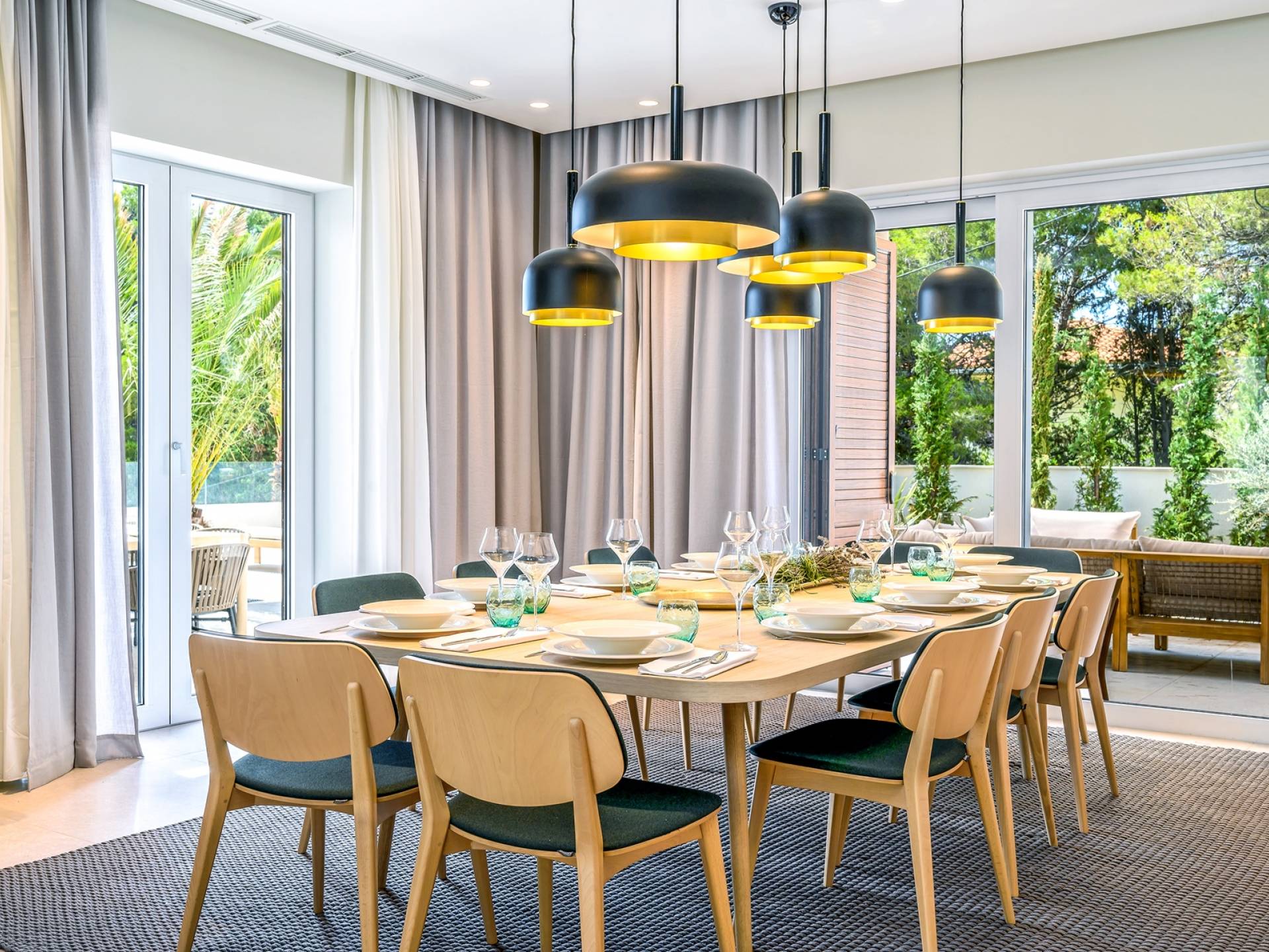 Από το χαλί στην ταπετσαρία, από τις κουρτίνες στα έπιπλα επώνυμων σχεδιαστών: τα πέντε υπνοδωμάτια με συντονισμένα φυτικά μοτίβα περιέχουν μόνο την υψηλότερη ποιότητα και την πιο προσεκτικά επιλεγμένη εσωτερική διακόσμηση σε δύο ορόφους. Το ισόγειο της εξοχικής κατοικίας στη νότια Δαλματία που φιλοξενεί 10 άτομα διαθέτει ευρύχωρο σαλόνι και τραπεζαρία, επαγγελματικά εξοπλισμένη κουζίνα καθώς και τουαλέτα επισκεπτών και ένα υπνοδωμάτιο με ιδιωτικό μπάνιο.