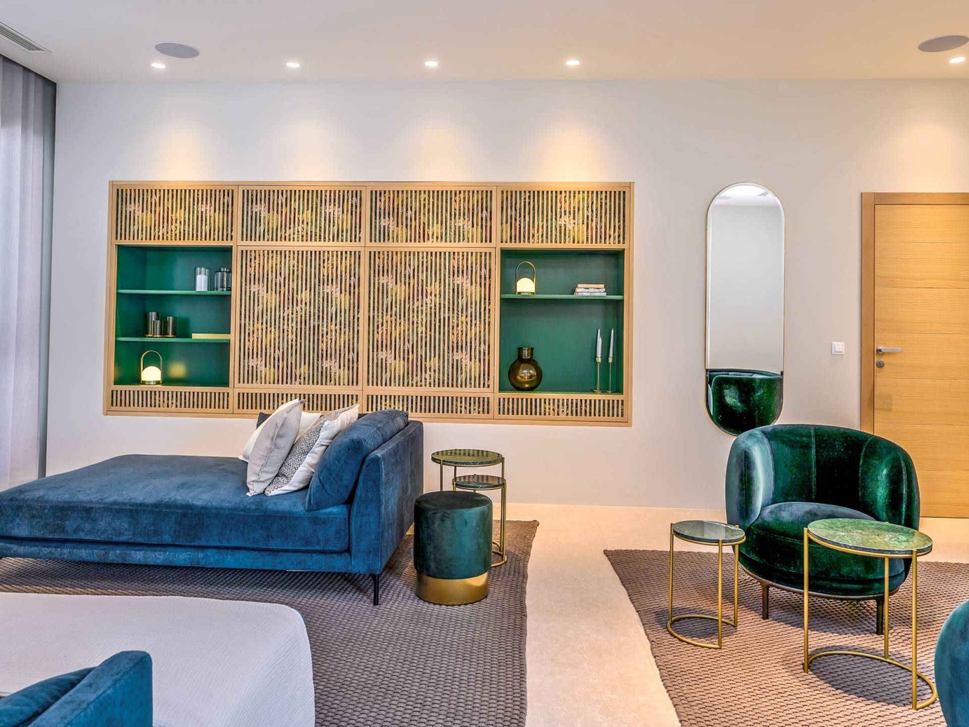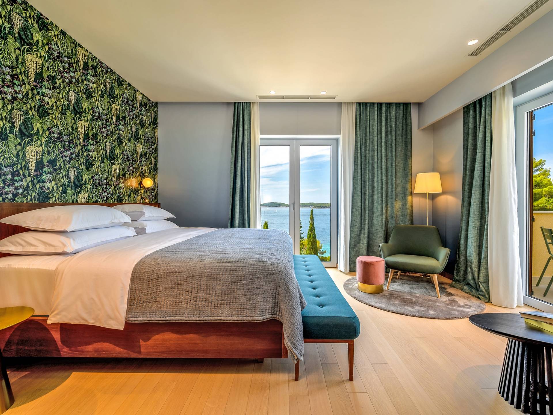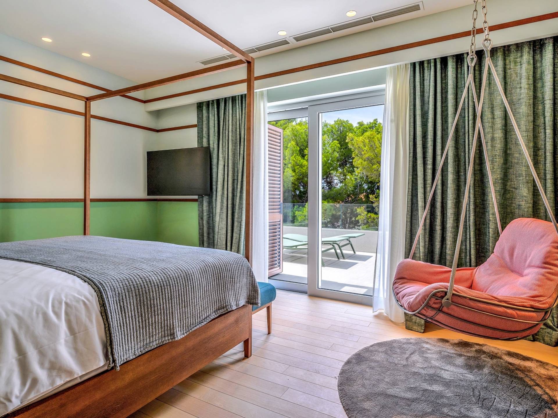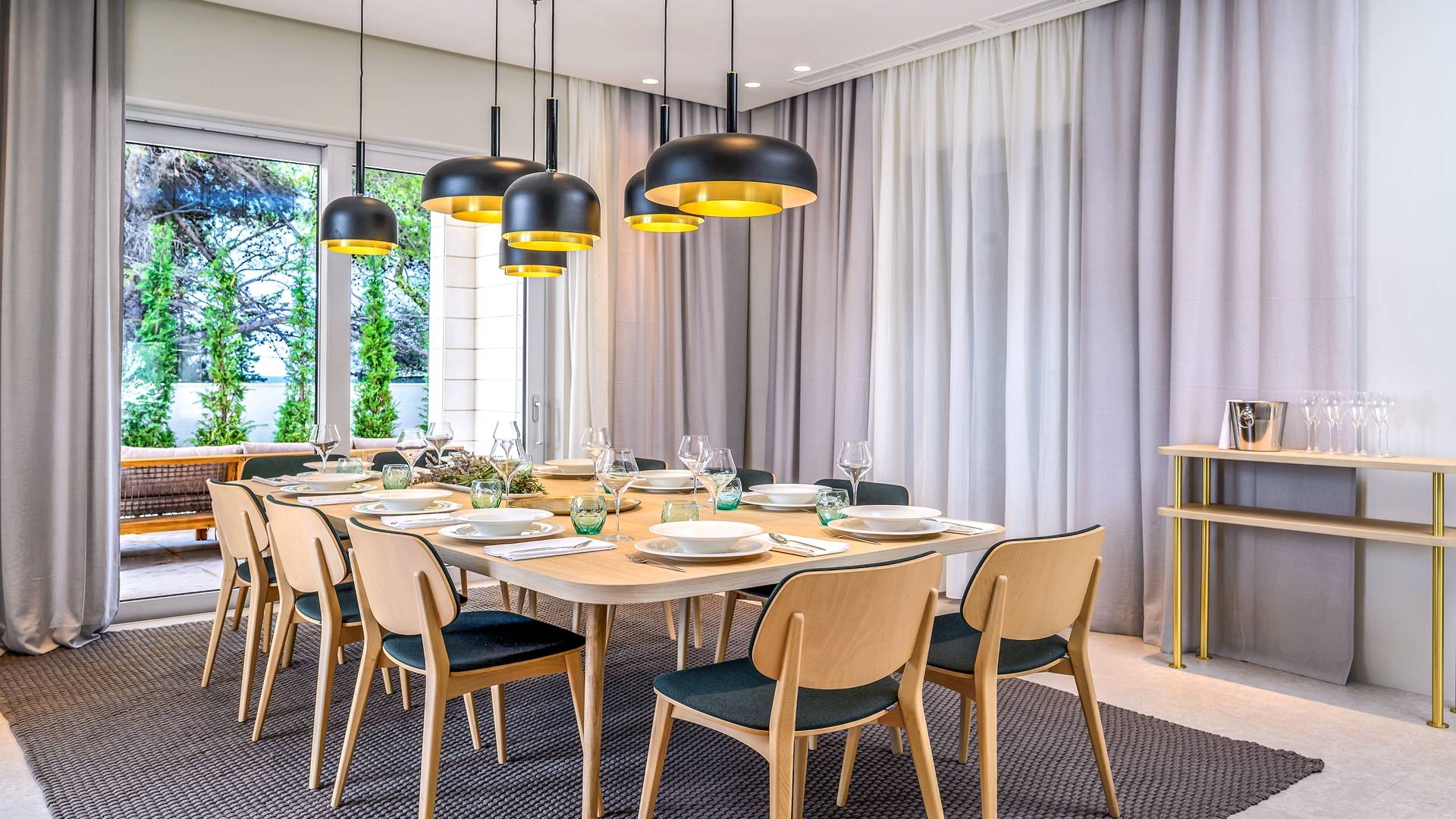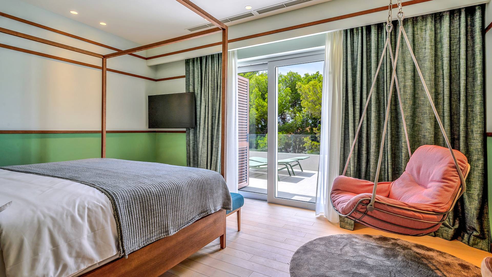 Από το χαλί στην ταπετσαρία, από τις κουρτίνες στα έπιπλα επώνυμων σχεδιαστών: τα πέντε υπνοδωμάτια με συντονισμένα φυτικά μοτίβα περιέχουν μόνο την υψηλότερη ποιότητα και την πιο προσεκτικά επιλεγμένη εσωτερική διακόσμηση σε δύο ορόφους. Το ισόγειο της εξοχικής κατοικίας στη νότια Δαλματία που φιλοξενεί 10 άτομα διαθέτει ευρύχωρο σαλόνι και τραπεζαρία, επαγγελματικά εξοπλισμένη κουζίνα καθώς και τουαλέτα επισκεπτών και ένα υπνοδωμάτιο με ιδιωτικό μπάνιο.