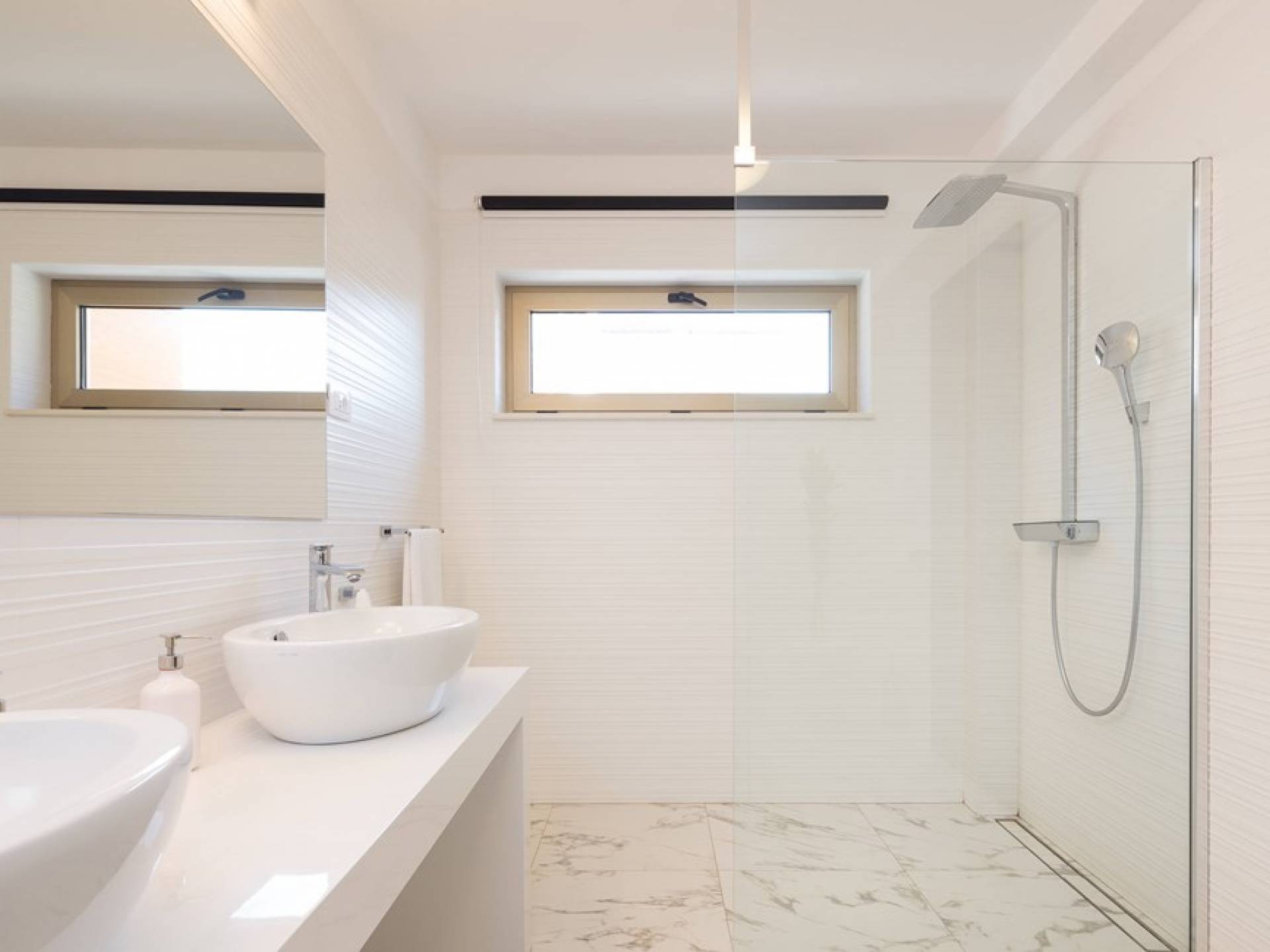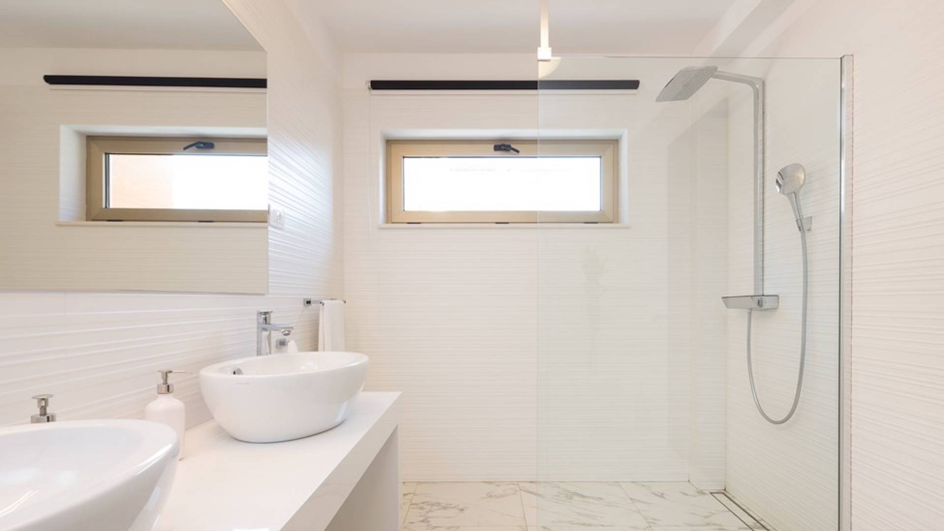 Στο κυρίως σπίτι, στον πρώτο όροφο, υπάρχουν 4 δίκλινα υπνοδωμάτια. Κάθε υπνοδωμάτιο είναι κλιματιζόμενο με δικό του μπάνιο. Τρία υπνοδωμάτια έχουν θέα στη θάλασσα. Στο ισόγειο της βίλας, υπάρχει ένα άνετο σαλόνι με τραπεζαρία και μια πλήρως εξοπλισμένη κουζίνα. Το μπάνιο των επισκεπτών με τουαλέτα και ντους βρίσκεται στο ισόγειο.
