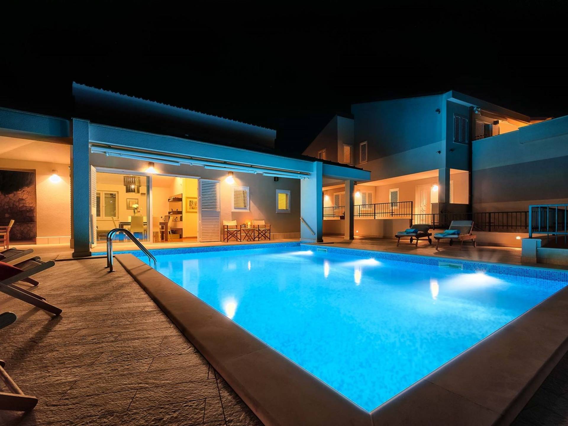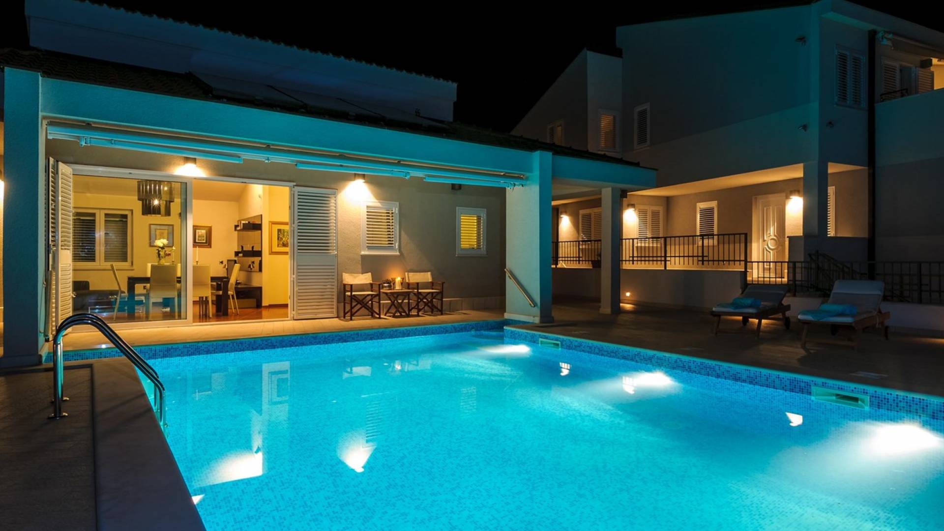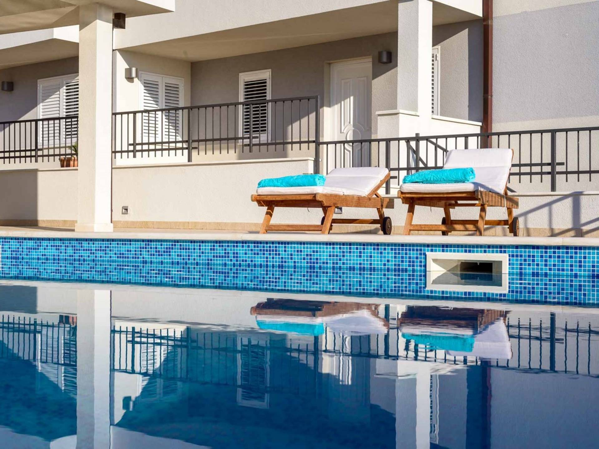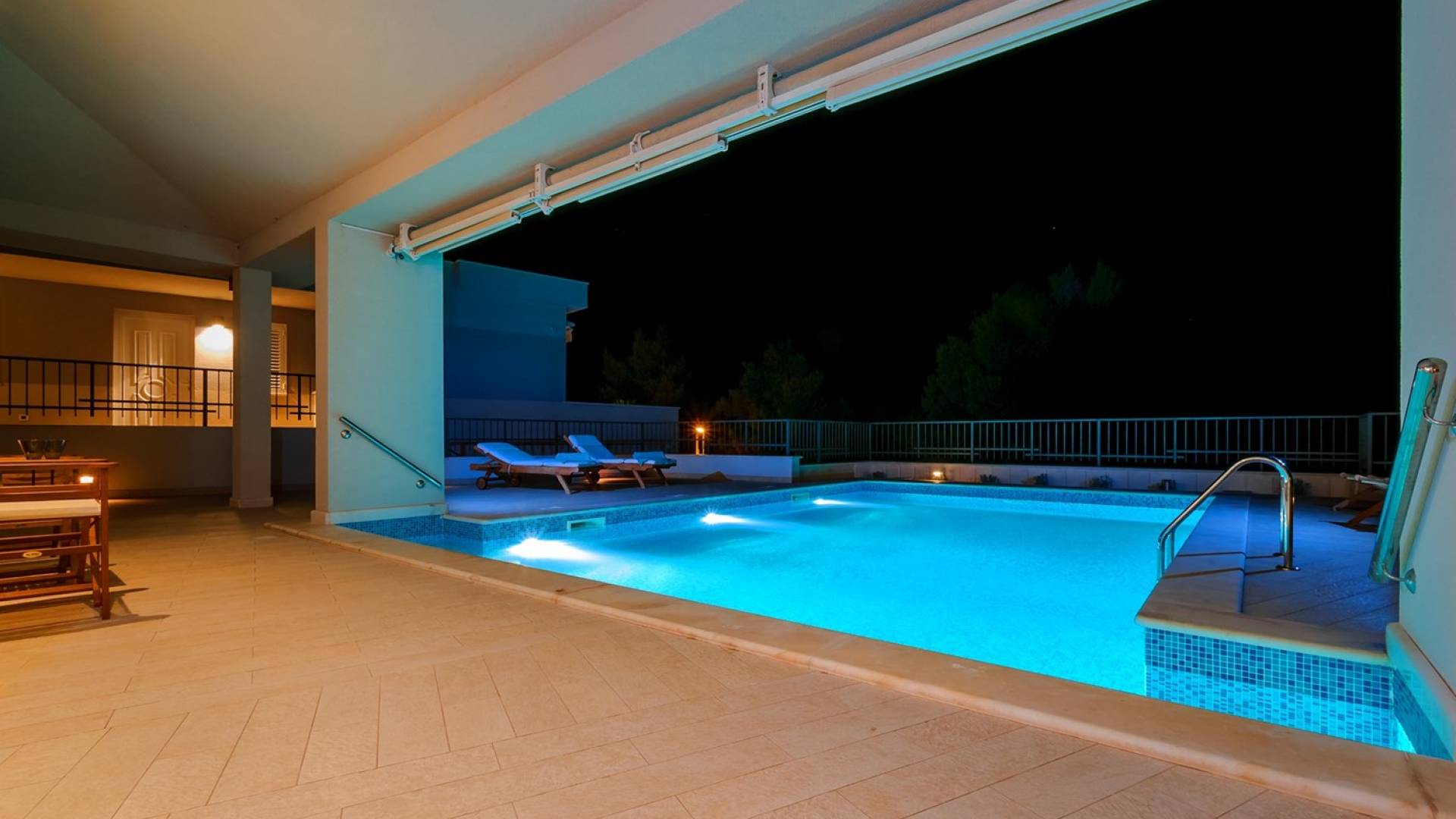 Ο εξωτερικός χώρος είναι όμορφα διαρρυθμισμένος με πολλά έπιπλα εξωτερικού χώρου στις μεγάλες βεράντες για να αξιοποιήσετε στο έπακρο την απίστευτη θέα στη θάλασσα. Η πισίνα (50 m²) περιβάλλεται από πολλές ξαπλώστρες. Κάτω από τη σκεπαστή βεράντα υπάρχουν επιπλέον ξύλινα έπιπλα εξωτερικού χώρου. Ένα μικρότερο εξοχικό έχει σαλόνι και όμορφη και μοντέρνα κουζίνα, καλά εξοπλισμένη με ηλεκτρική κουζίνα, φούρνο, απορροφητήρα, ψυγείο, καταψύκτη, φούρνο μικροκυμάτων, βραστήρα, καφετιέρα, μπλέντερ και τοστιέρα. Ο χώρος της πισίνας μπορεί να φωτίζεται τη νύχτα για να επιτρέψει στους επισκέπτες να περάσουν στο έπακρο τα ζεστά βράδια έξω. Καλής ποιότητας πέτρινες βεράντες περιβάλλουν τη βίλα και οδηγούν από τα διαμερίσματα στον χώρο της πισίνας. Το Villa Primosten Palace θα κάνει τις διακοπές σας αξέχαστες...