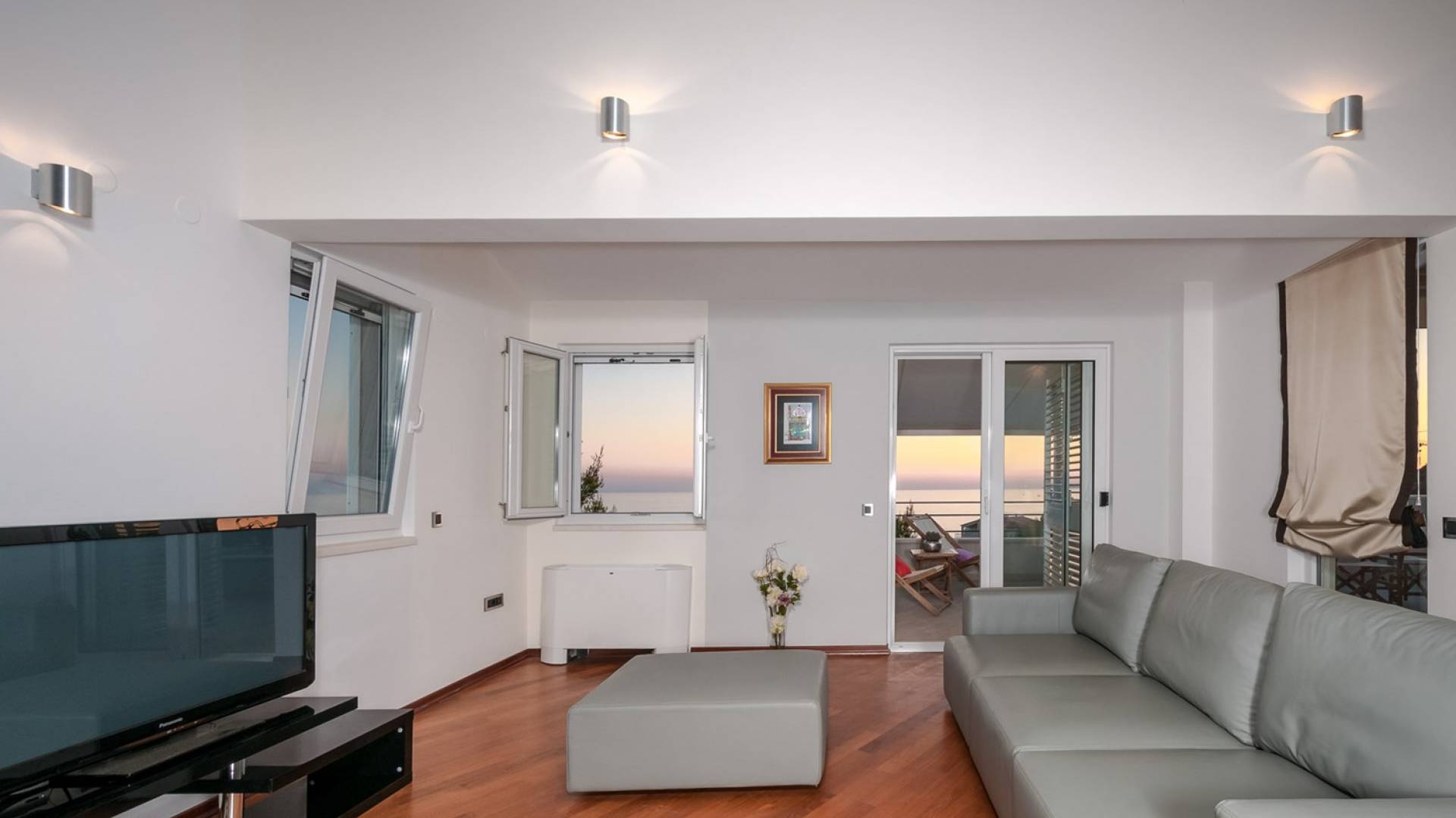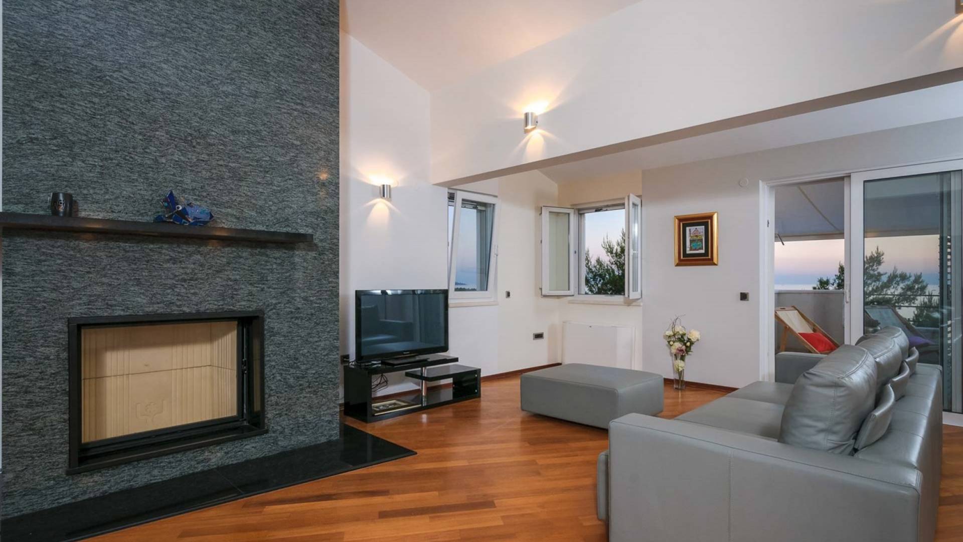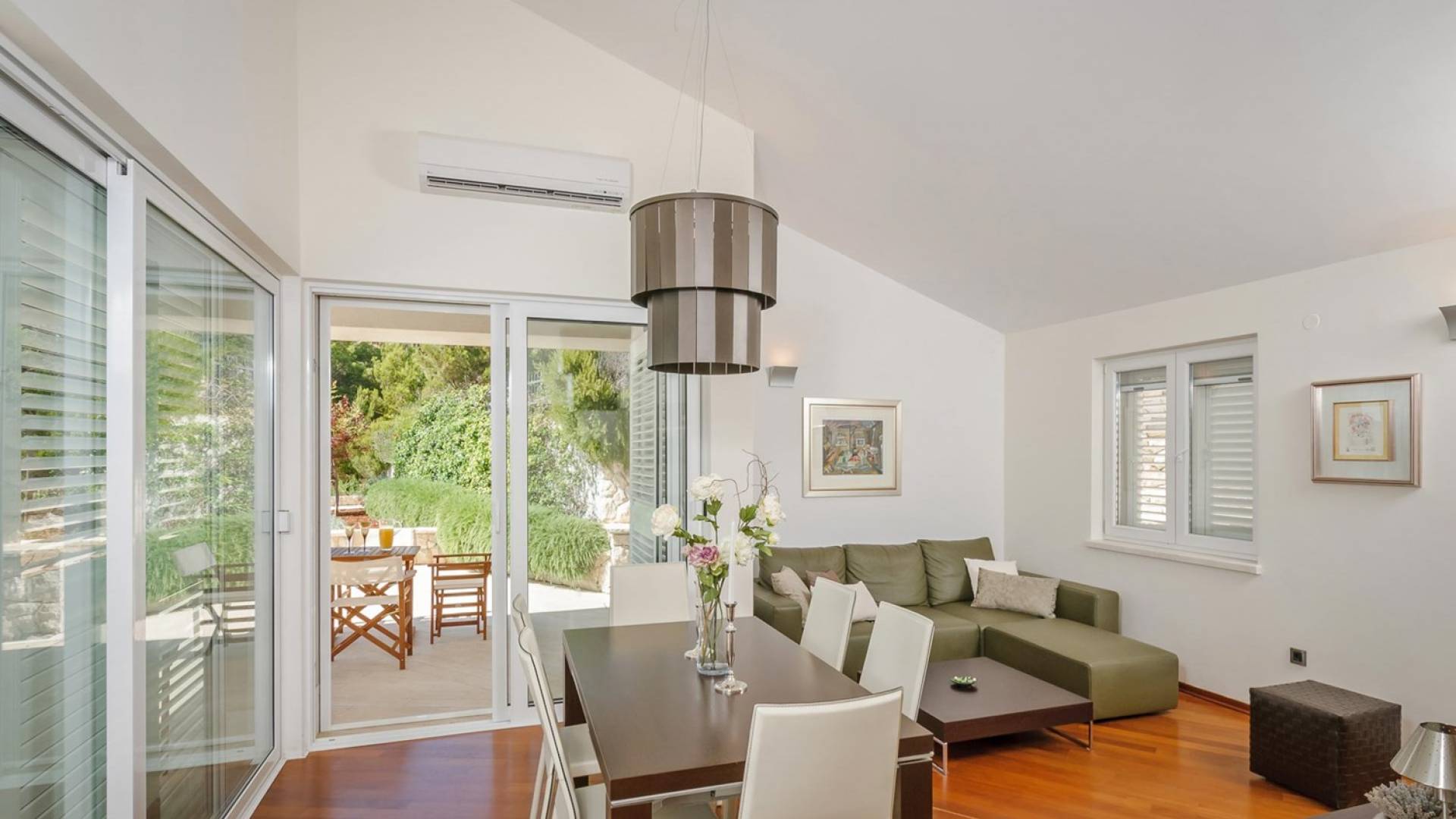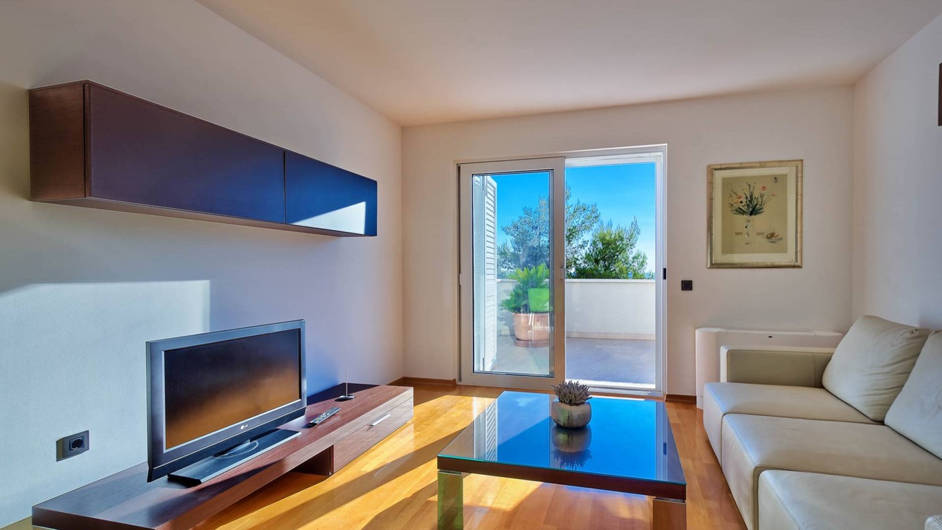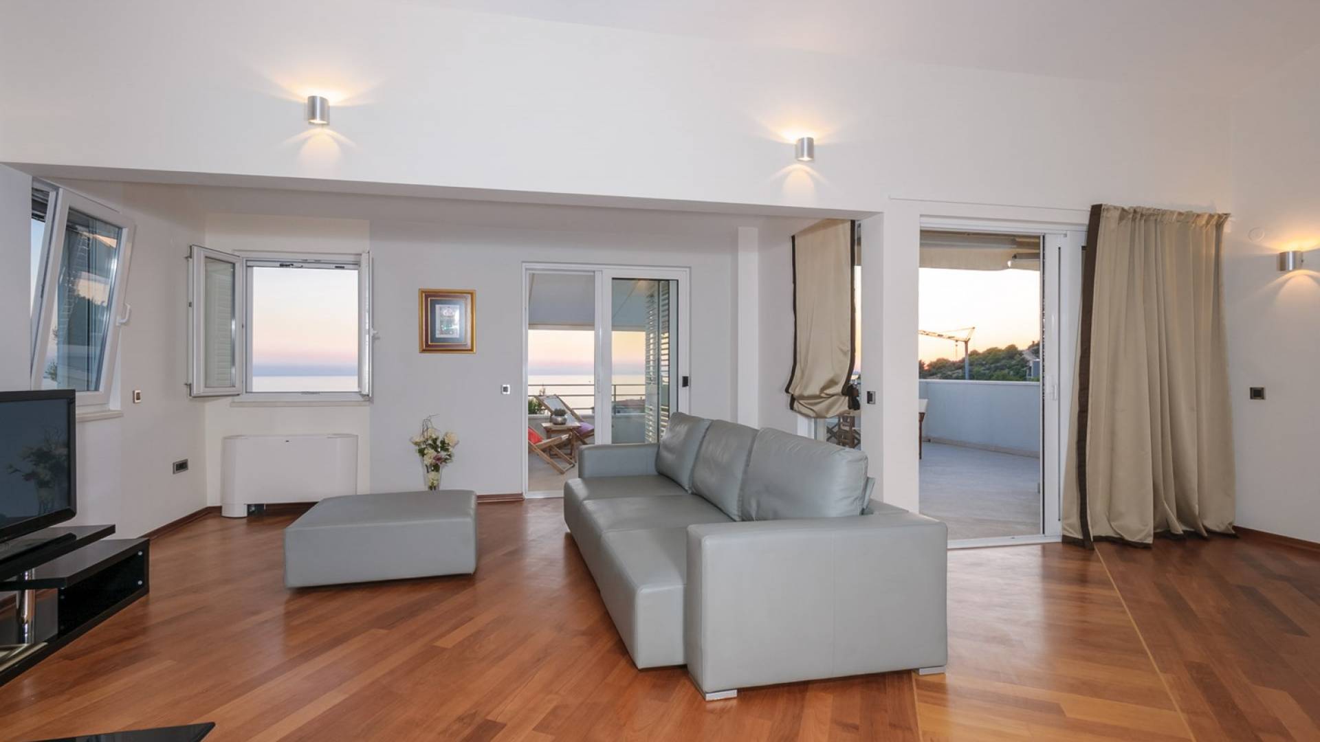 Η βίλα διαθέτει 7 υπνοδωμάτια, 5 μπάνια και μια επιπλέον τουαλέτα. Το κτίριο κατοικιών αποτελείται από 3 πλήρως επιπλωμένα διαμερίσματα. Στον πρώτο όροφο, υπάρχουν 2 πολύ παρόμοια διαμερίσματα το καθένα με 2 υπνοδωμάτια, κουζίνα, τραπεζαρία, μπάνιο με ντουζιέρα και καθιστικό με βεράντες. Οι βεράντες είναι εξοπλισμένες με έπιπλα καθιστικού όπου μπορείτε να απολαύσετε τον πρωινό καφέ. Στον δεύτερο όροφο, υπάρχει ένα άλλο πολυτελές διαμέρισμα με 3 υπνοδωμάτια, δύο υπνοδωμάτια έχουν διπλά κρεβάτια και το τρίτο δωμάτιο έχει κουκέτες. Το διαμέρισμα διαθέτει επίσης πλήρως εξοπλισμένη κουζίνα, μοντέρνο σαλόνι με τζάκι, μπάνιο με ντους μασάζ, μπάνιο με μπανιέρα τζακούζι και βεράντα με έπιπλα κήπου και ωραία θέα στη θάλασσα.