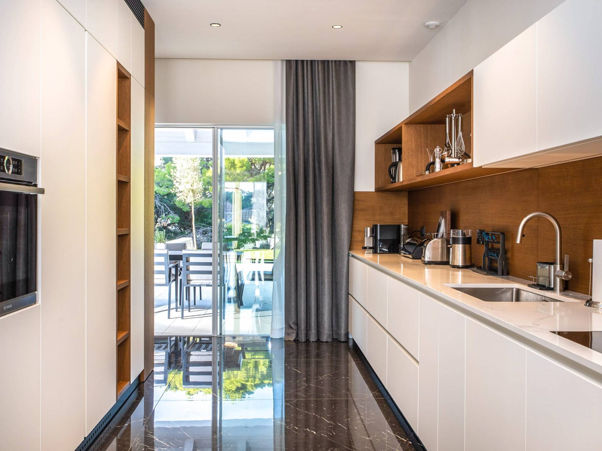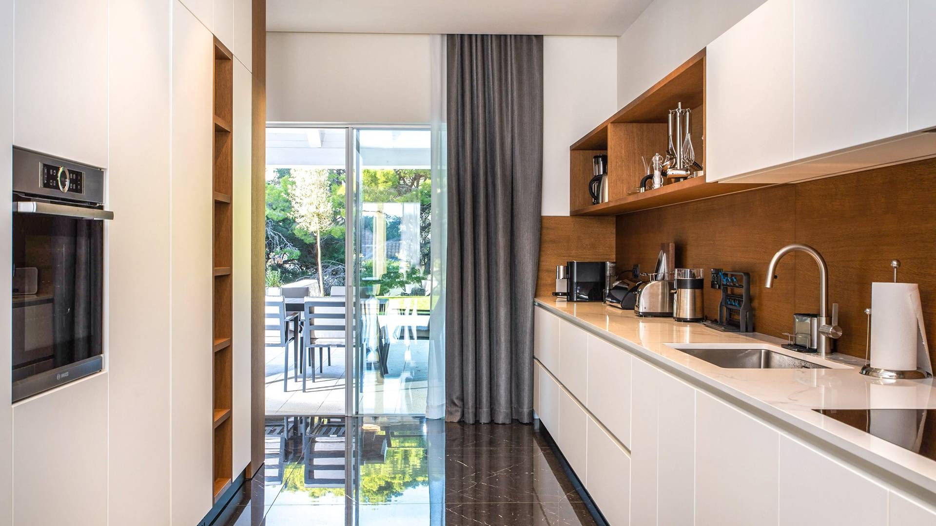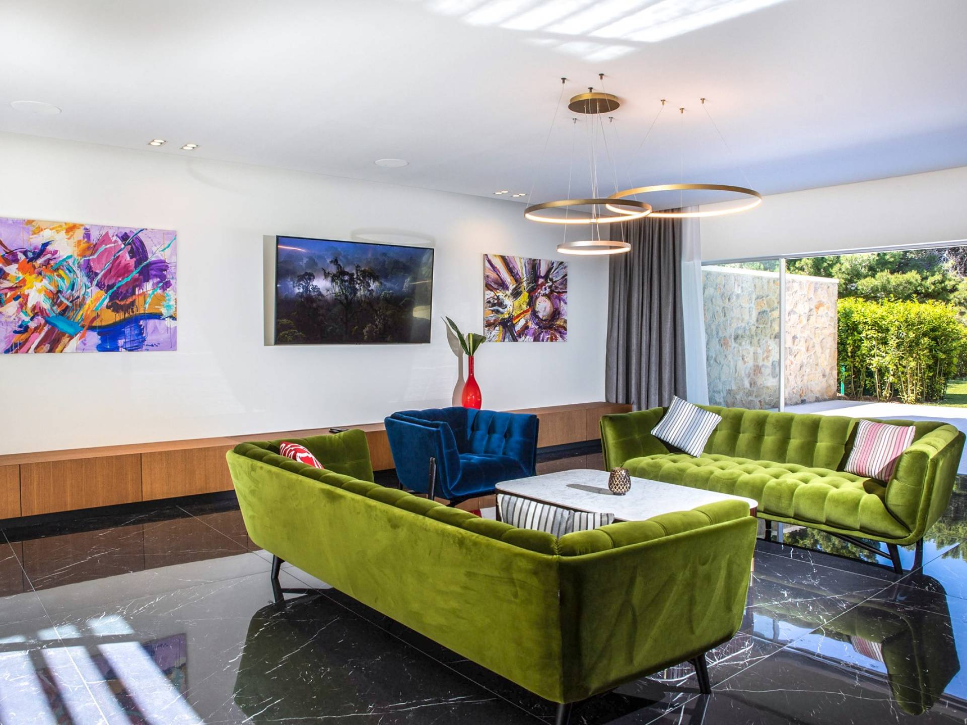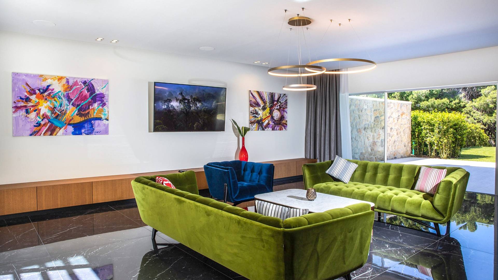 Το ισόγειο της πολυτελούς Villa Hera χωρίζεται από τη βεράντα με έναν συρόμενο γυάλινο τοίχο που επιτρέπει επαρκή ποσότητα φωτός ημέρας. Αποτελείται από ένα σχεδιαστικό σαλόνι με κομψούς καναπέδες και δορυφορική τηλεόραση. Στη συνέχεια, η ανοιχτή ιδέα συνδυάζει μια πλήρως εξοπλισμένη μοντέρνα κουζίνα με μινιμαλιστικό σχεδιασμό και γοητευτικό φαγητό. Από το κεντρικό ισόγειο - το πρώτο μέρος του ορόφου, μπορείτε επίσης να πάρετε τις σκάλες στο κάτω ισόγειο της βίλας που είναι πλήρως εξοπλισμένο για χαλάρωση. Υπάρχει κελάρι κρασιού, σάουνα και ατμόλουτρο. Το ισόγειο και ο πρώτος όροφος της βίλας χωρίζονται από το ισόγειο με εσωτερικές σκάλες. Υπάρχουν 4 πολυτελή υπνοδωμάτια με κρεβάτια king size και ιδιωτικό μπάνιο.