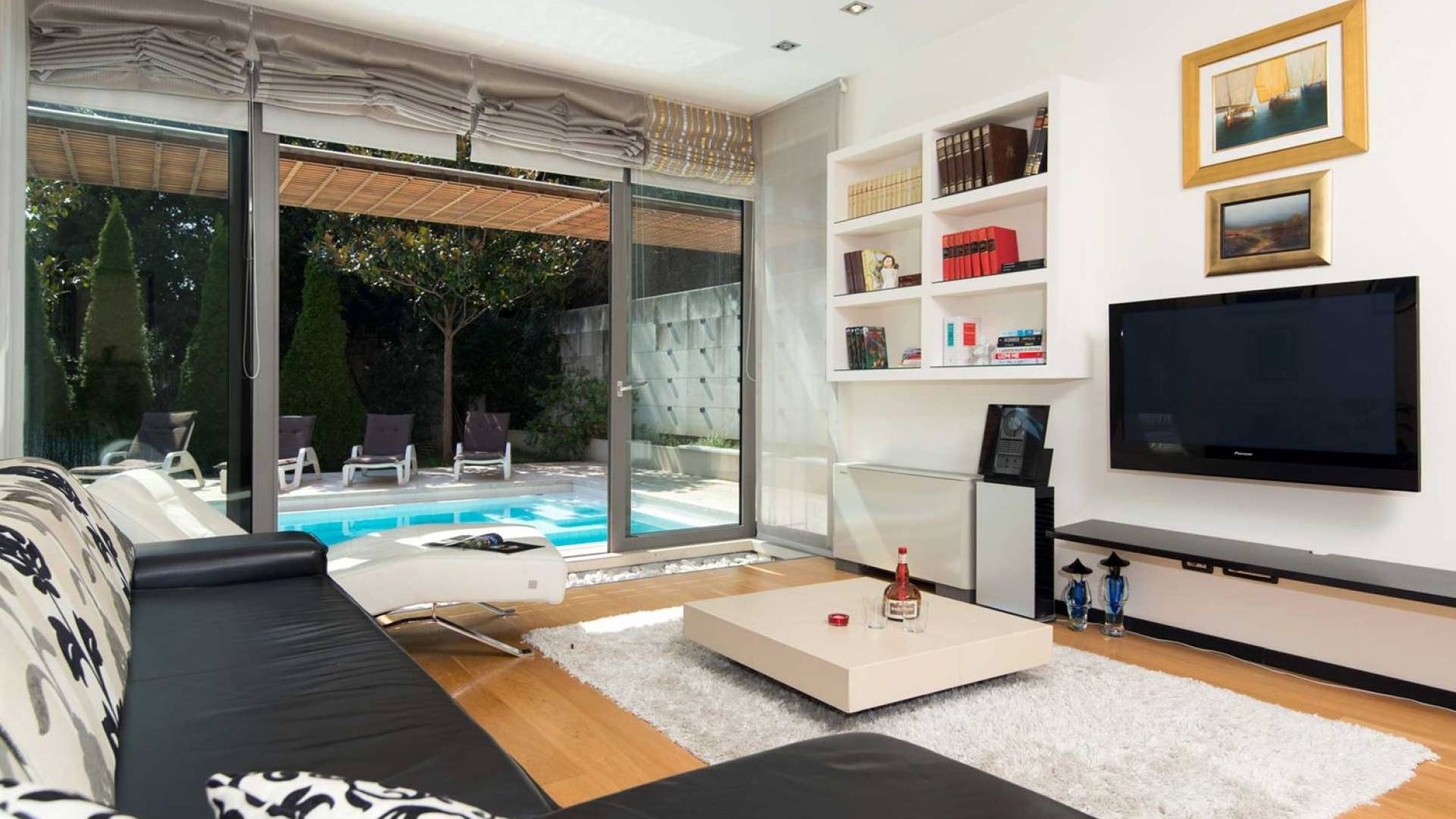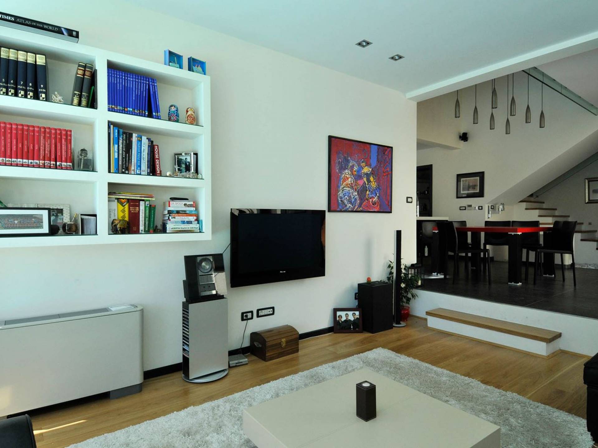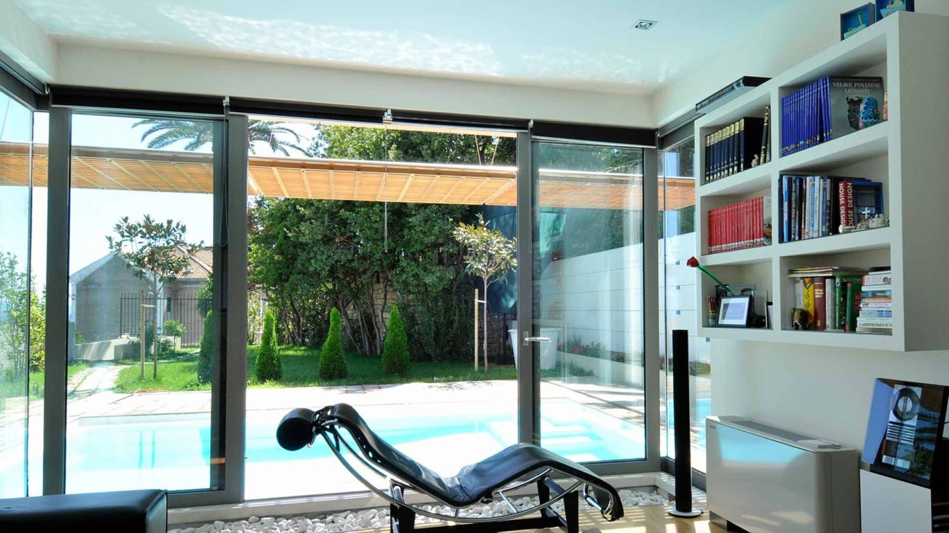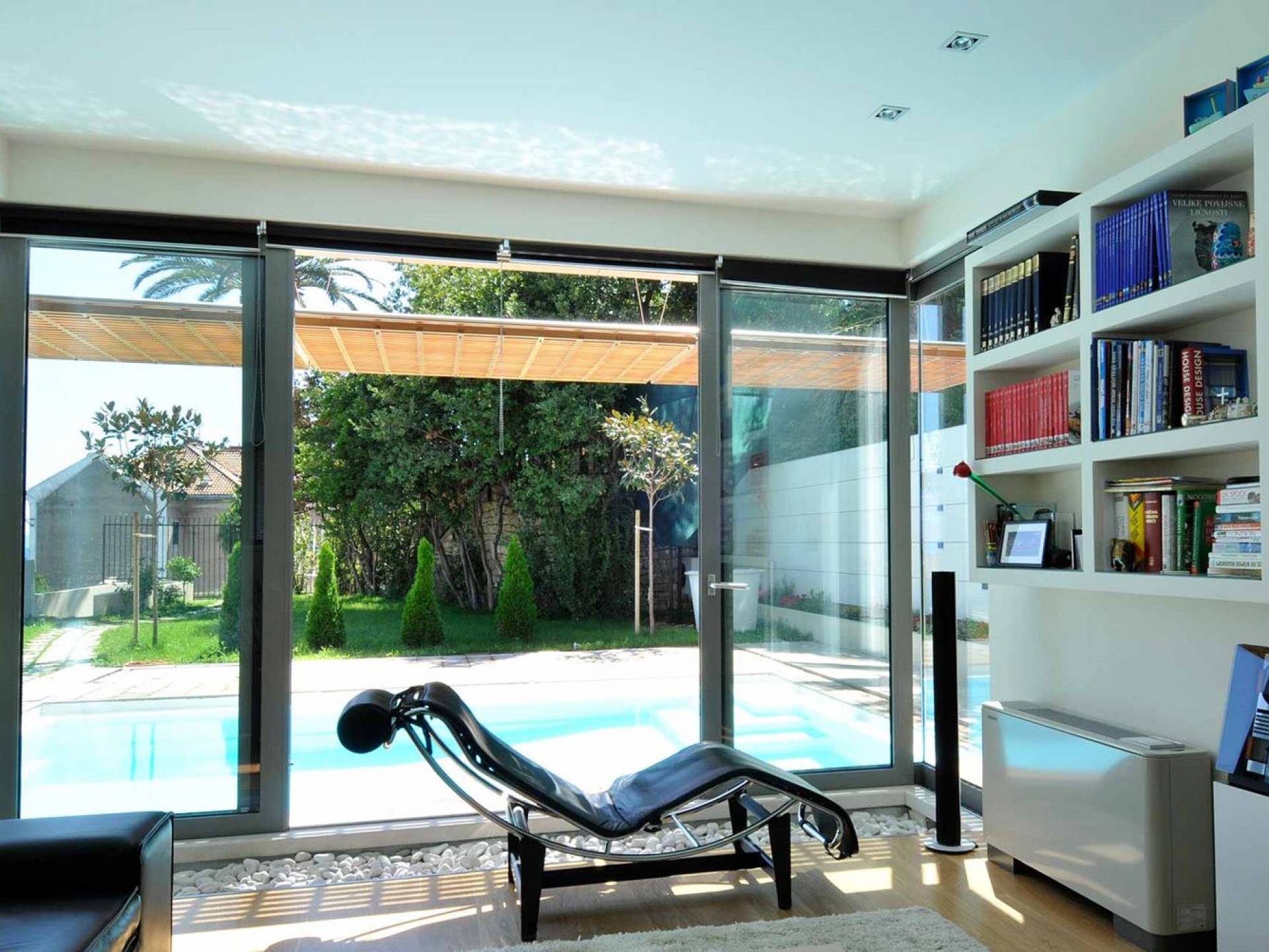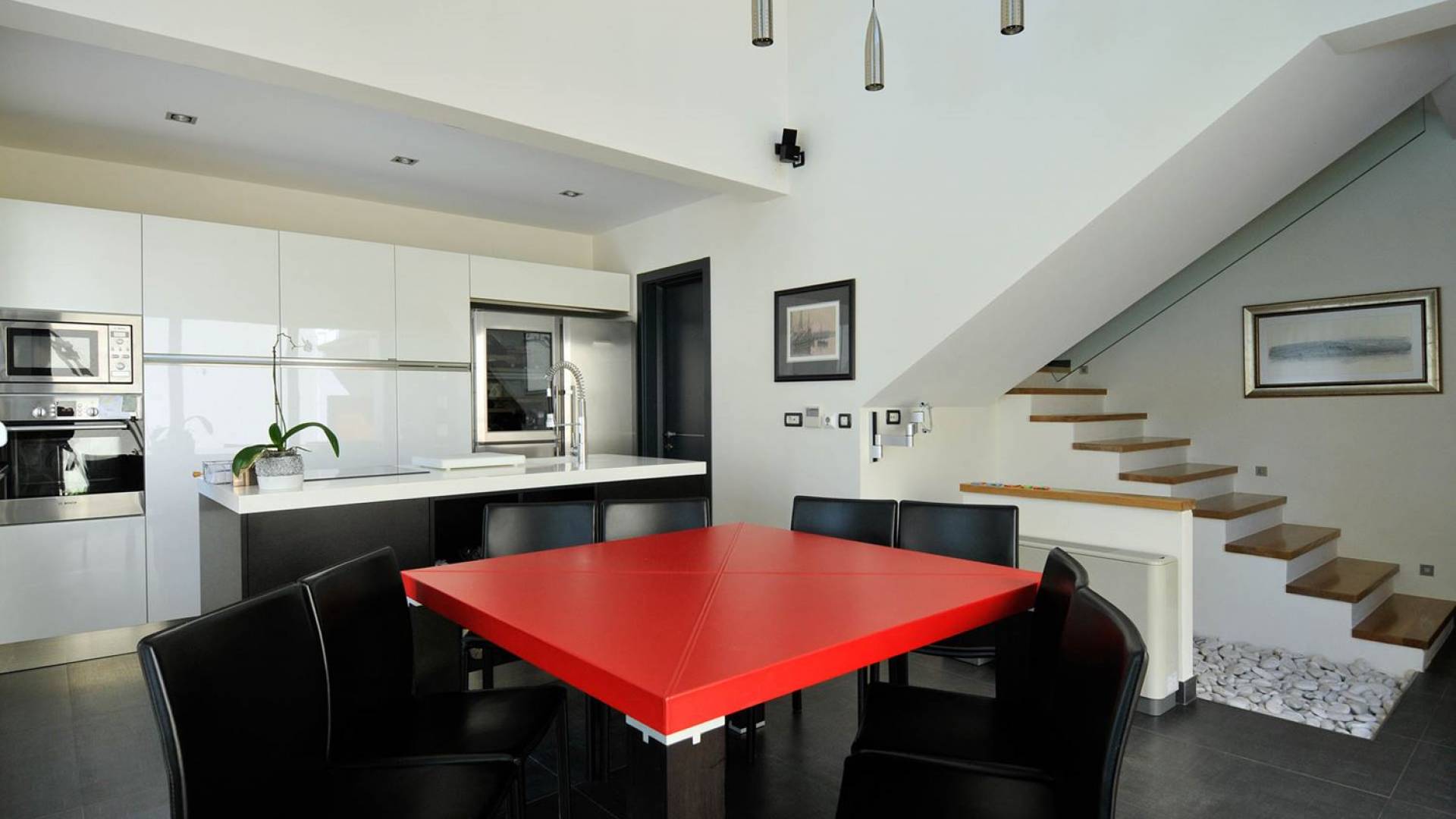 Οι επισκέπτες εισέρχονται στο ισόγειο της βίλας περνώντας από την αυλή της βίλας μέσα από τη μεγάλη γυάλινη πόρτα όπου θα βρείτε ένα μοντέρνα διακοσμημένο σαλόνι, εξοπλισμένο με δορυφορική τηλεόραση, σαλόνι όπου υπάρχει μια μοντέρνα και πλήρως εξοπλισμένη κουζίνα, με ντουλάπι για παντοπωλεία και τραπεζαρία με τραπέζι. Σε αυτόν τον όροφο, υπάρχει επίσης μια μελέτη με ένα επιπλέον κρεβάτι και ένα μοντέρνο μπάνιο με ντους και πλυντήριο. Το ισόγειο συνδέεται με τον πρώτο όροφο με μοντέρνα σχεδιασμένες σκάλες που σας οδηγούν στον χώρο όπου υπάρχει ένα υπνοδωμάτιο με διπλό κρεβάτι και βεράντα με θέα στη θάλασσα.