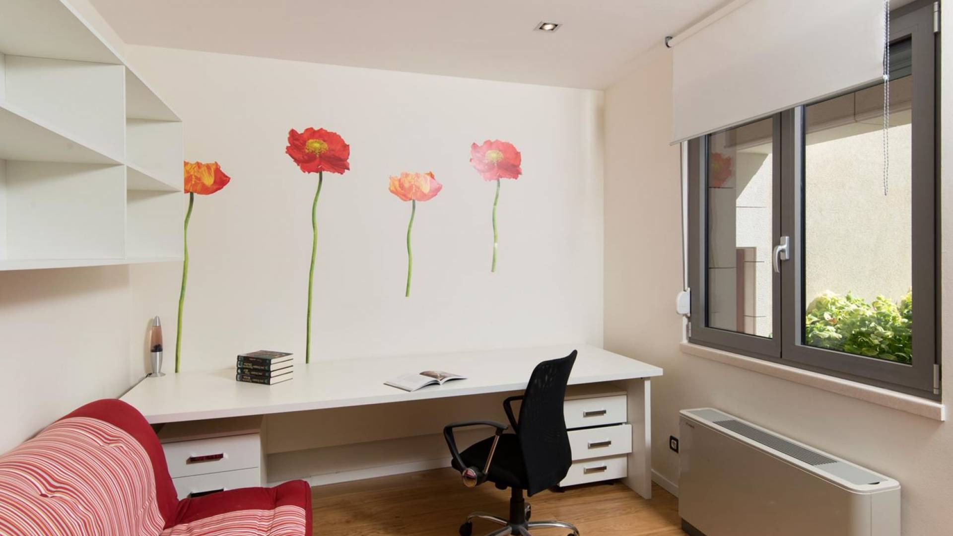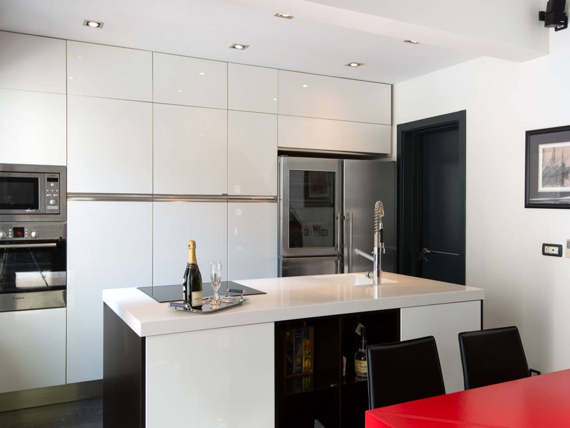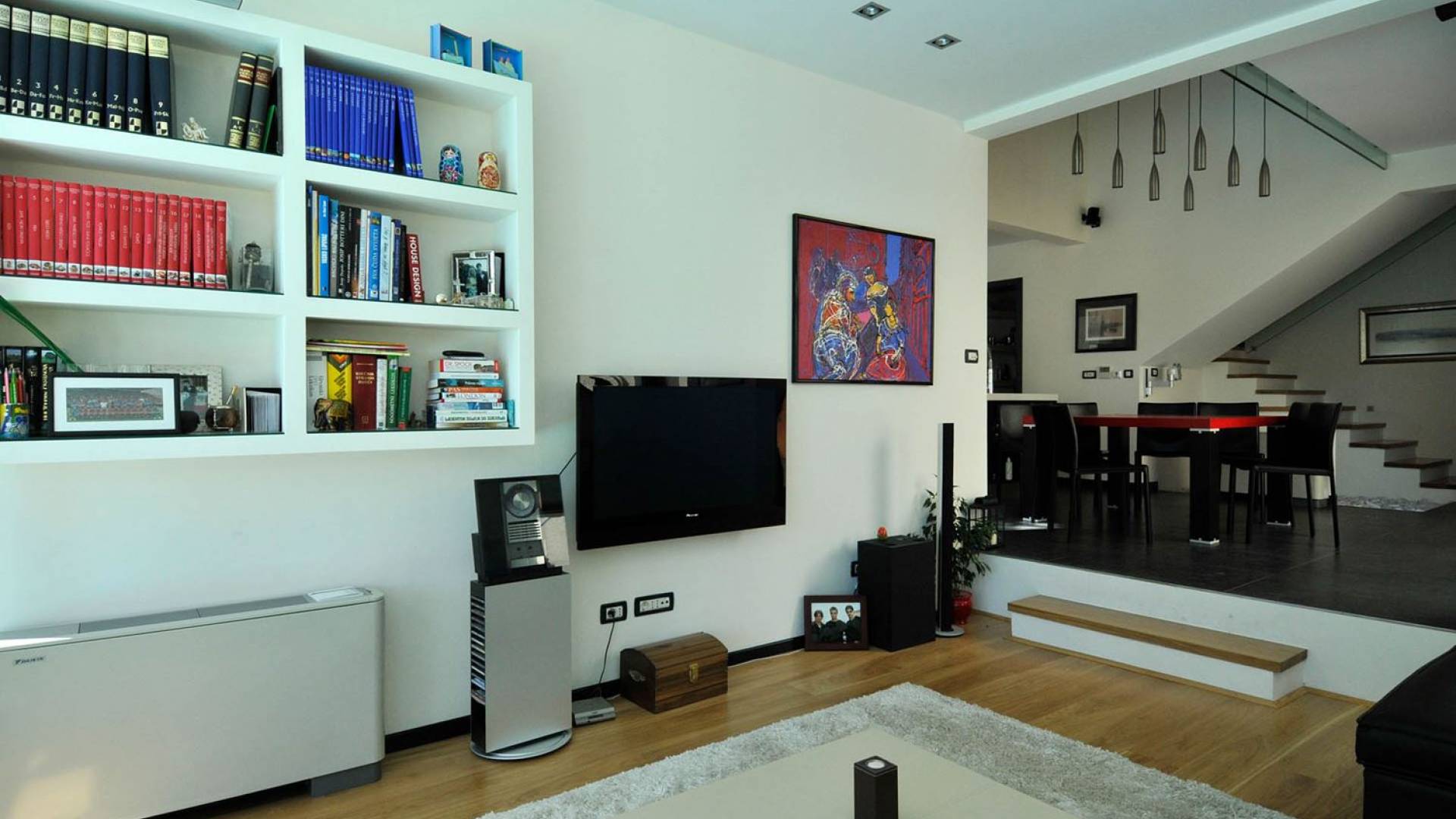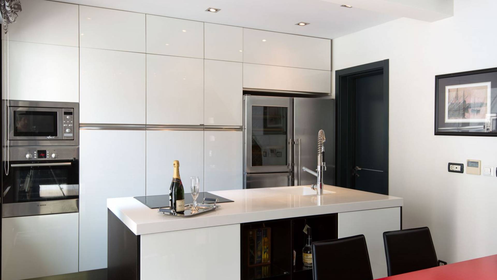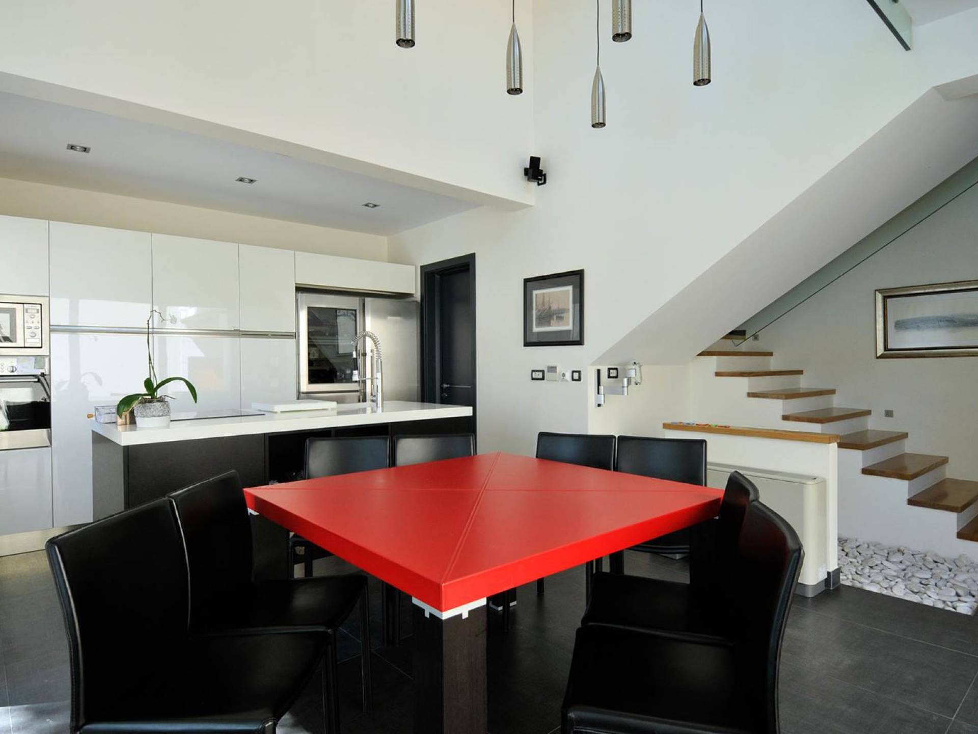 Οι επισκέπτες εισέρχονται στο ισόγειο της βίλας περνώντας από την αυλή της βίλας μέσα από τη μεγάλη γυάλινη πόρτα όπου θα βρείτε ένα μοντέρνα διακοσμημένο σαλόνι, εξοπλισμένο με δορυφορική τηλεόραση, σαλόνι όπου υπάρχει μια μοντέρνα και πλήρως εξοπλισμένη κουζίνα, με ντουλάπι για παντοπωλεία και τραπεζαρία με τραπέζι. Σε αυτόν τον όροφο, υπάρχει επίσης μια μελέτη με ένα επιπλέον κρεβάτι και ένα μοντέρνο μπάνιο με ντους και πλυντήριο. Το ισόγειο συνδέεται με τον πρώτο όροφο με μοντέρνα σχεδιασμένες σκάλες που σας οδηγούν στον χώρο όπου υπάρχει ένα υπνοδωμάτιο με διπλό κρεβάτι και βεράντα με θέα στη θάλασσα.