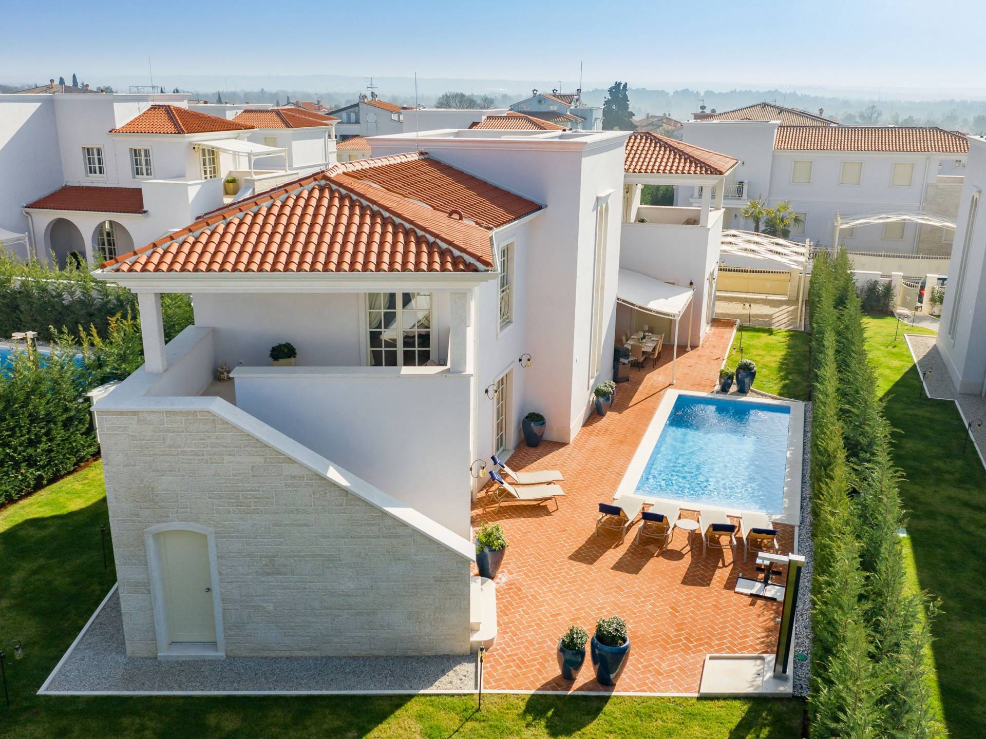 Η κοντινότερη παραλία "Santa Marina" απέχει μόλις 800μ., ενώ σε απόσταση 100μ υπάρχουν πολλά εστιατόρια και καταστήματα. Το Poreč και το Novigrad απέχουν μόλις 5 χιλιόμετρα. Κατά τη διάρκεια των διακοπών σας, φροντίστε να επισκεφθείτε το Αμφιθέατρο στην Πούλα (The Arena) και την όμορφη πόλη του Rovinj με τη μνημειακή εκκλησία της Αγίας Ευφημίας, που απέχουν μόλις 45 λεπτά με το αυτοκίνητο. Μη χάσετε την αυθεντική κουζίνα της Ίστρια με μια ποικιλία πιάτων με τρούφες, πορτσίνι, σπιτικά ζυμαρικά (fuži και pljukanci) και σπεσιαλιτέ ψαριών.