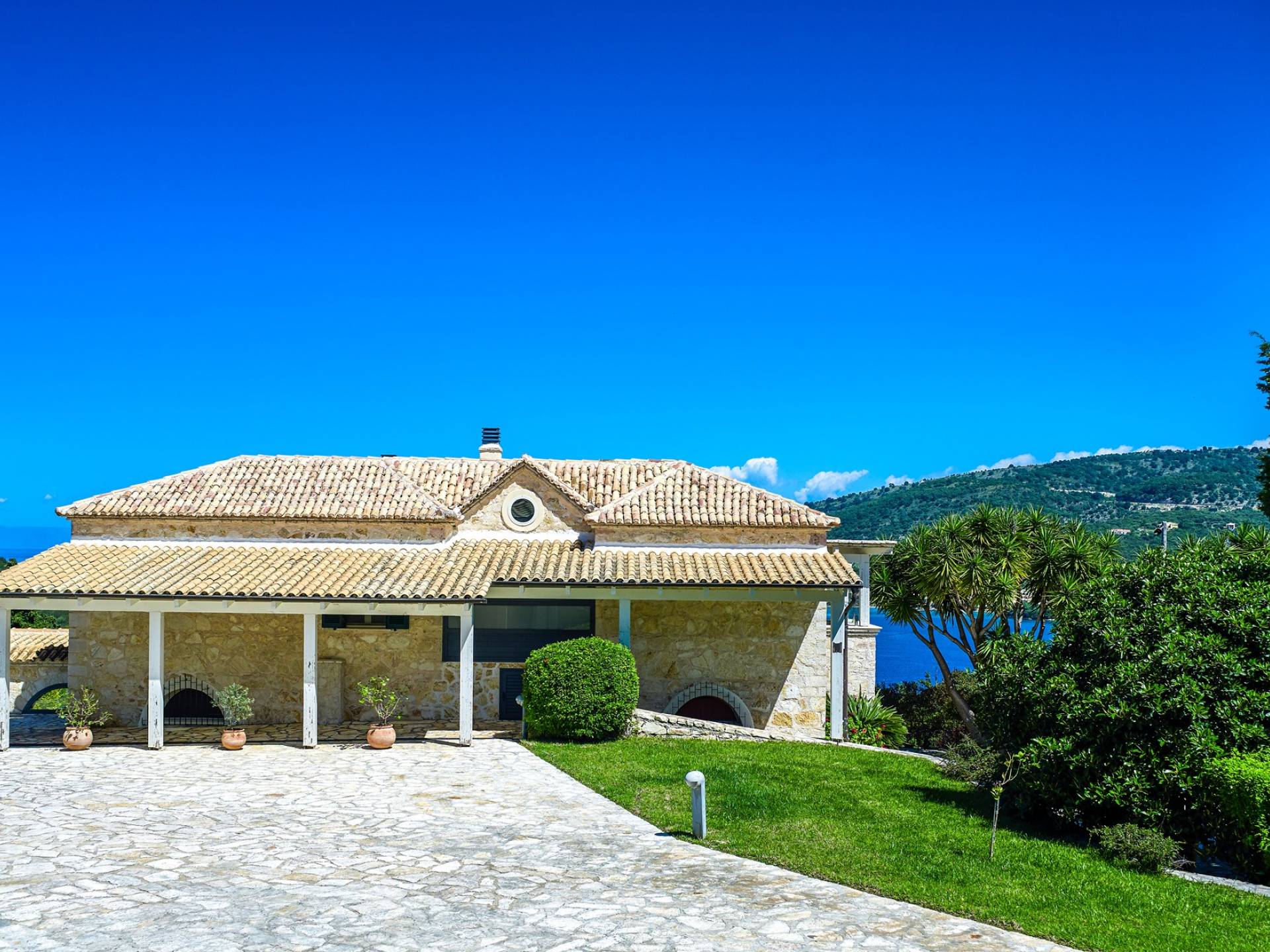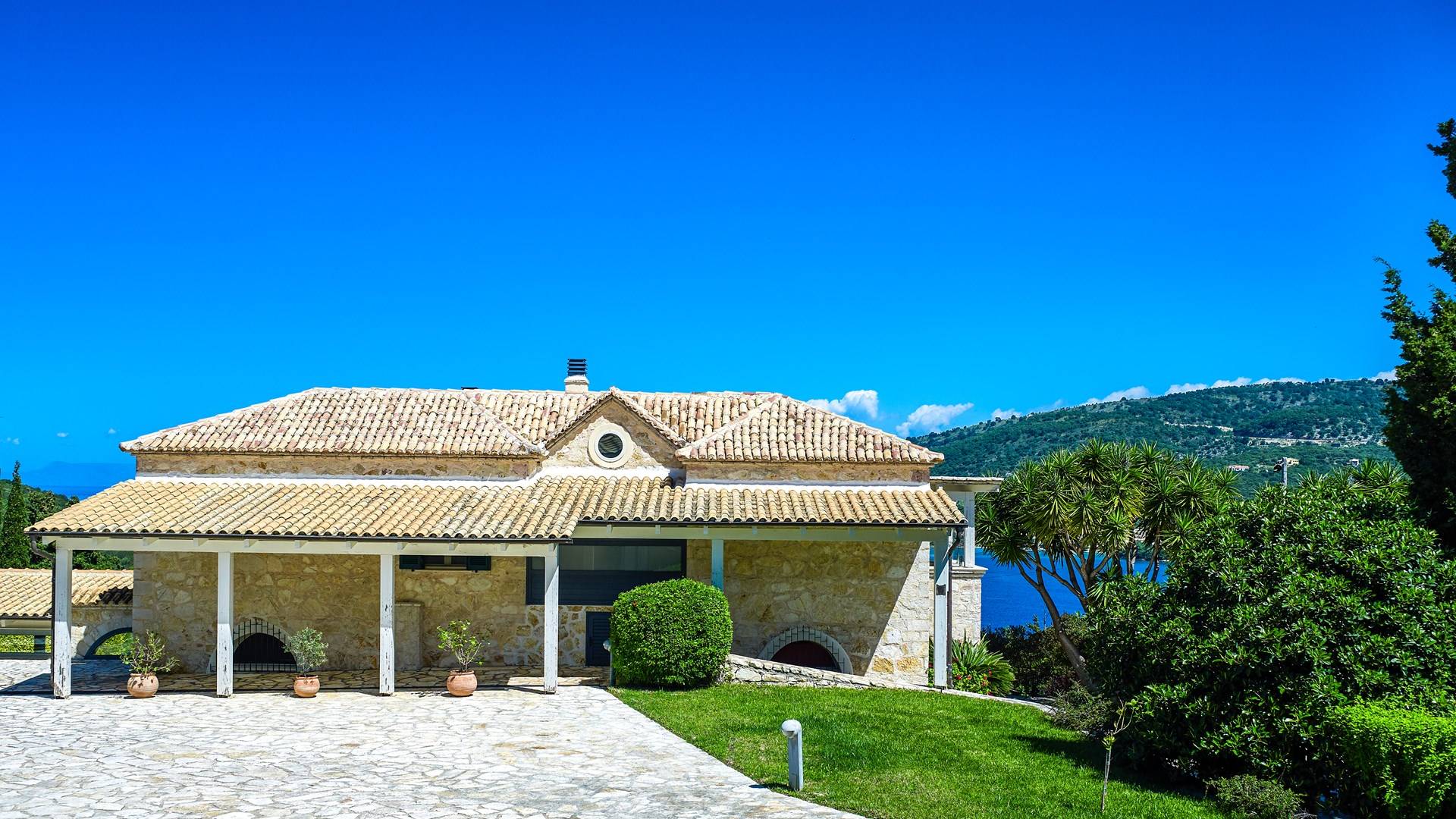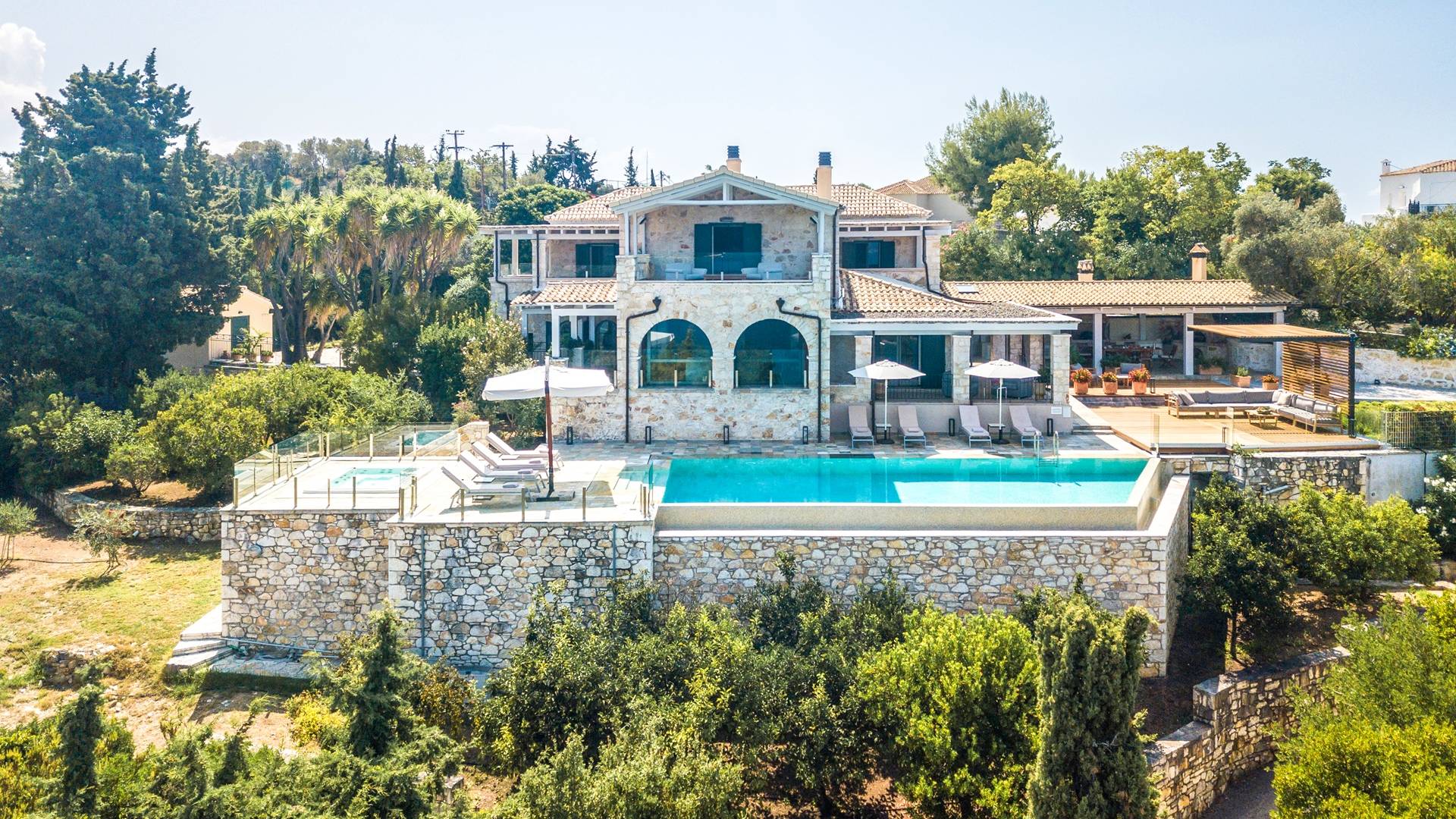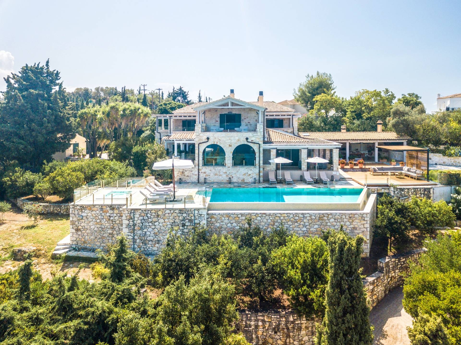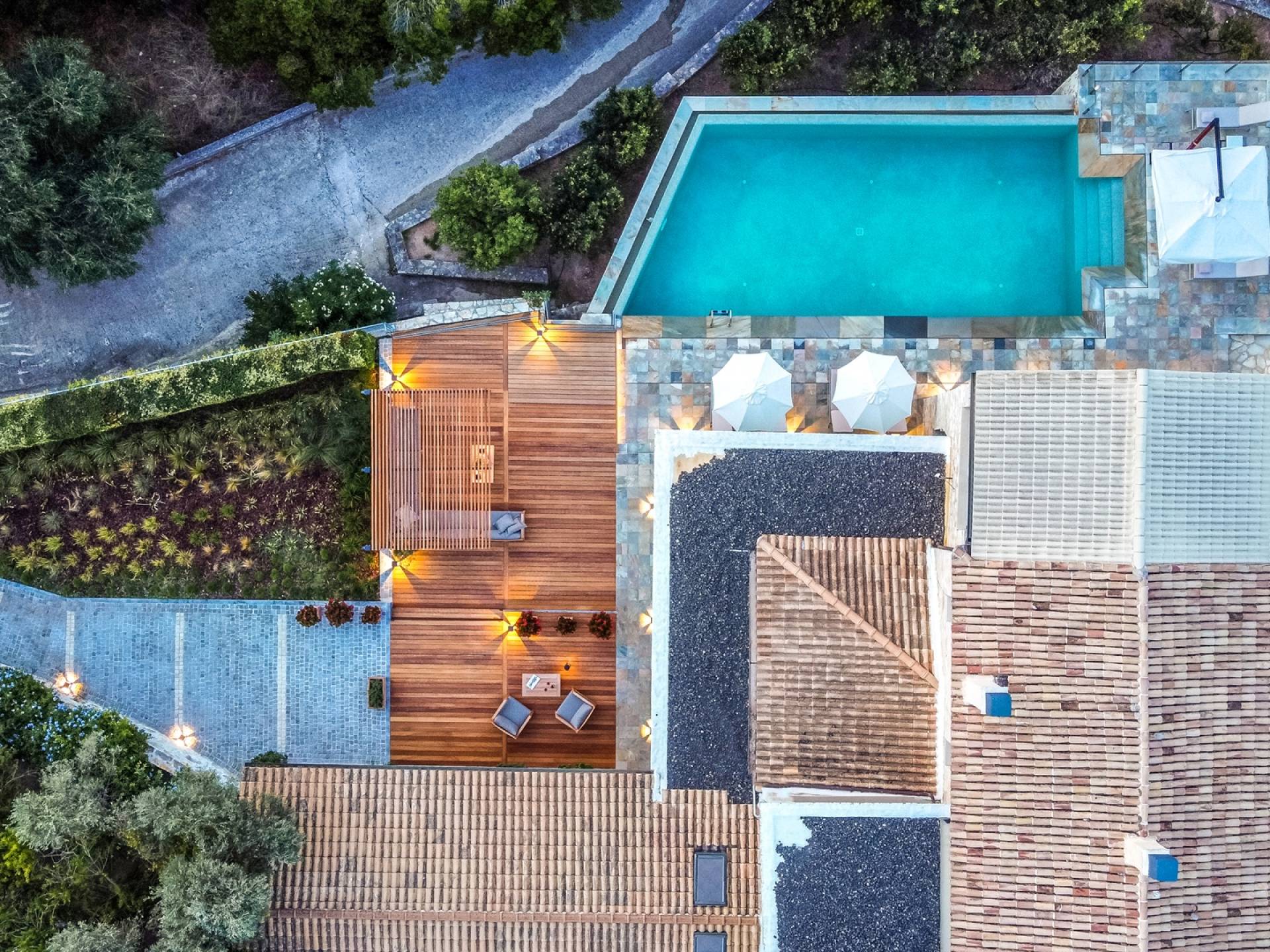 Η εντυπωσιακή πρόσοψη από τοπική πέτρα γρανίτη έχει σχεδιαστεί από τον ιδιοκτήτη και η δίρριχτη οροφή την κάνει να ξεχωρίζει στις πλαγιές των λόφων. Ακριβώς πίσω από την πισίνα βρίσκεται μια υπέροχη υπαίθρια σκεπαστή τραπεζαρία με σετ μπάρμπεκιου και άφθονο χώρο για να απλώσετε πραγματικά το άψογο γρασίδι και τον κήπο που προσφέρει σκιά και γαλήνιες εσοχές για να ανακαλύψετε και να απολαύσετε. Υπάρχει ένα υπνοδωμάτιο με διπλό κρεβάτι -επίσης στο ισόγειο- με μπαλκονόπορτες που ανοίγουν στη βεράντα της πισίνας, βολικό για όσους δεν θέλουν να ανέβουν σκάλες και τα δύο king-size κρεβάτια και ένα υπνοδωμάτιο με δύο μονά κρεβάτια στον πρώτο όροφο, όλα με επίπεδη οθόνη Τηλεοράσεις και μπαλκόνια και δύο ντους. Υπάρχουν πολλές βεράντες και αίθρια από τα οποία μπορείτε να θαυμάσετε την εκπληκτική ύπαιθρο και τη θάλασσα, συνοδευόμενα από έναν καφέ νωρίς το πρωί ή ένα απεριτίφ ως το ηλιοβασίλεμα.