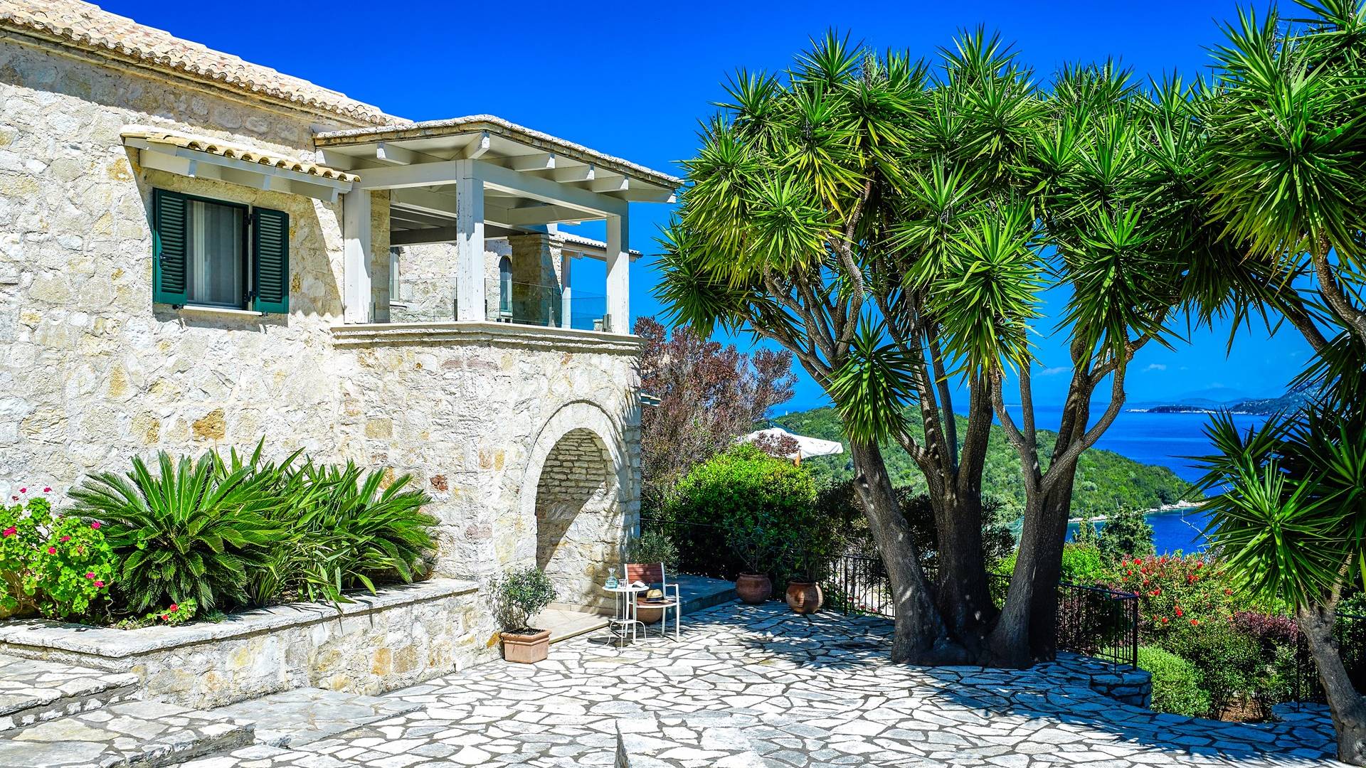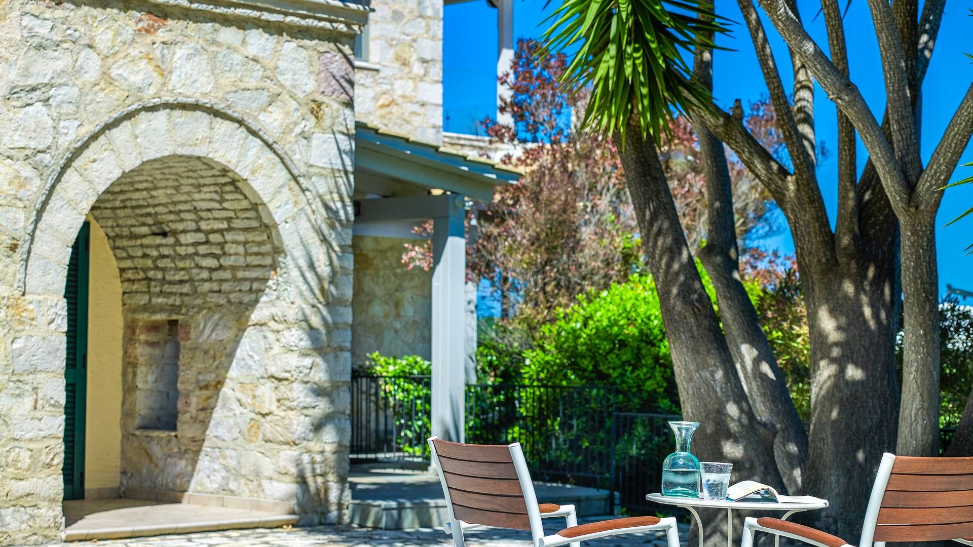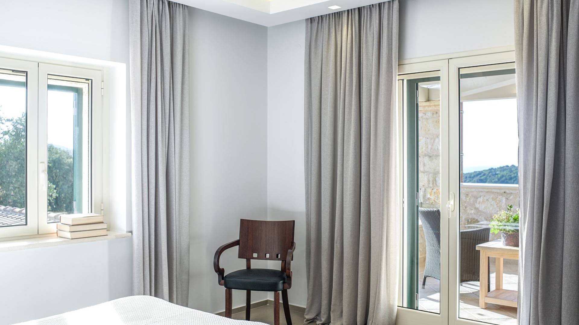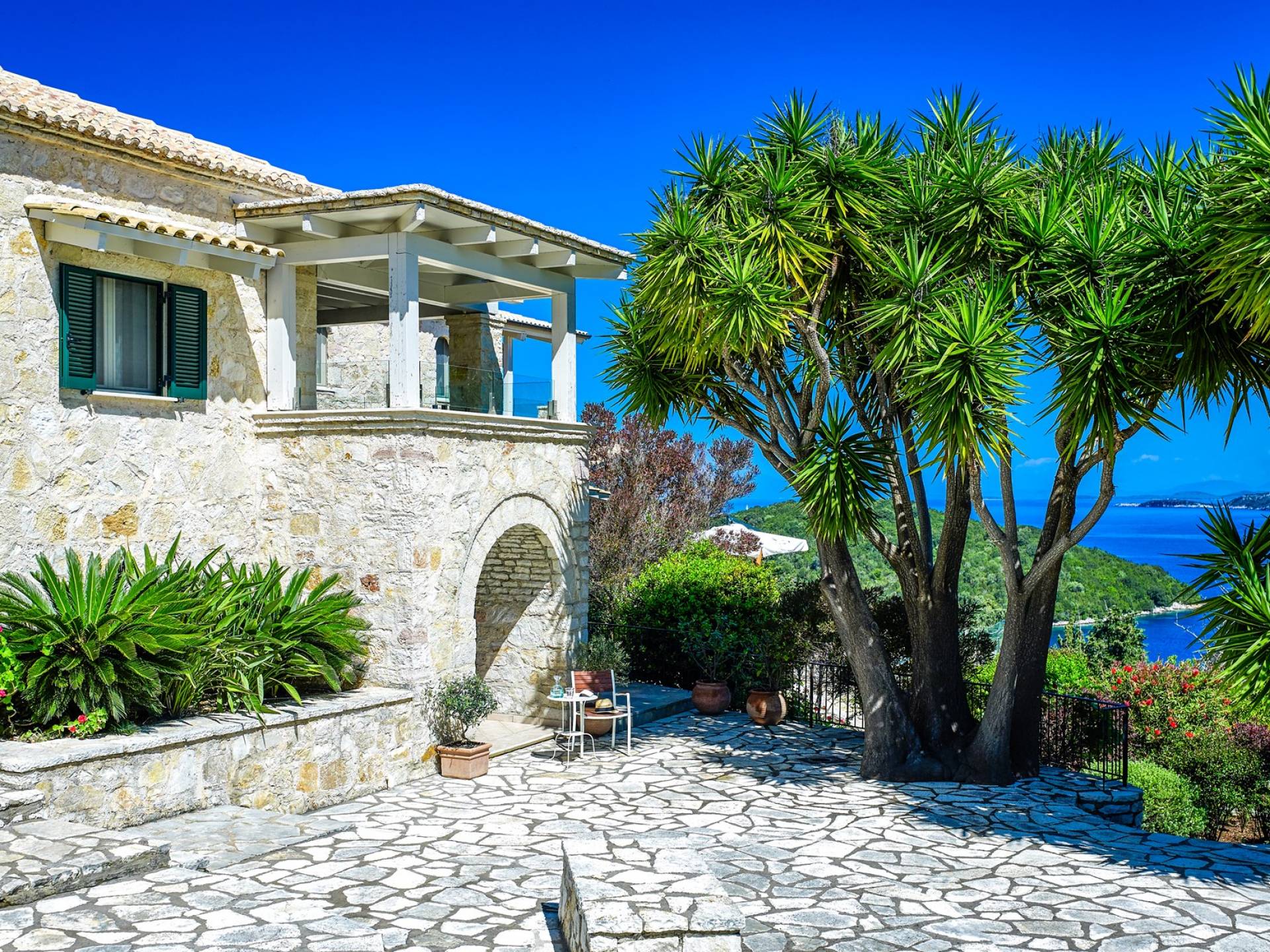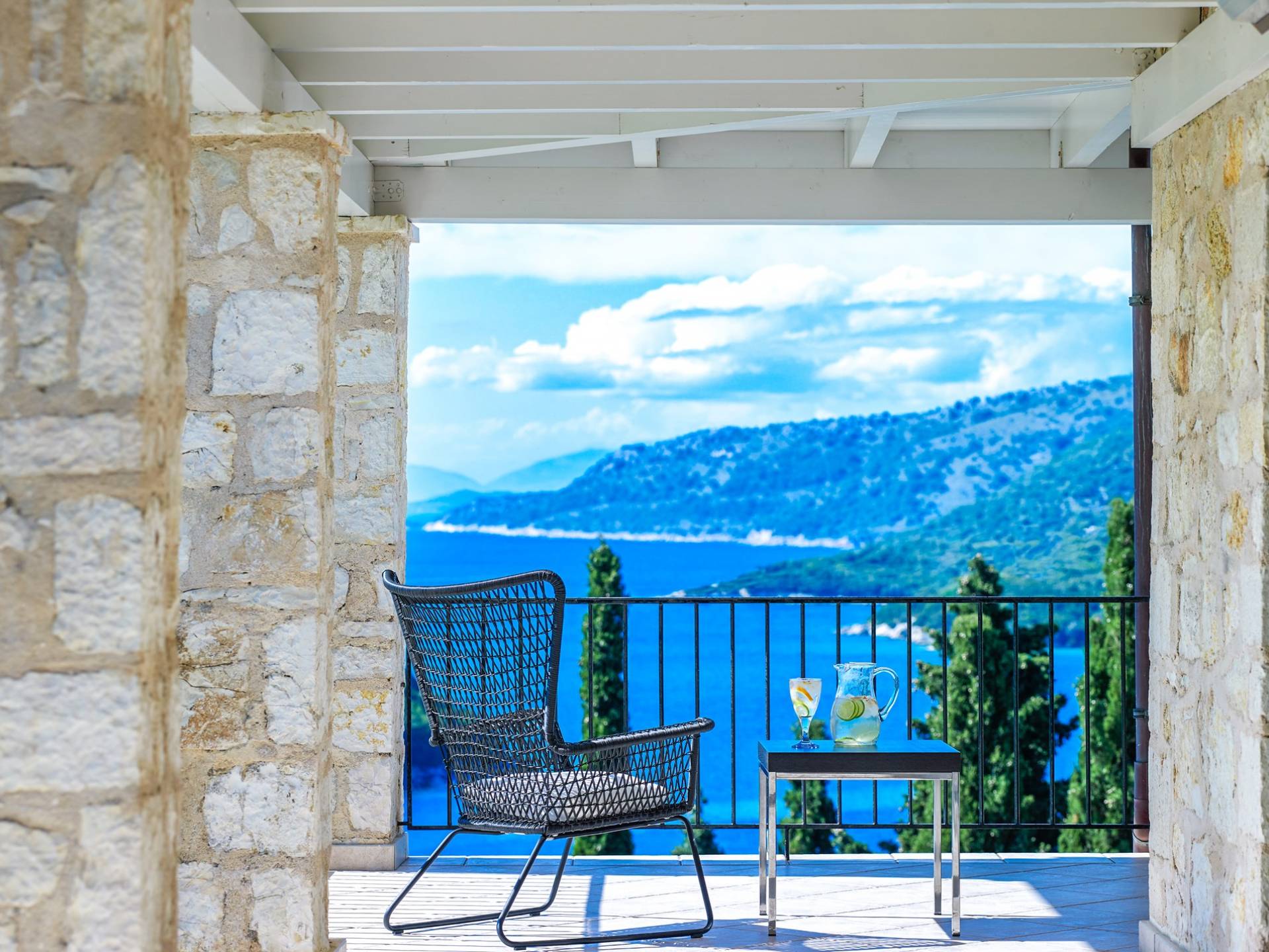 Η εντυπωσιακή πρόσοψη από τοπική πέτρα γρανίτη έχει σχεδιαστεί από τον ιδιοκτήτη και η δίρριχτη οροφή την κάνει να ξεχωρίζει στις πλαγιές των λόφων. Ακριβώς πίσω από την πισίνα βρίσκεται μια υπέροχη υπαίθρια σκεπαστή τραπεζαρία με σετ μπάρμπεκιου και άφθονο χώρο για να απλώσετε πραγματικά το άψογο γρασίδι και τον κήπο που προσφέρει σκιά και γαλήνιες εσοχές για να ανακαλύψετε και να απολαύσετε. Υπάρχει ένα υπνοδωμάτιο με διπλό κρεβάτι -επίσης στο ισόγειο- με μπαλκονόπορτες που ανοίγουν στη βεράντα της πισίνας, βολικό για όσους δεν θέλουν να ανέβουν σκάλες και τα δύο king-size κρεβάτια και ένα υπνοδωμάτιο με δύο μονά κρεβάτια στον πρώτο όροφο, όλα με επίπεδη οθόνη Τηλεοράσεις και μπαλκόνια και δύο ντους. Υπάρχουν πολλές βεράντες και αίθρια από τα οποία μπορείτε να θαυμάσετε την εκπληκτική ύπαιθρο και τη θάλασσα, συνοδευόμενα από έναν καφέ νωρίς το πρωί ή ένα απεριτίφ ως το ηλιοβασίλεμα.
