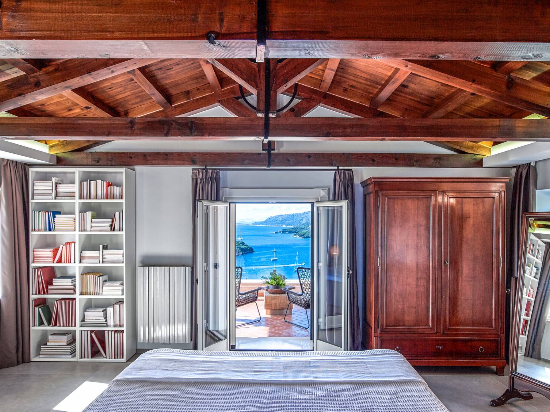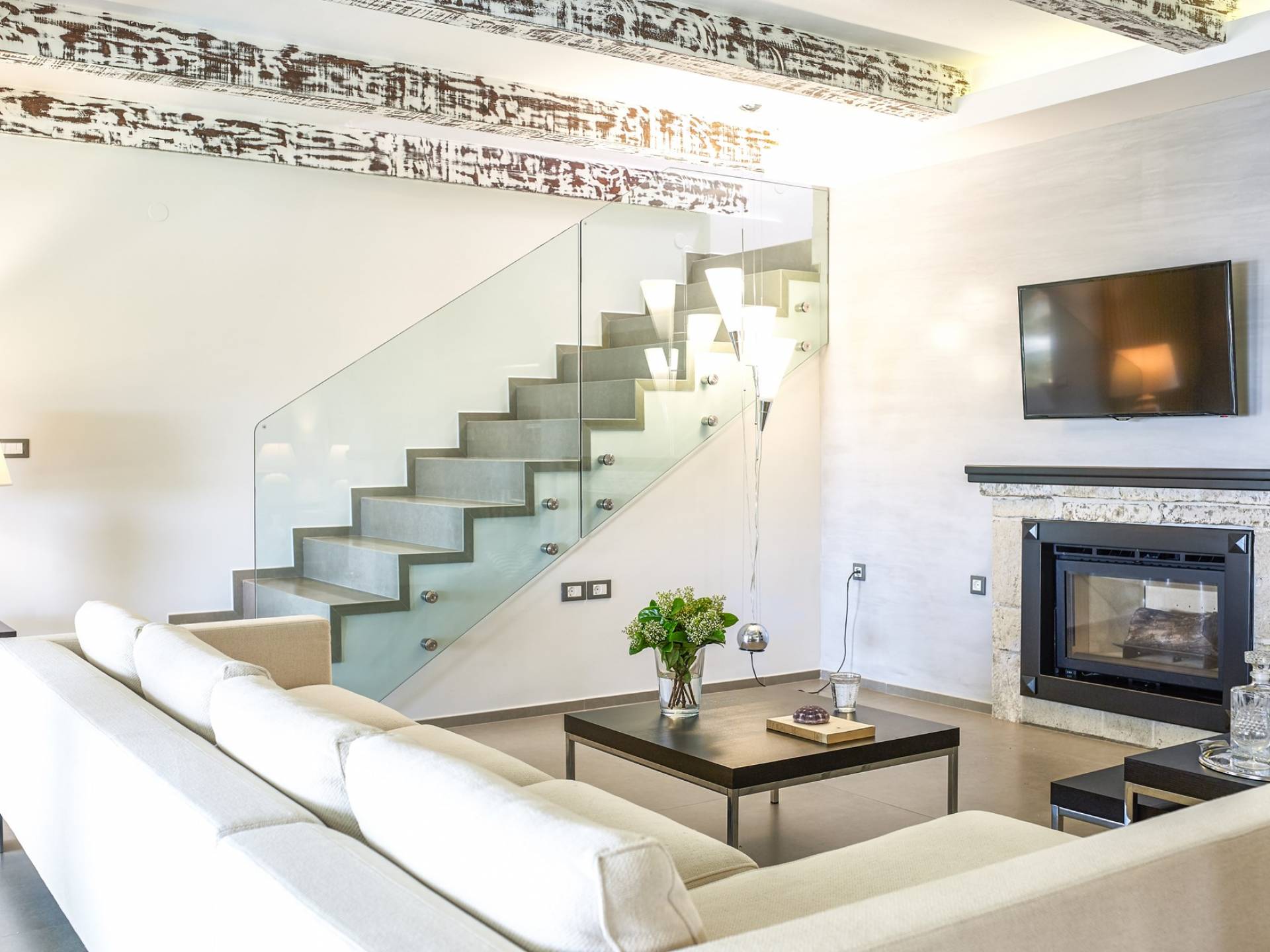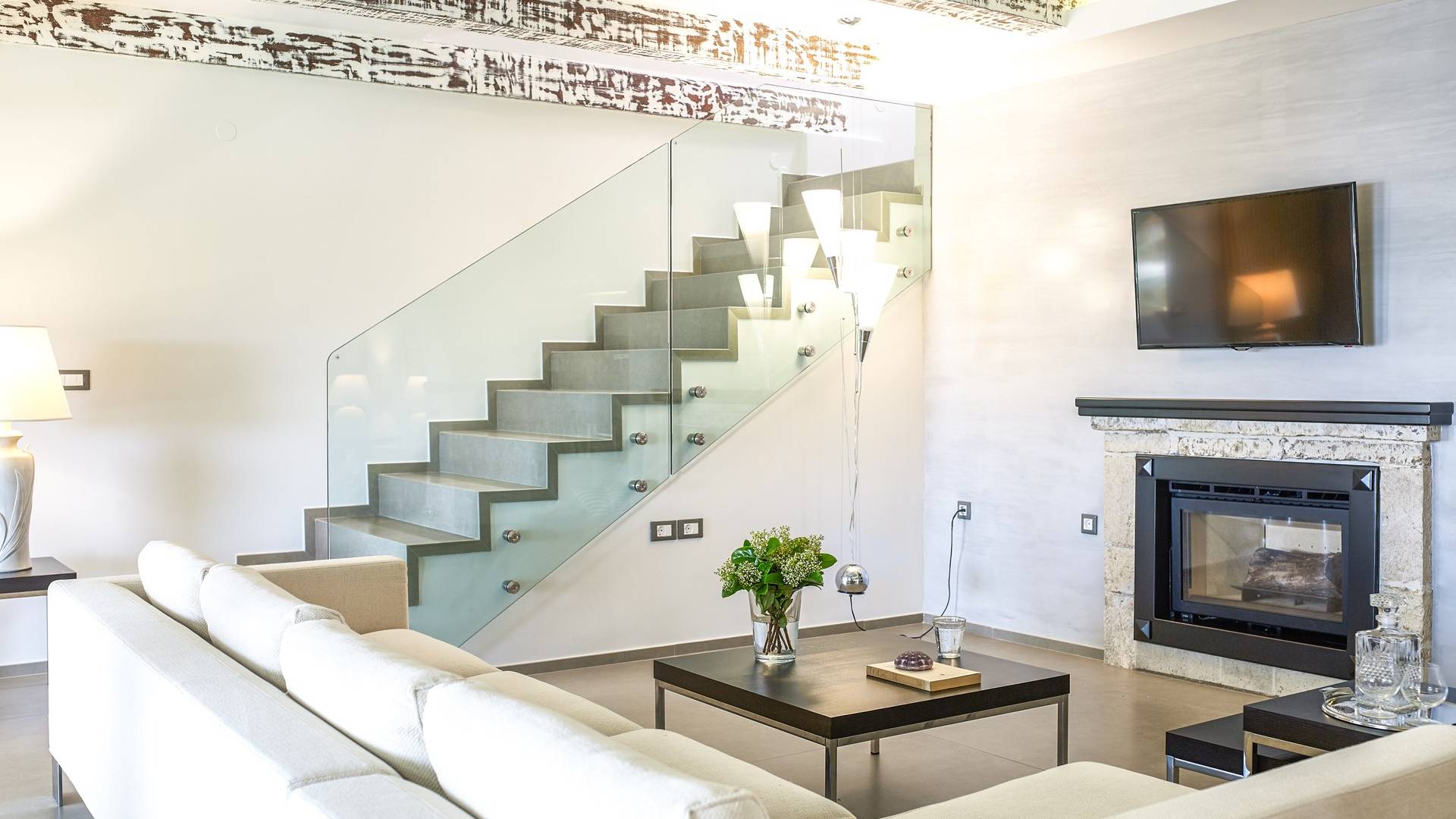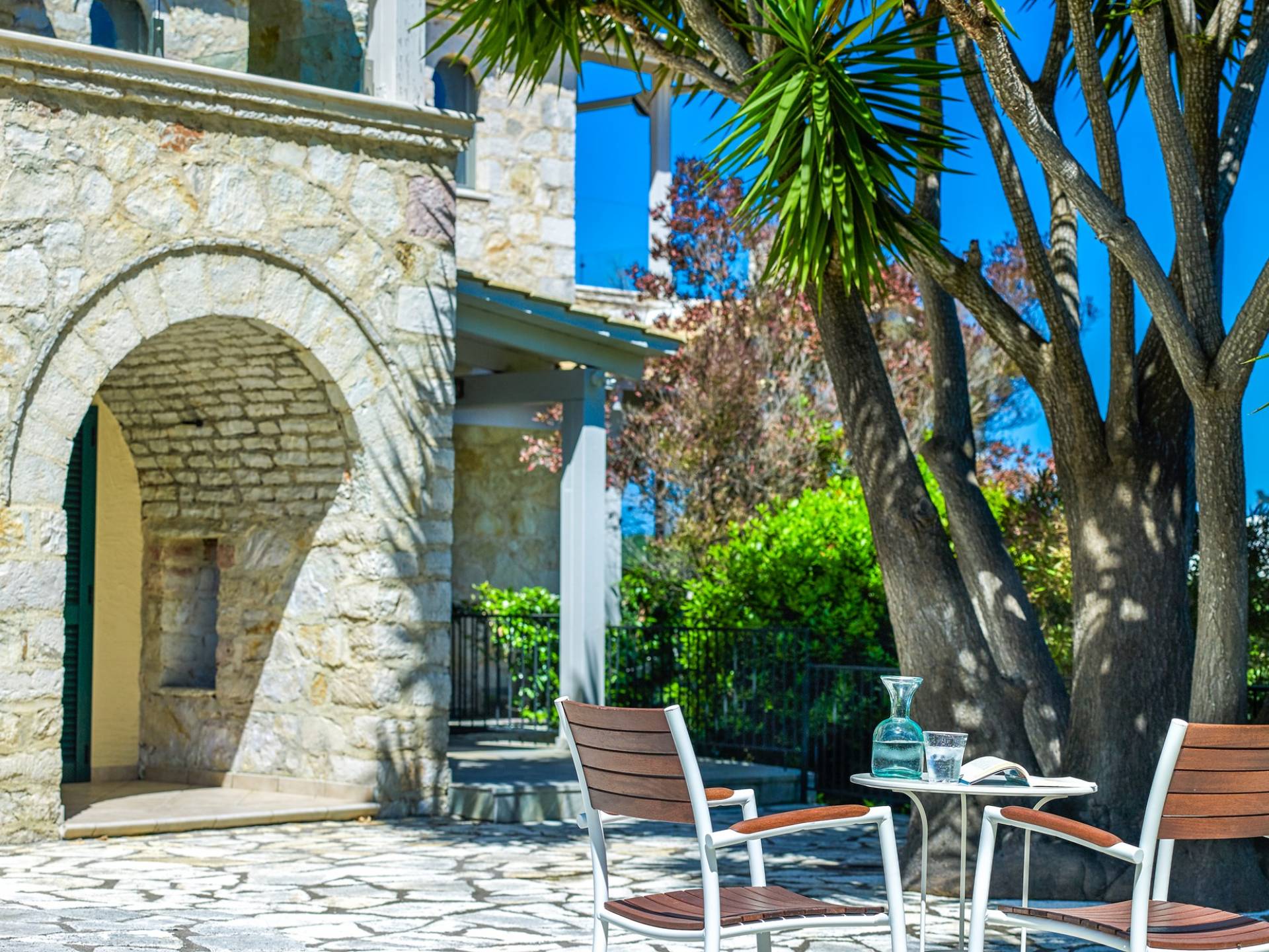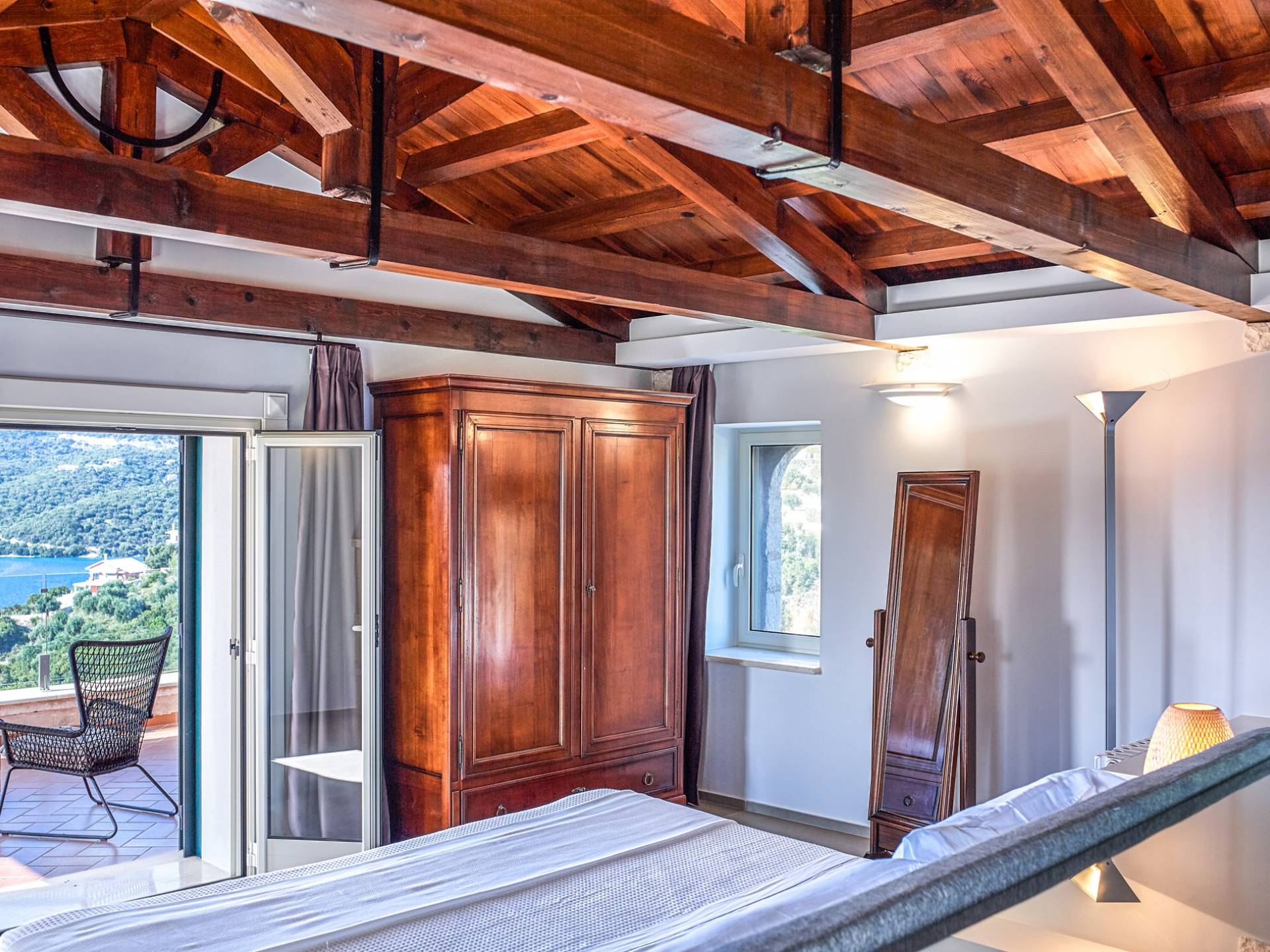 Η εντυπωσιακή πρόσοψη από τοπική πέτρα γρανίτη έχει σχεδιαστεί από τον ιδιοκτήτη και η δίρριχτη οροφή την κάνει να ξεχωρίζει στις πλαγιές των λόφων. Ακριβώς πίσω από την πισίνα βρίσκεται μια υπέροχη υπαίθρια σκεπαστή τραπεζαρία με σετ μπάρμπεκιου και άφθονο χώρο για να απλώσετε πραγματικά το άψογο γρασίδι και τον κήπο που προσφέρει σκιά και γαλήνιες εσοχές για να ανακαλύψετε και να απολαύσετε. Υπάρχει ένα υπνοδωμάτιο με διπλό κρεβάτι -επίσης στο ισόγειο- με μπαλκονόπορτες που ανοίγουν στη βεράντα της πισίνας, βολικό για όσους δεν θέλουν να ανέβουν σκάλες και τα δύο king-size κρεβάτια και ένα υπνοδωμάτιο με δύο μονά κρεβάτια στον πρώτο όροφο, όλα με επίπεδη οθόνη Τηλεοράσεις και μπαλκόνια και δύο ντους. Υπάρχουν πολλές βεράντες και αίθρια από τα οποία μπορείτε να θαυμάσετε την εκπληκτική ύπαιθρο και τη θάλασσα, συνοδευόμενα από έναν καφέ νωρίς το πρωί ή ένα απεριτίφ ως το ηλιοβασίλεμα.