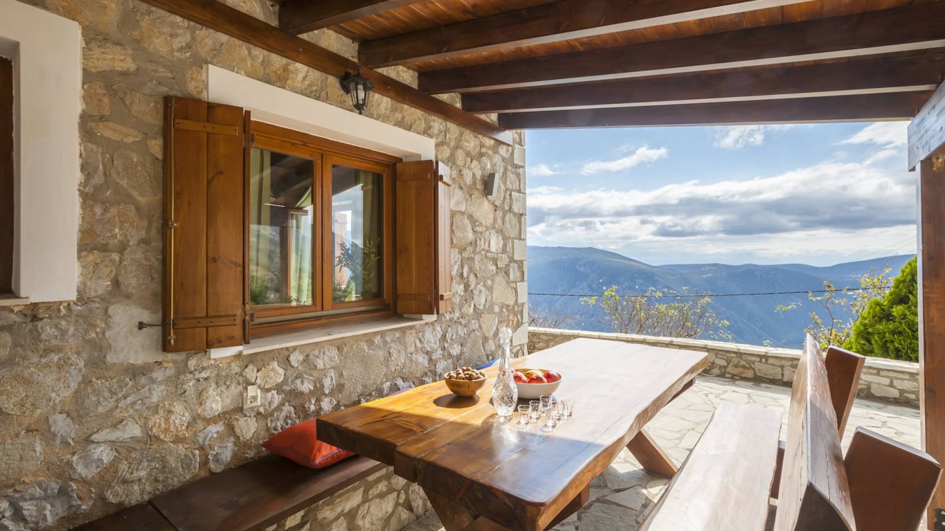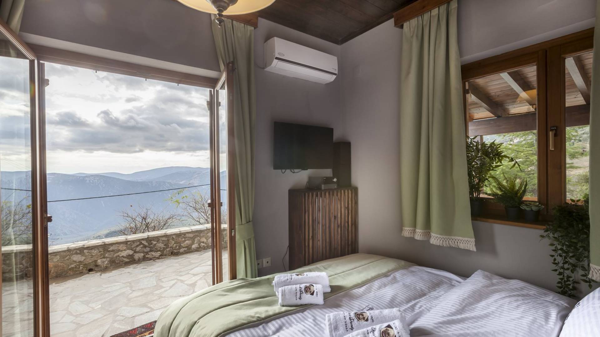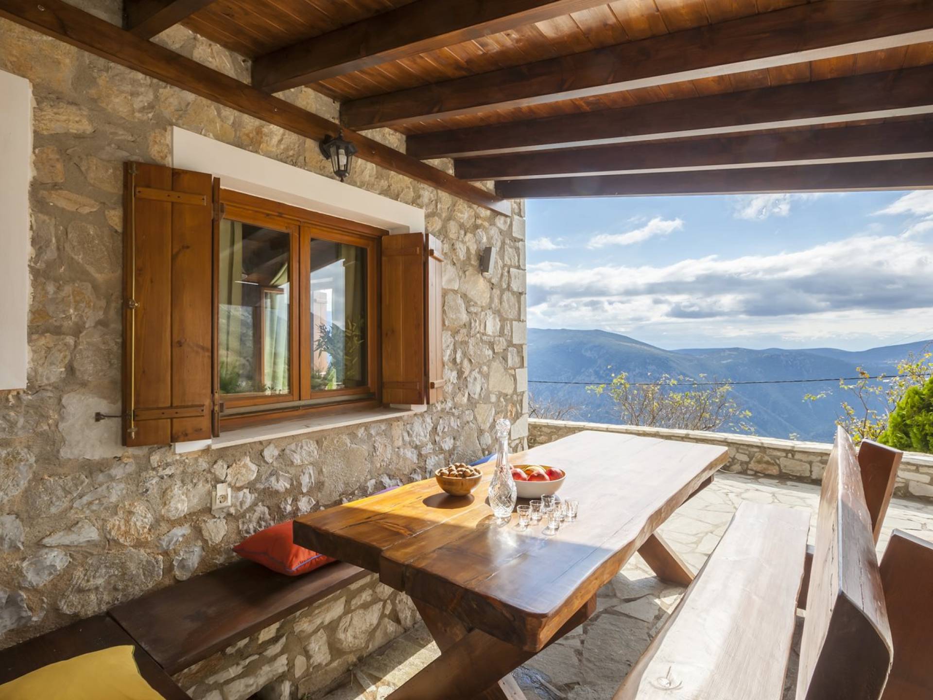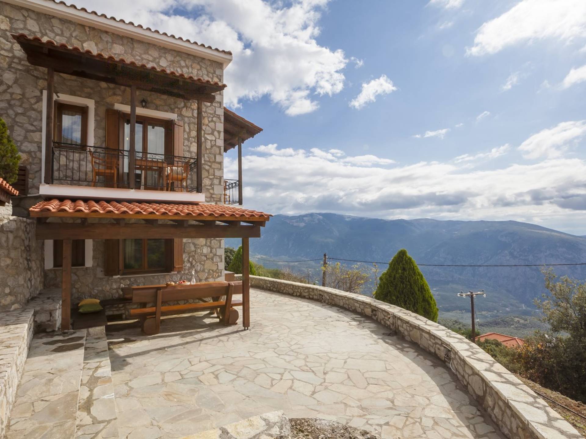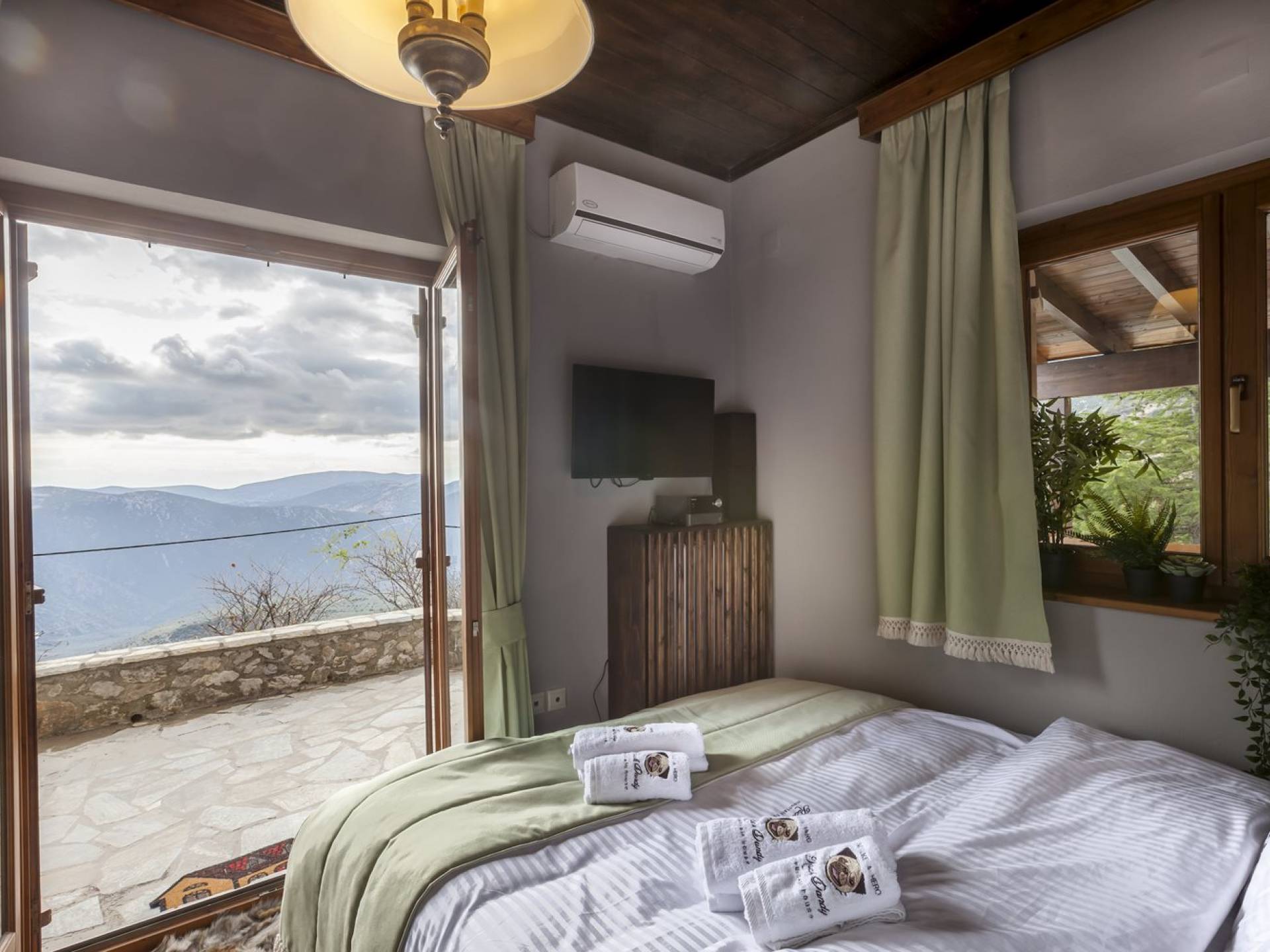 Η θέα από τα μπαλκόνια και τη βεράντα κόβει την ανάσα. Βρίσκεσαι σε υψόμετρο 900+ μέτρων και είναι σαν να απολαμβάνεις τον ήλιο και τα σύννεφα από πρώτη θέση. Η διακόσμηση είναι ιδιαίτερα εκλεπτυσμένη με την ενοχλητική πολυτέλεια που προκαλεί ζεστασιά και φινέτσα. Το σπίτι είναι εξοπλισμένο με hi-fi, τηλεοράσεις τελευταίου τύπου, ηλεκτρική κουζίνα, φούρνο μικροκυμάτων, κλιματισμό, τζάκι, τοστιέρα, μπόιλερ και όλων των ειδών τα μαγειρικά σκεύη, σάουνα και καμπίνα υδρομασάζ για όσους αναζητούν χαλάρωση και αποτοξίνωση 100%.