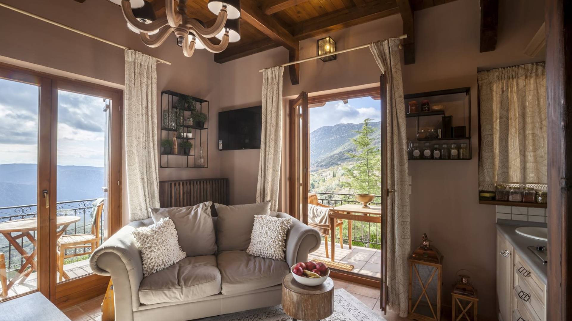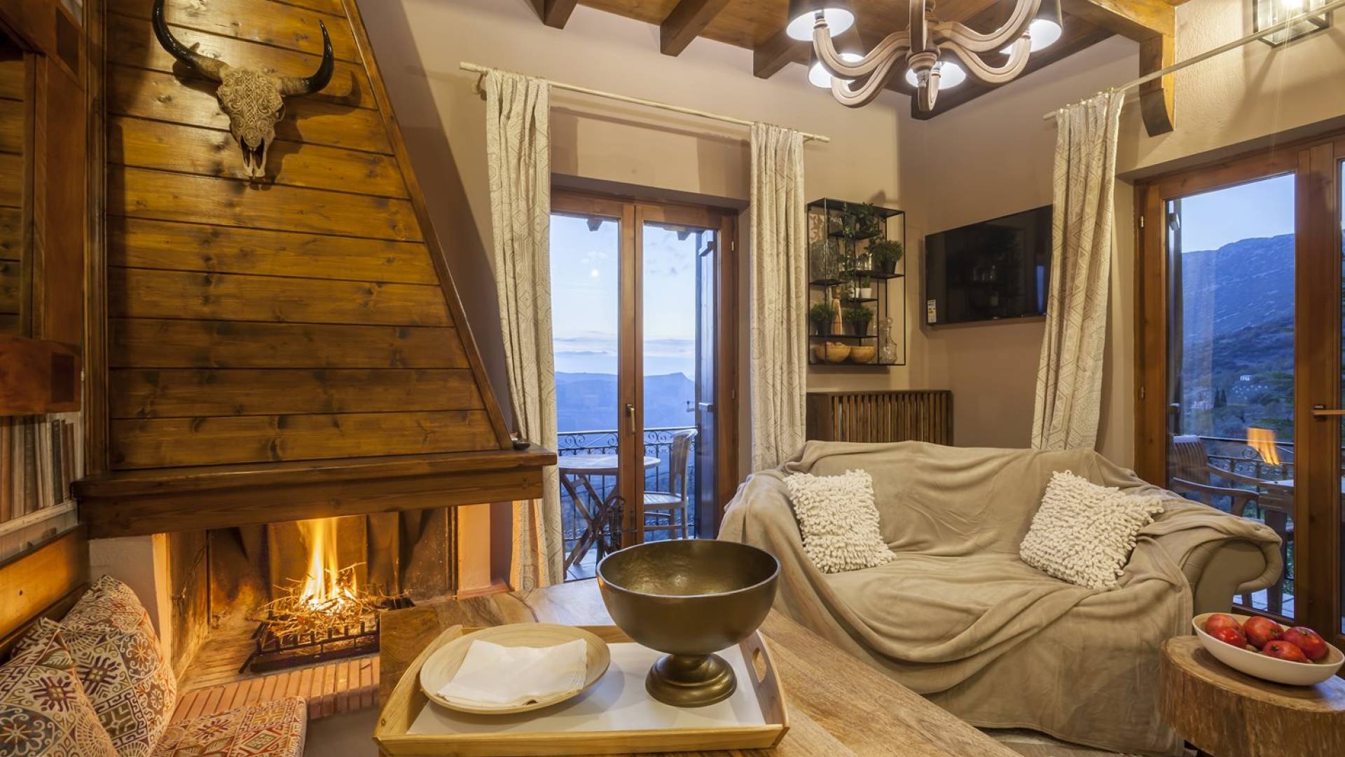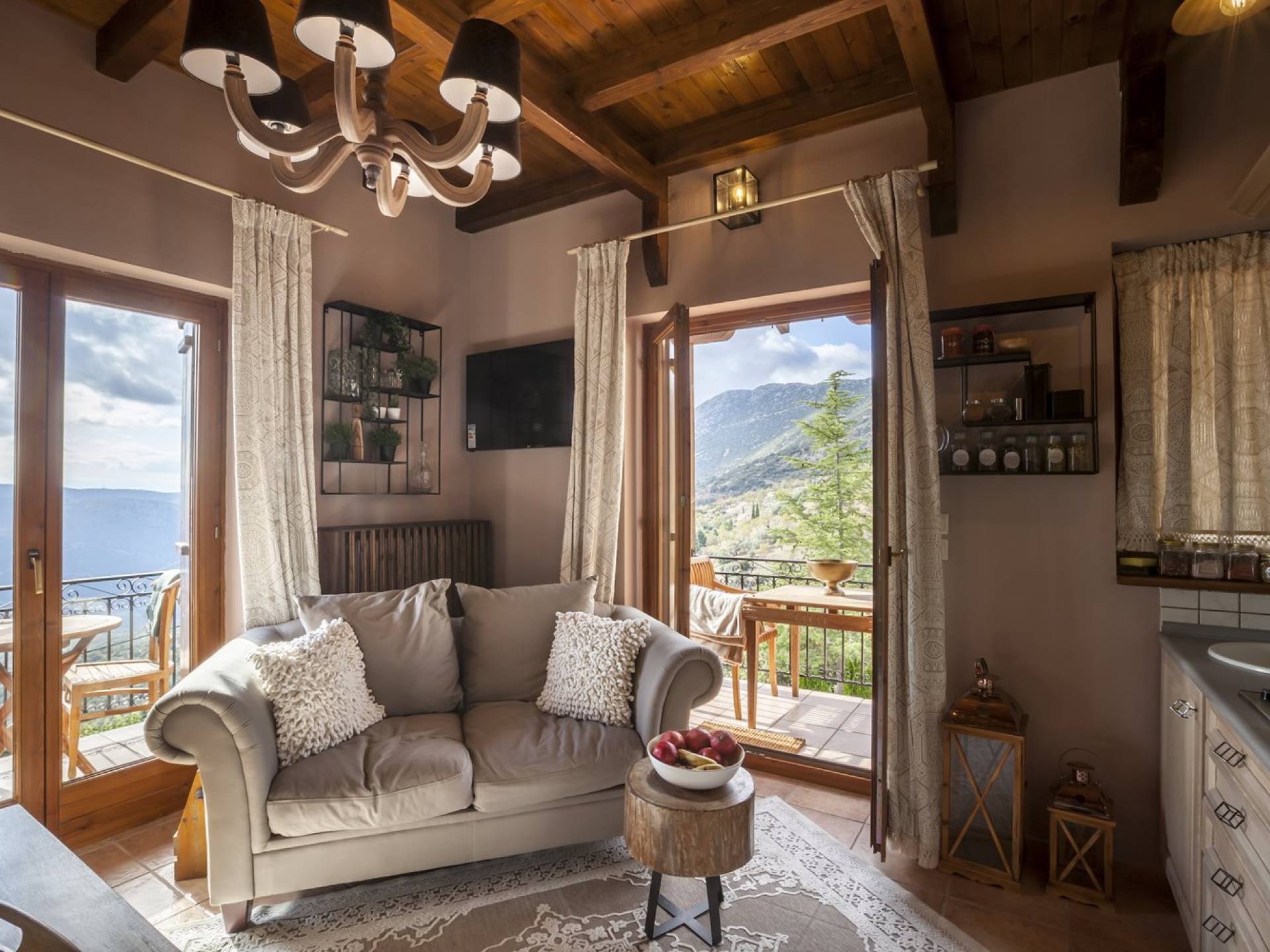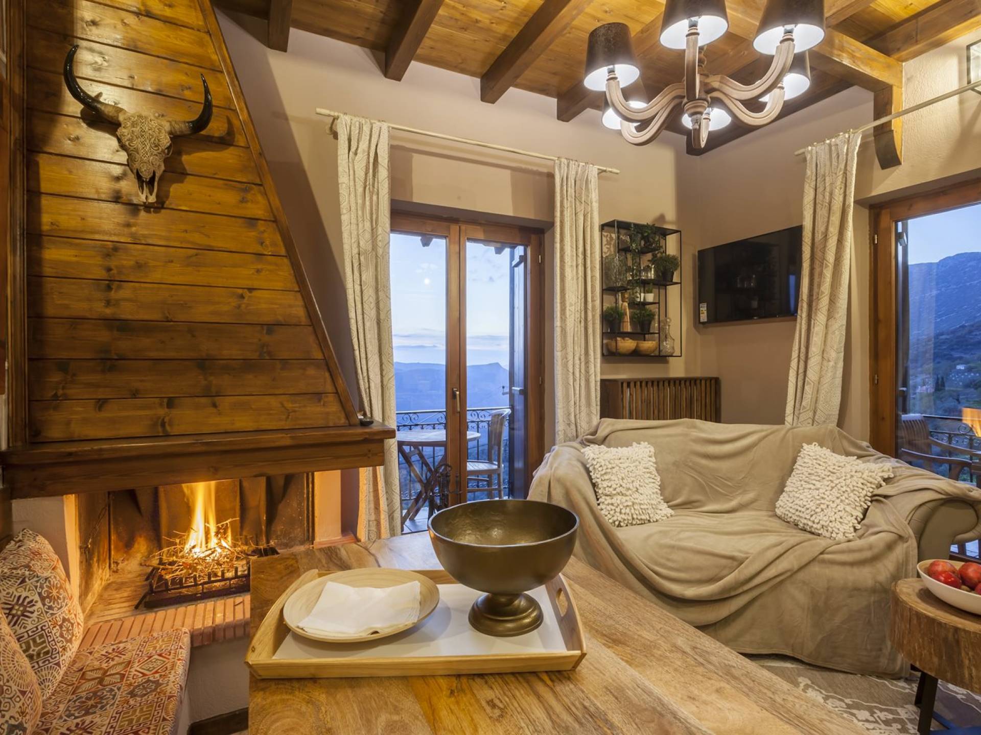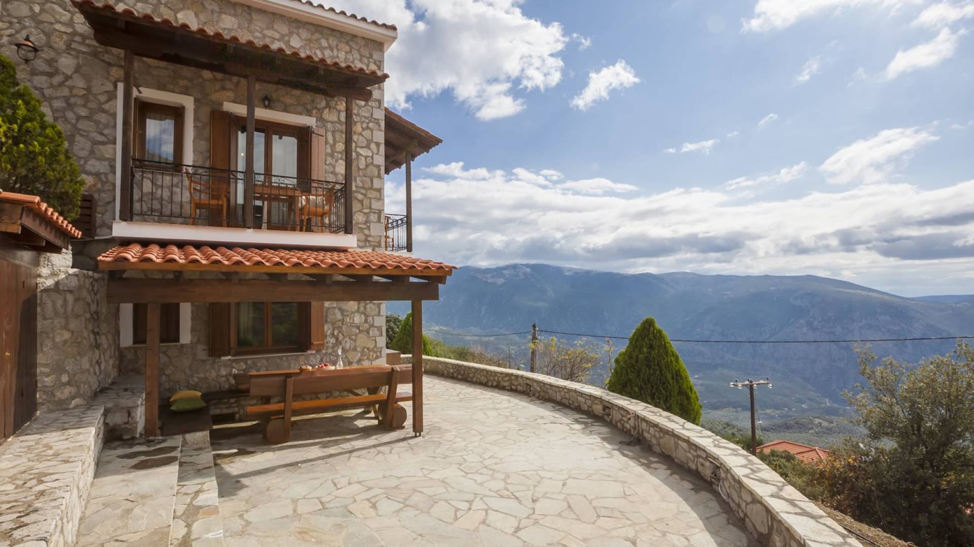 Η θέα από τα μπαλκόνια και τη βεράντα κόβει την ανάσα. Βρίσκεσαι σε υψόμετρο 900+ μέτρων και είναι σαν να απολαμβάνεις τον ήλιο και τα σύννεφα από πρώτη θέση. Η διακόσμηση είναι ιδιαίτερα εκλεπτυσμένη με την ενοχλητική πολυτέλεια που προκαλεί ζεστασιά και φινέτσα. Το σπίτι είναι εξοπλισμένο με hi-fi, τηλεοράσεις τελευταίου τύπου, ηλεκτρική κουζίνα, φούρνο μικροκυμάτων, κλιματισμό, τζάκι, τοστιέρα, μπόιλερ και όλων των ειδών τα μαγειρικά σκεύη, σάουνα και καμπίνα υδρομασάζ για όσους αναζητούν χαλάρωση και αποτοξίνωση 100%.